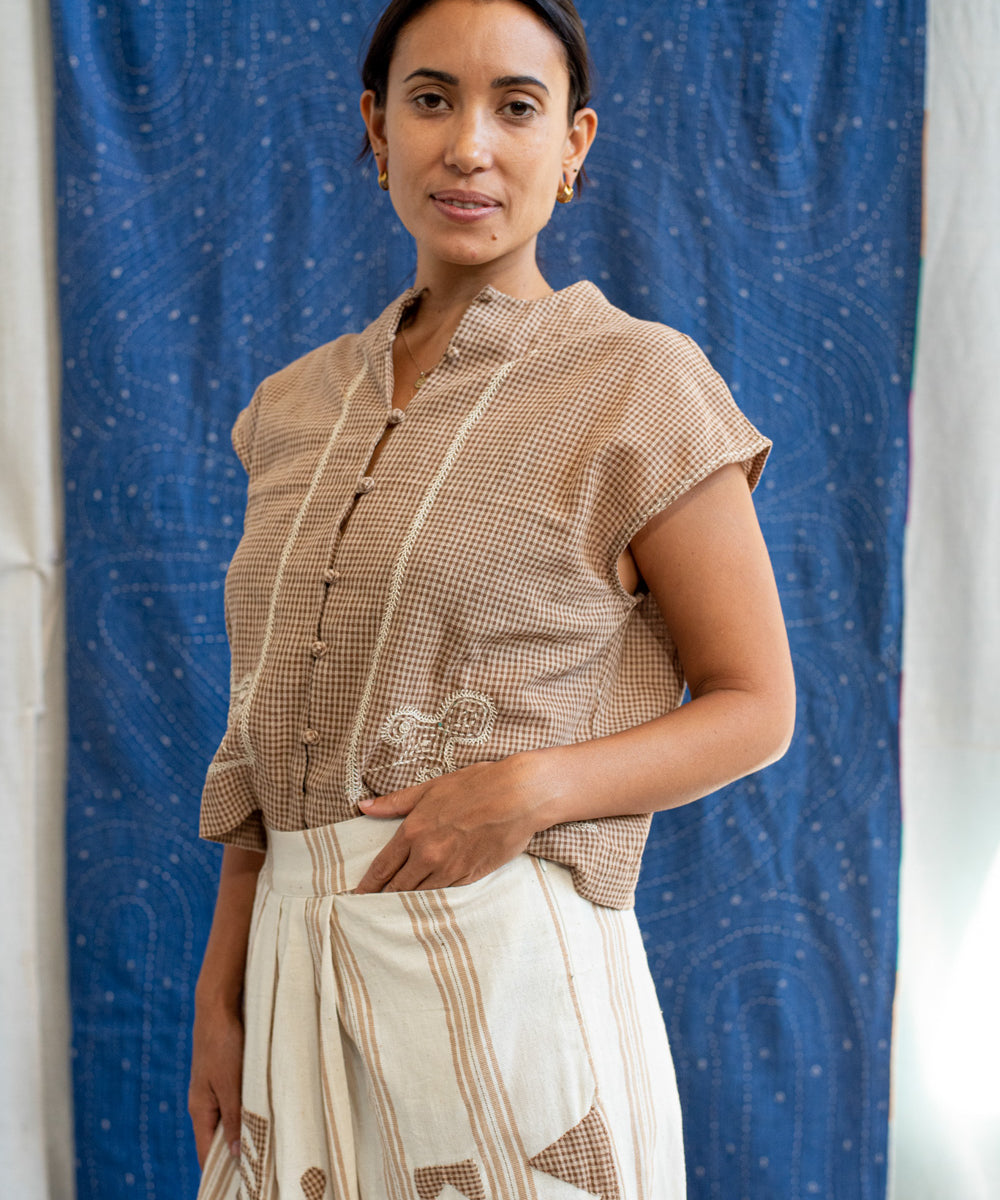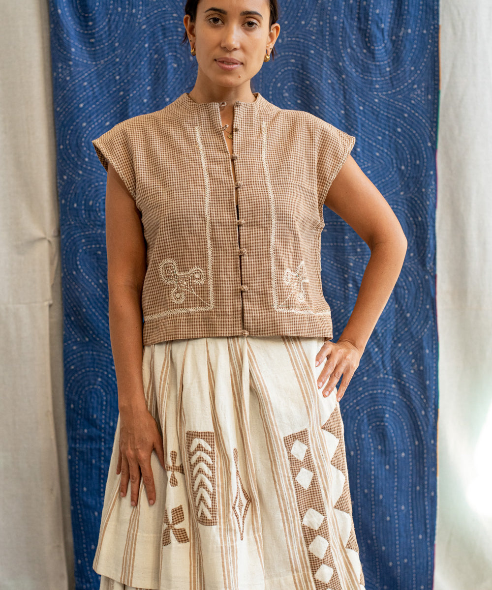 This collection brings together three women whose paths were connected through the vision and facilitation of Gaelle Beech, founder of The Anjelms Project. Gaelle created the bridge that united Kalyani, a craft-based fashion and textile designer from Kerala, with Geeta Bhavesh Rabari, an artisanfrom the Rabari community of Kutch. Through this meaningful bond, their diverse experiences and cultural perspectives came together to craft a shared textile narrative rooted in heritage, creativity, and slow, intentional craft.