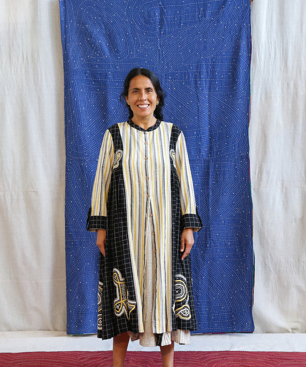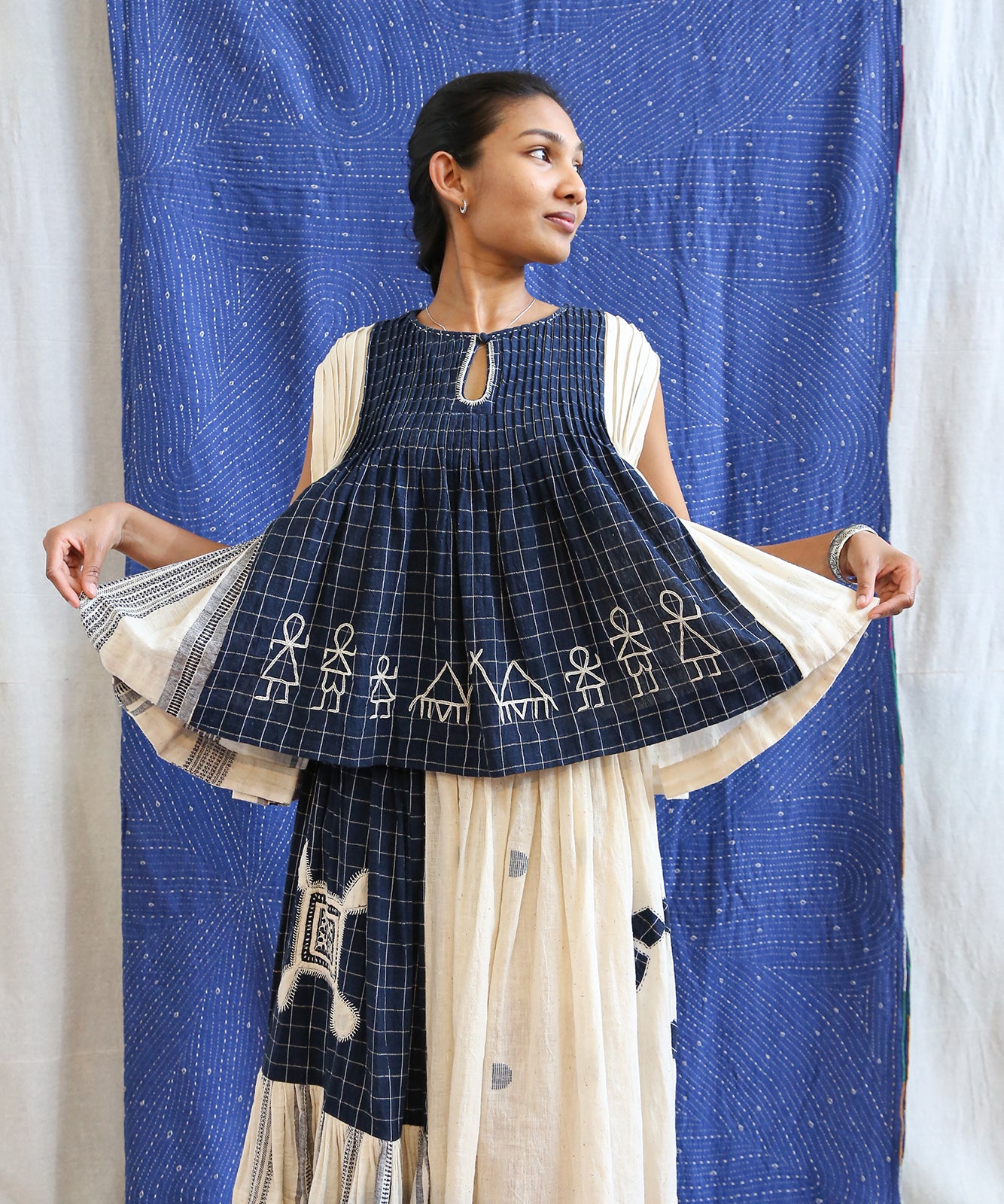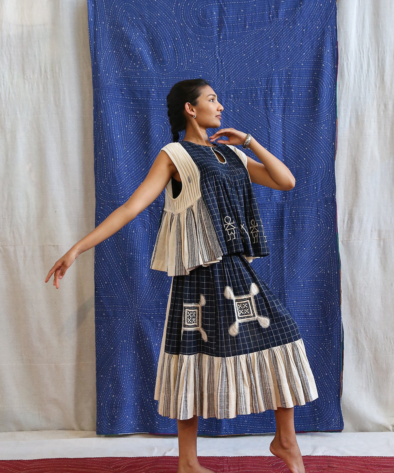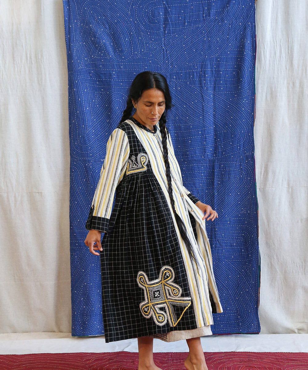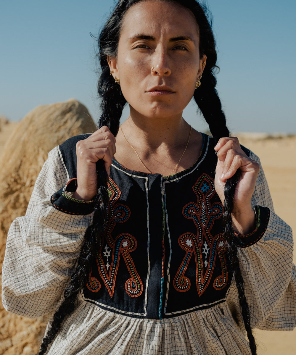 This curated collection draws inspiration from the rich heritage of the Rabari community, brought to life through collaboration, design development, and storytelling. Each piece represents a journey — from the skilled hands of Rabari women in Kachchh led by Geeta Bhavesh Rabari, whose embroidery carries generations of tradition, to designer Kalyani Prasad’s contemporary reinterpretation through The ANJELMS Project.