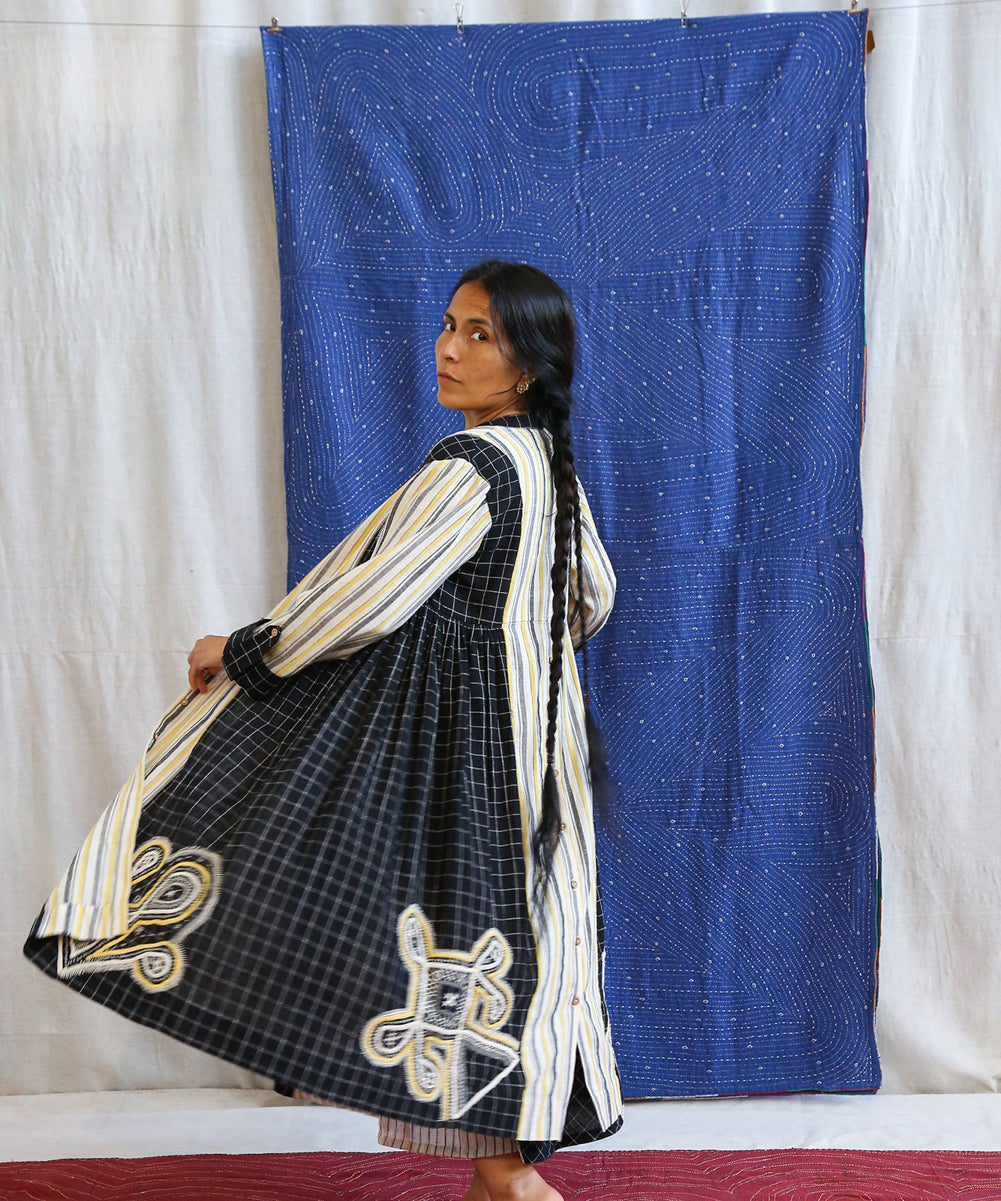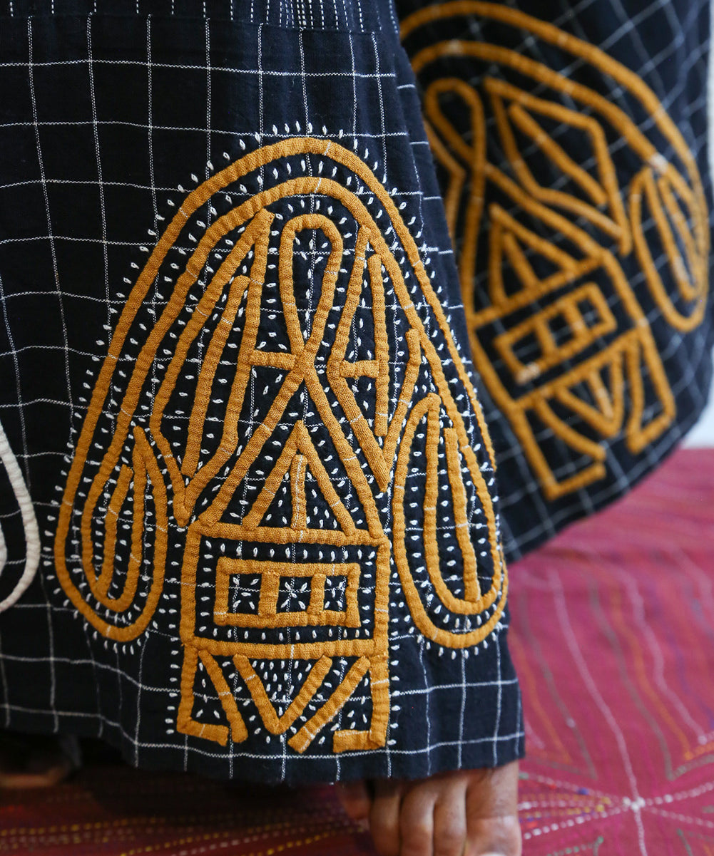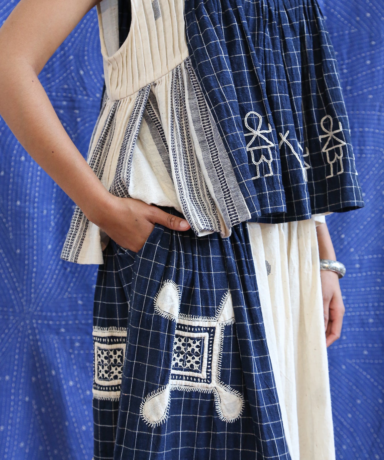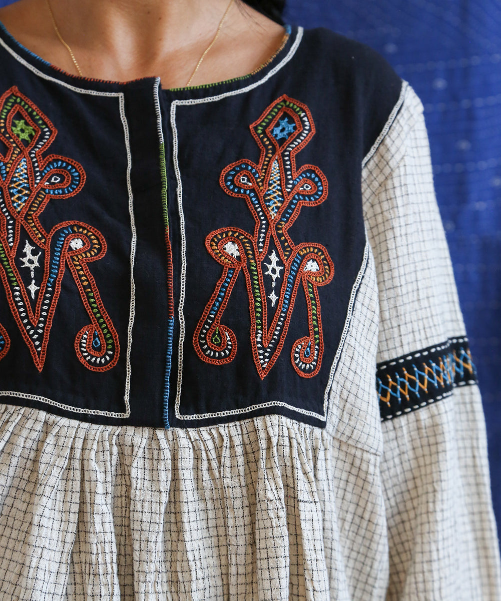 This curated collection draws inspiration from the rich heritage of the Rabari community, brought to life through collaboration, design development, and storytelling. Each piece represents a journey — from the skilled hands of Rabari women in Kachchh led by Geeta Bhavesh Rabari, whose embroidery carries generations of tradition, to designer Kalyani Prasad’s contemporary reinterpretation through The ANJELMS Project.