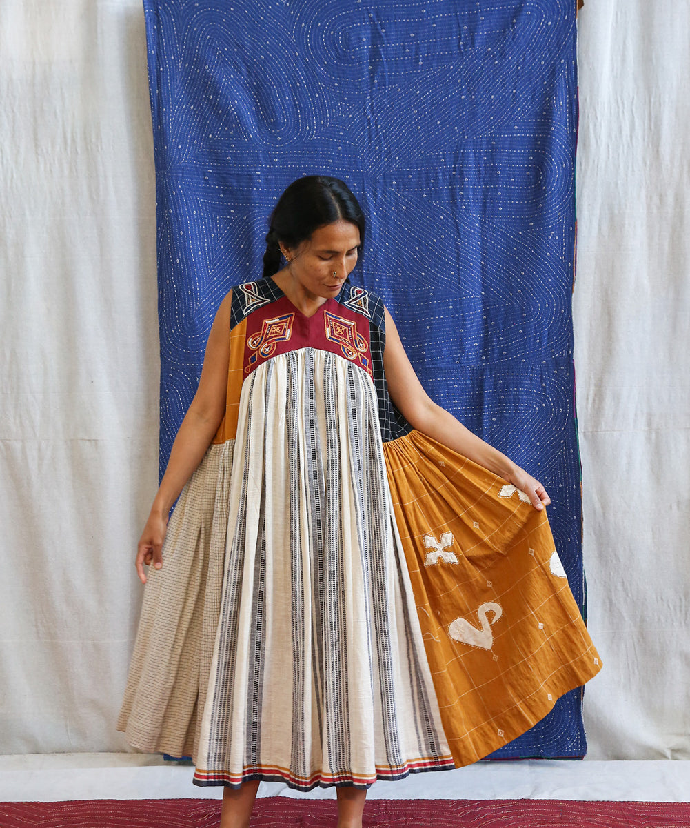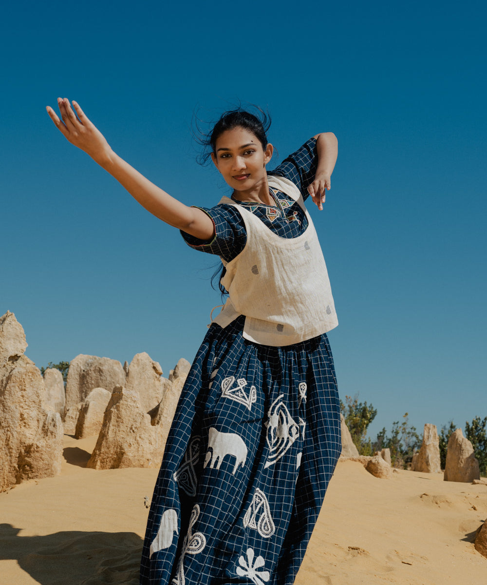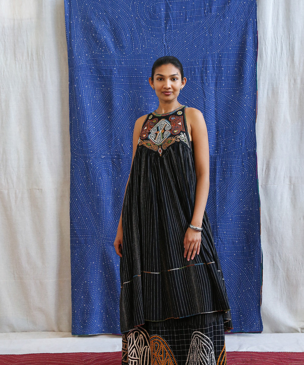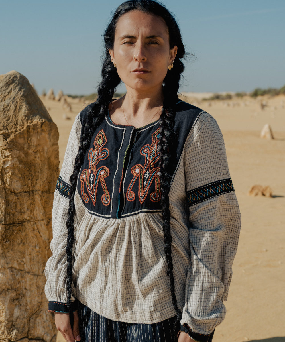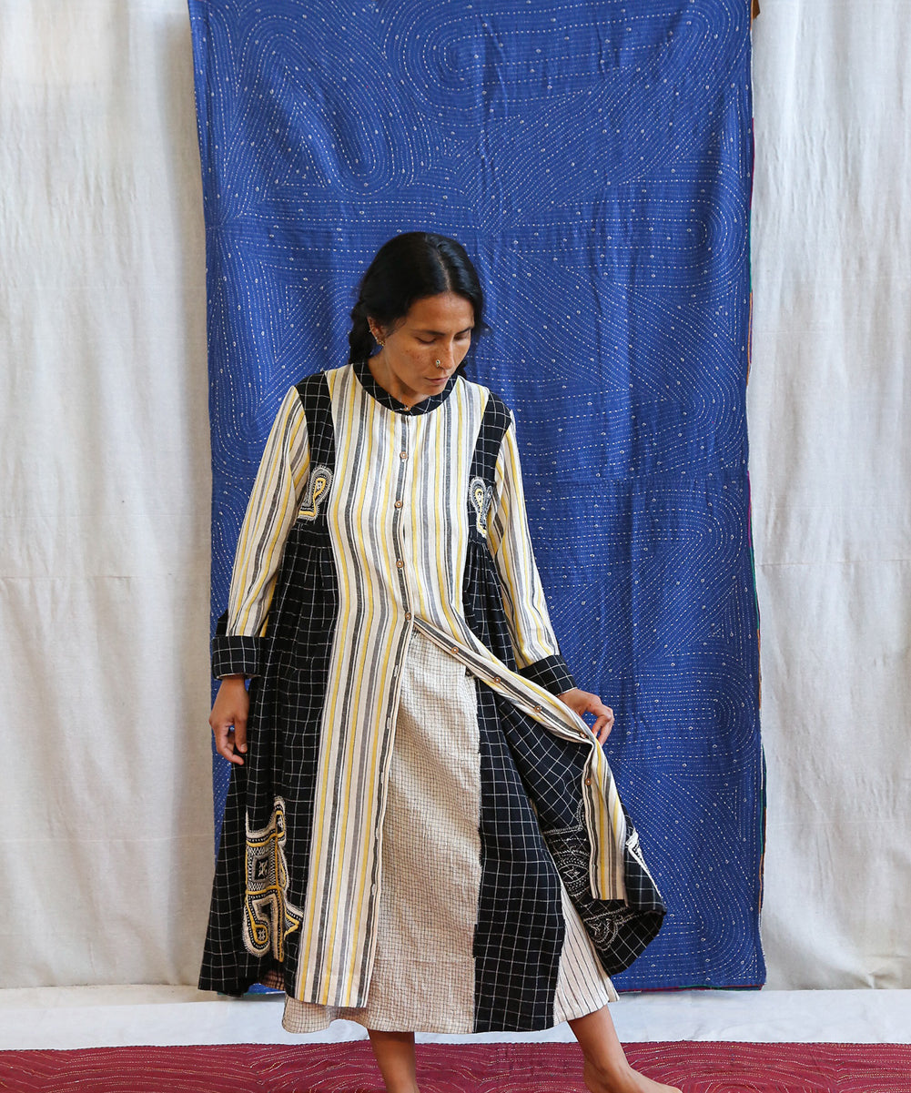 This curated collection draws inspiration from the rich heritage of the Rabari community, brought to life through collaboration, design development, and storytelling. Each piece represents a journey — from the skilled hands of Rabari women in Kachchh led by Geeta Bhavesh Rabari, whose embroidery carries generations of tradition, to designer Kalyani Prasad’s contemporary reinterpretation through The ANJELMS Project.