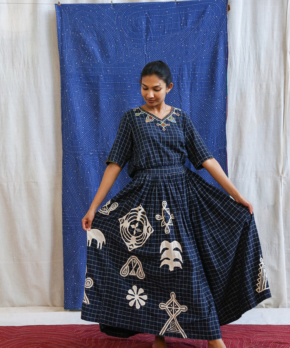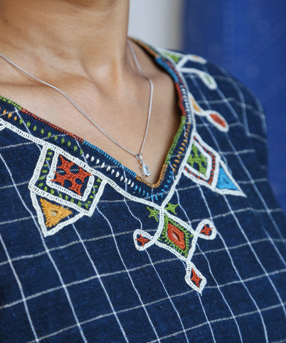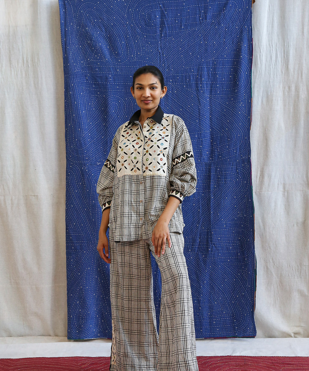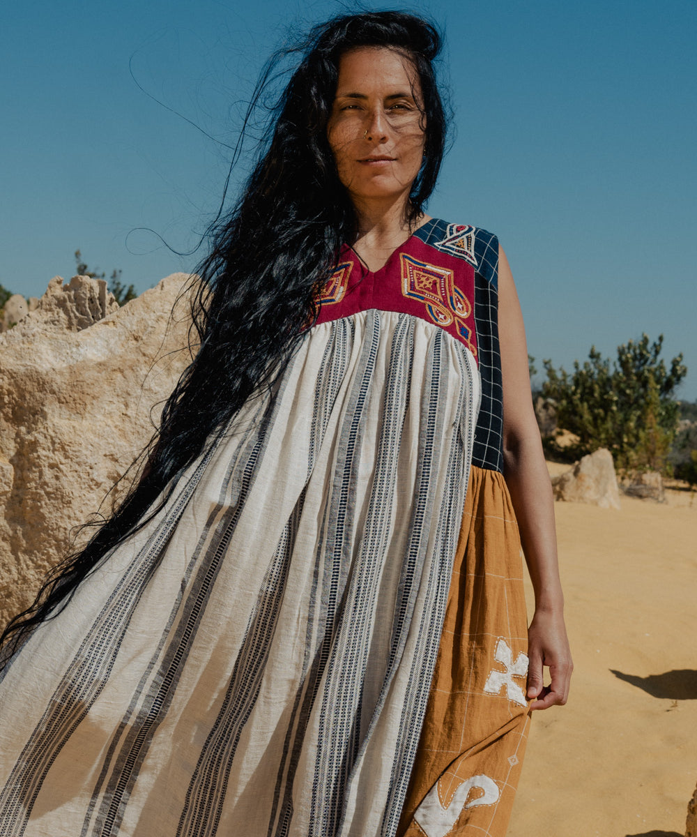 This curated collection draws inspiration from the rich heritage of the Rabari community, brought to life through collaboration, design development, and storytelling. Each piece represents a journey — from the skilled hands of Rabari women in Kachchh led by Geeta Bhavesh Rabari, whose embroidery carries generations of tradition, to designer Kalyani Prasad’s contemporary reinterpretation through The ANJELMS Project.