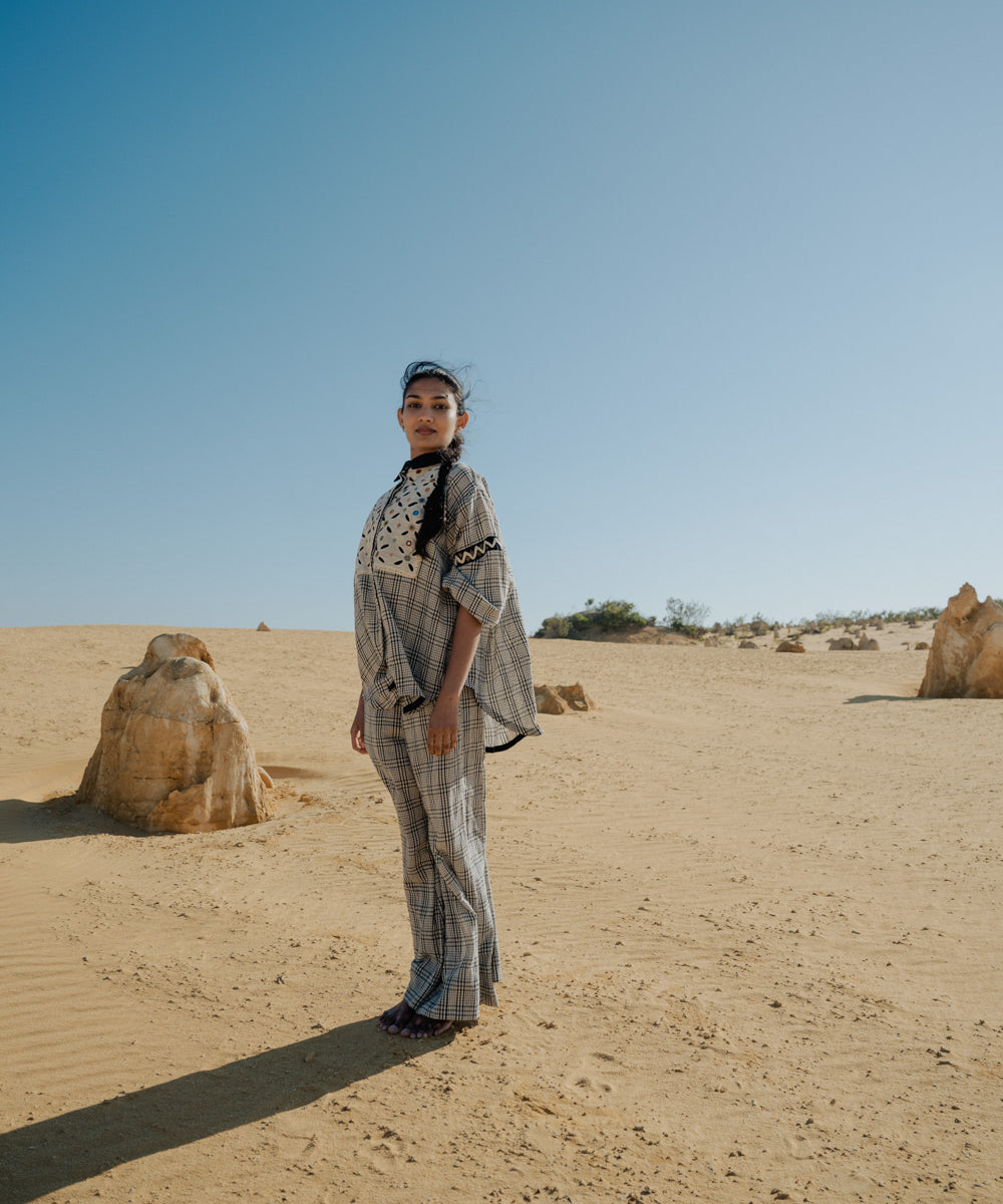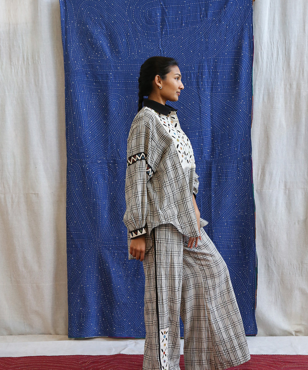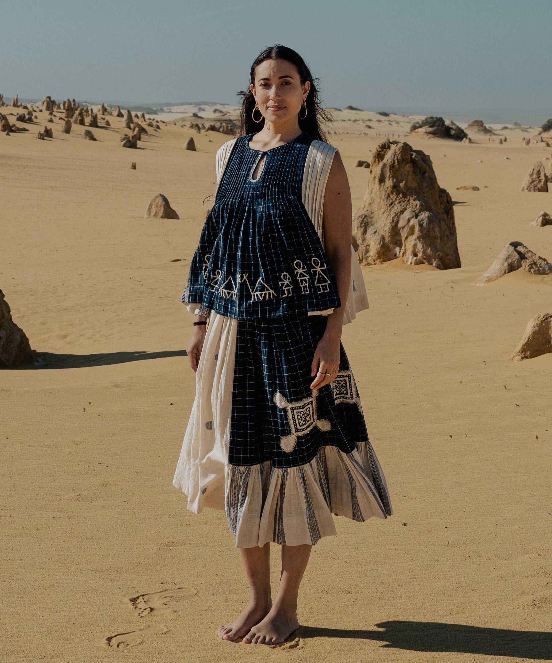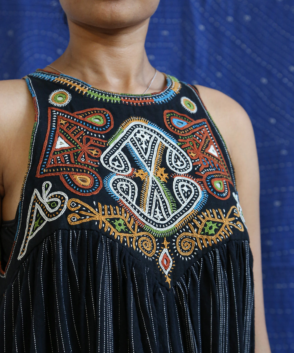 This curated collection draws inspiration from the rich heritage of the Rabari community, brought to life through collaboration, design development, and storytelling. Each piece represents a journey — from the skilled hands of Rabari women in Kachchh led by Geeta Bhavesh Rabari, whose embroidery carries generations of tradition, to designer Kalyani Prasad’s contemporary reinterpretation through The ANJELMS Project.