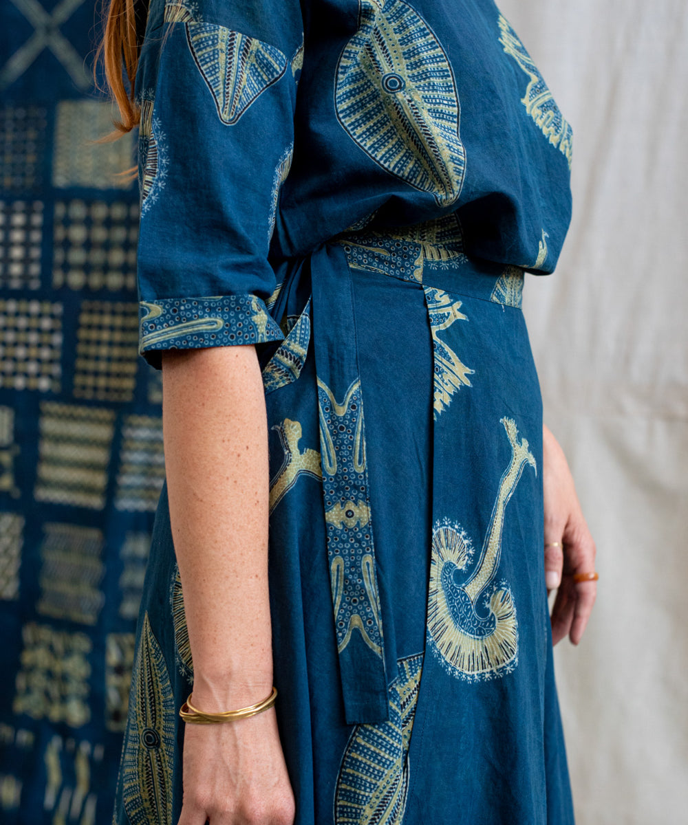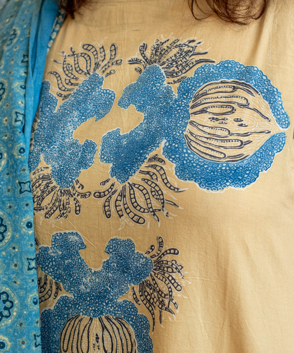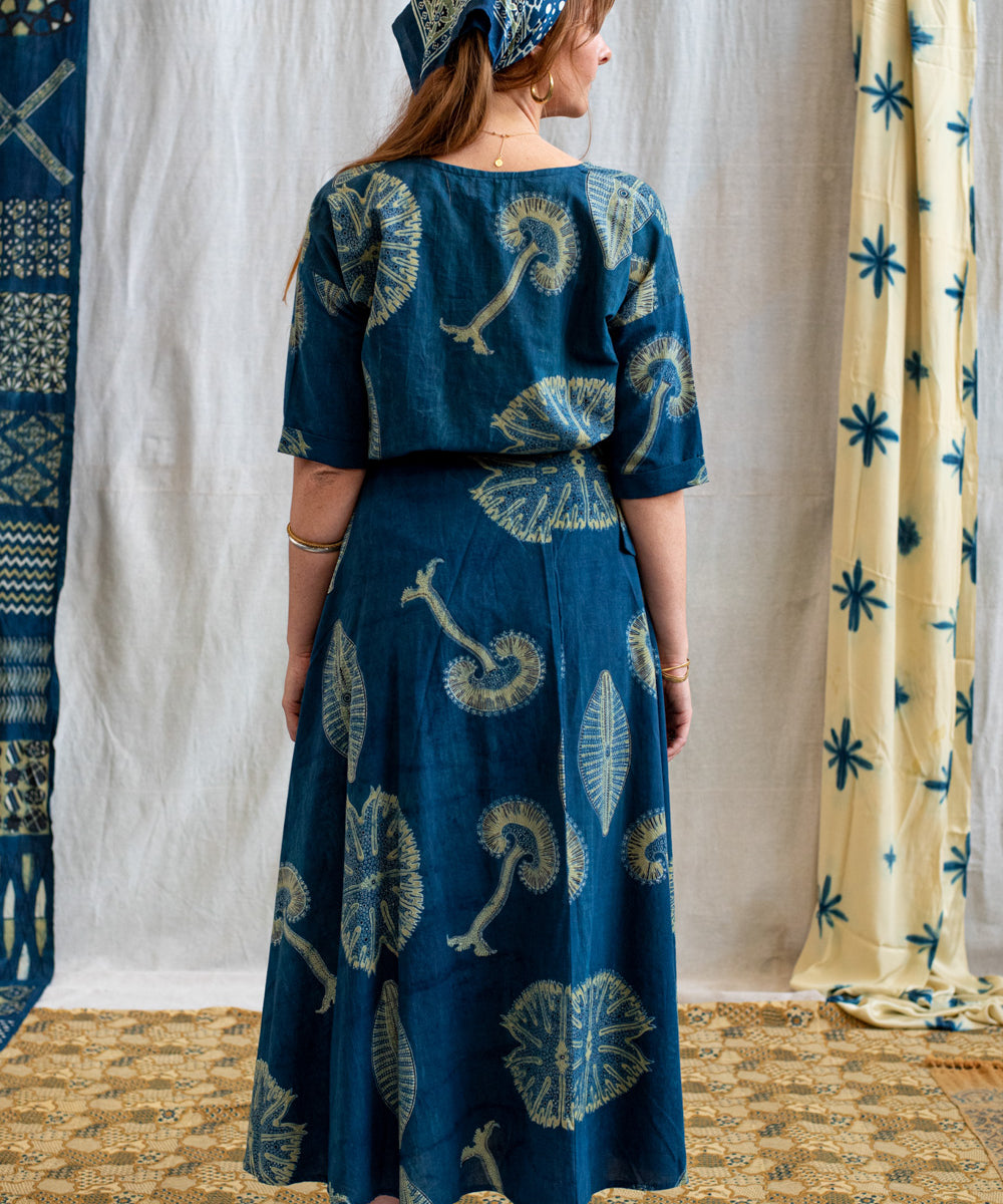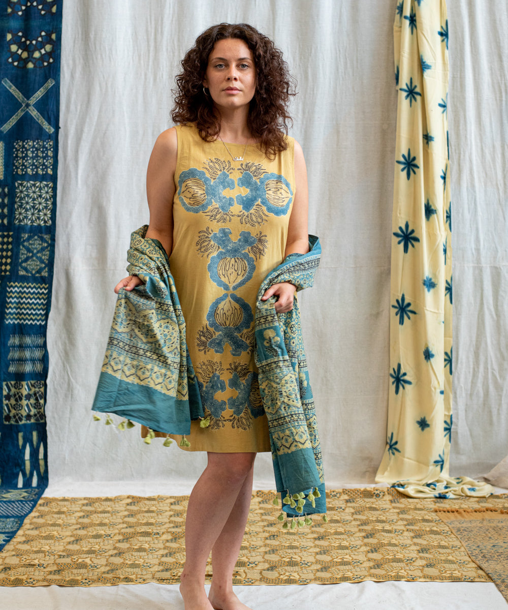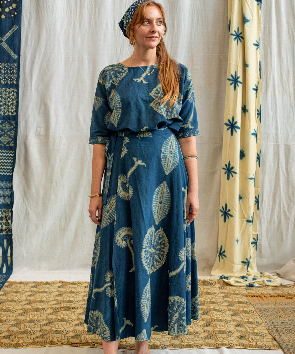 Hand block printed in the Ajrakh tradition, Tides of Memory translates oceanic life into rhythm, symmetry, and fluid movement, using earth-born dyes—indigo, turmeric, and myrobalan.