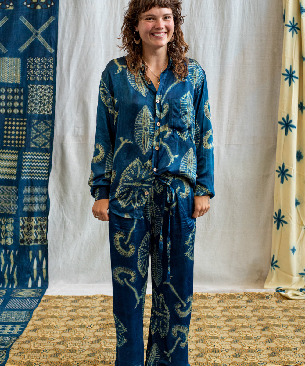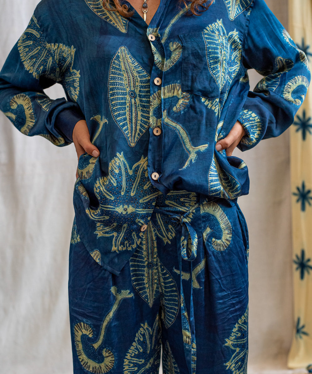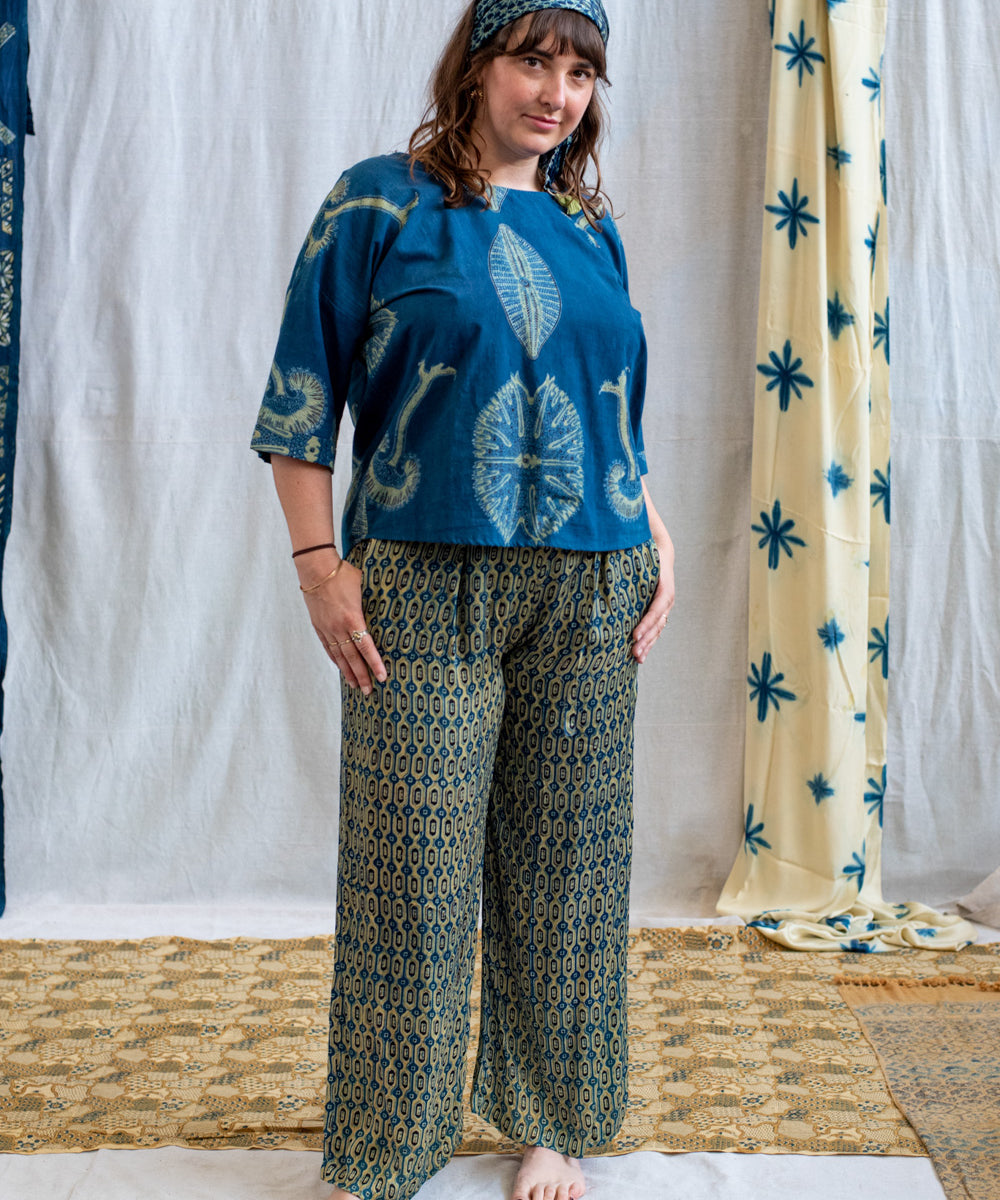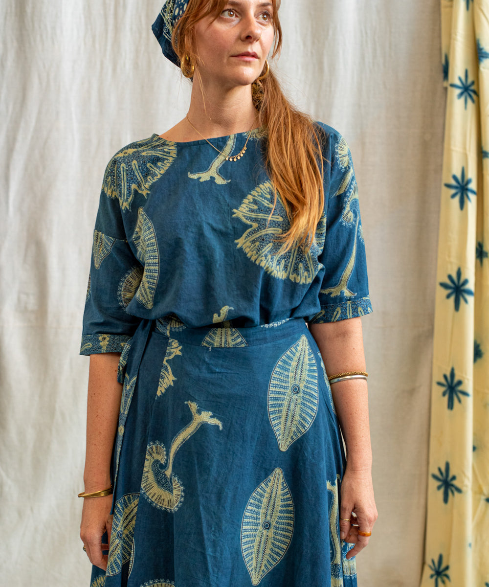 Hand block printed in the Ajrakh tradition, Tides of Memory translates oceanic life into rhythm, symmetry, and fluid movement, using earth-born dyes—indigo, turmeric, and myrobalan.
