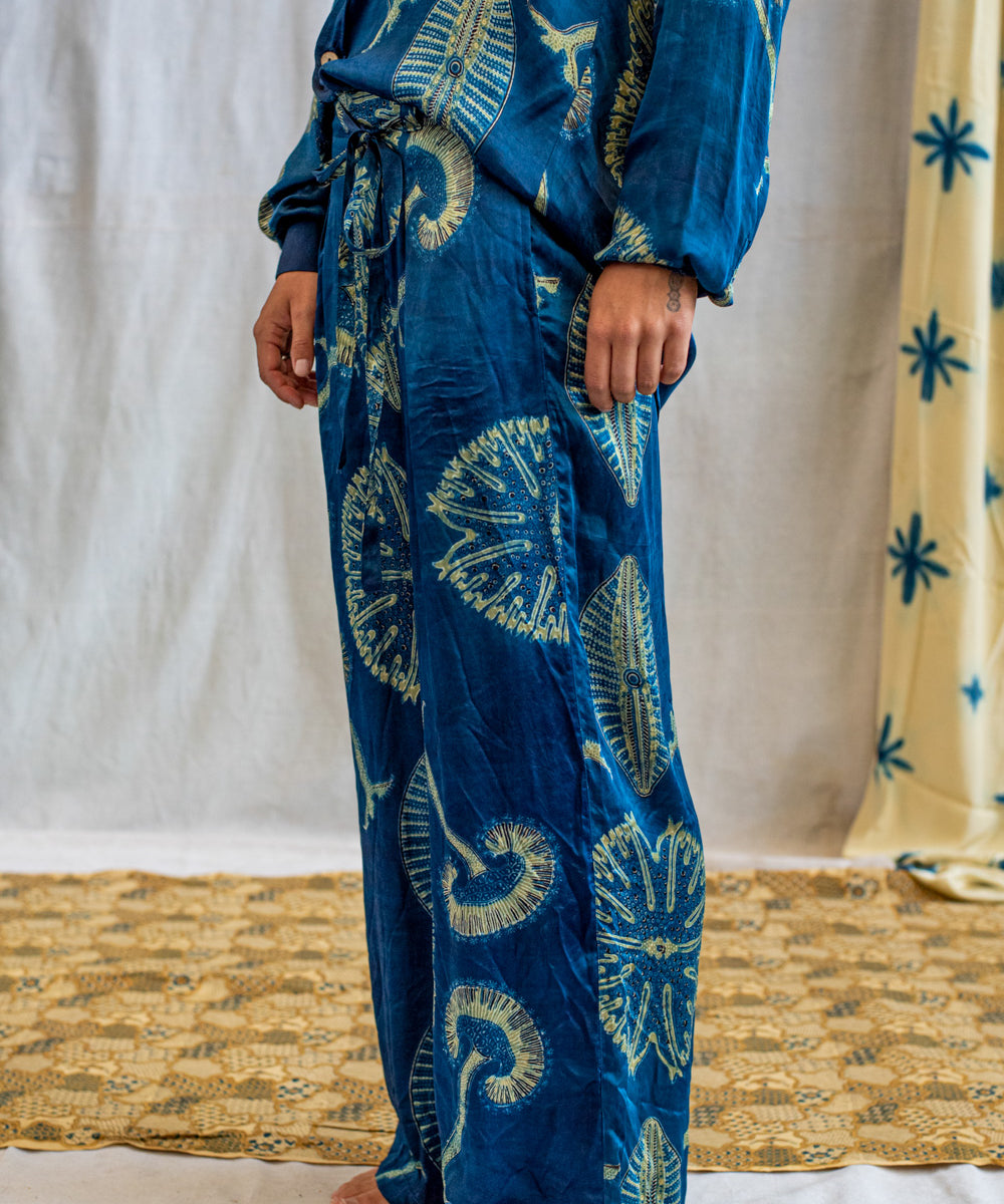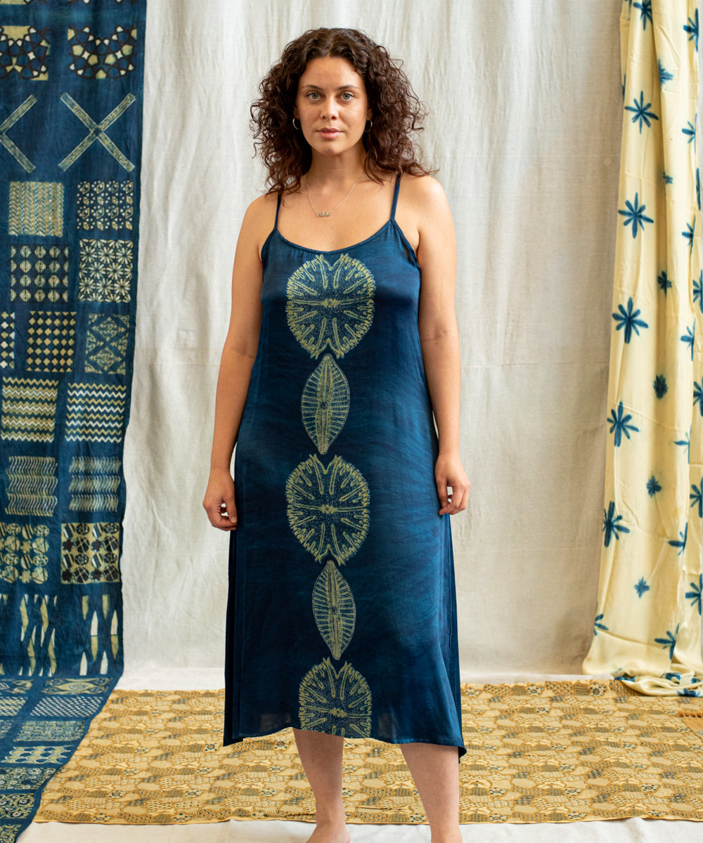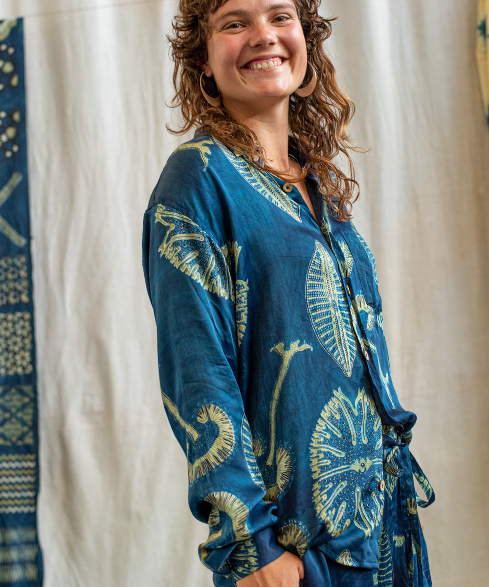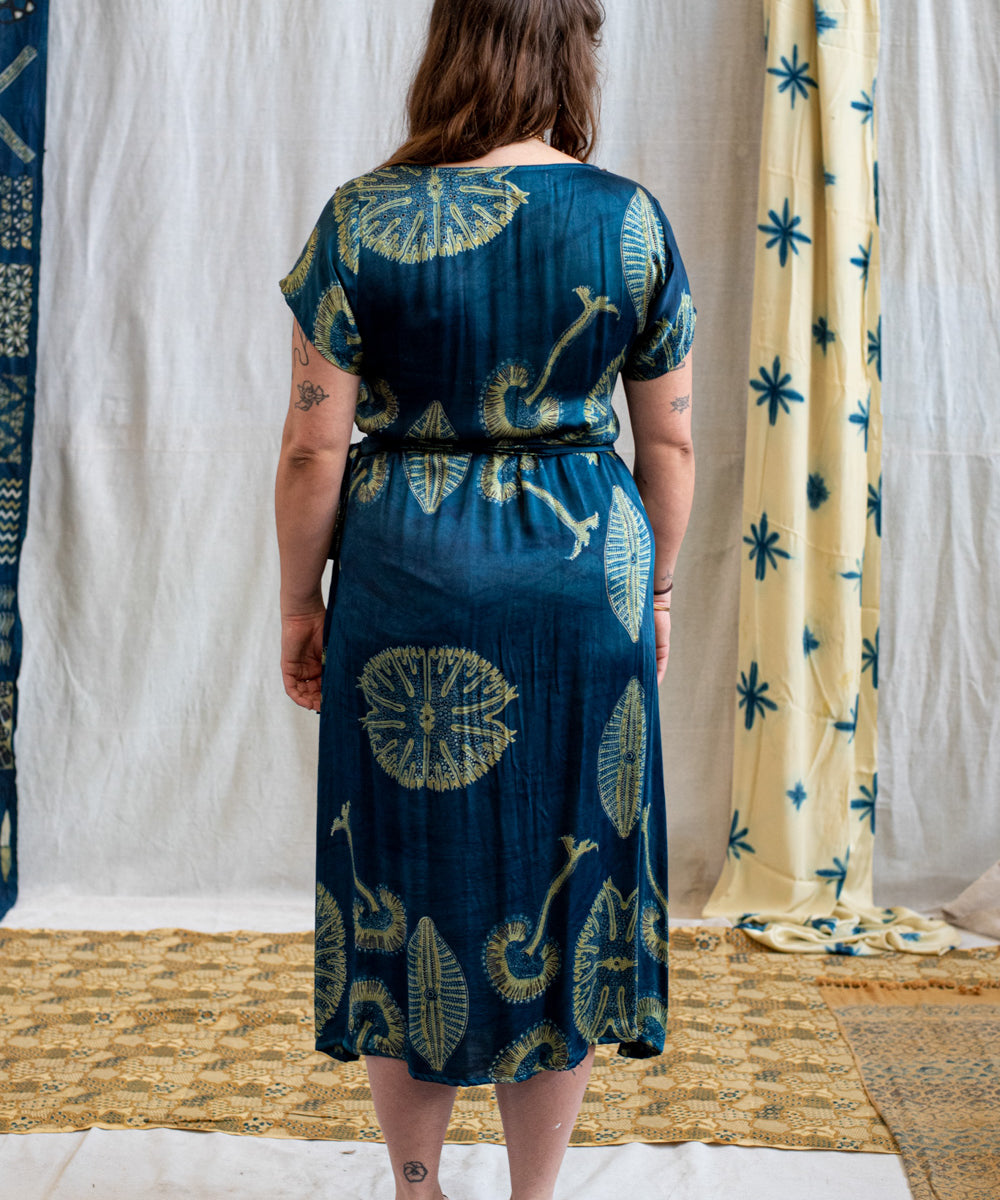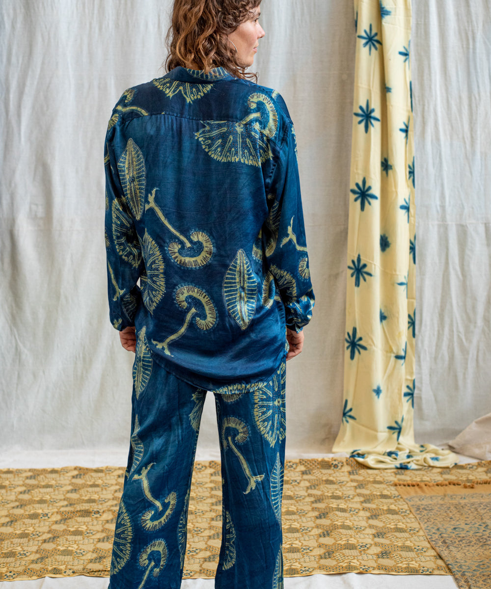 Hand block printed in the Ajrakh tradition, Tides of Memory translates oceanic life into rhythm, symmetry, and fluid movement, using earth-born dyes—indigo, turmeric, and myrobalan.