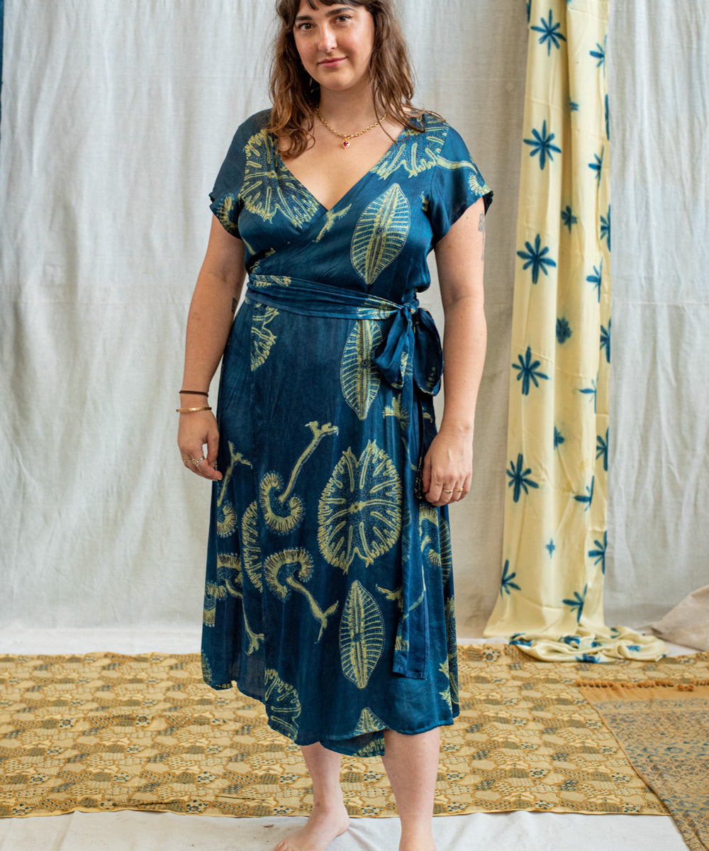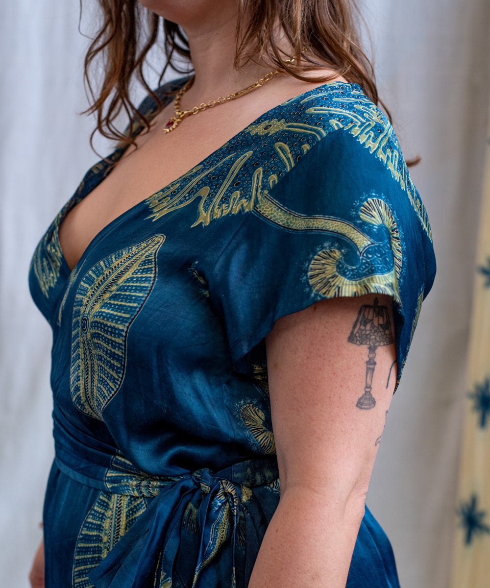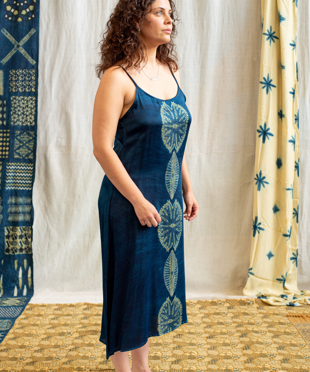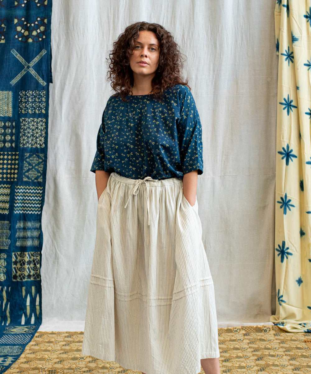 Hand block printed in the Ajrakh tradition, Tides of Memory translates oceanic life into rhythm, symmetry, and fluid movement, using earth-born dyes—indigo, turmeric, and myrobalan.