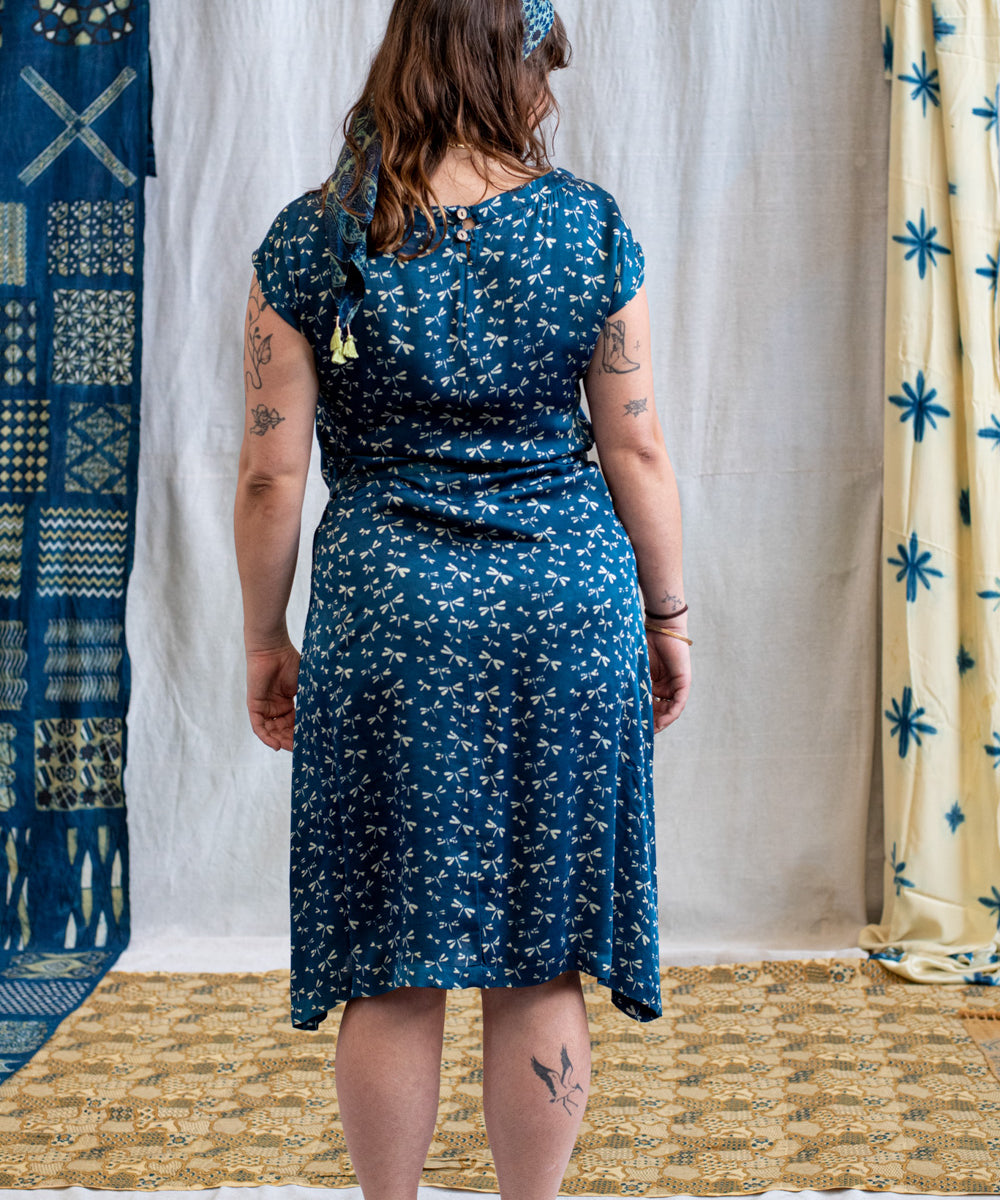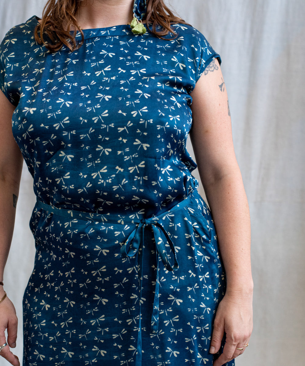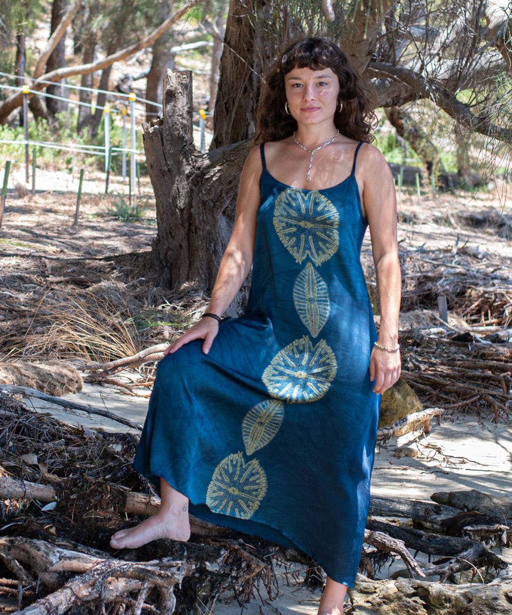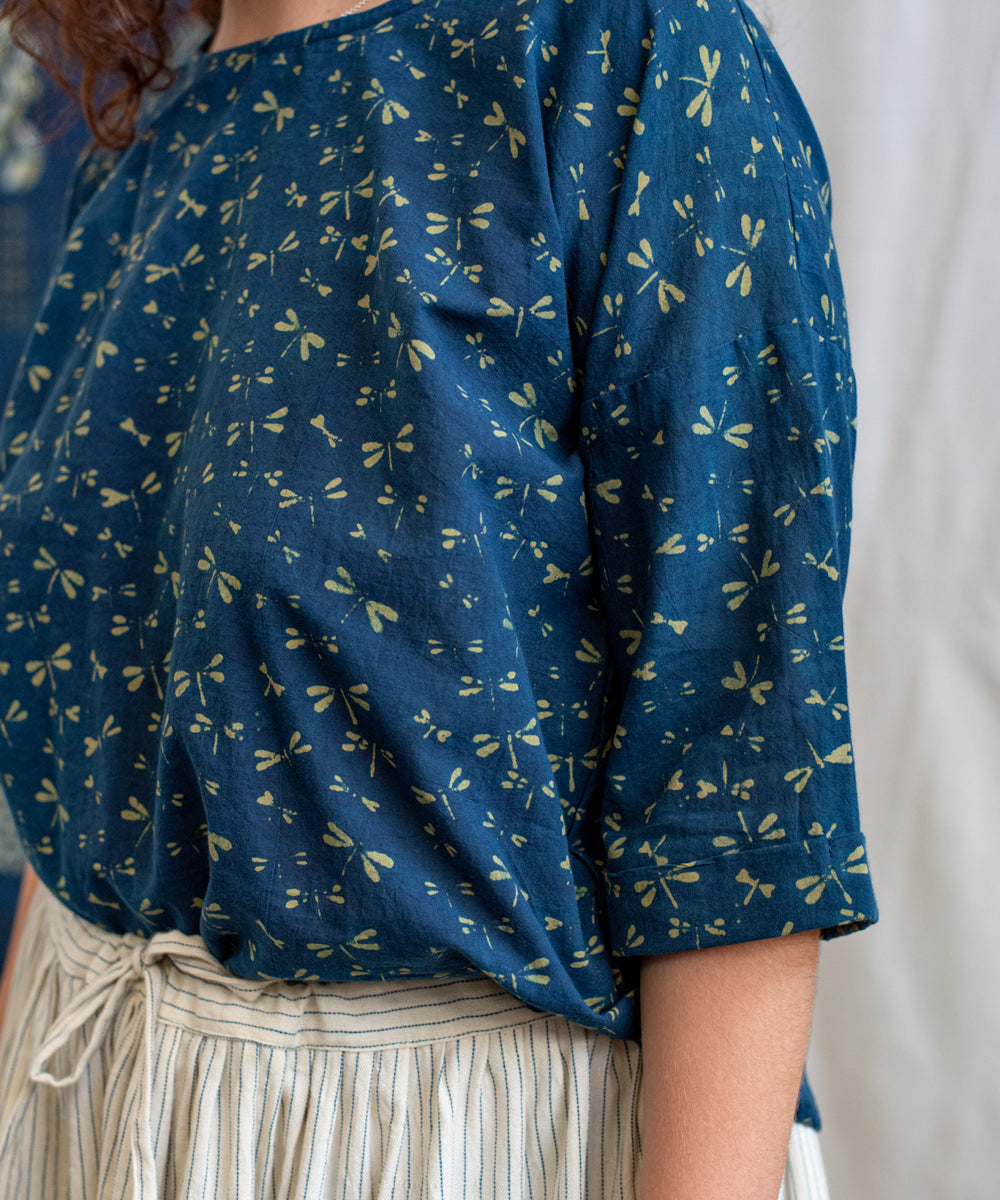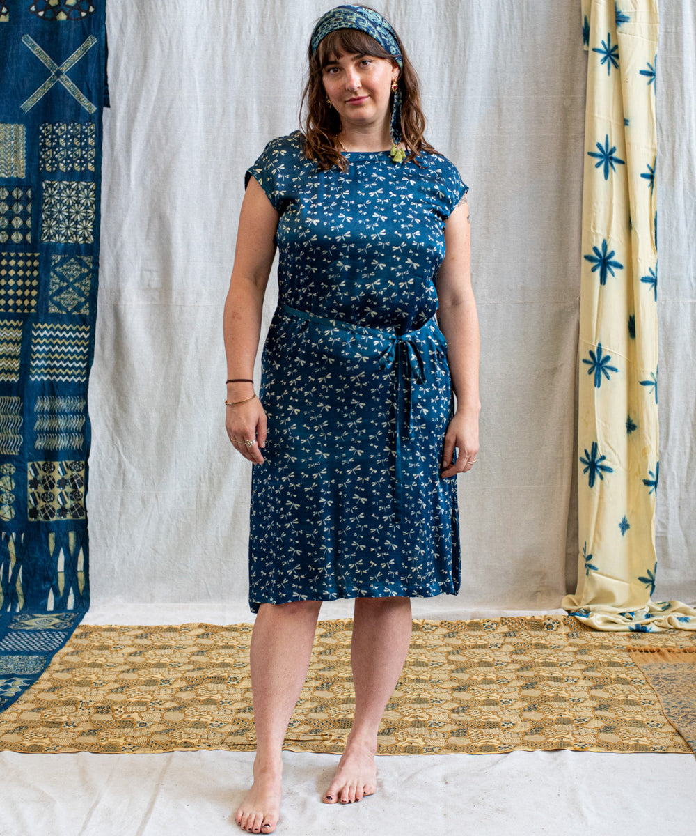 Hand block printed in the Ajrakh tradition, Tides of Memory translates oceanic life into rhythm, symmetry, and fluid movement, using earth-born dyes—indigo, turmeric, and myrobalan.