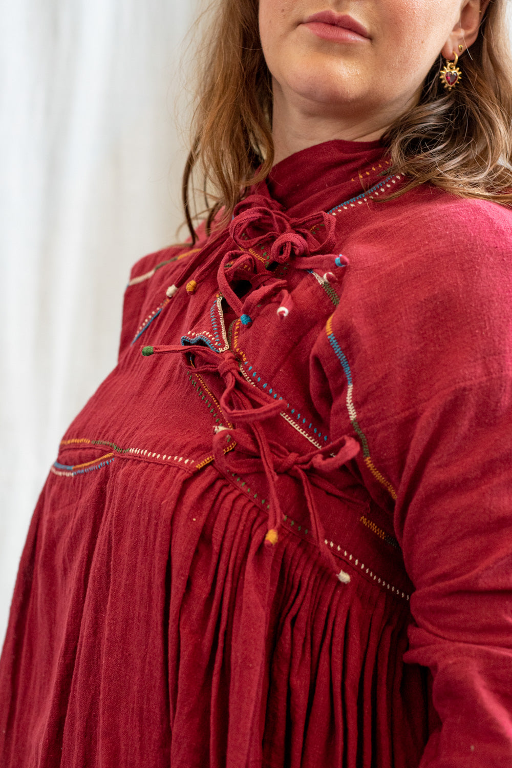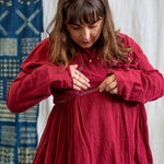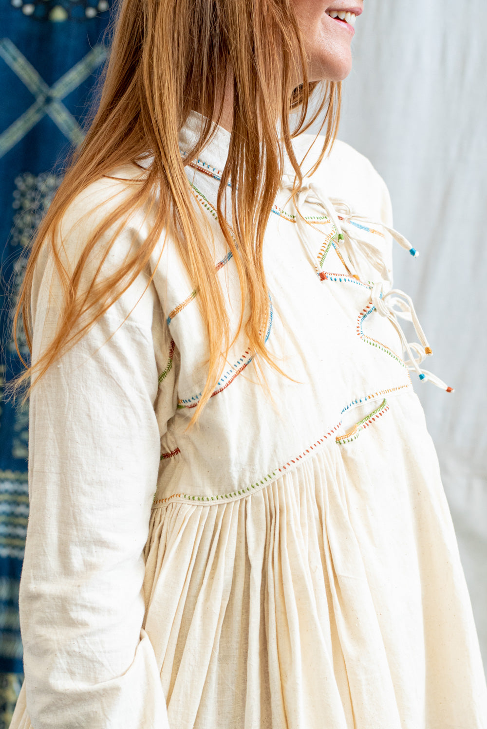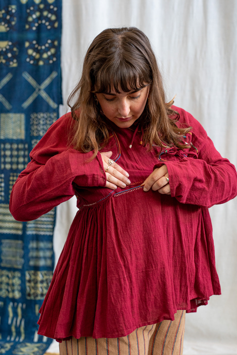 After washing, avoid wringing it out to preserve the delicate textile quality and lay it flat or hang to air dry in a shaded area to prevent fading and protect the fabric from the harsh effects of direct sunlight. Only iron on low heat.