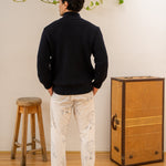 It features a two-way zip for versatile opening, side pockets for practicality, and a stand-up collar for added warmth throughout the year. Crafted from virgin wool, this jacket is both warm and durable. Its English knit construction allows it to be worn in various seasons—layered under a coat in winter or as a standalone piece during cooler summer days.
