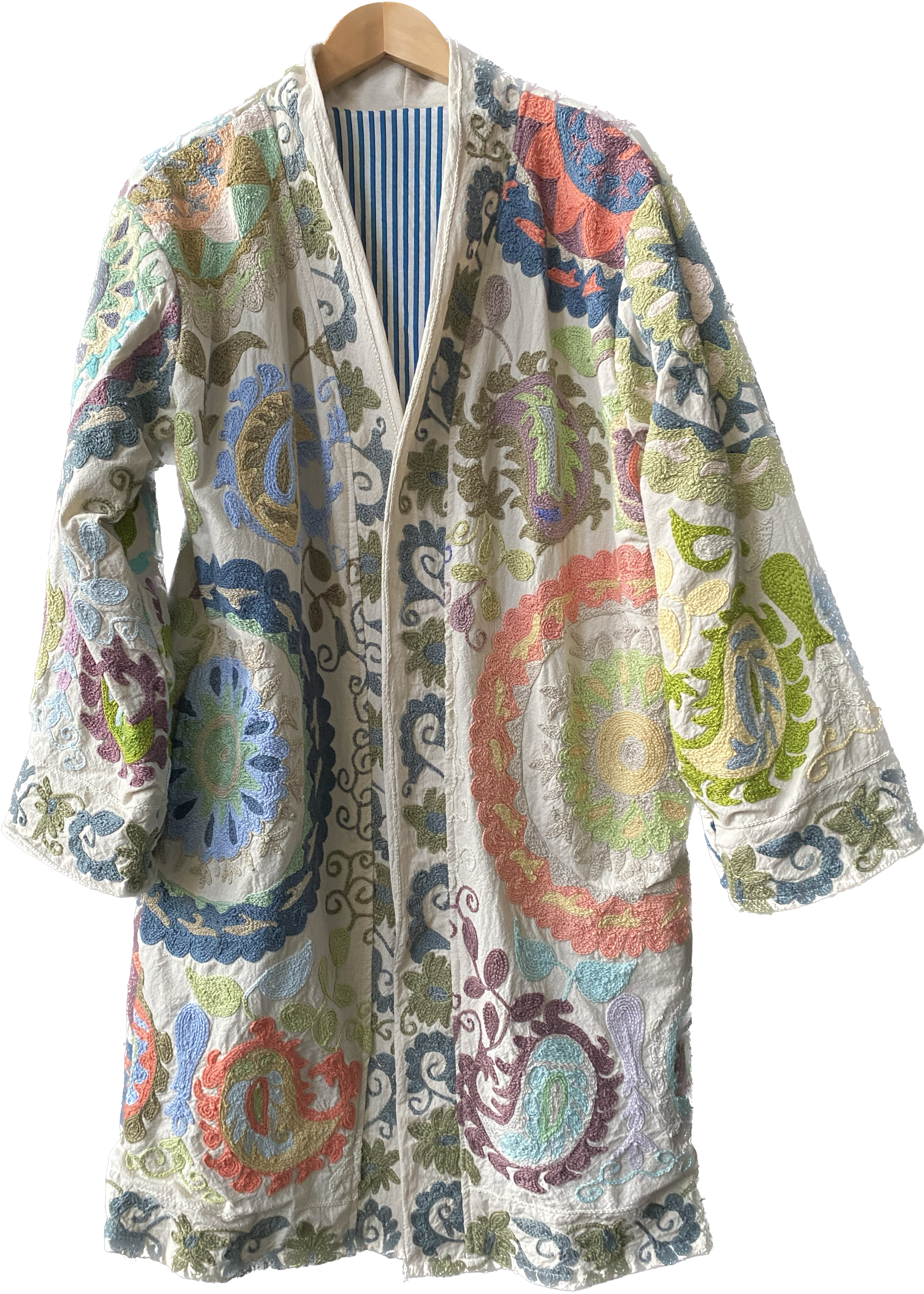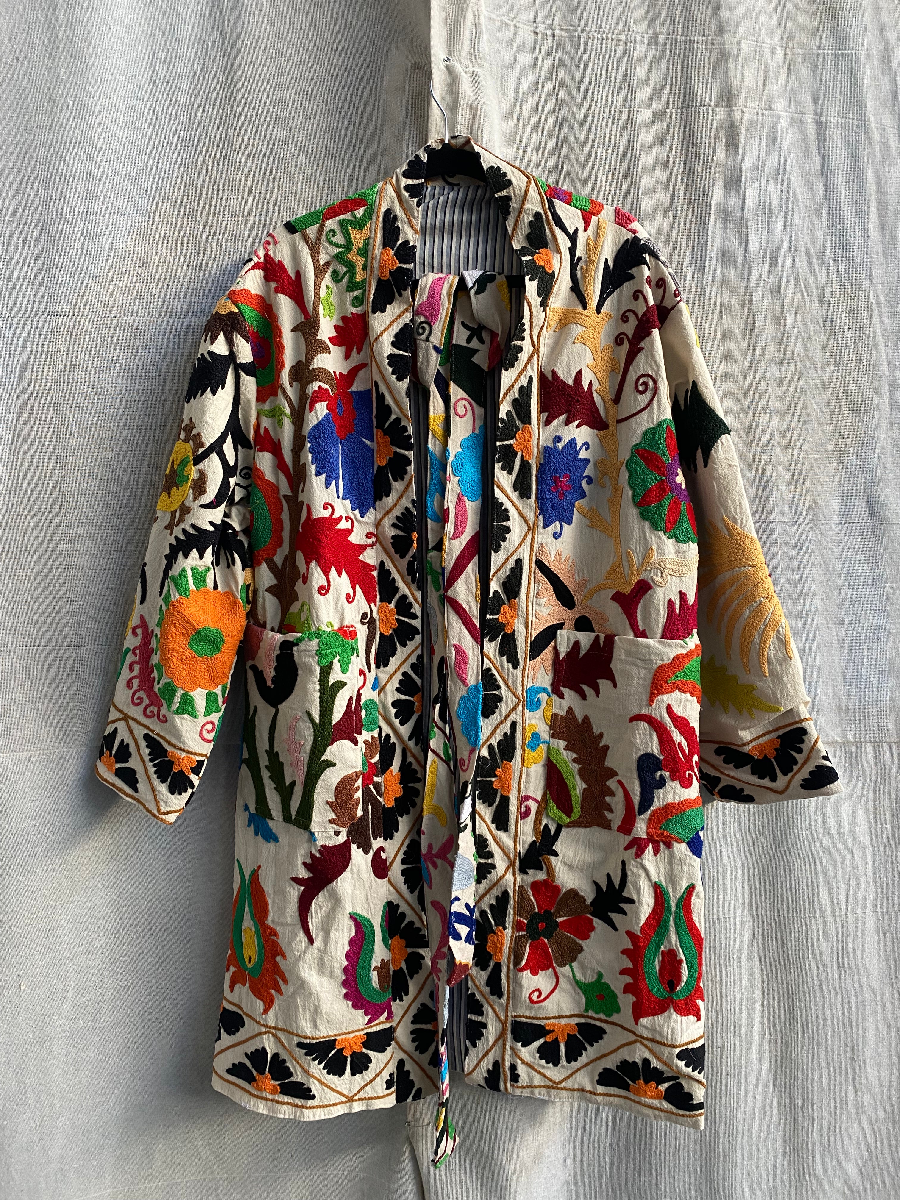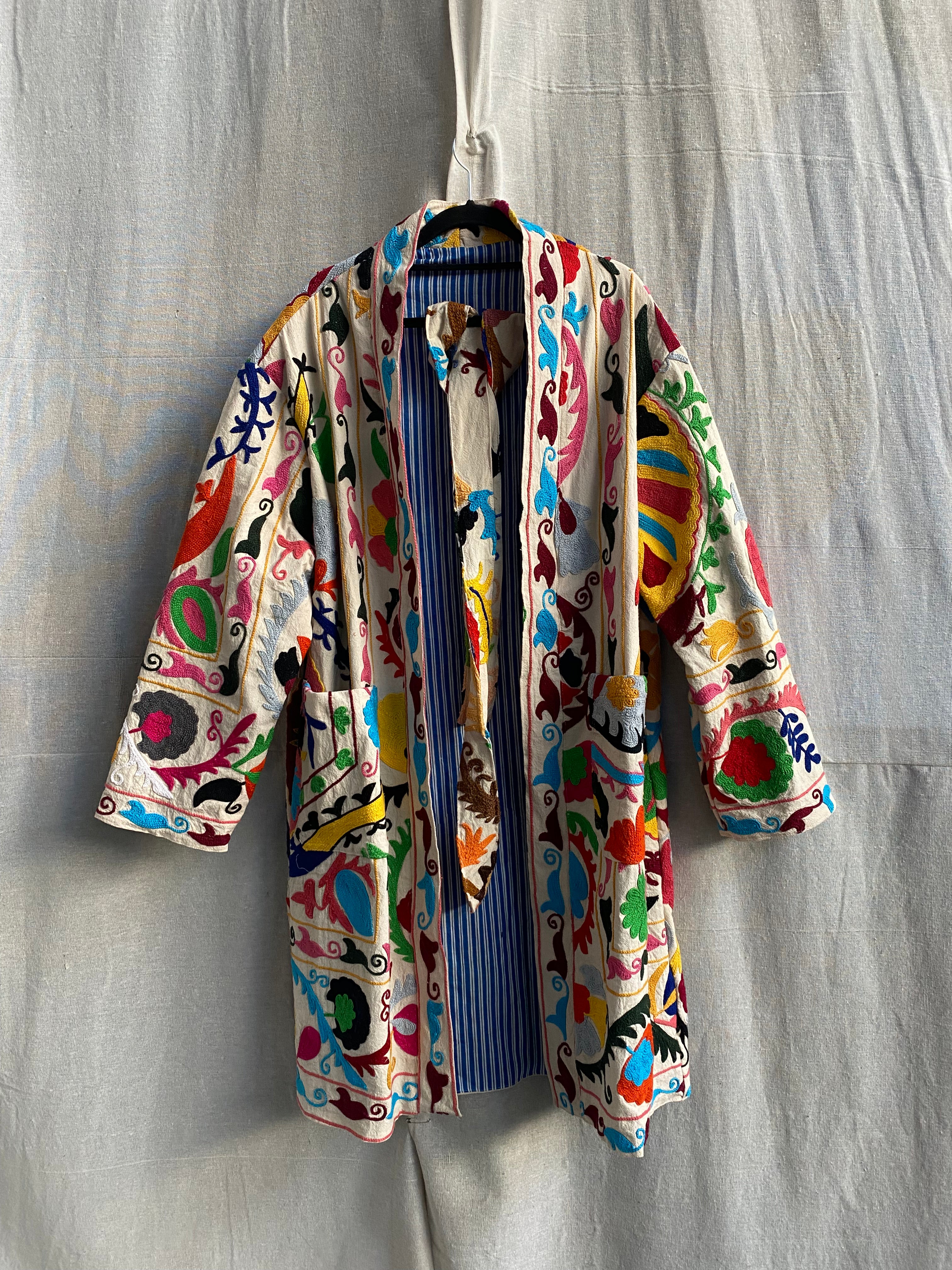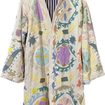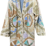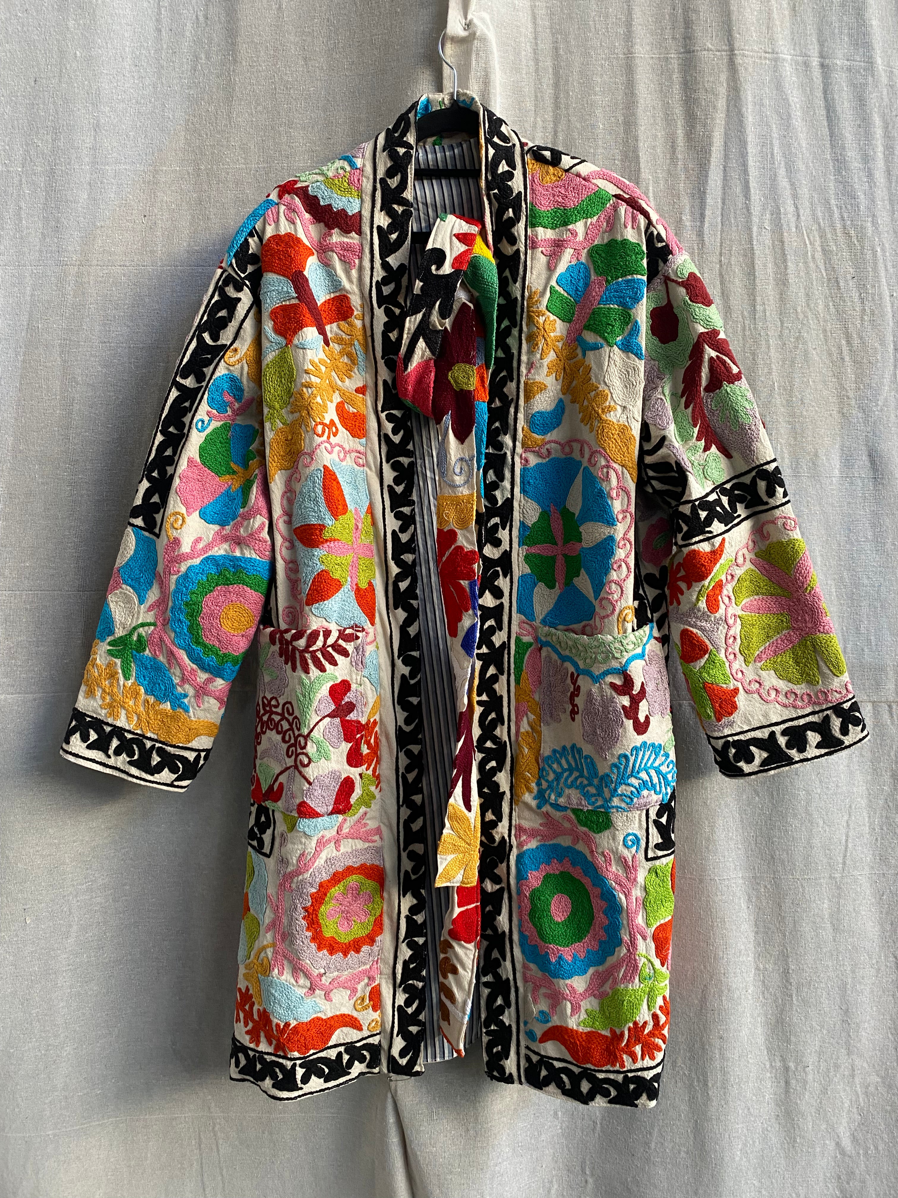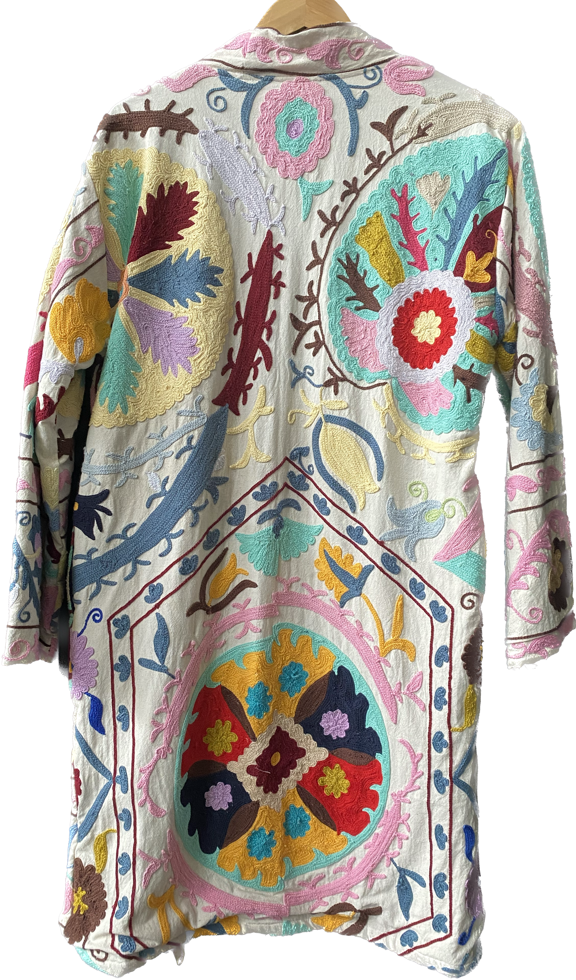 Our upcycled Suzani Coats are a one-of-a-kind treasure for textile lovers. Hand-embroidered and fully lined, each jacket is thoughtfully crafted with unique placement of traditional Suzani textiles—featuring the original border on the lapel and a central motif on the back. With practical details like pockets, a tie waist, and adjustable cuffs, these jackets blend heritage craftsmanship with modern wearability.