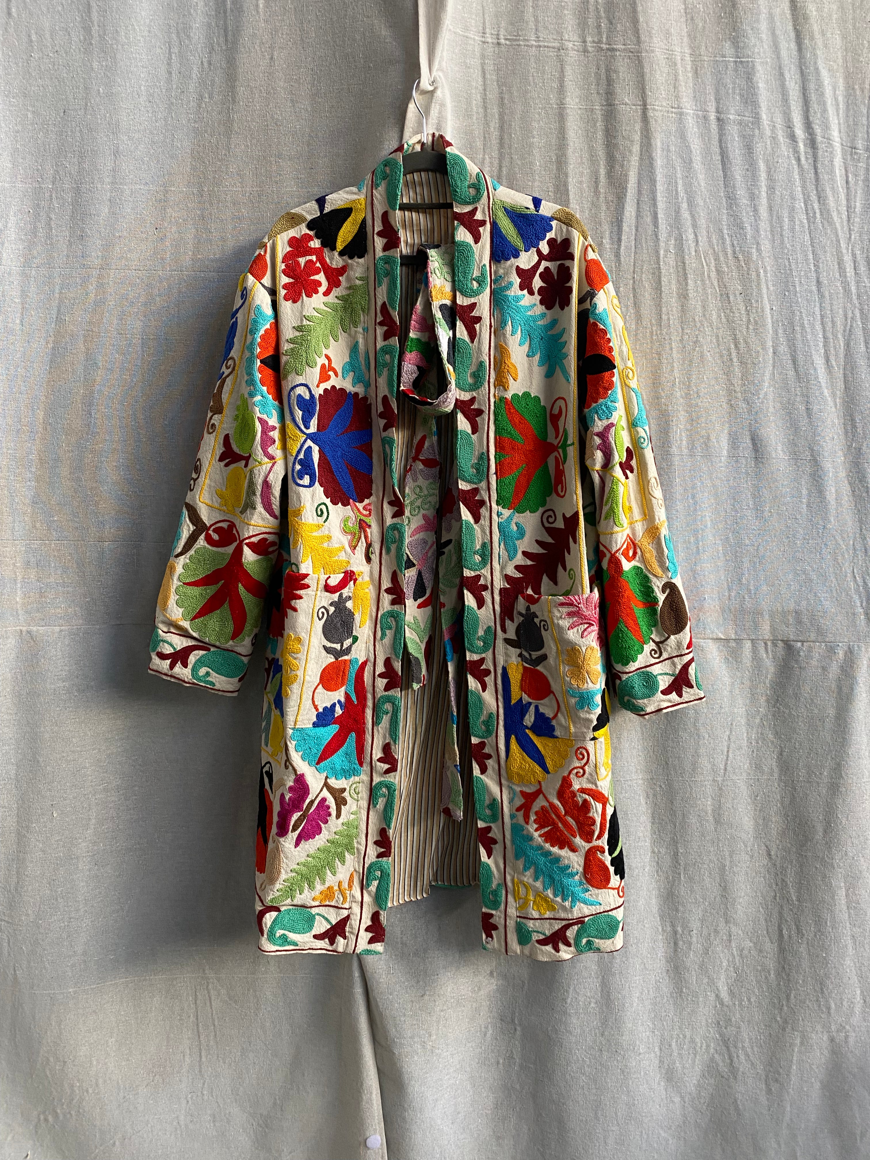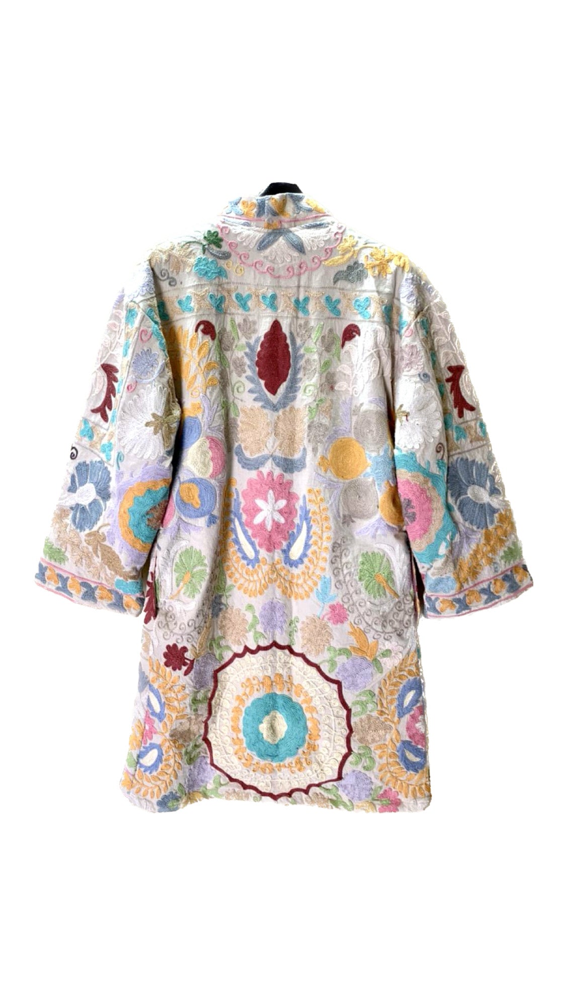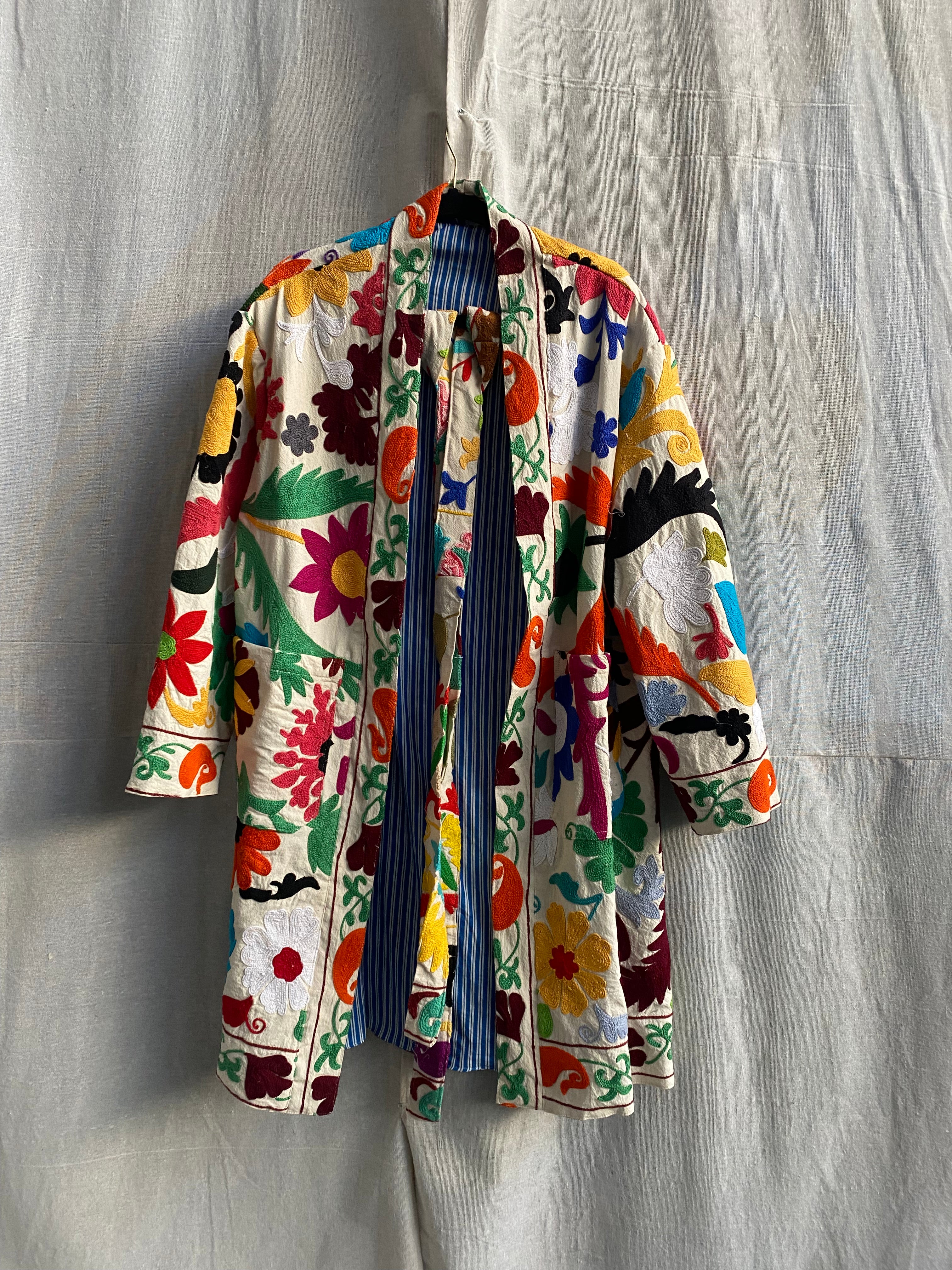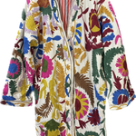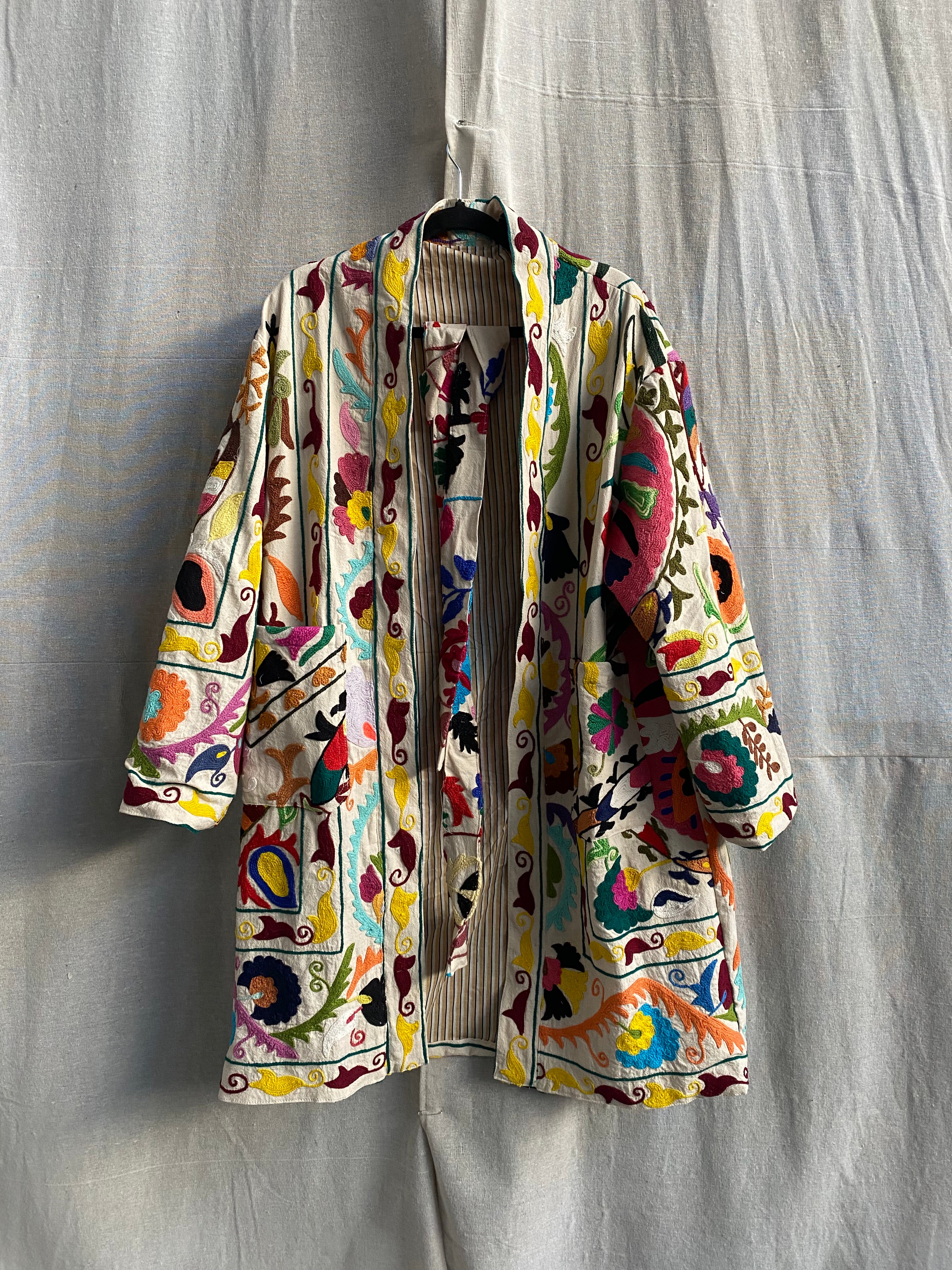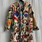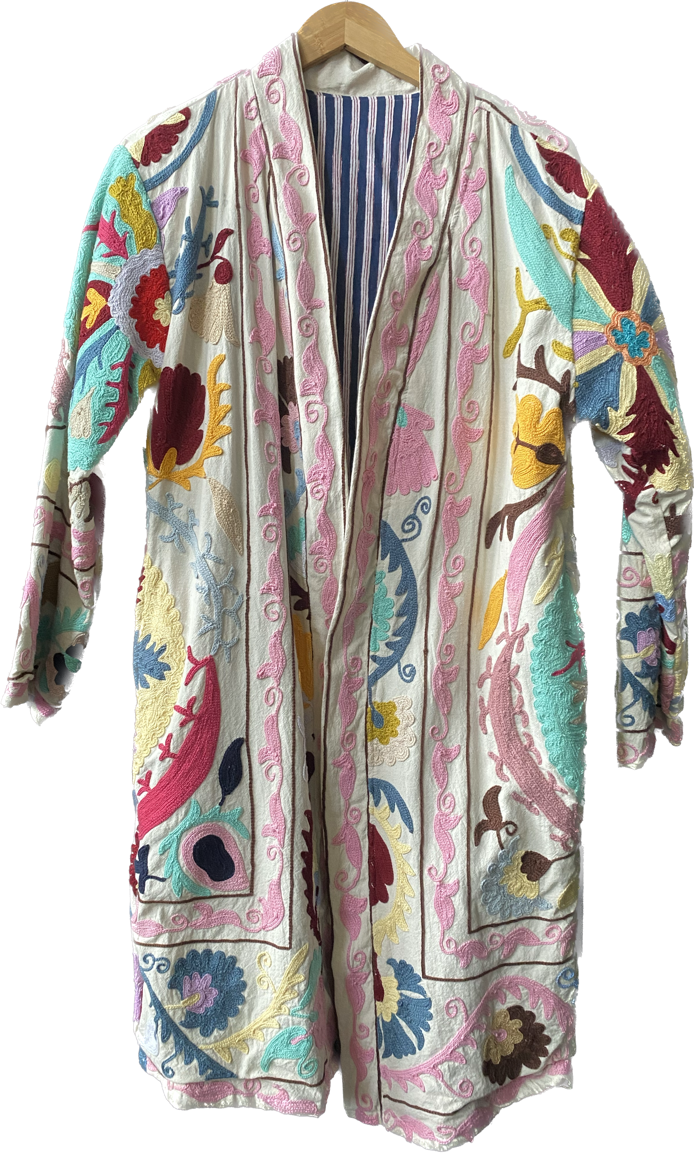 Our upcycled Suzani Coats are a one-of-a-kind treasure for textile lovers. Hand-embroidered and fully lined, each jacket is thoughtfully crafted with unique placement of traditional Suzani textiles—featuring the original border on the lapel and a central motif on the back. With practical details like pockets, a tie waist, and adjustable cuffs, these jackets blend heritage craftsmanship with modern wearability.