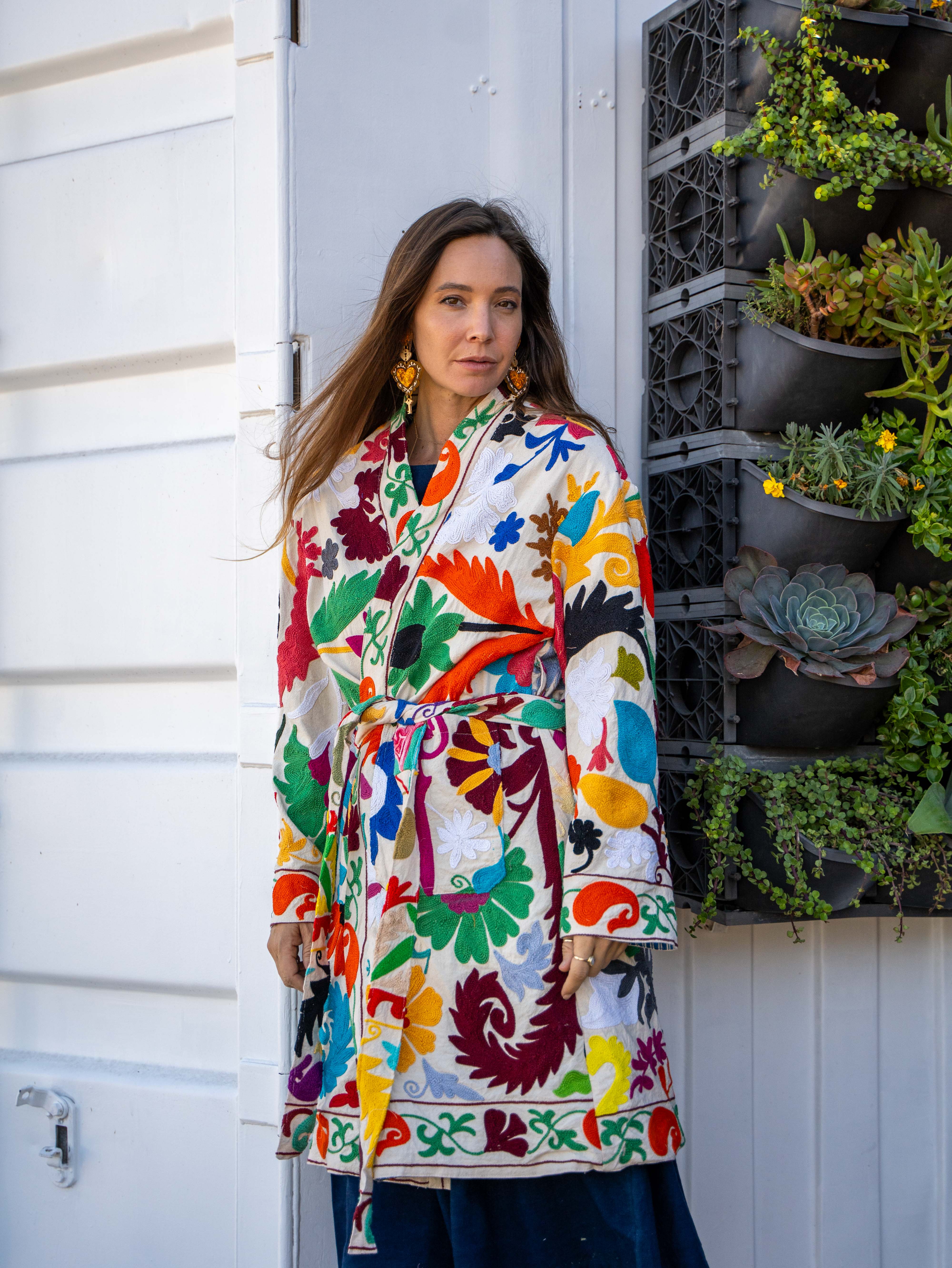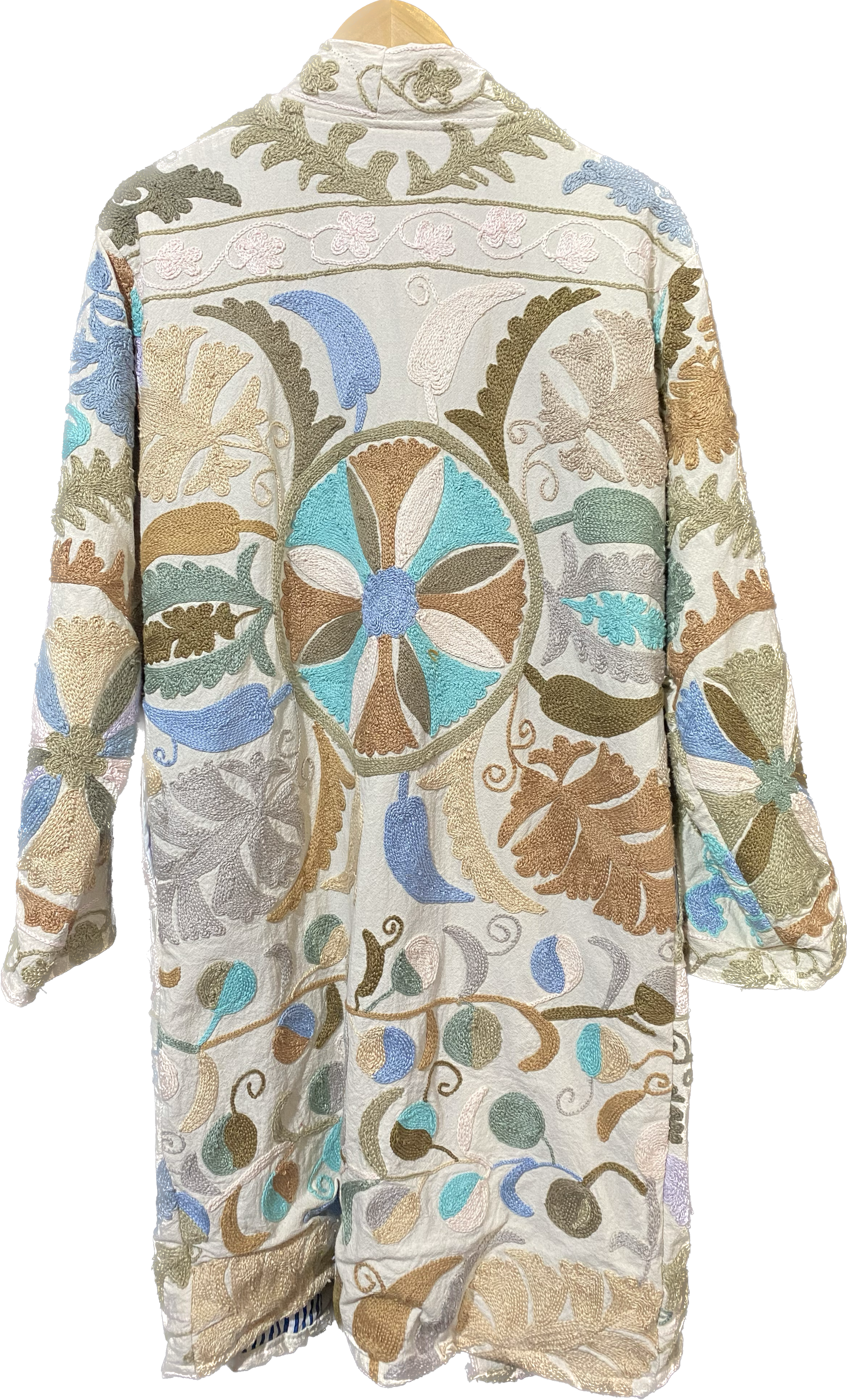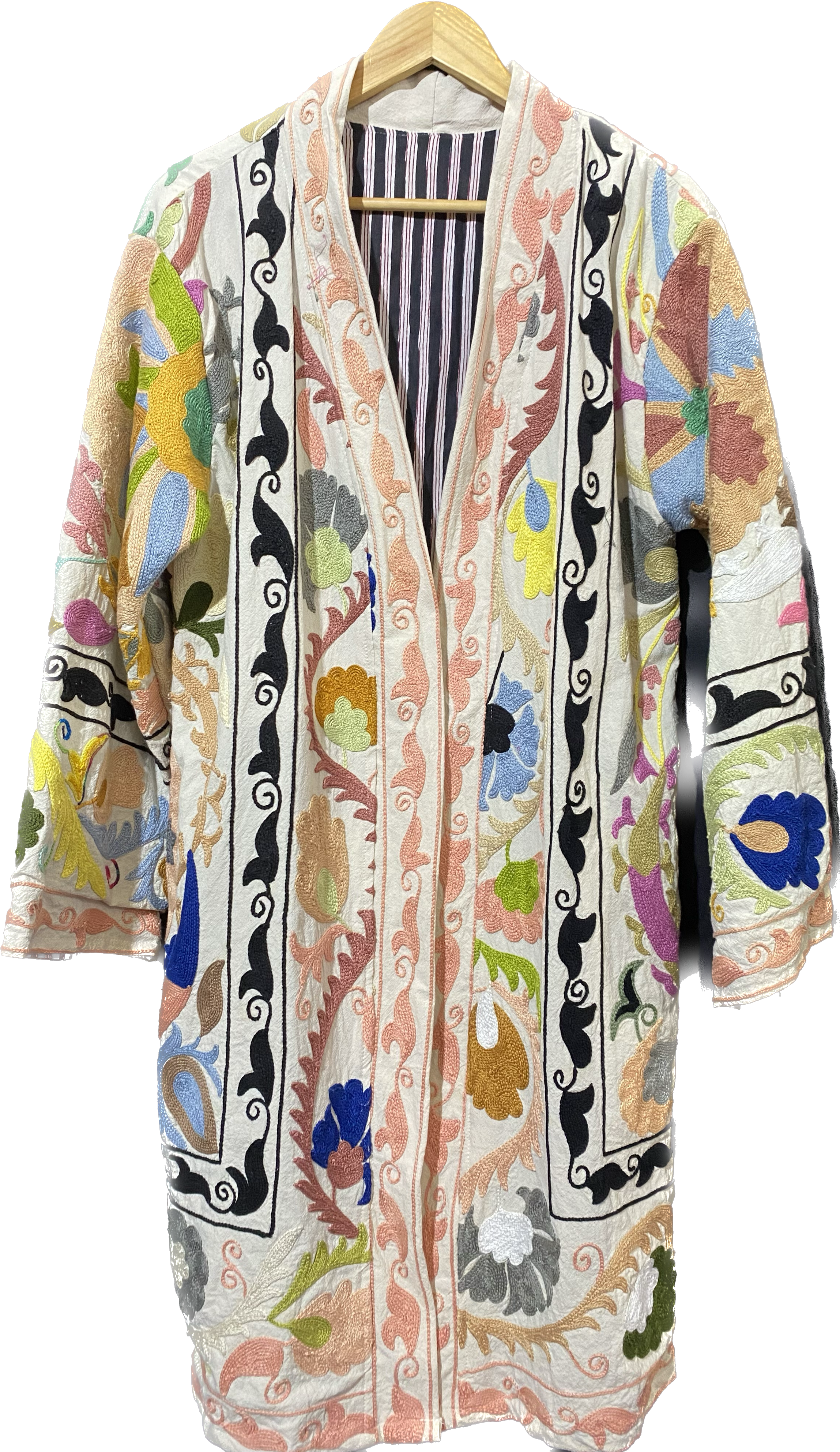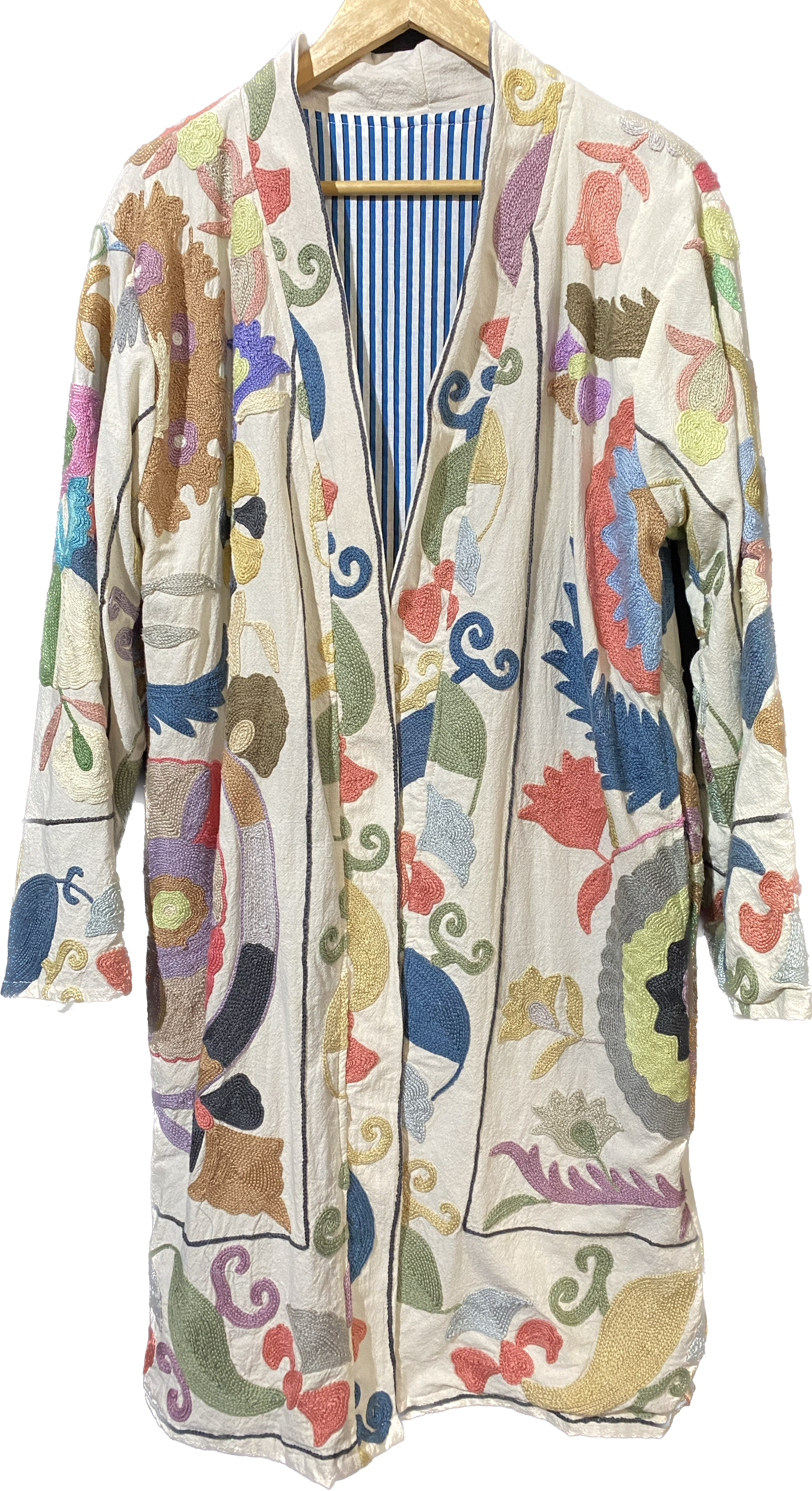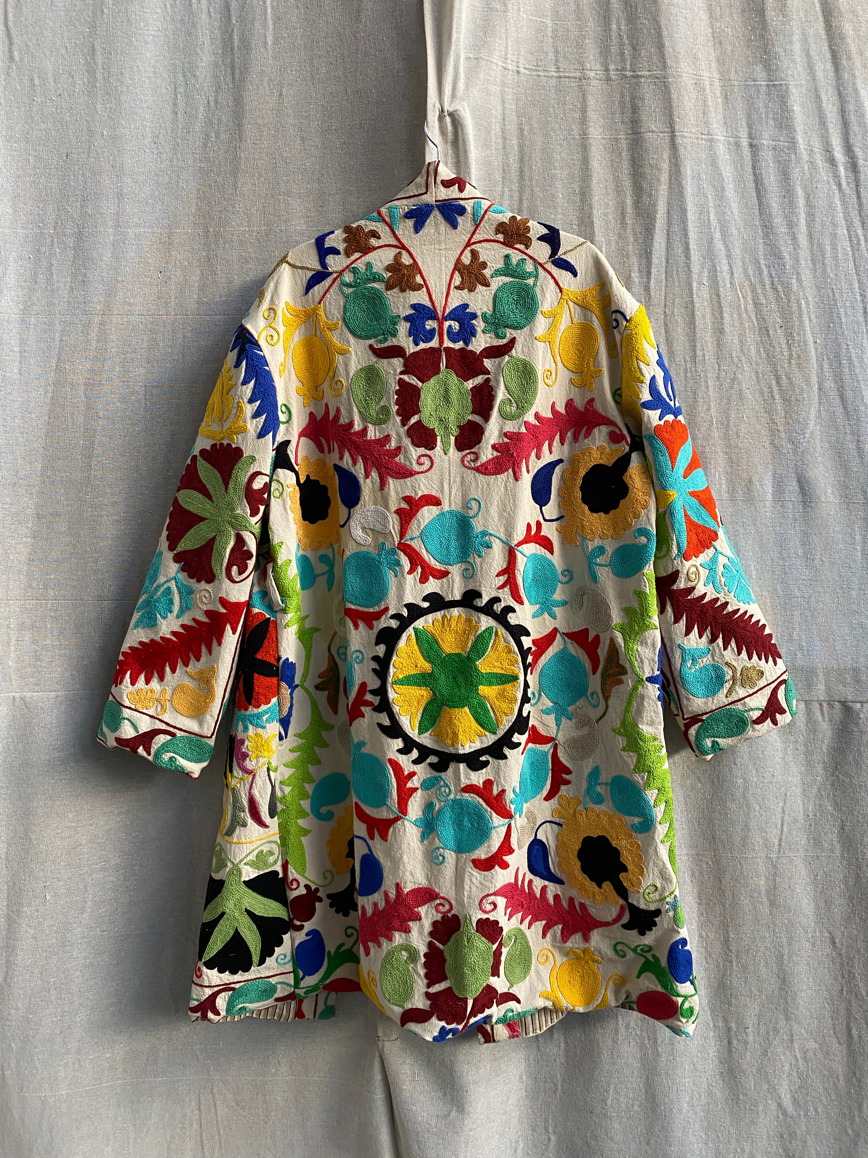Our upcycled Suzani Coats are a one-of-a-kind treasure for textile lovers. Hand-embroidered and fully lined, each jacket is thoughtfully crafted with unique placement of traditional Suzani textiles—featuring the original border on the lapel and a central motif on the back. With practical details like pockets, a tie waist, and adjustable cuffs, these jackets blend heritage craftsmanship with modern wearability.