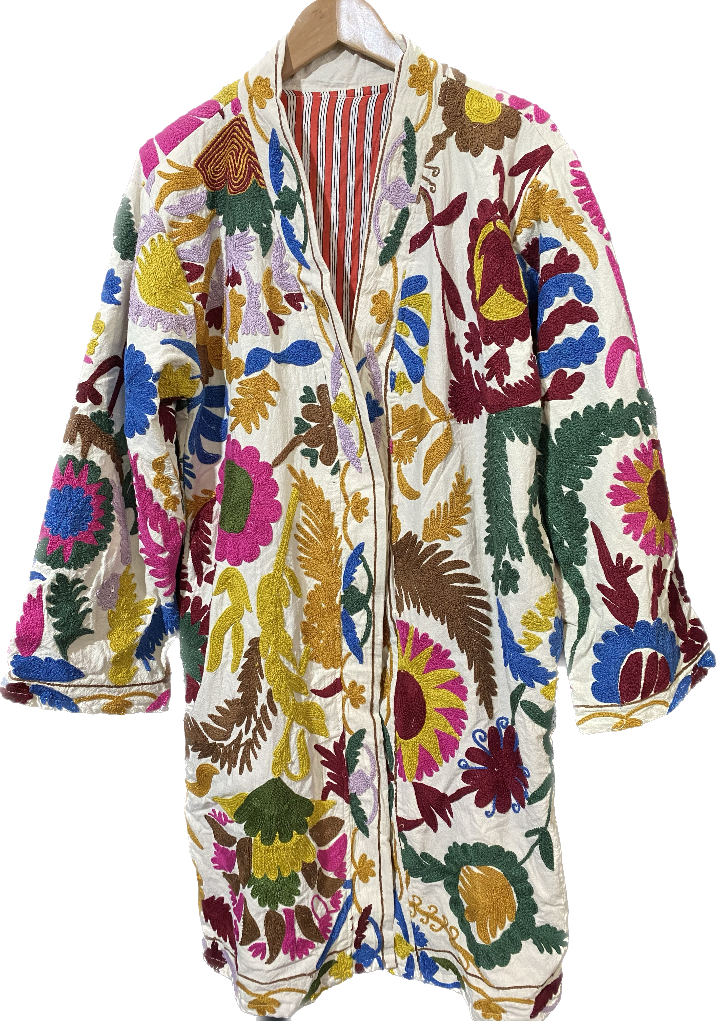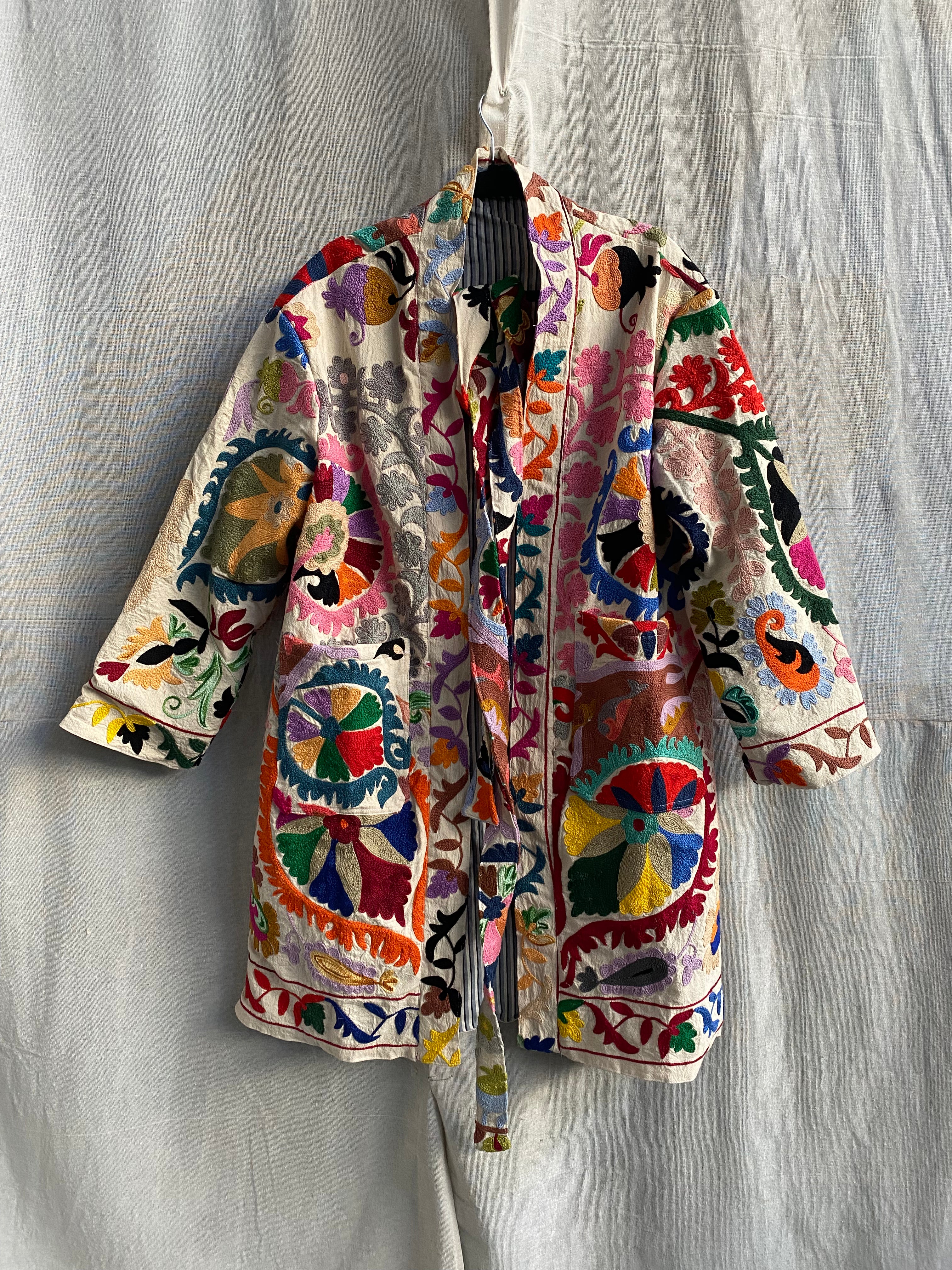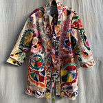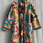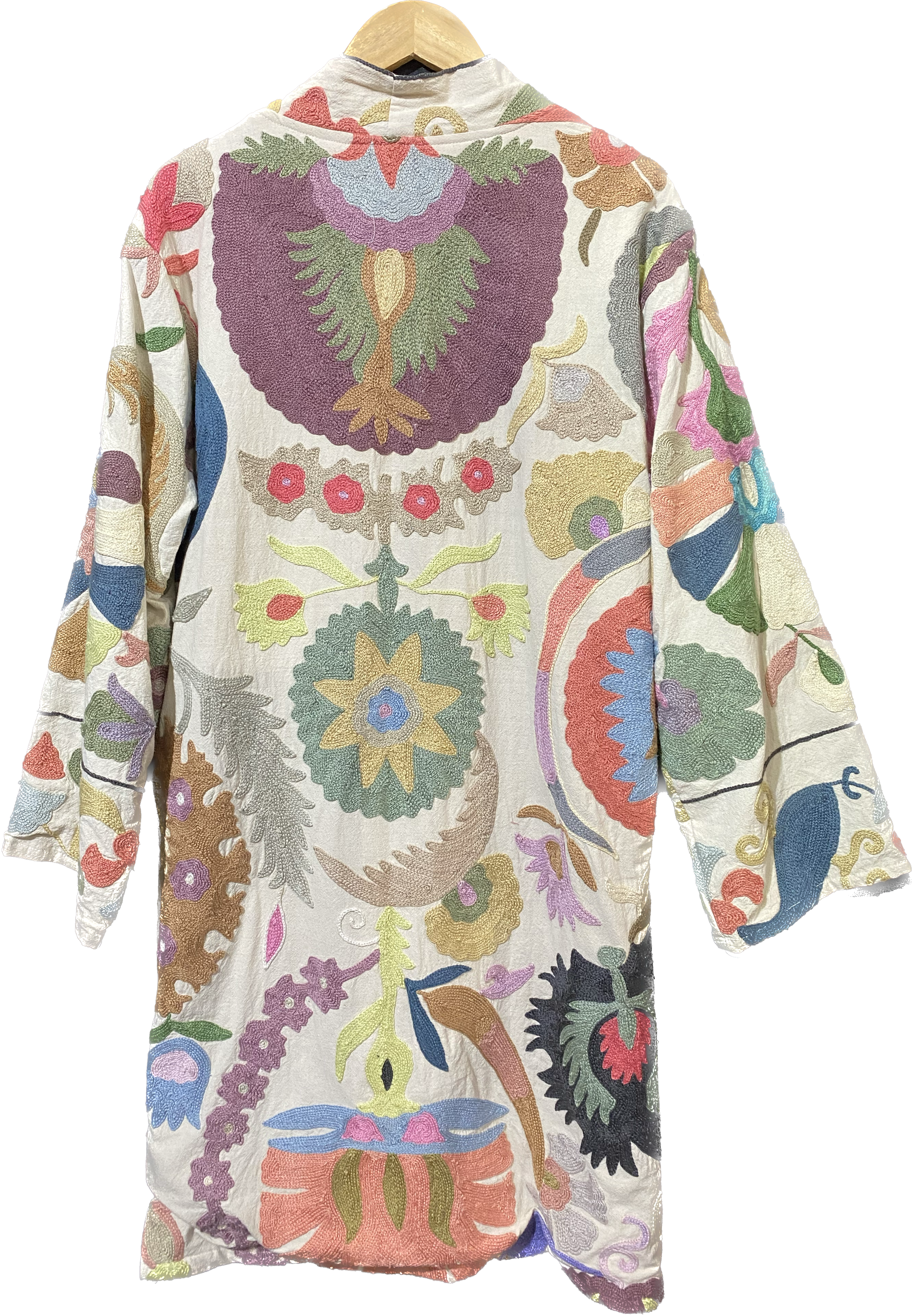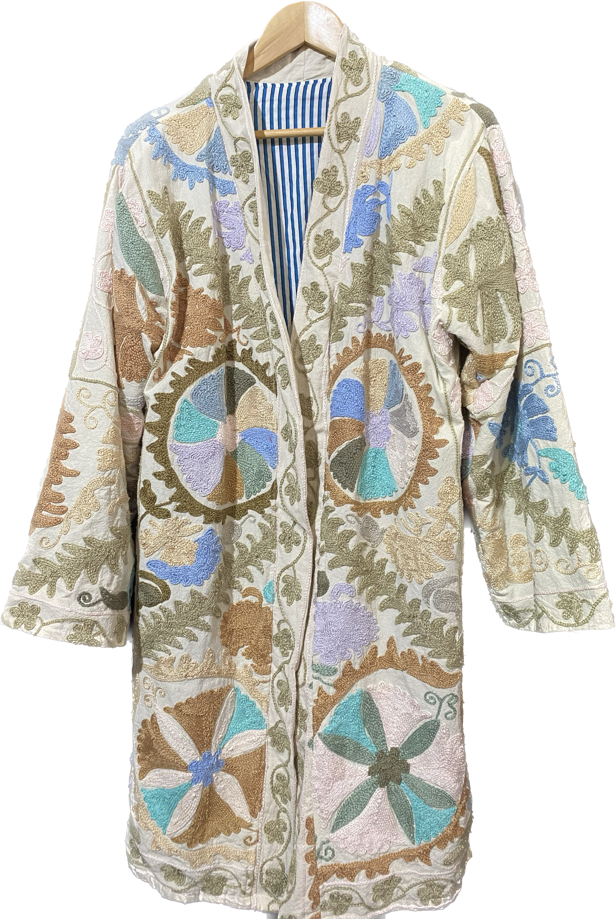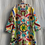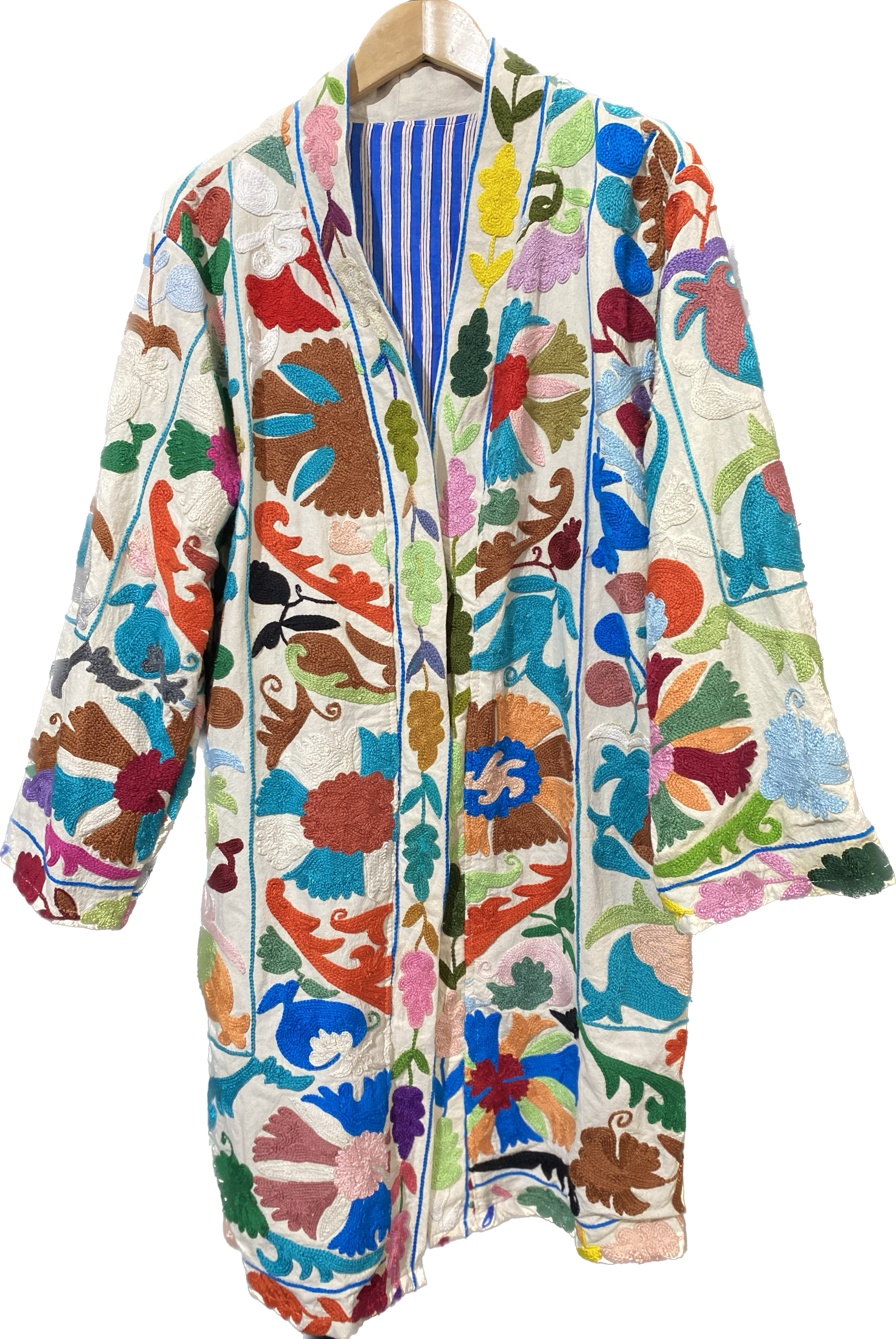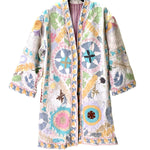 Our upcycled Suzani Coats are a one-of-a-kind treasure for textile lovers. Hand-embroidered and fully lined, each jacket is thoughtfully crafted with unique placement of traditional Suzani textiles—featuring the original border on the lapel and a central motif on the back. With practical details like pockets, a tie waist, and adjustable cuffs, these jackets blend heritage craftsmanship with modern wearability.