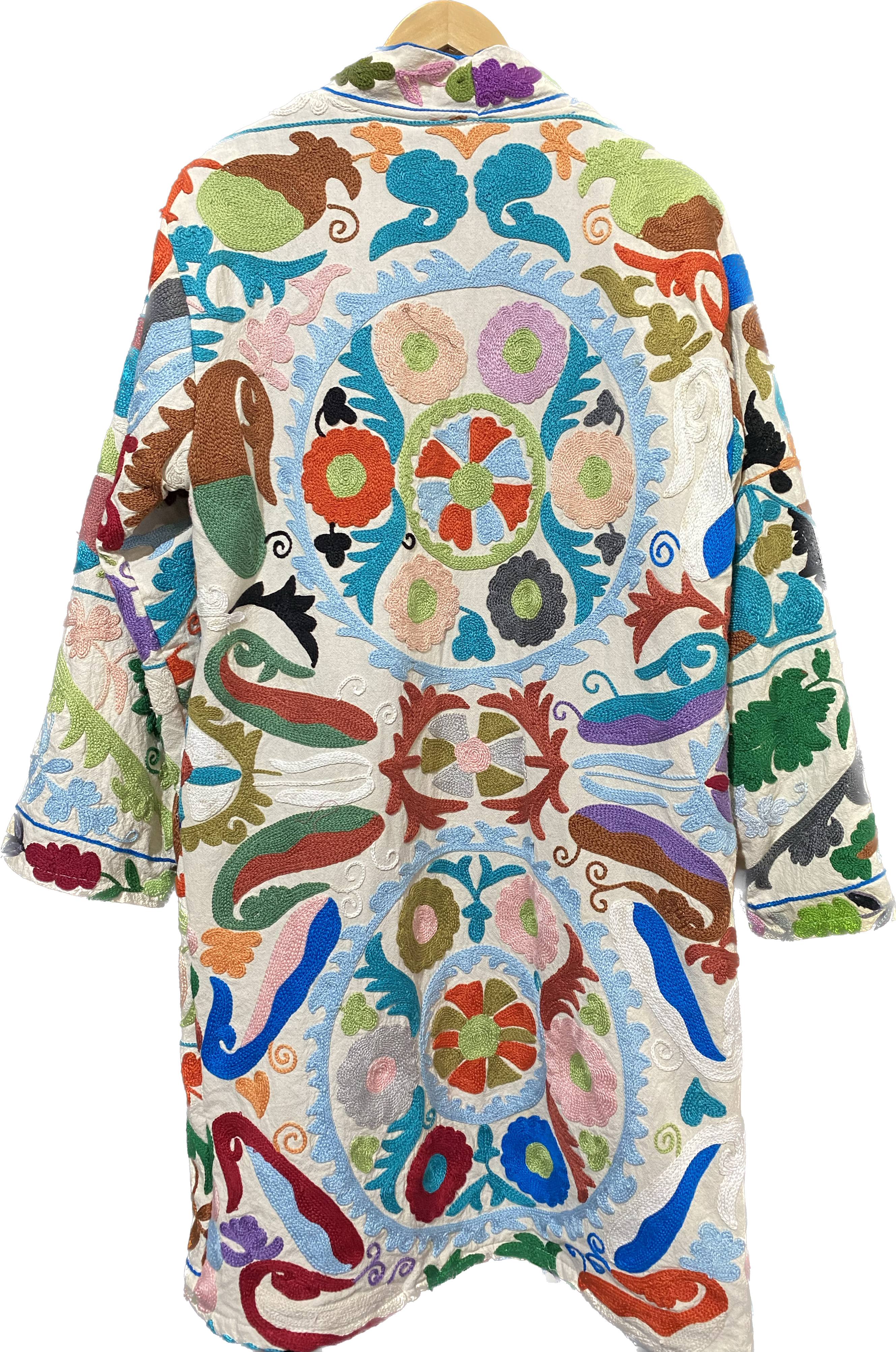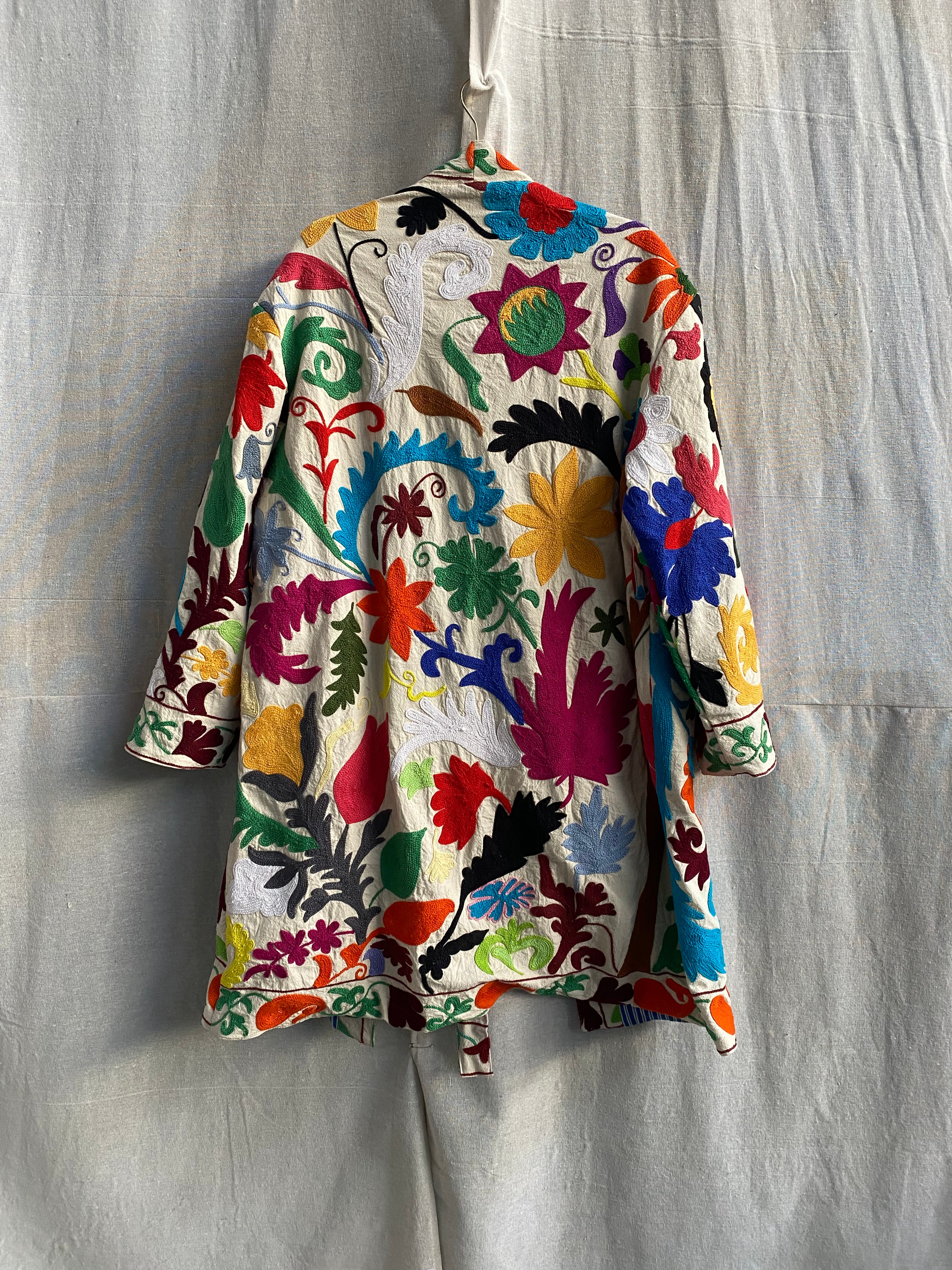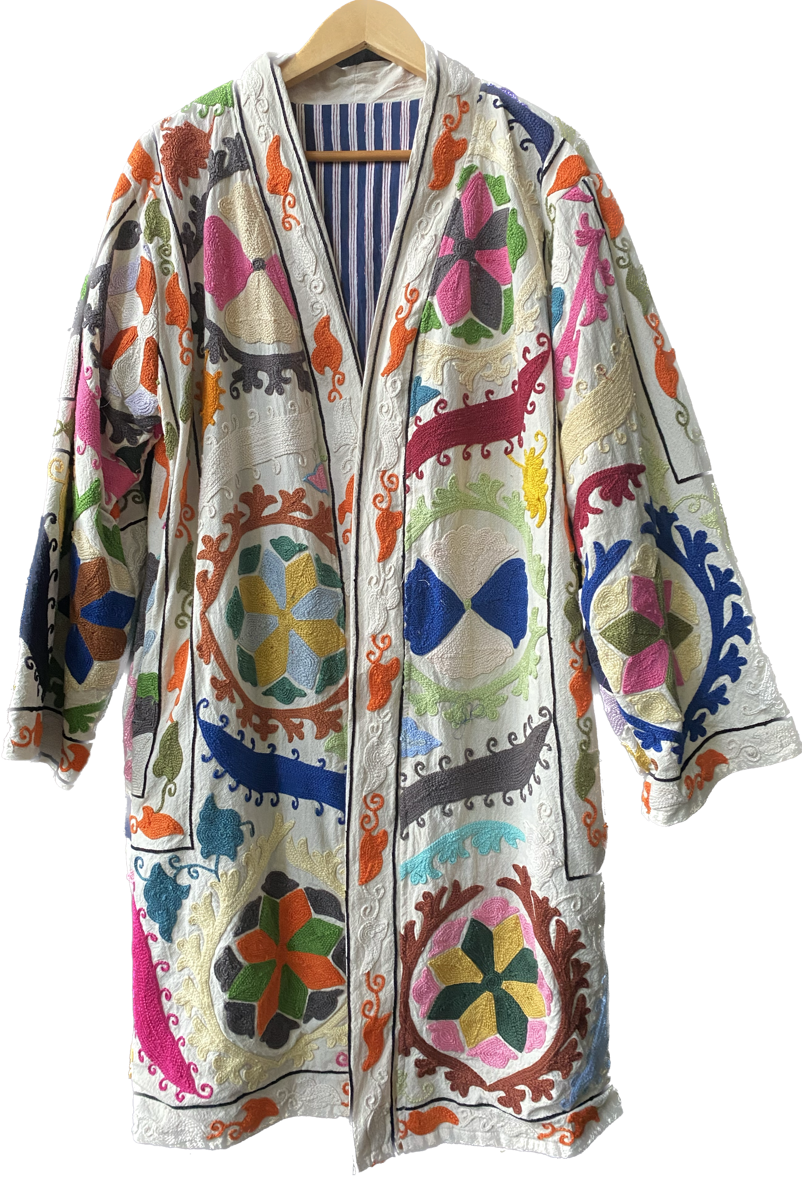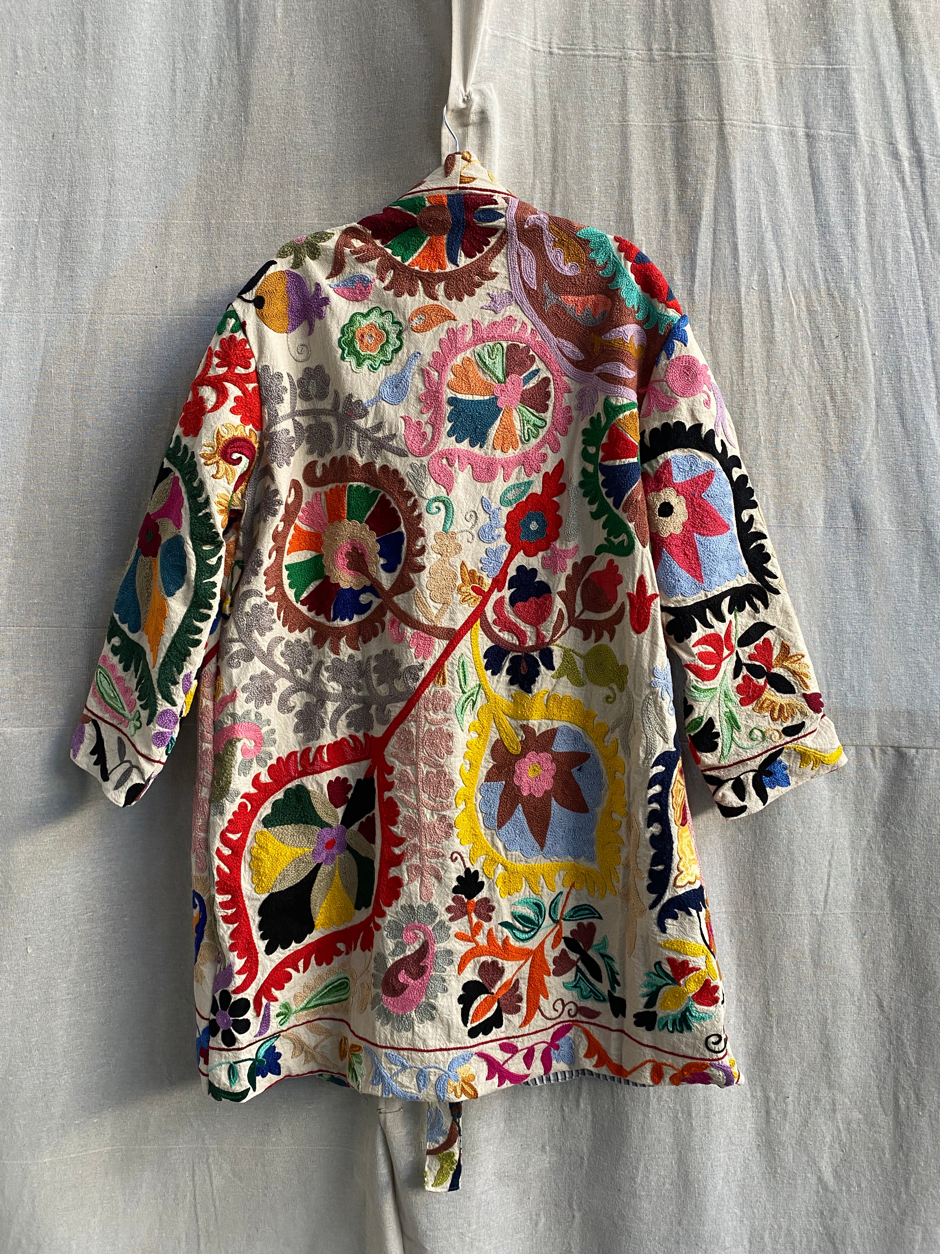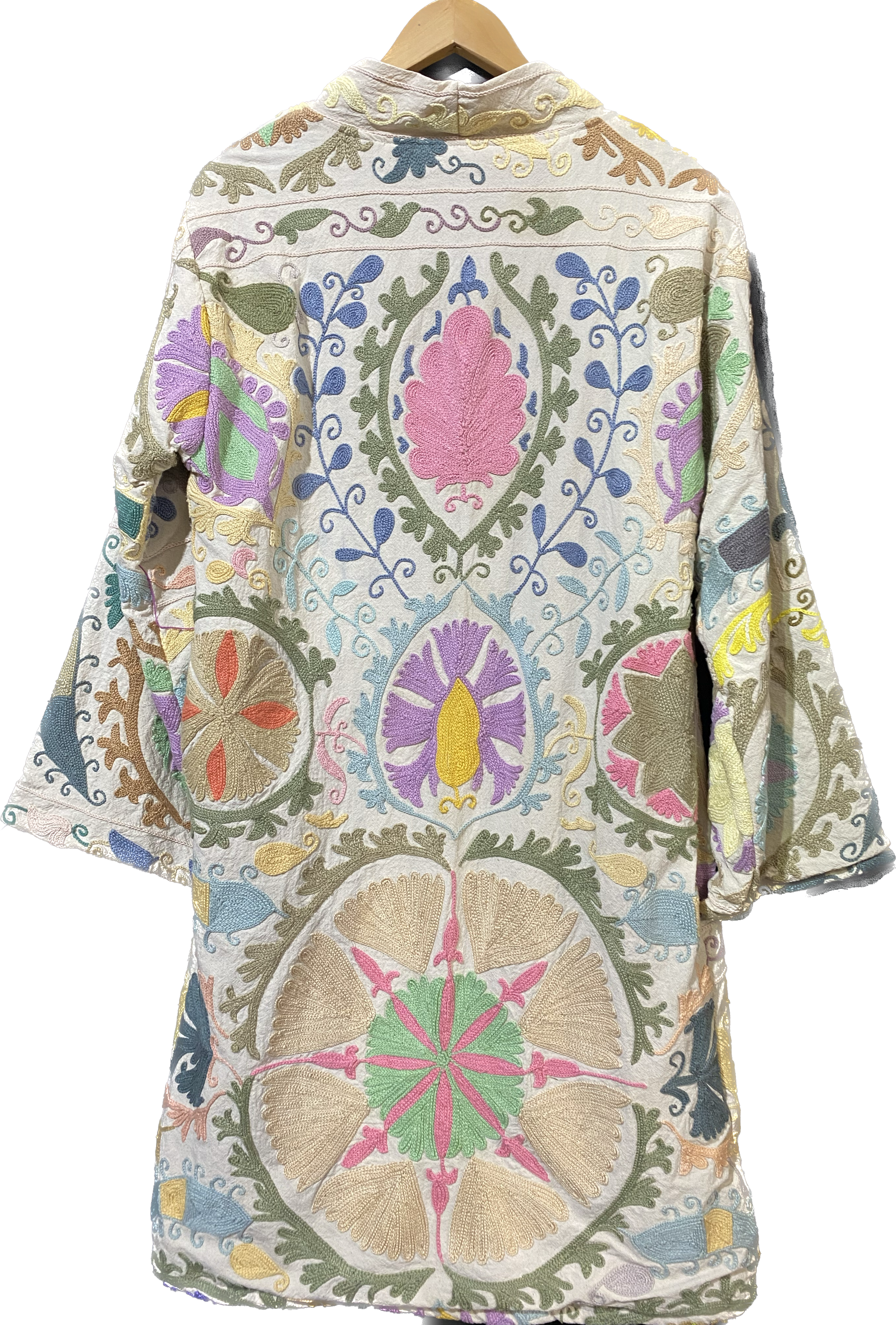 Our upcycled Suzani Coats are a one-of-a-kind treasure for textile lovers. Hand-embroidered and fully lined, each jacket is thoughtfully crafted with unique placement of traditional Suzani textiles—featuring the original border on the lapel and a central motif on the back. With practical details like pockets, a tie waist, and adjustable cuffs, these jackets blend heritage craftsmanship with modern wearability.