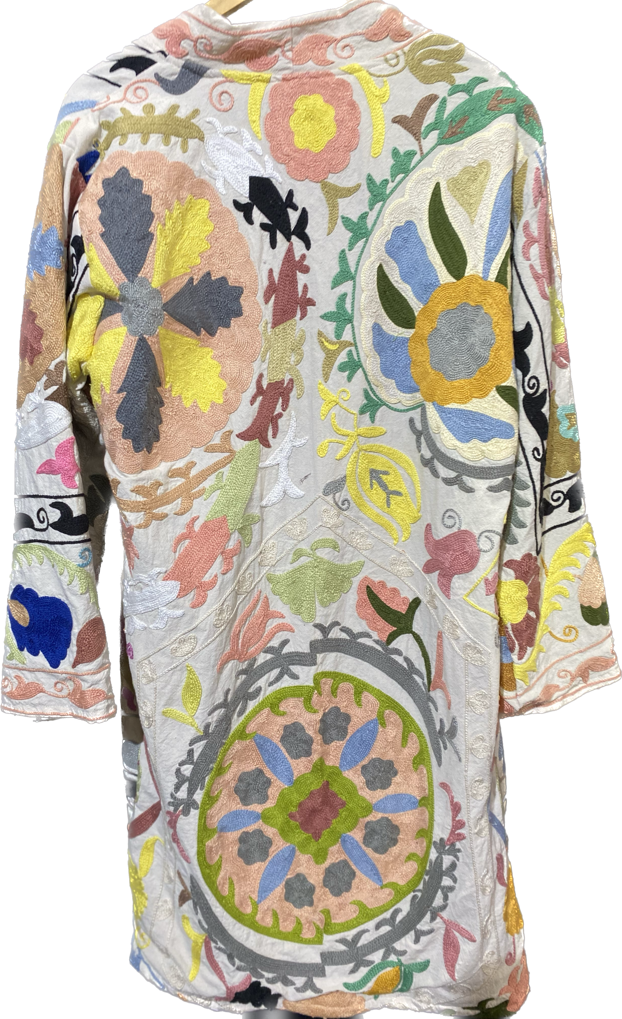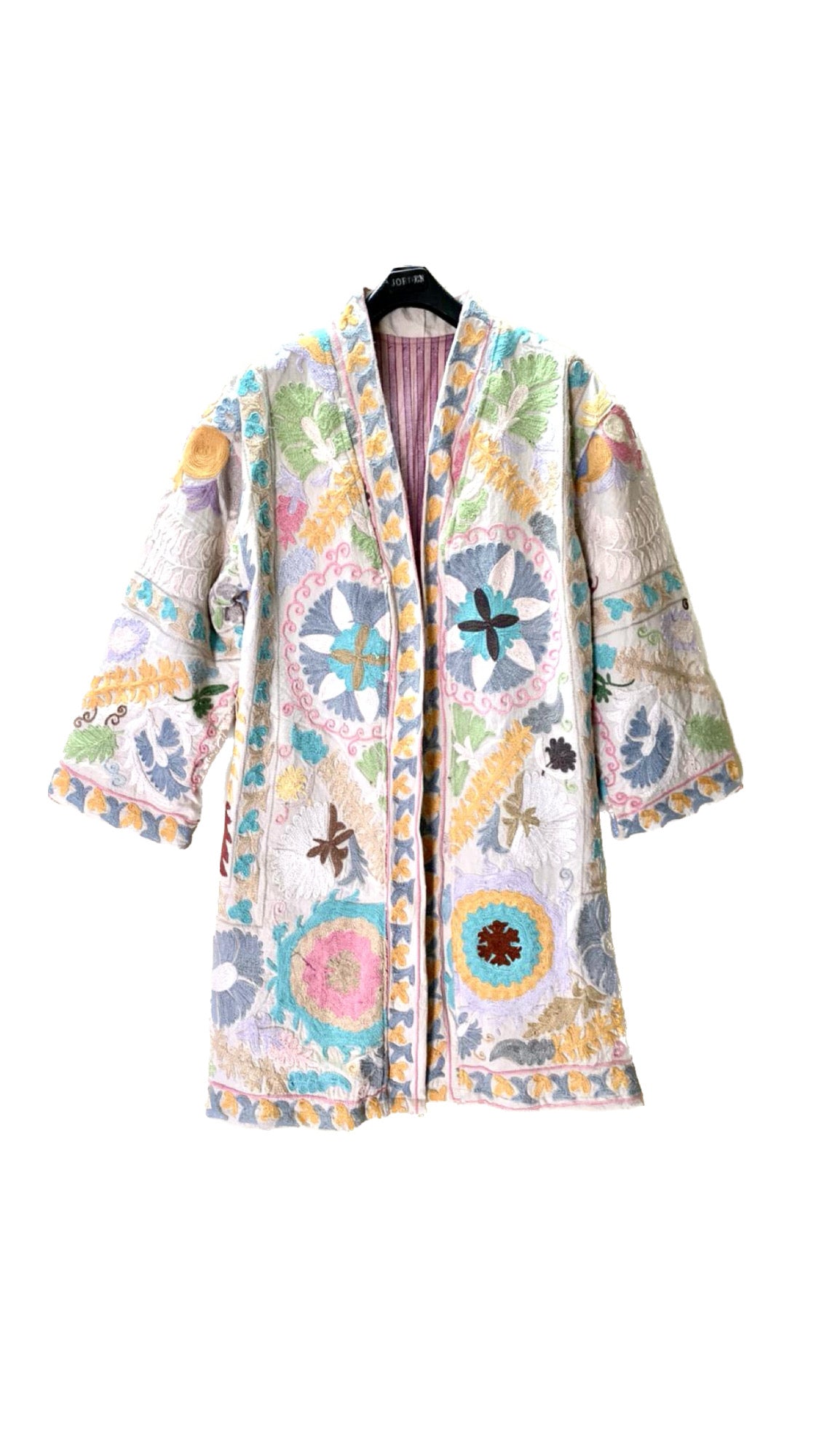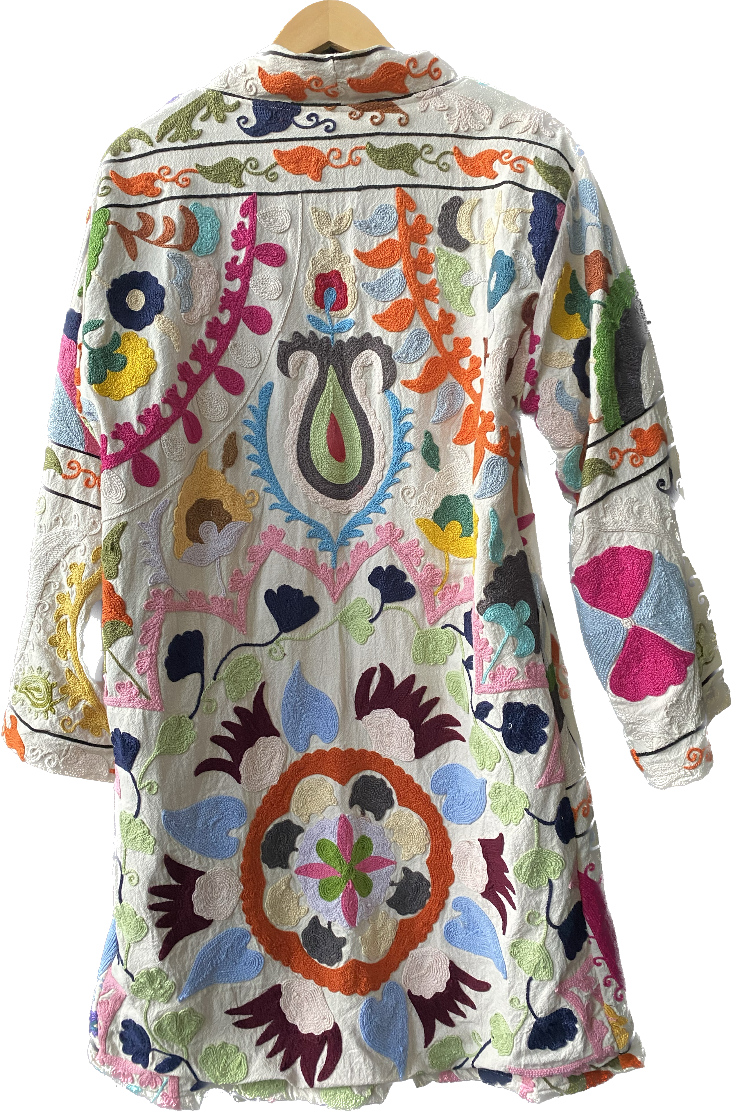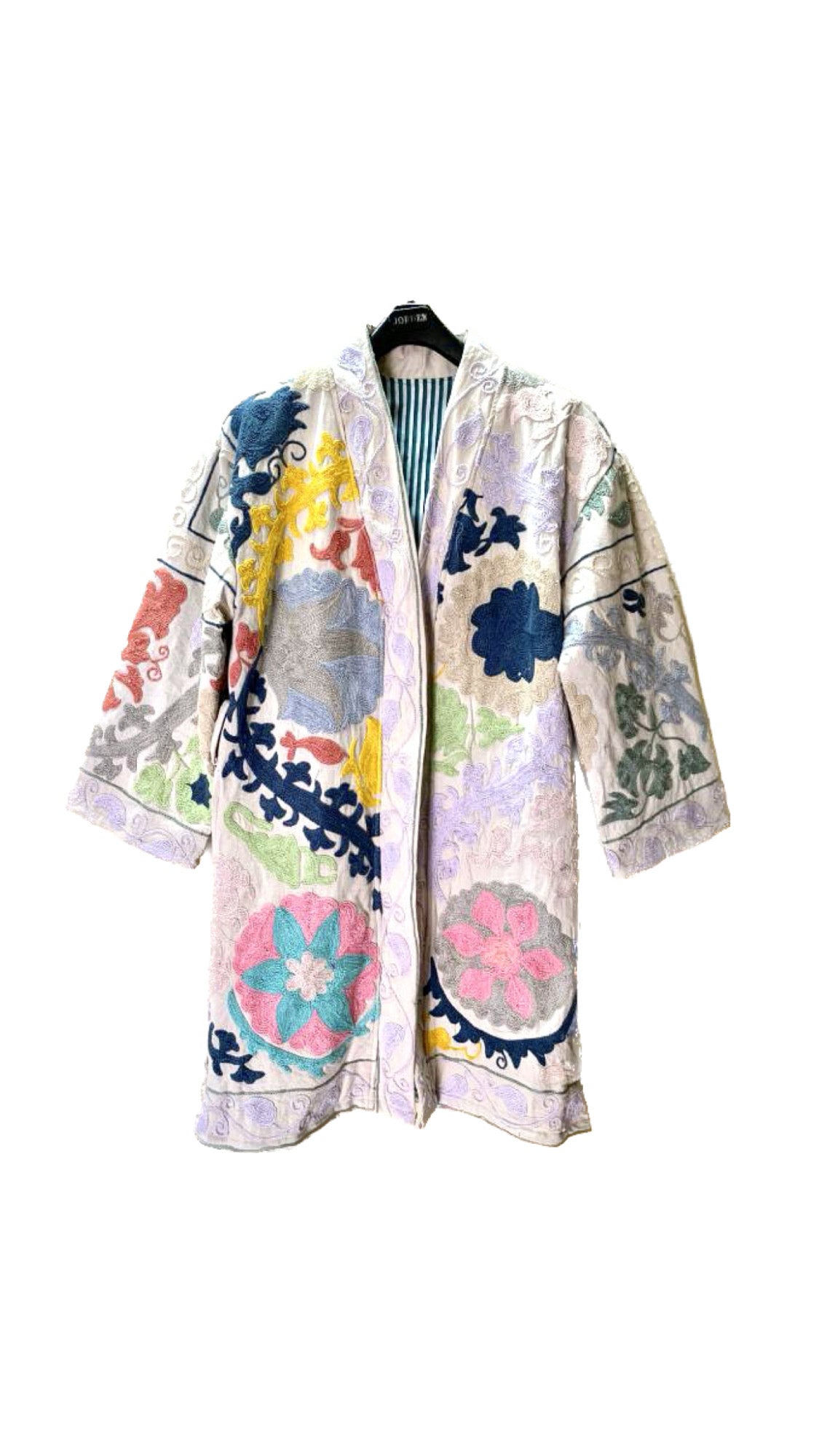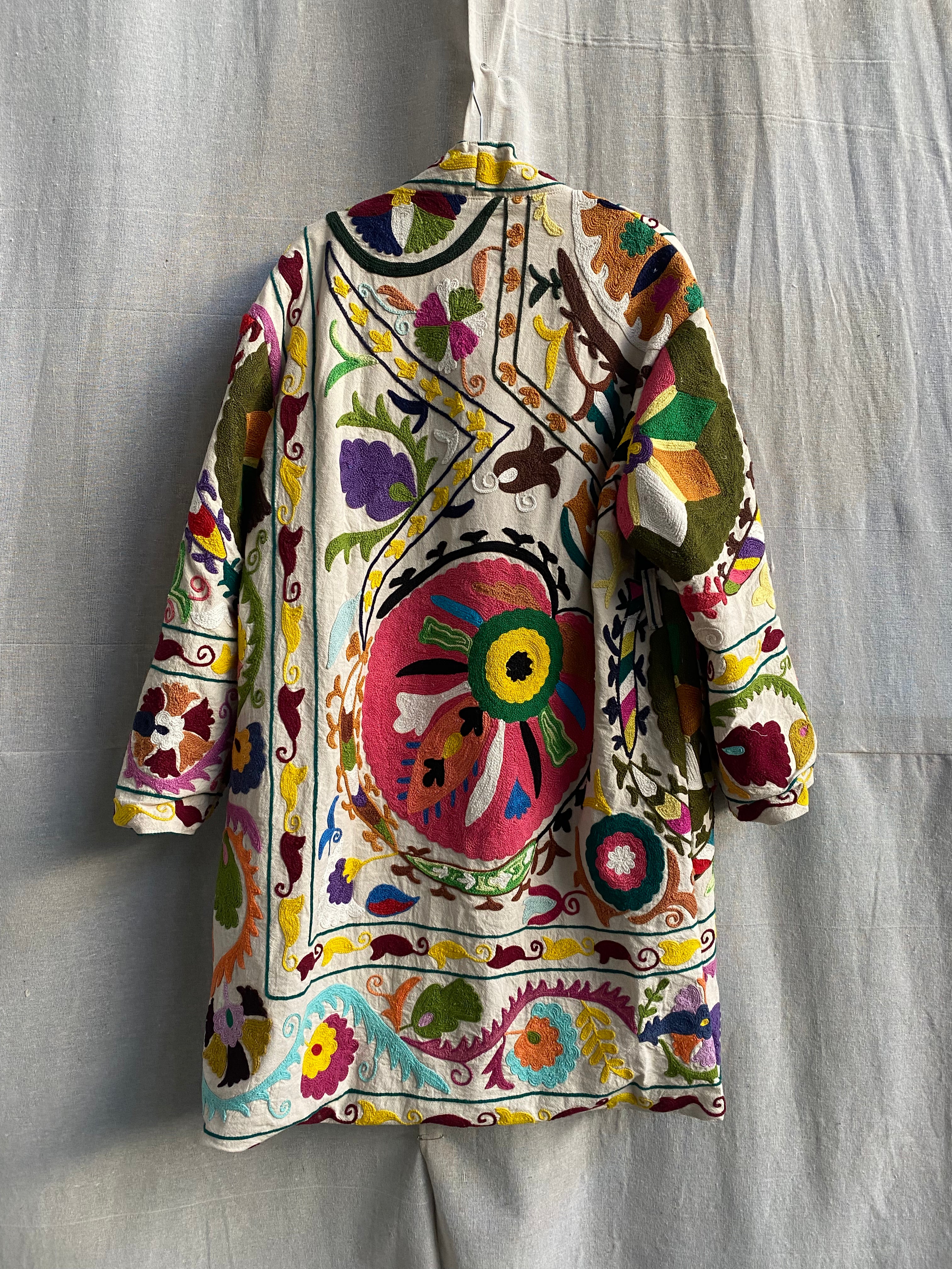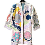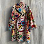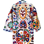 Our upcycled Suzani Coats are a one-of-a-kind treasure for textile lovers. Hand-embroidered and fully lined, each jacket is thoughtfully crafted with unique placement of traditional Suzani textiles—featuring the original border on the lapel and a central motif on the back. With practical details like pockets, a tie waist, and adjustable cuffs, these jackets blend heritage craftsmanship with modern wearability.