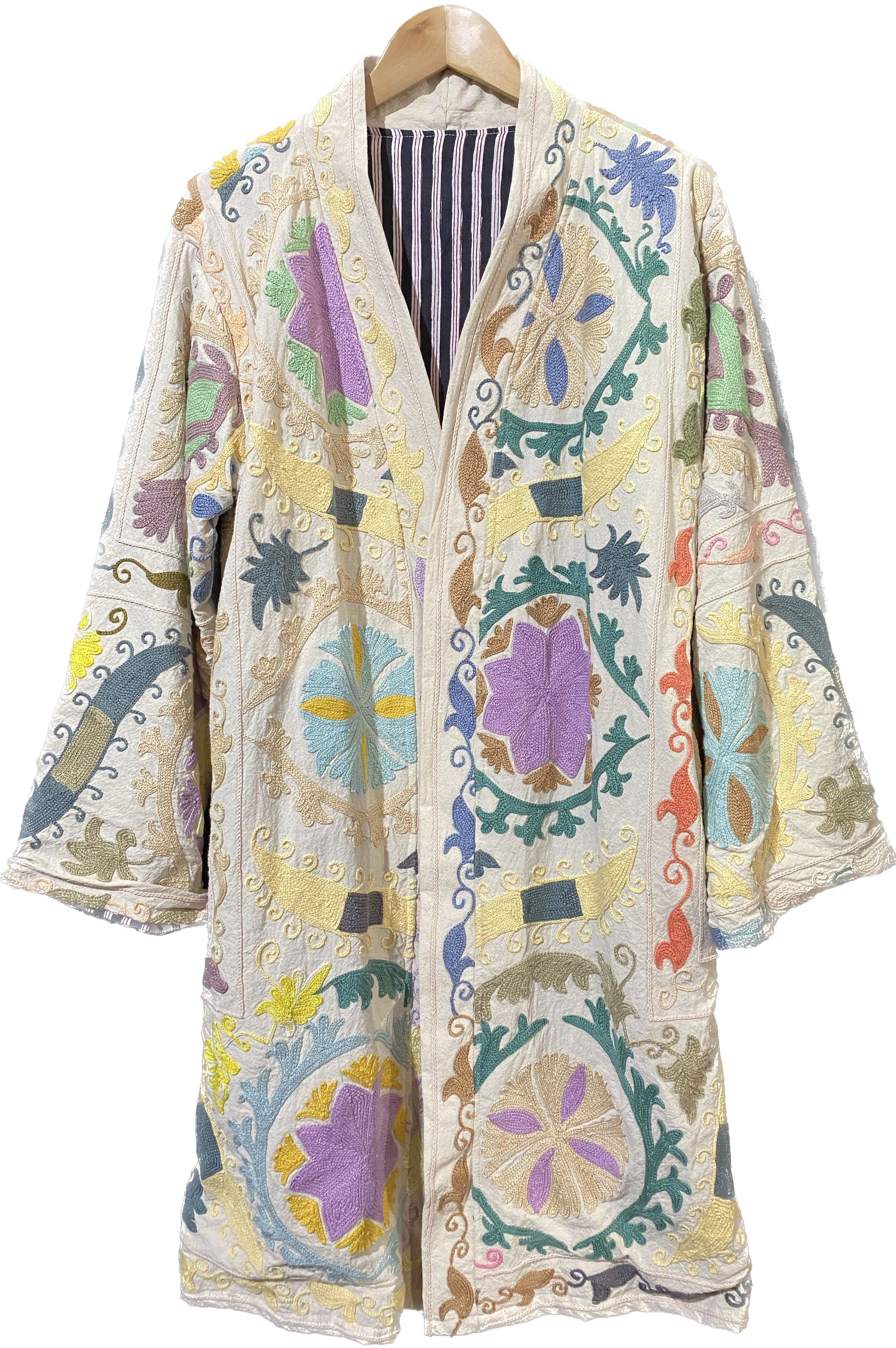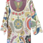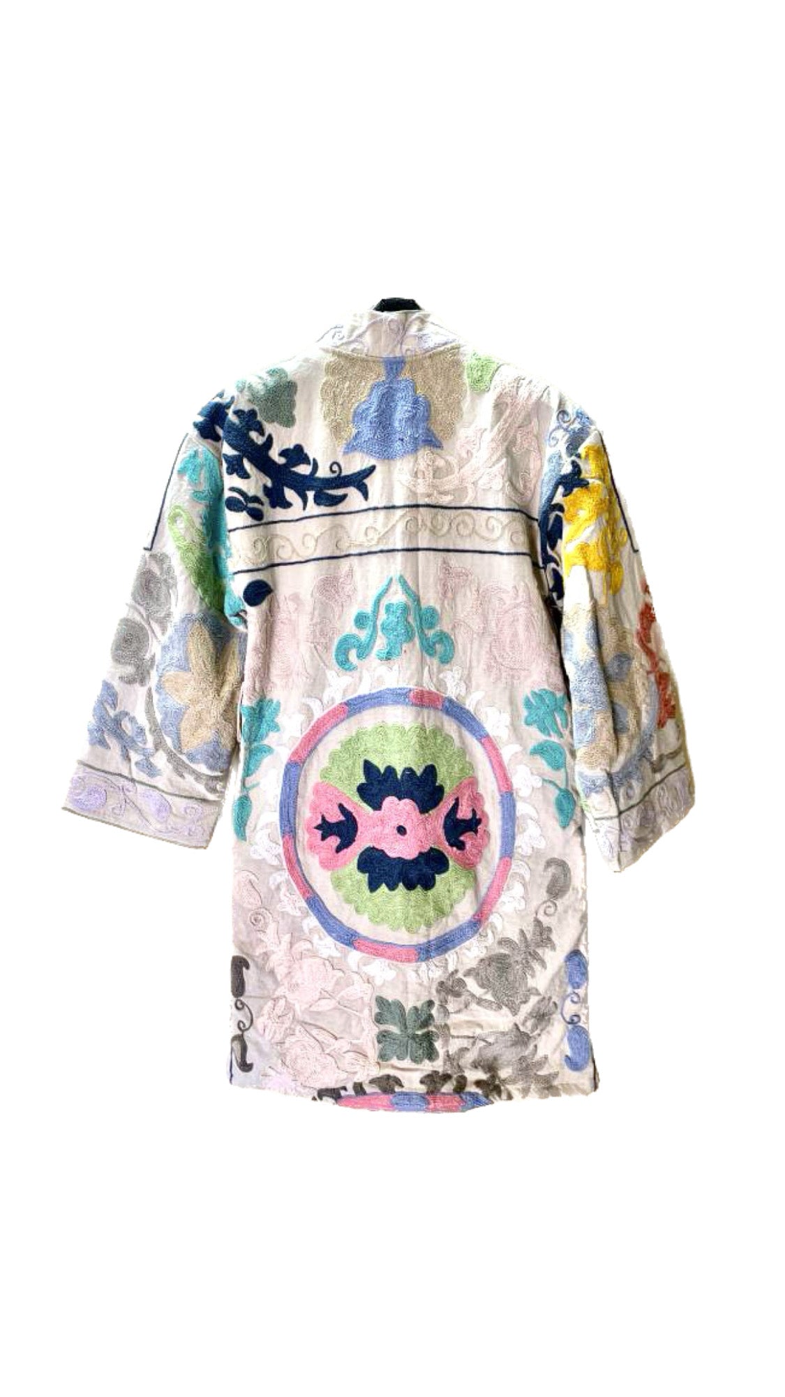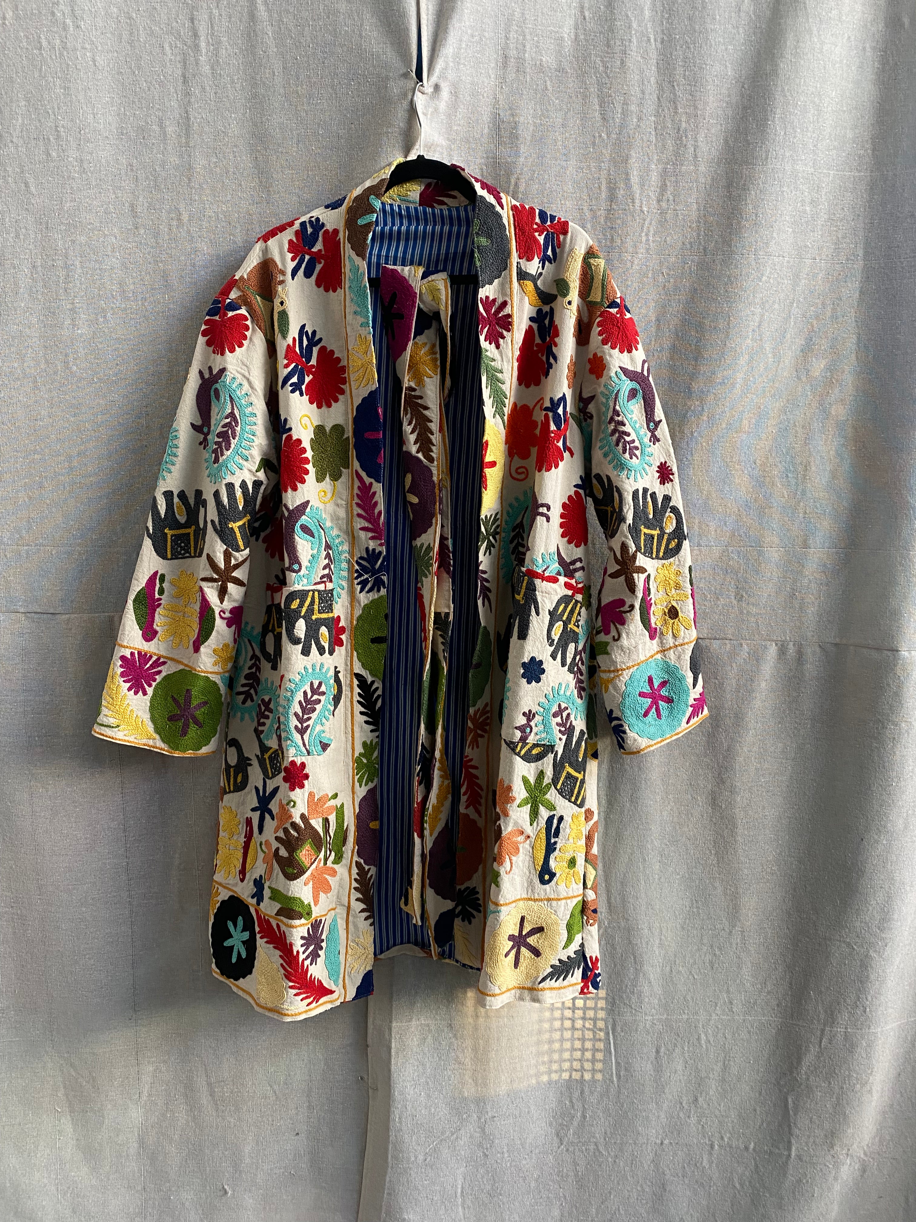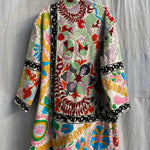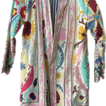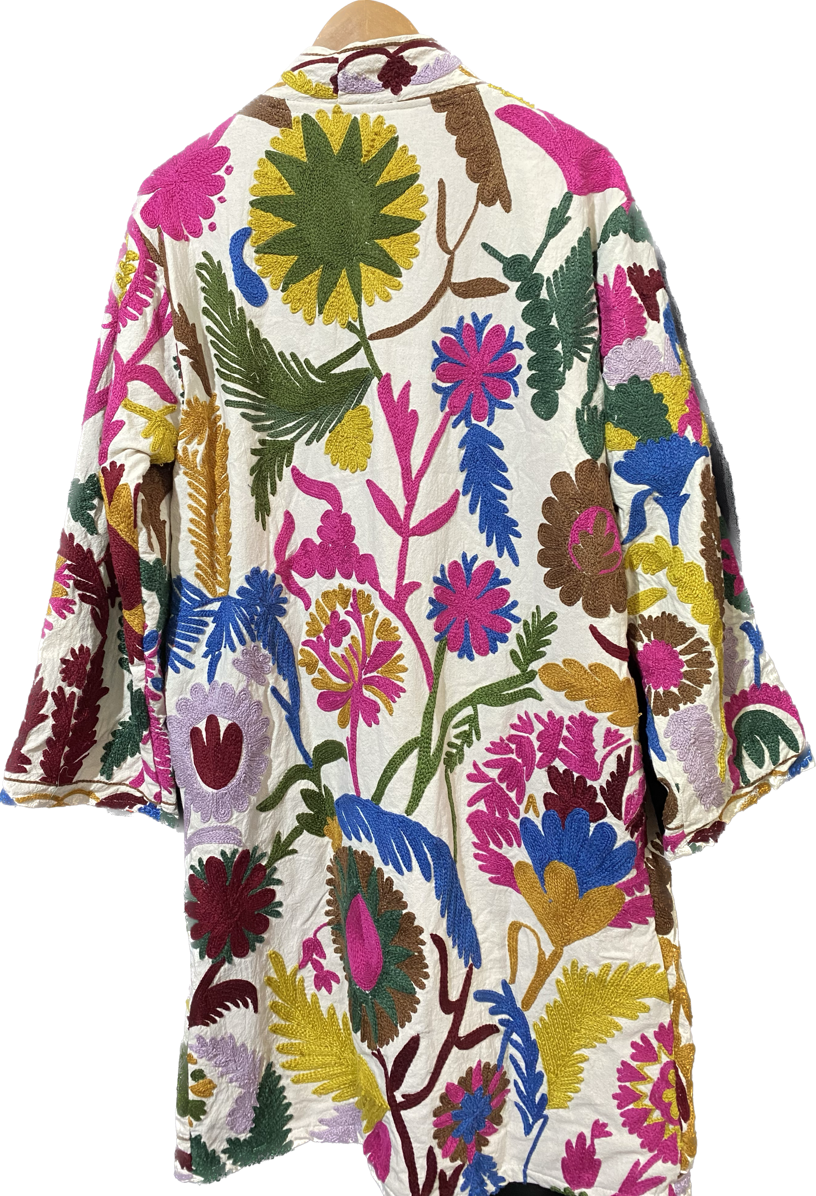 Our upcycled Suzani Coats are a one-of-a-kind treasure for textile lovers. Hand-embroidered and fully lined, each jacket is thoughtfully crafted with unique placement of traditional Suzani textiles—featuring the original border on the lapel and a central motif on the back. With practical details like pockets, a tie waist, and adjustable cuffs, these jackets blend heritage craftsmanship with modern wearability.