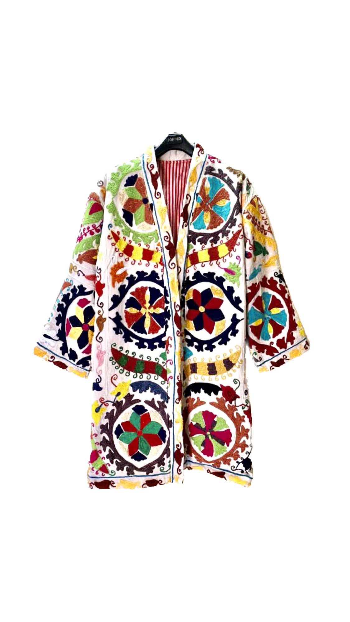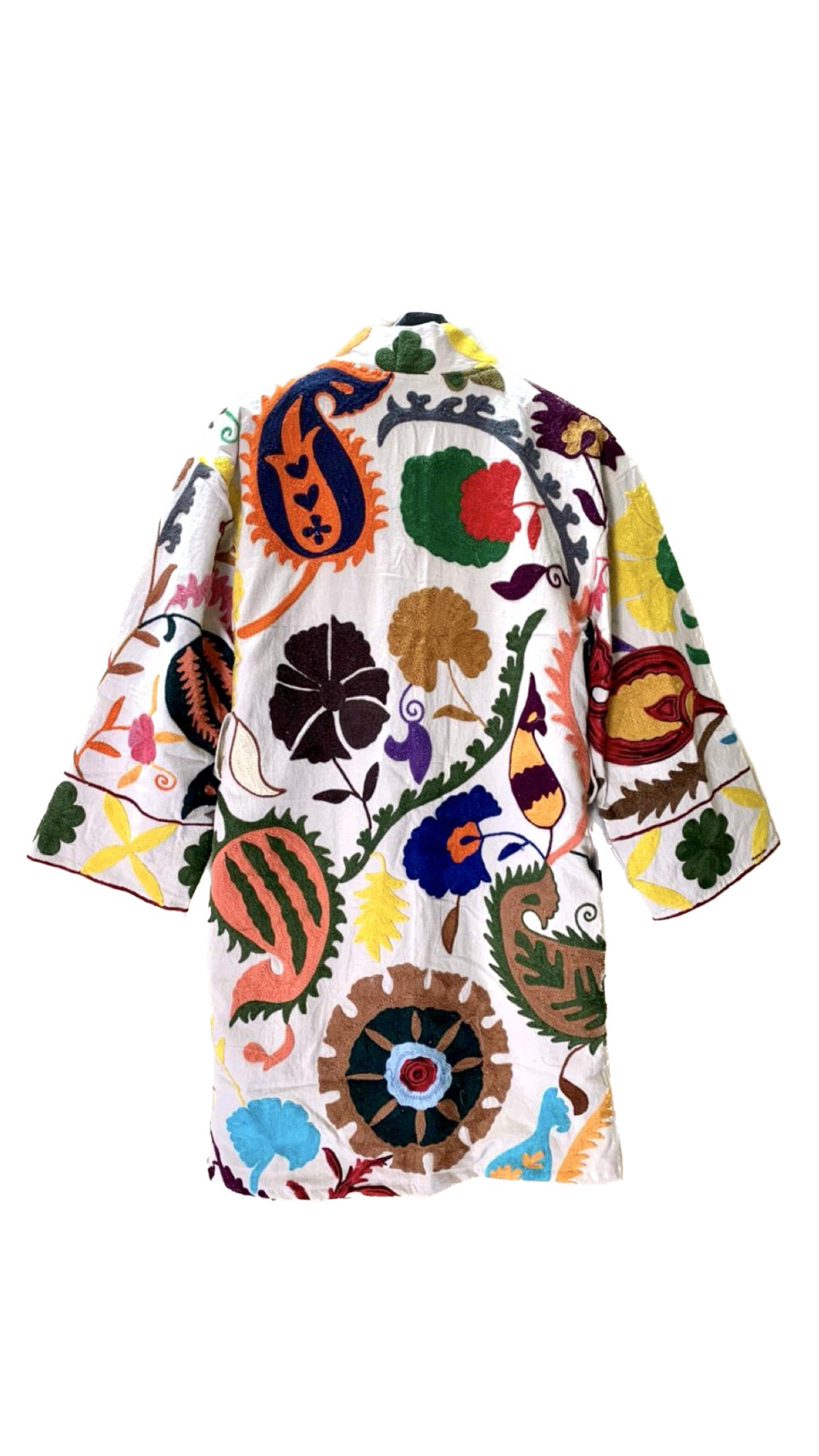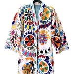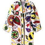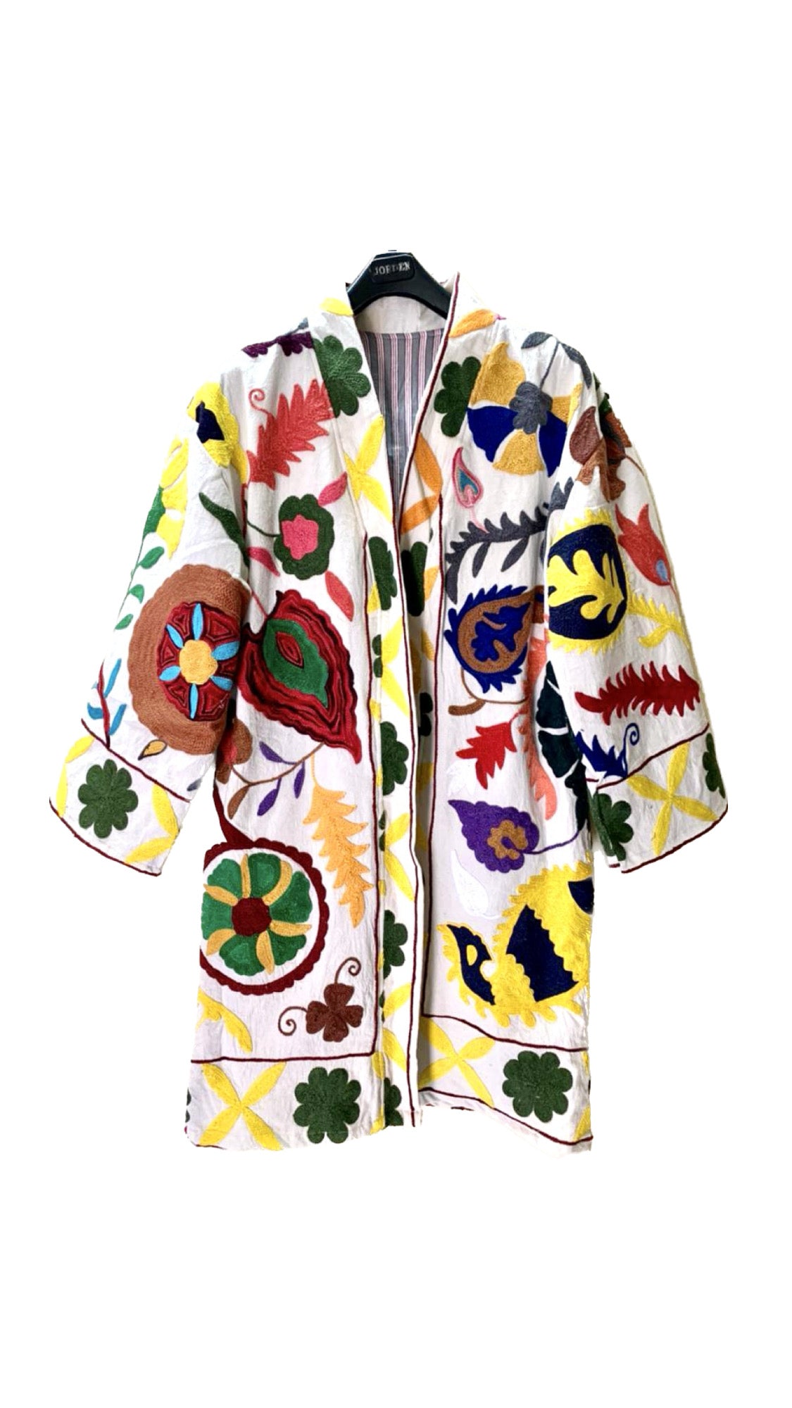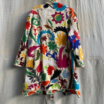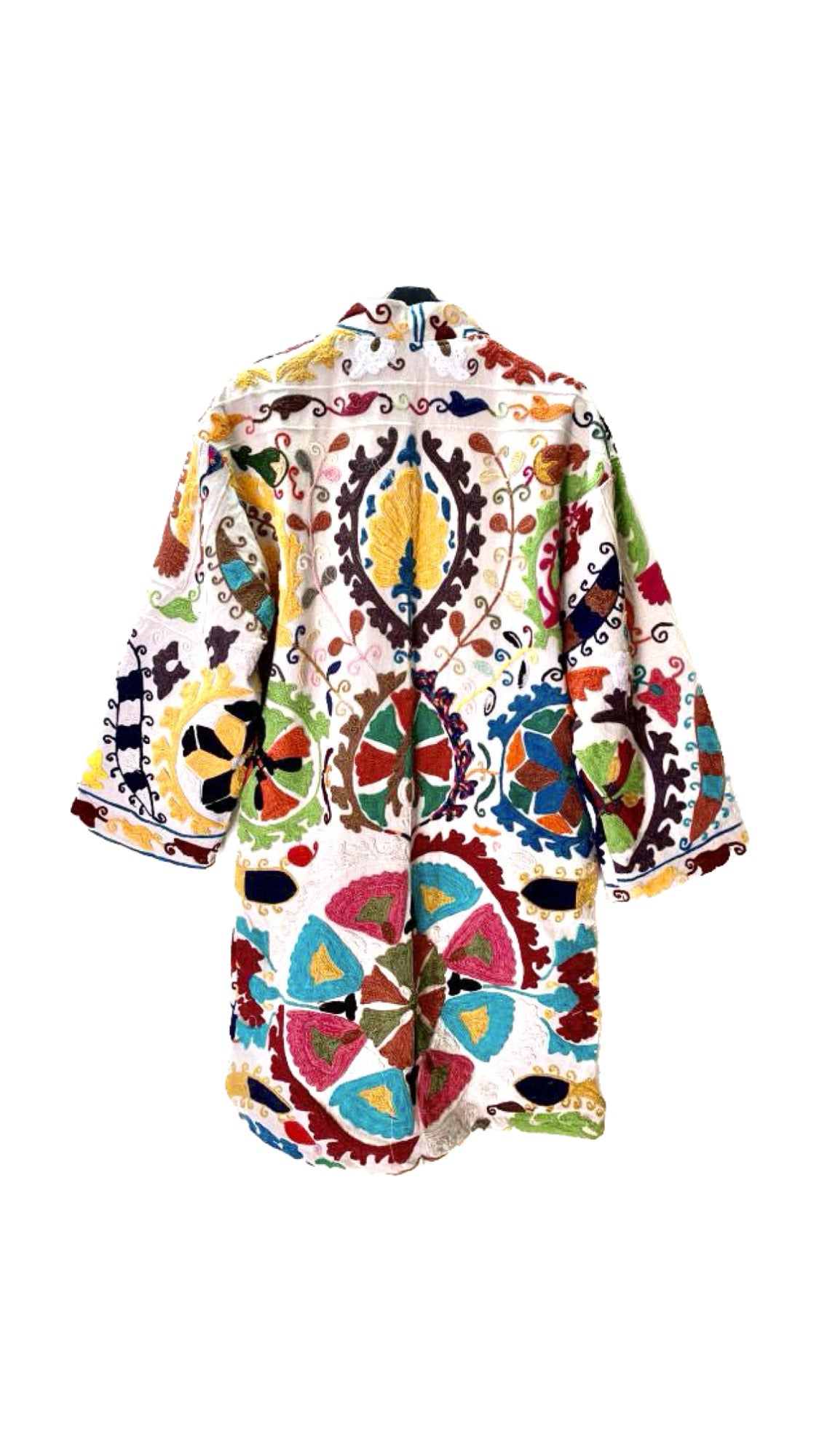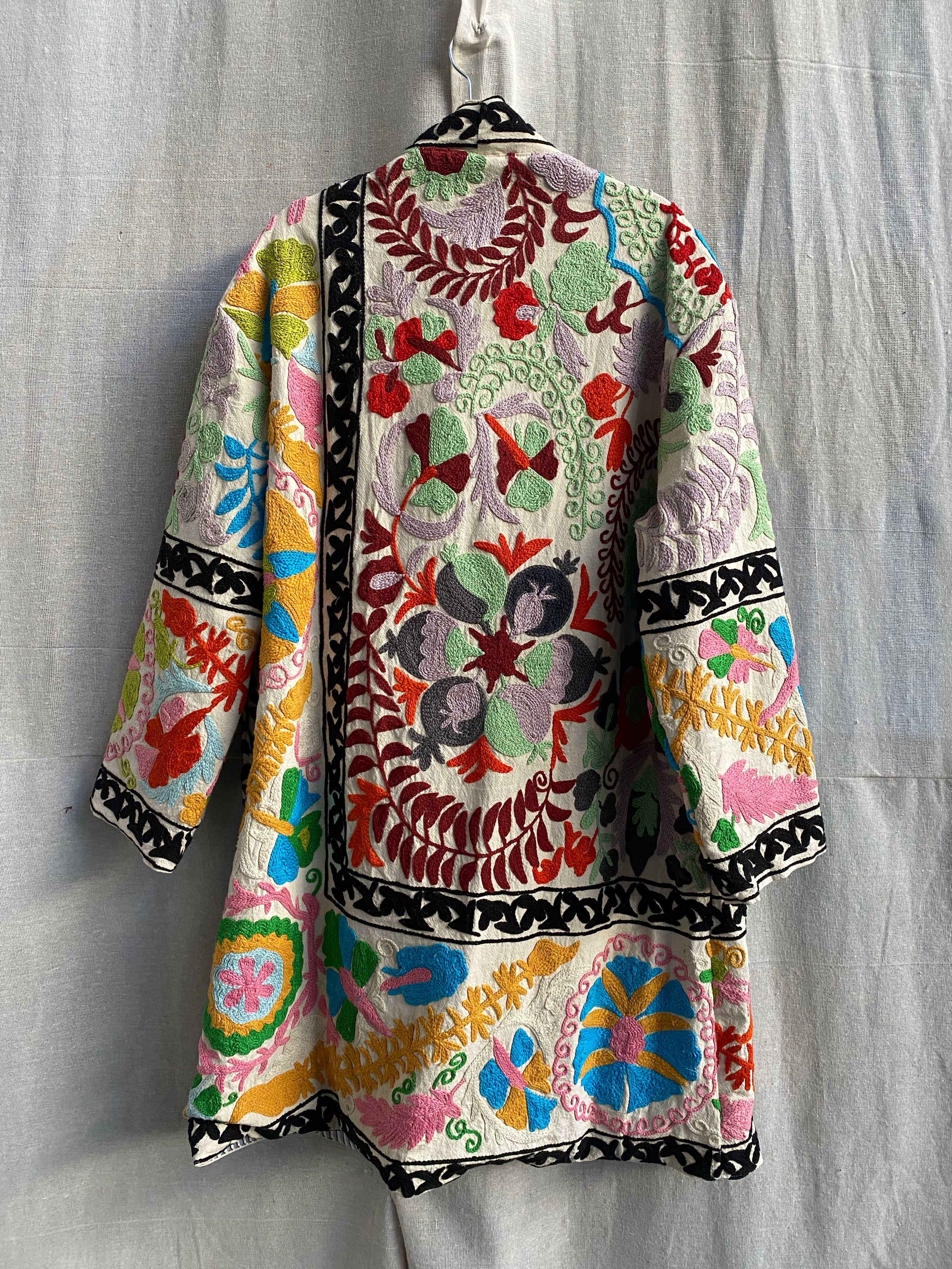 Our upcycled Suzani Coats are a one-of-a-kind treasure for textile lovers. Hand-embroidered and fully lined, each jacket is thoughtfully crafted with unique placement of traditional Suzani textiles—featuring the original border on the lapel and a central motif on the back. With practical details like pockets, a tie waist, and adjustable cuffs, these jackets blend heritage craftsmanship with modern wearability.