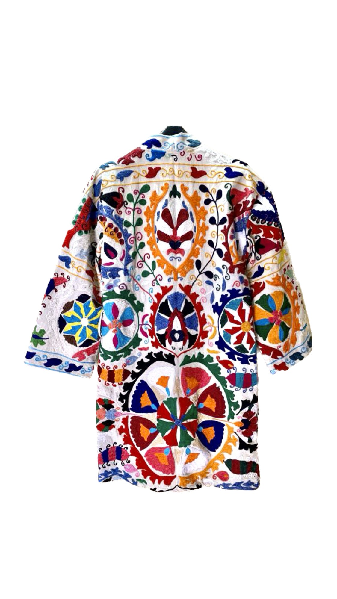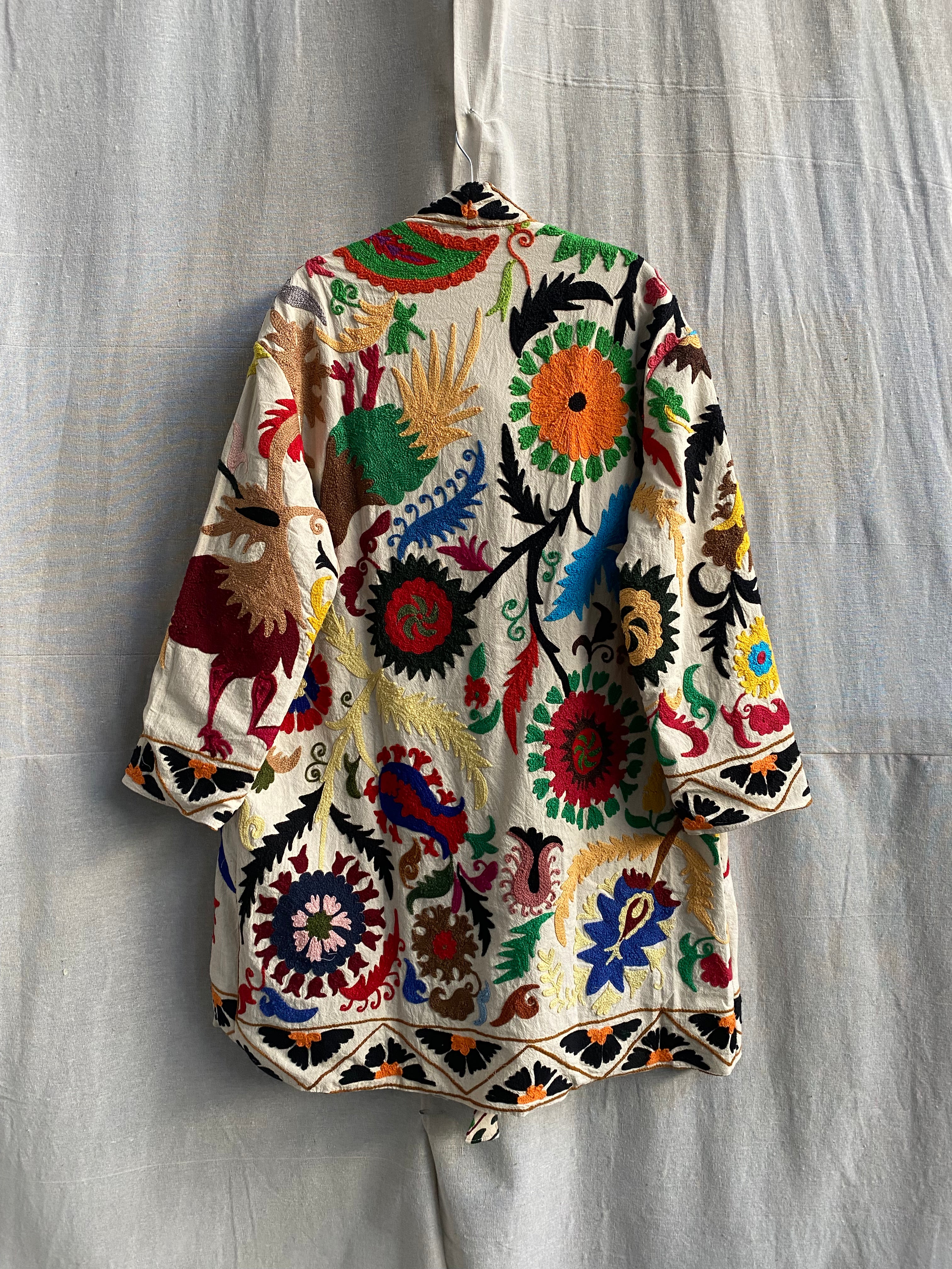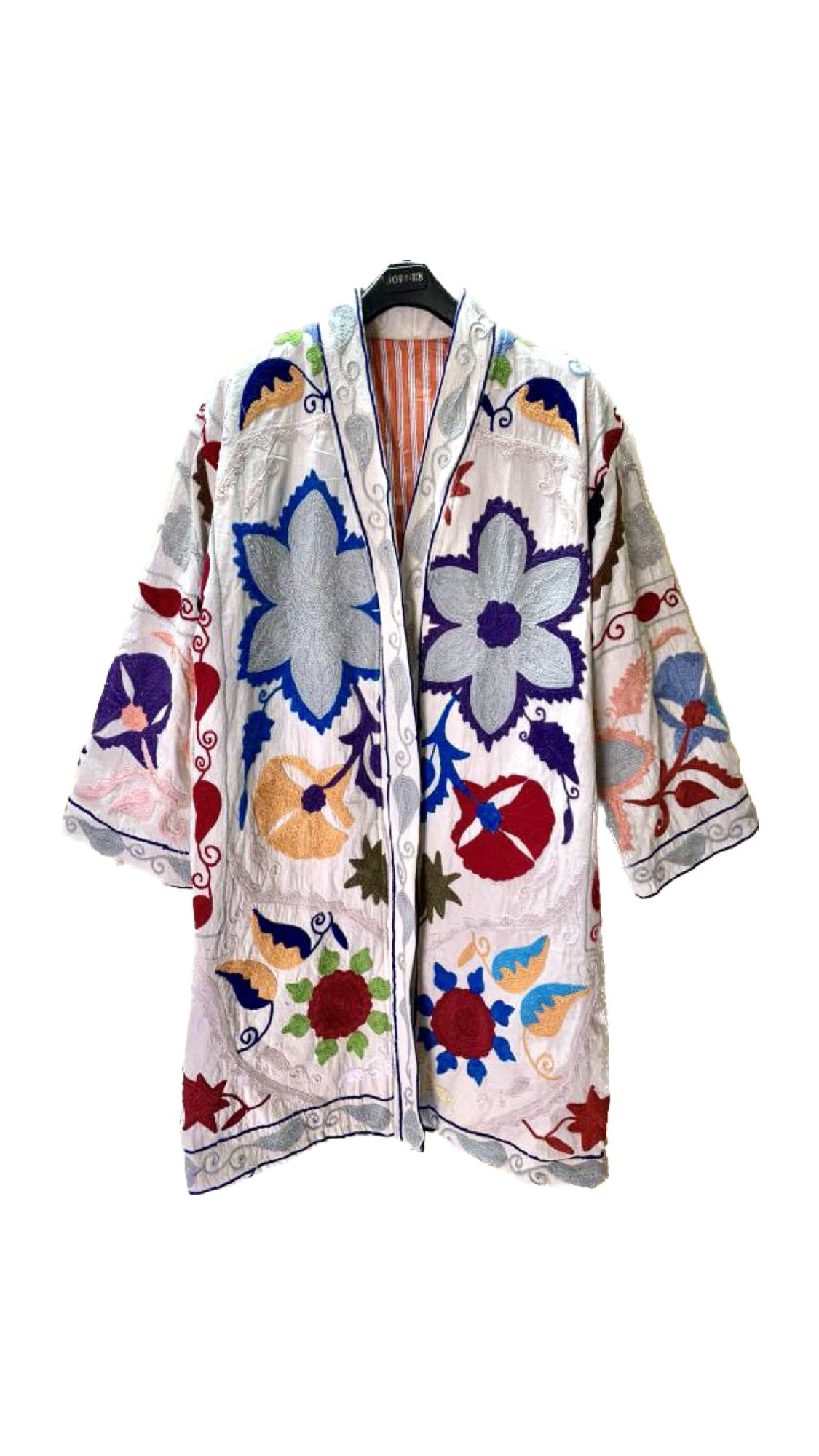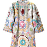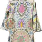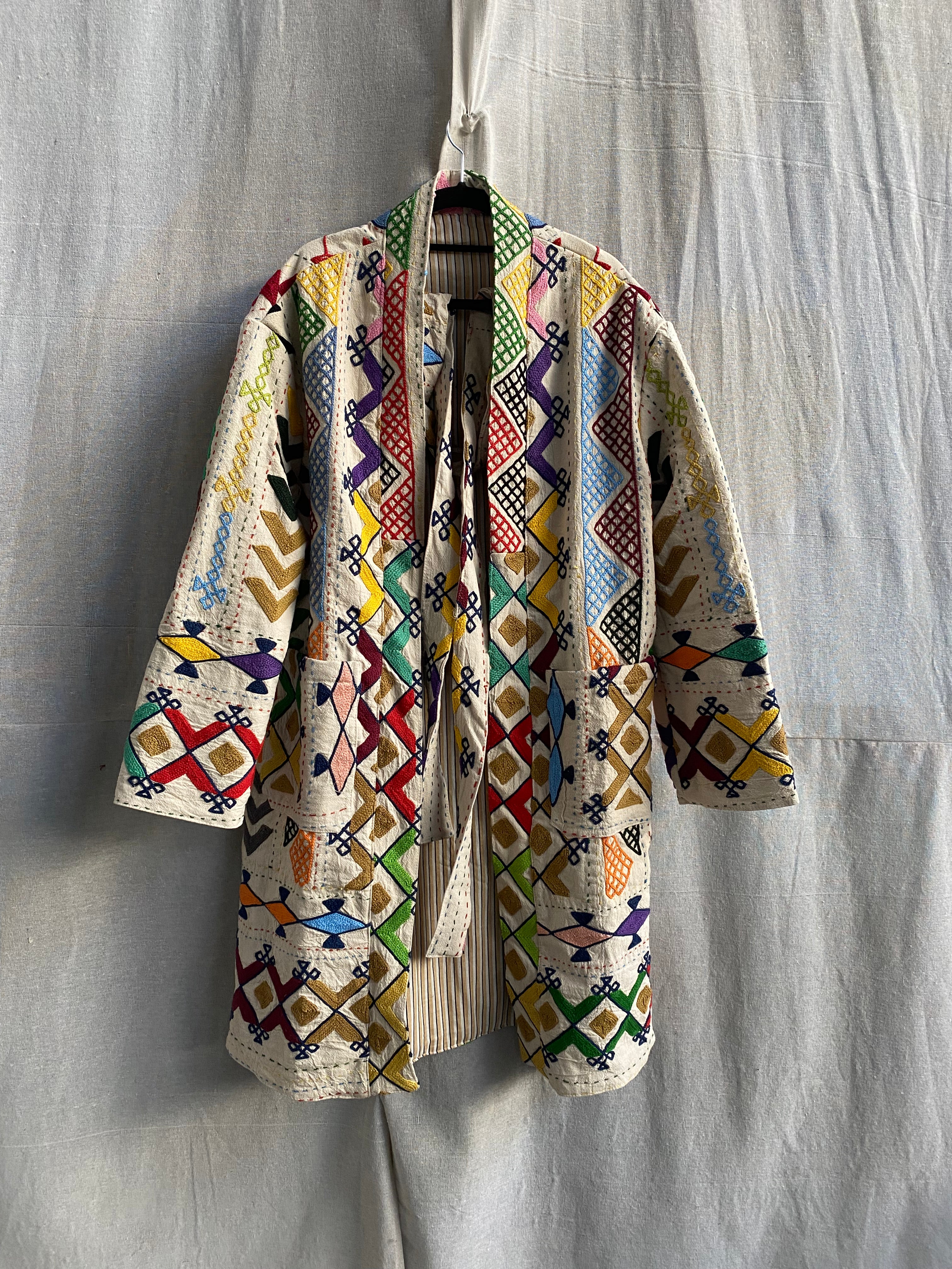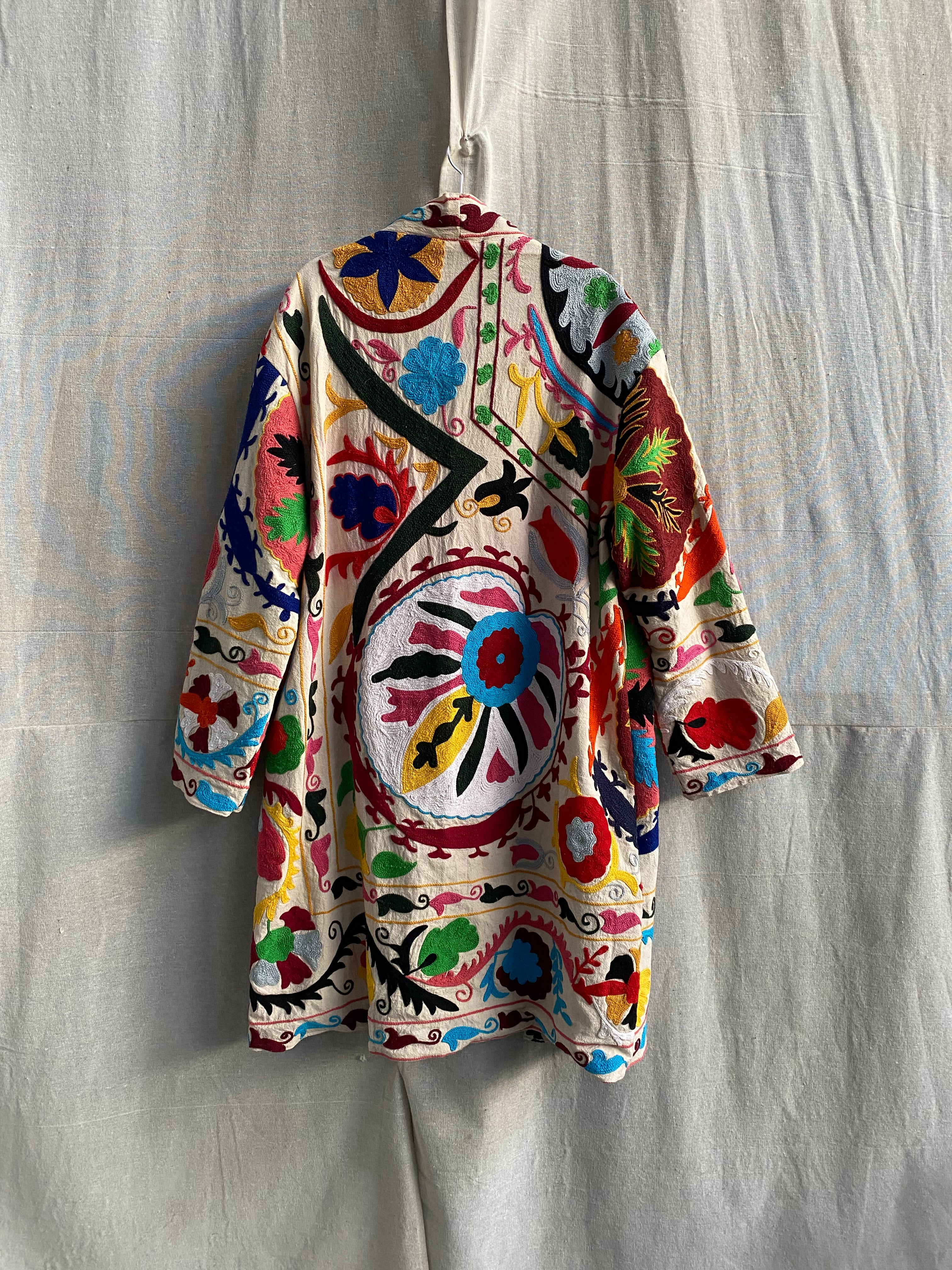 Our upcycled Suzani Coats are a one-of-a-kind treasure for textile lovers. Hand-embroidered and fully lined, each jacket is thoughtfully crafted with unique placement of traditional Suzani textiles—featuring the original border on the lapel and a central motif on the back. With practical details like pockets, a tie waist, and adjustable cuffs, these jackets blend heritage craftsmanship with modern wearability.