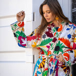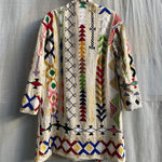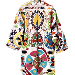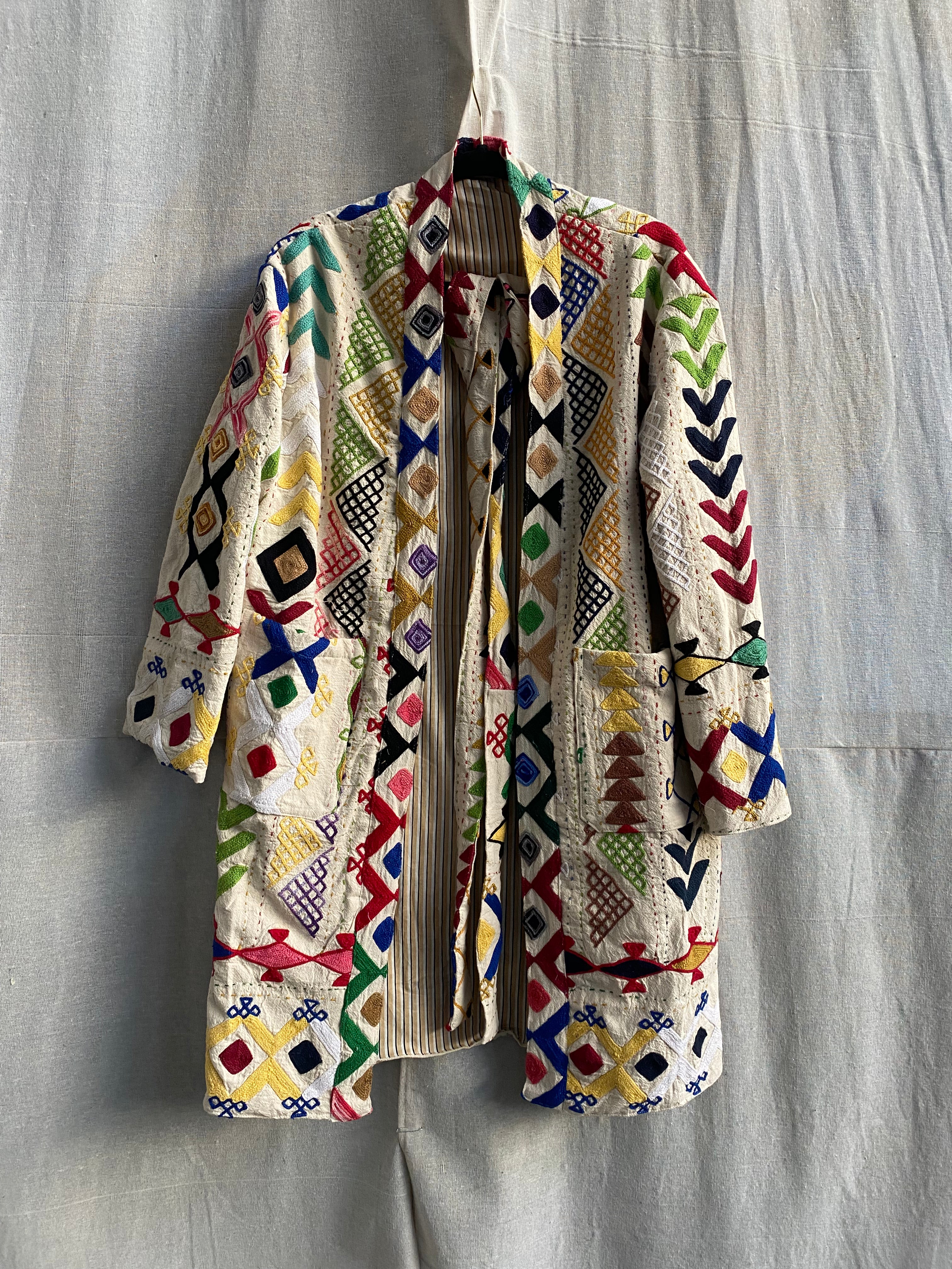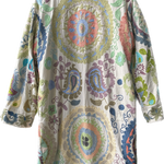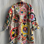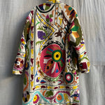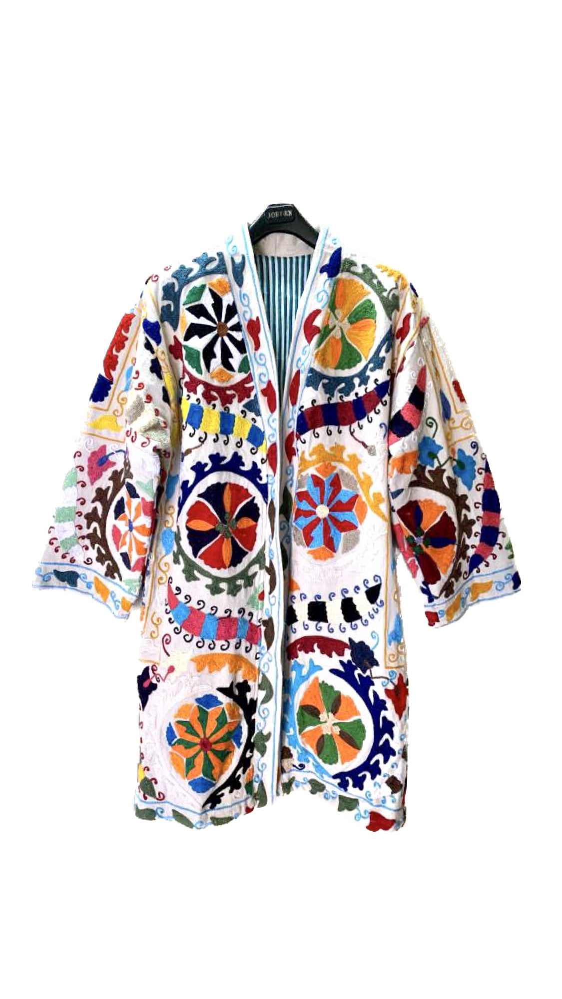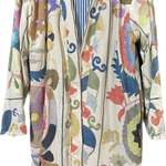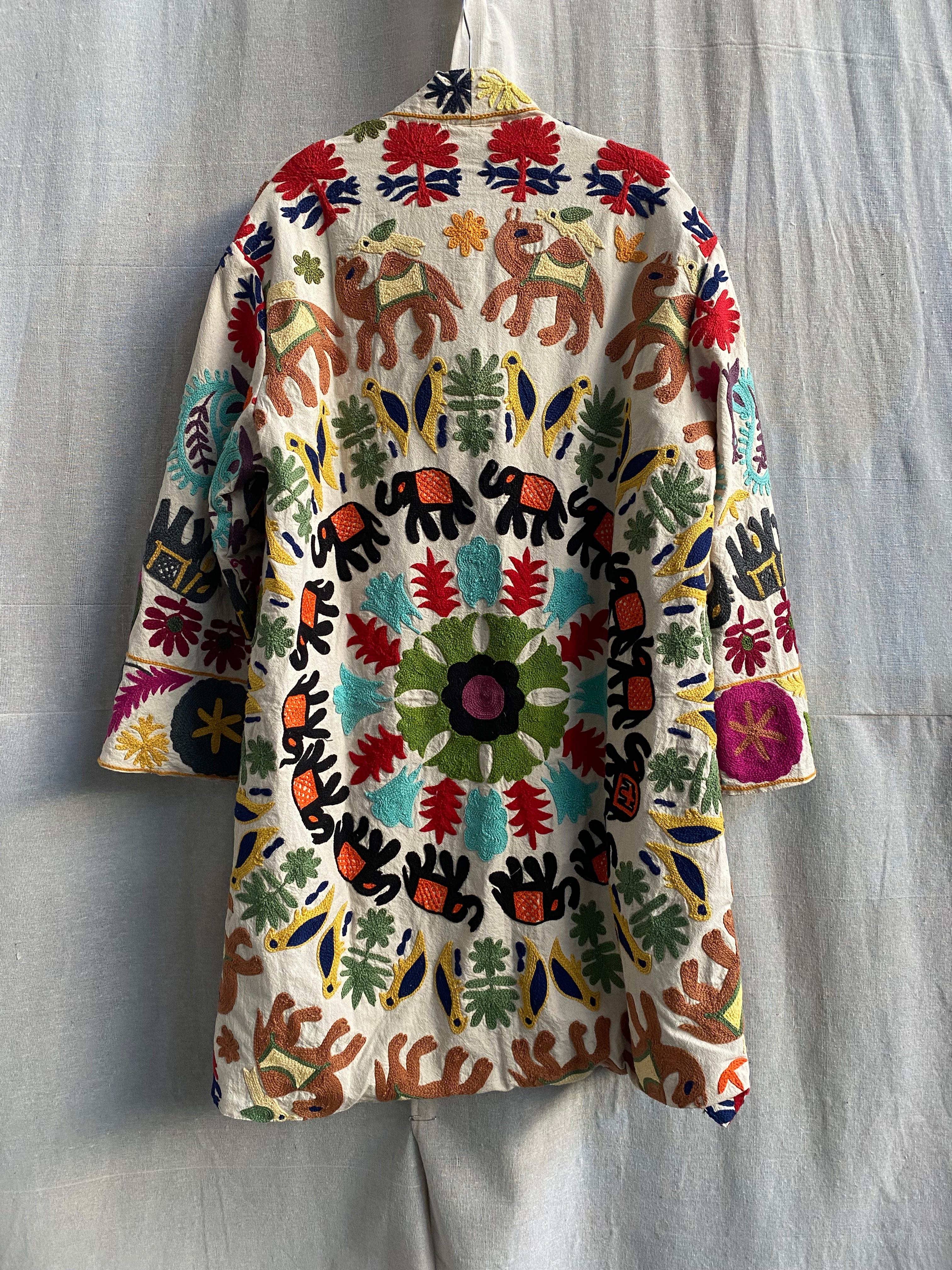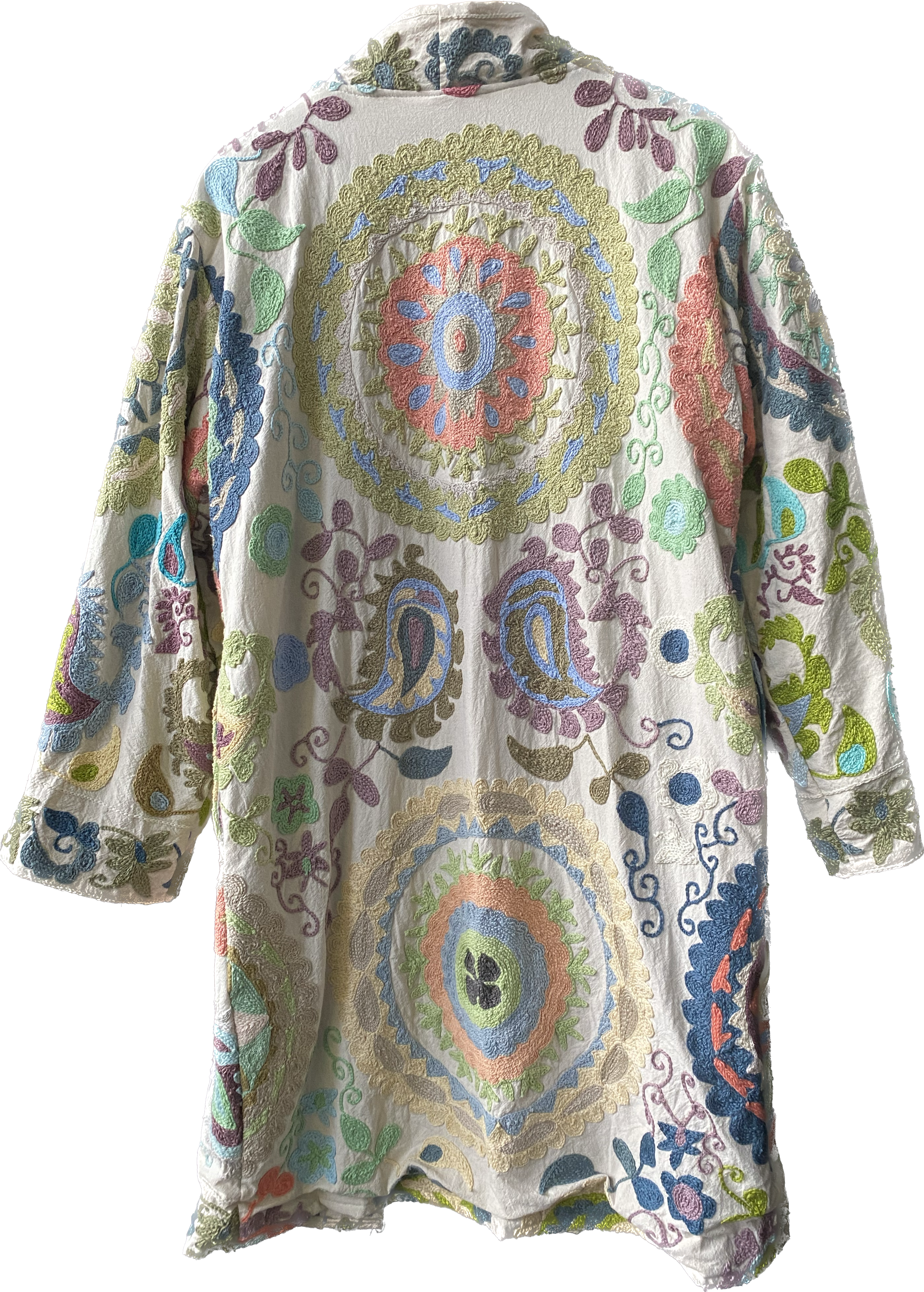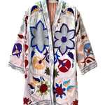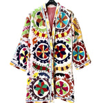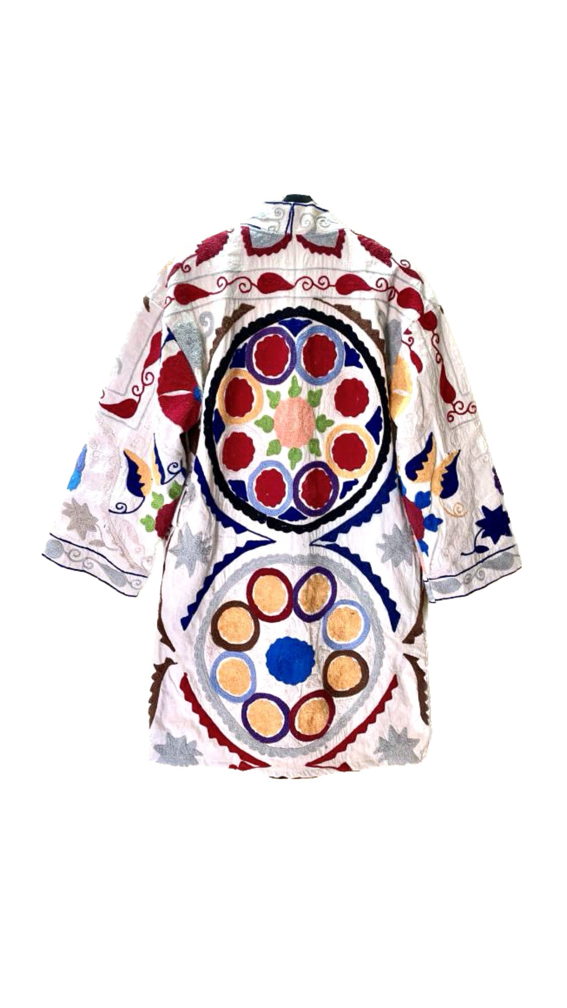 Our upcycled Suzani Coats are a one-of-a-kind treasure for textile lovers. Hand-embroidered and fully lined, each jacket is thoughtfully crafted with unique placement of traditional Suzani textiles—featuring the original border on the lapel and a central motif on the back. With practical details like pockets, a tie waist, and adjustable cuffs, these jackets blend heritage craftsmanship with modern wearability.