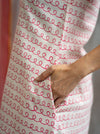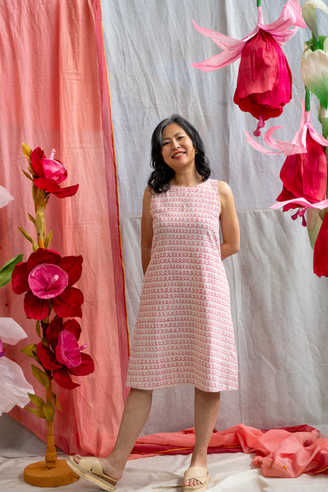 Pink Twirl Print – this print is hand blockprinted with hot pink twirls over our hand spun hand loomed Khadi Cotton, which has been naturally plant dyed with madder to achieve the baby pink base colour.