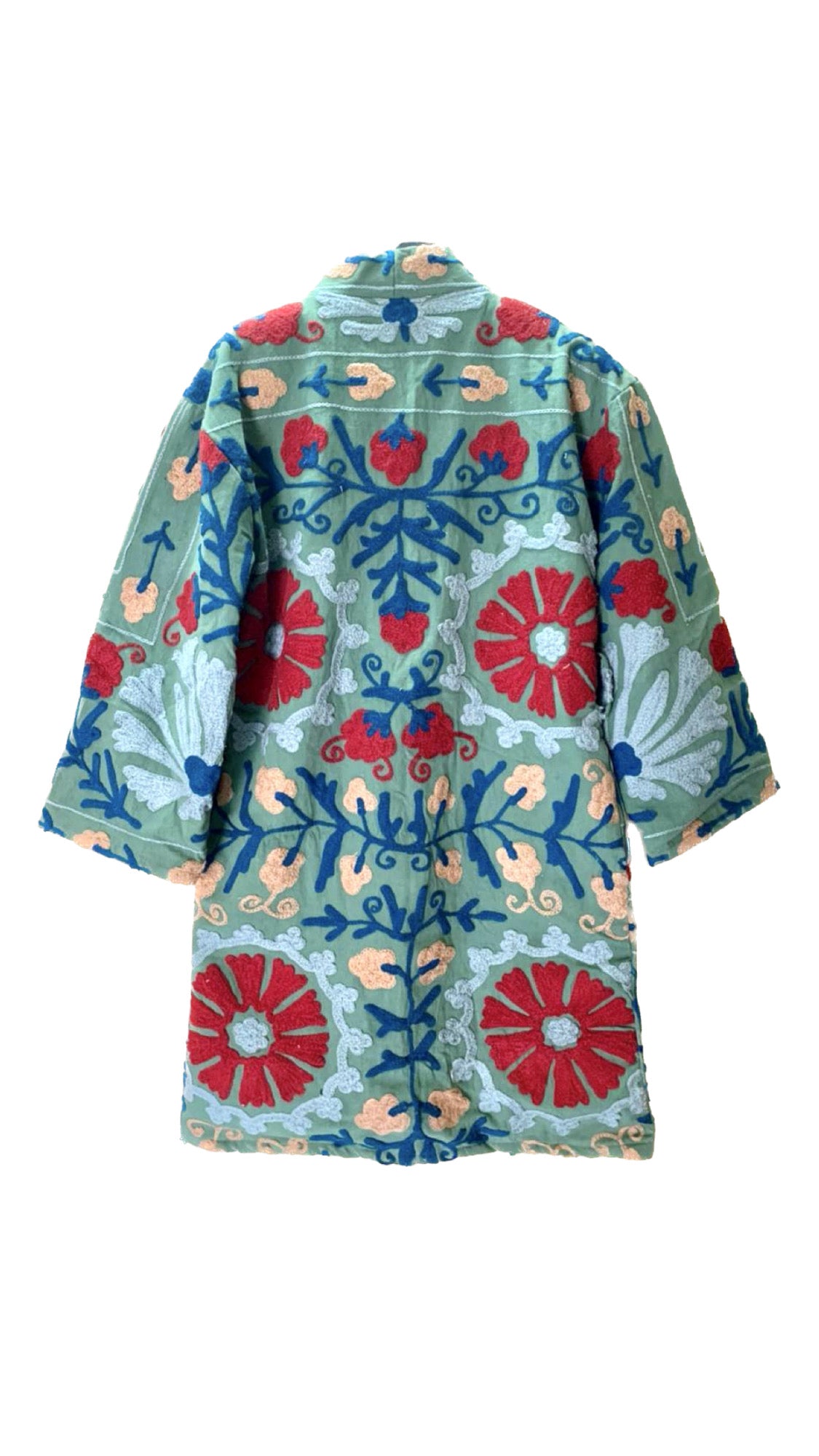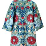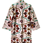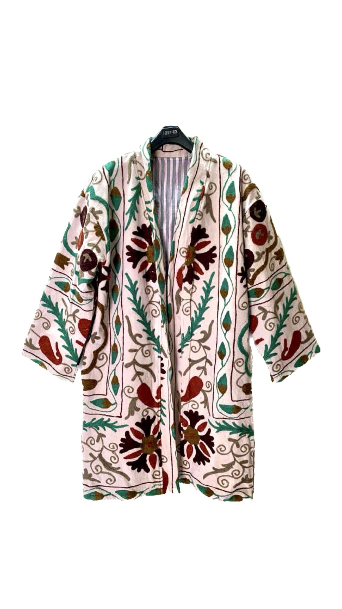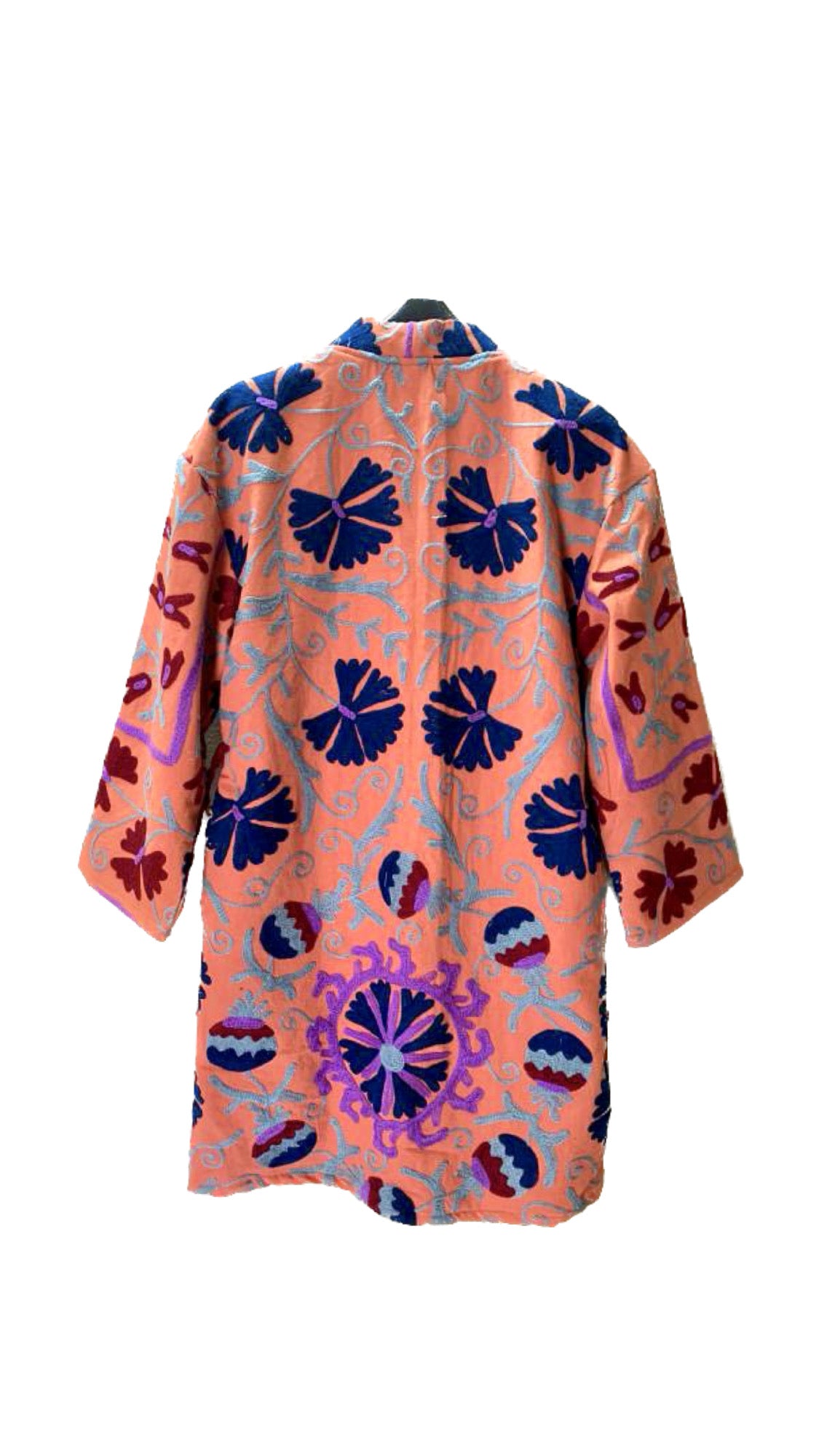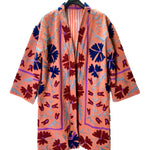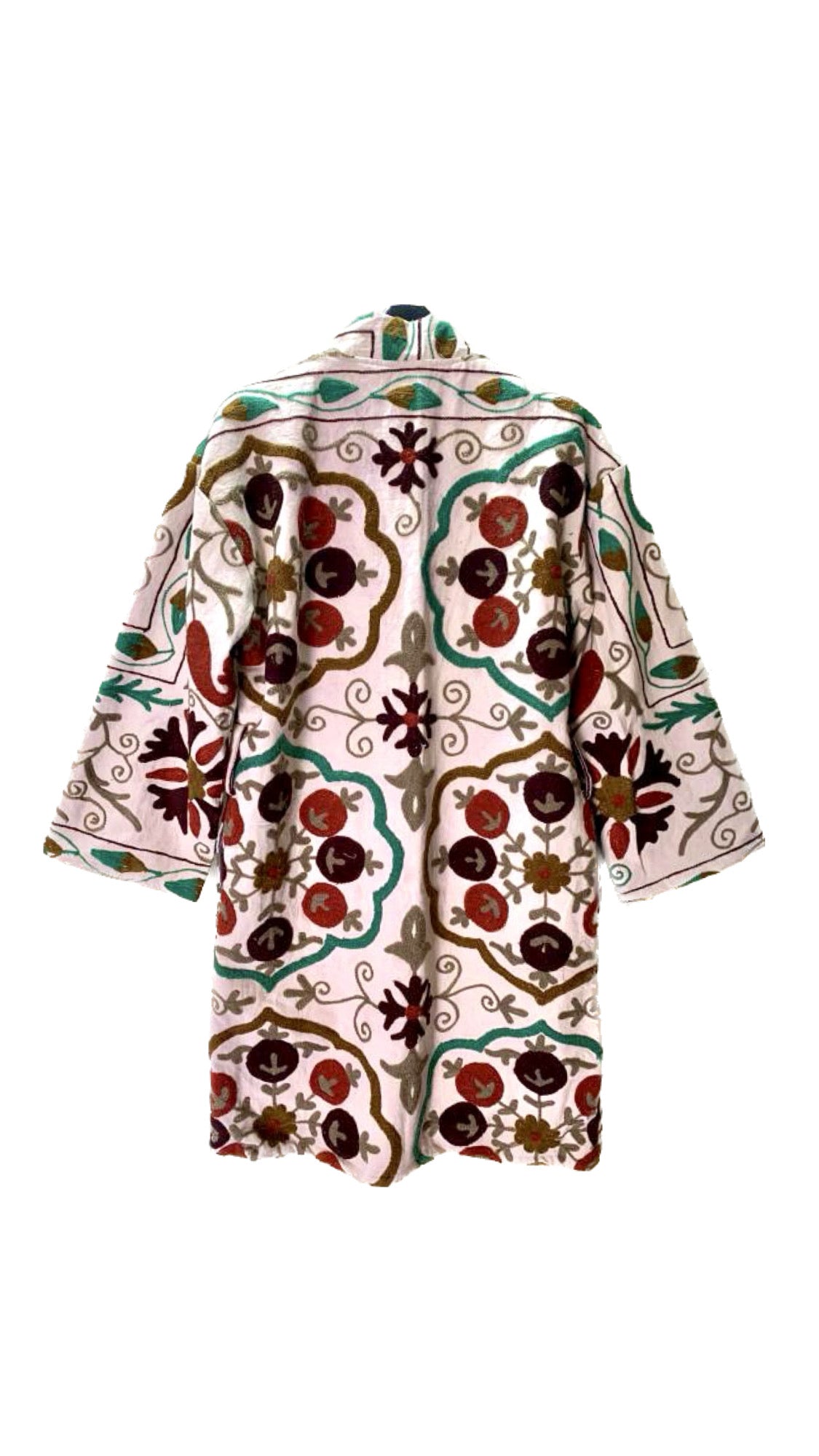 These upcycled Suzani Coats are a dream come true for any textile lover. The Machine Embroidered Coat pictured, falls just below the knees depending on how tall you are and is the perfect duster length. It features beautiful craftsmanship - a belt to tie at the waist or leave loose at the back, pockets of course for practicality, and beautiful cuffs on the sleeves to roll up or keep them down for the oversized campsite look. Fully lined, each Coat’s maker has thoughtfully used the Suzani to feature its original border on the front lapel of the garment, and its original centre as a feature piece placement of the back of the Coat.