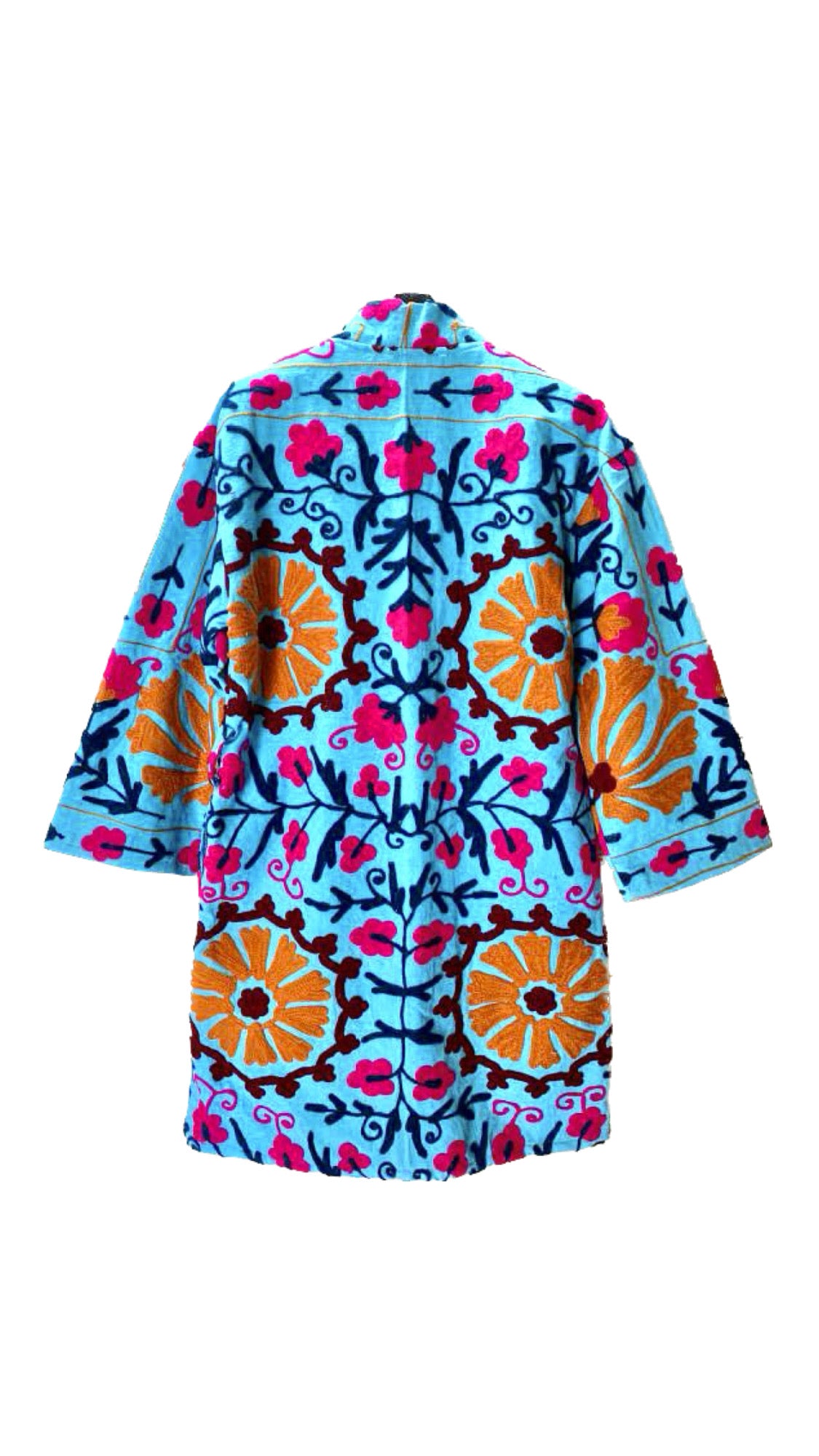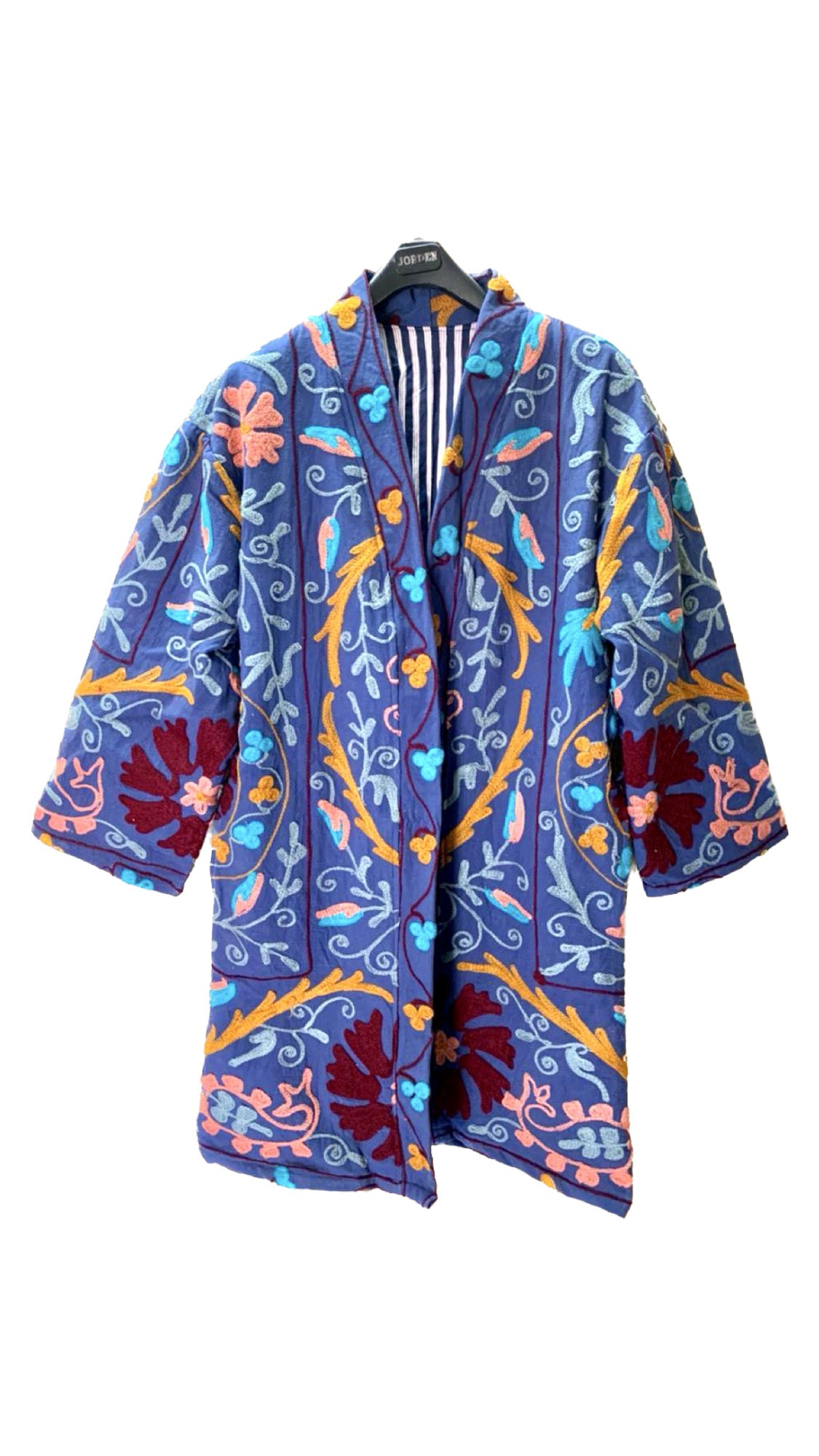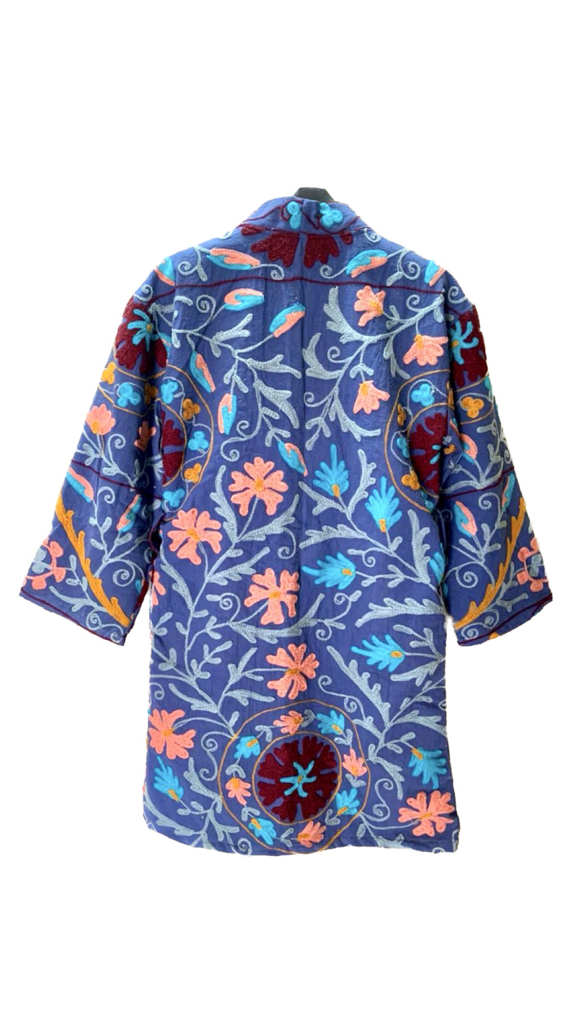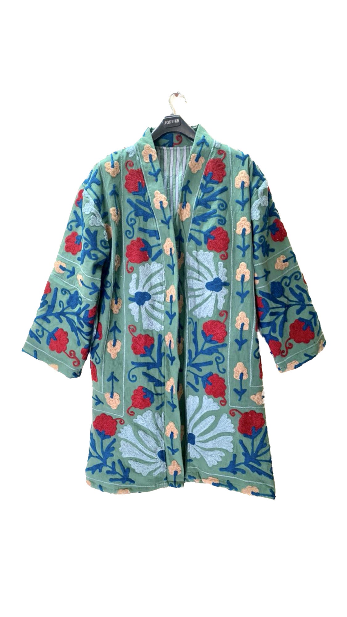 These upcycled Suzani Coats are a dream come true for any textile lover. The Machine Embroidered Coat pictured, falls just below the knees depending on how tall you are and is the perfect duster length. It features beautiful craftsmanship - a belt to tie at the waist or leave loose at the back, pockets of course for practicality, and beautiful cuffs on the sleeves to roll up or keep them down for the oversized campsite look. Fully lined, each Coat’s maker has thoughtfully used the Suzani to feature its original border on the front lapel of the garment, and its original centre as a feature piece placement of the back of the Coat.