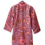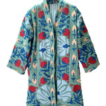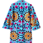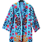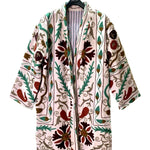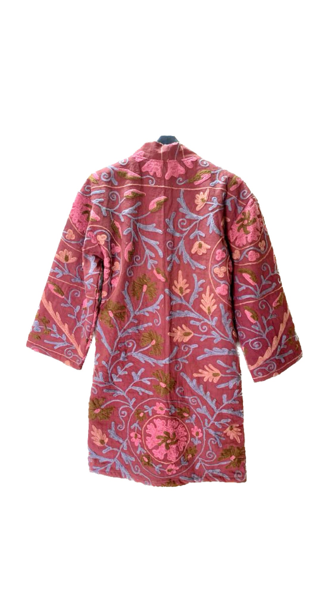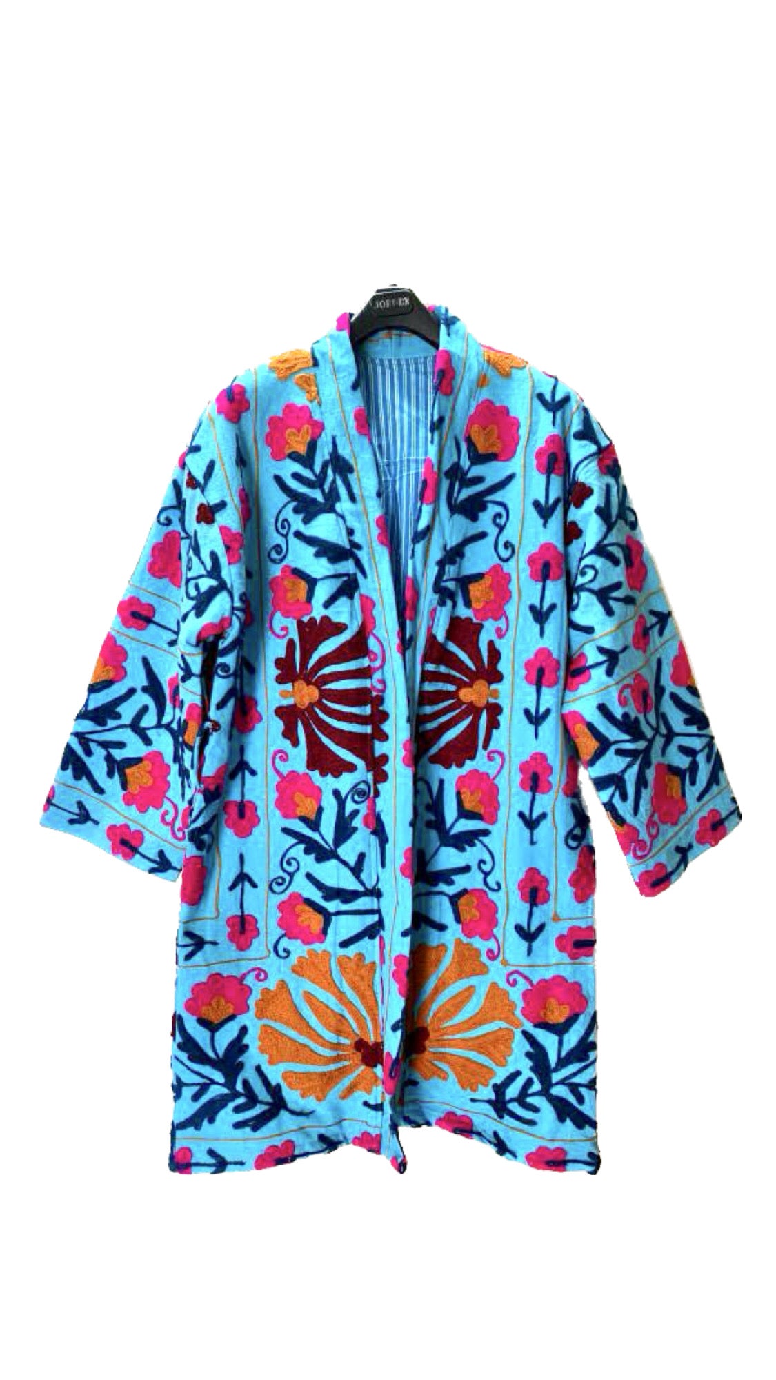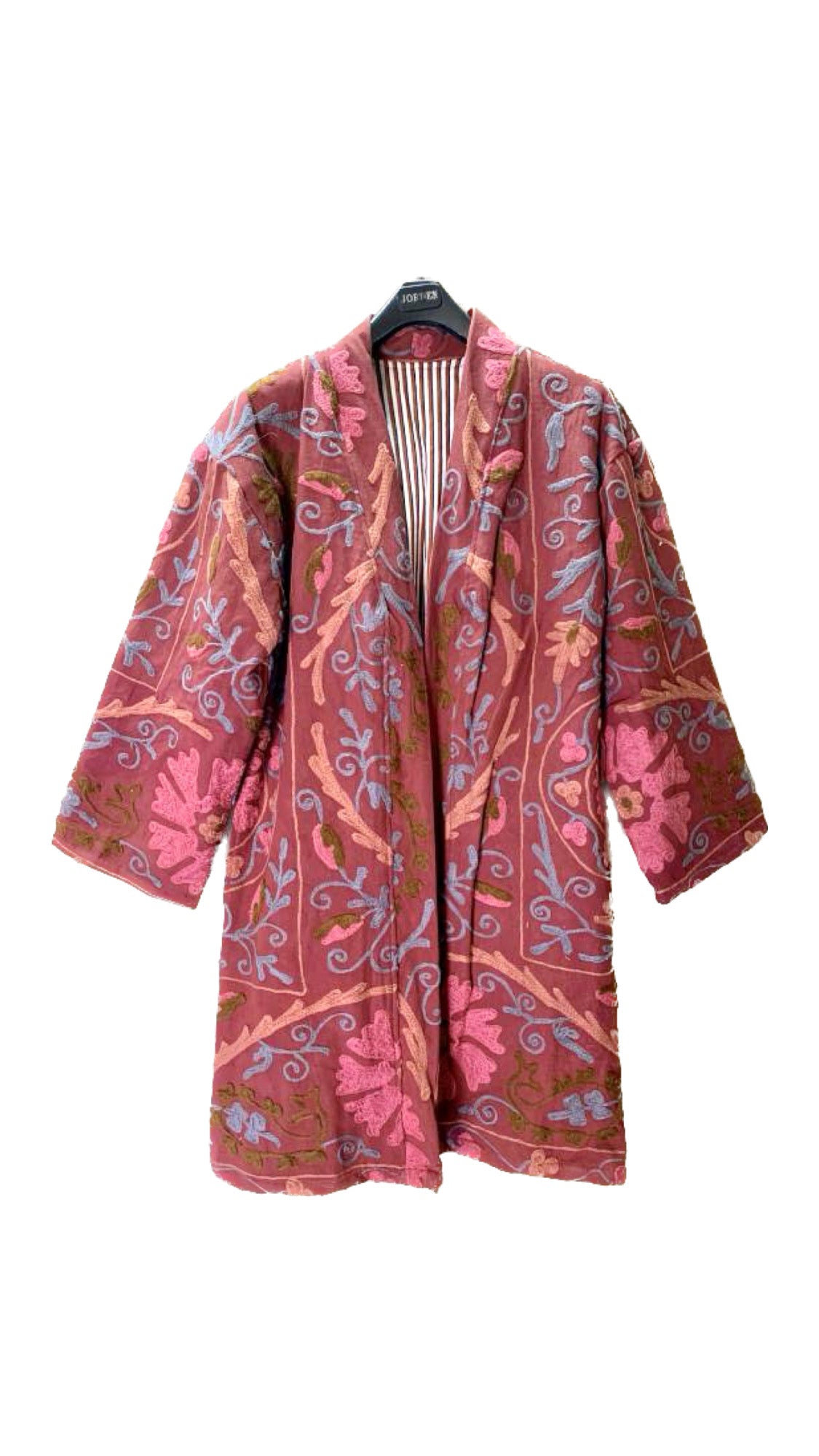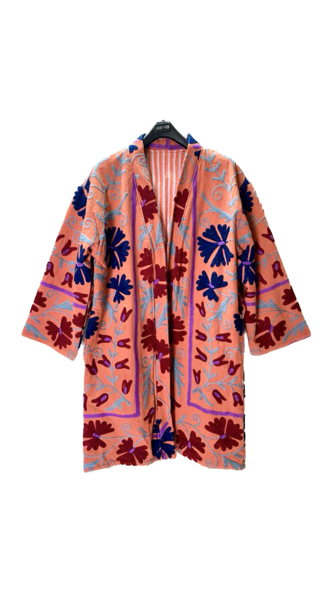 These upcycled Suzani Coats are a dream come true for any textile lover. The Machine Embroidered Coat pictured, falls just below the knees depending on how tall you are and is the perfect duster length. It features beautiful craftsmanship - a belt to tie at the waist or leave loose at the back, pockets of course for practicality, and beautiful cuffs on the sleeves to roll up or keep them down for the oversized campsite look. Fully lined, each Coat’s maker has thoughtfully used the Suzani to feature its original border on the front lapel of the garment, and its original centre as a feature piece placement of the back of the Coat.