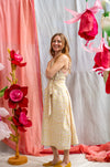 The long ties on either side can be loosely knotted at the back, creating a relaxed apron look that can be worn on its own or layered over a tee for a casual outfit. For a more fitted silhouette suitable for evening wear, the ties can be wrapped high around the waist and paired with heels, allowing for effortless transitions from day to night.
