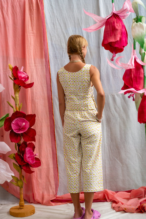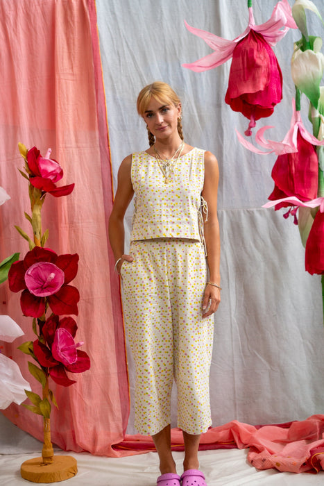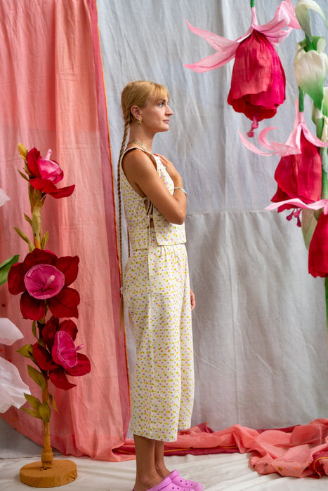 Our Tank Tie Top has fast become a summer classic, and staple in any wardrobe, as it can be layered easily over a plain white tee, or on its own. An easy fit tank top that fastens with double ties on either side, round neck line, and bottom hem that falls just above naval level. The perfect trans-seasonal piece to add a pop of colour to your outfit.