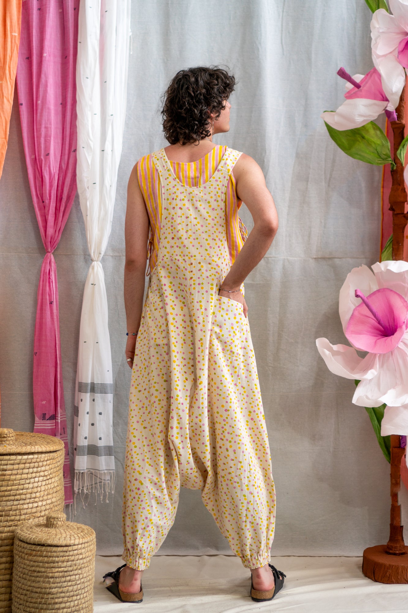 The drop crotch overall is comfortable and flattering thanks to a high waisted defined seam, easy fit with adjustable shoulder straps and practical with a front and back pocket to avoid cluttering the hip line.