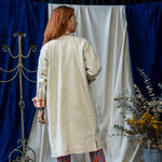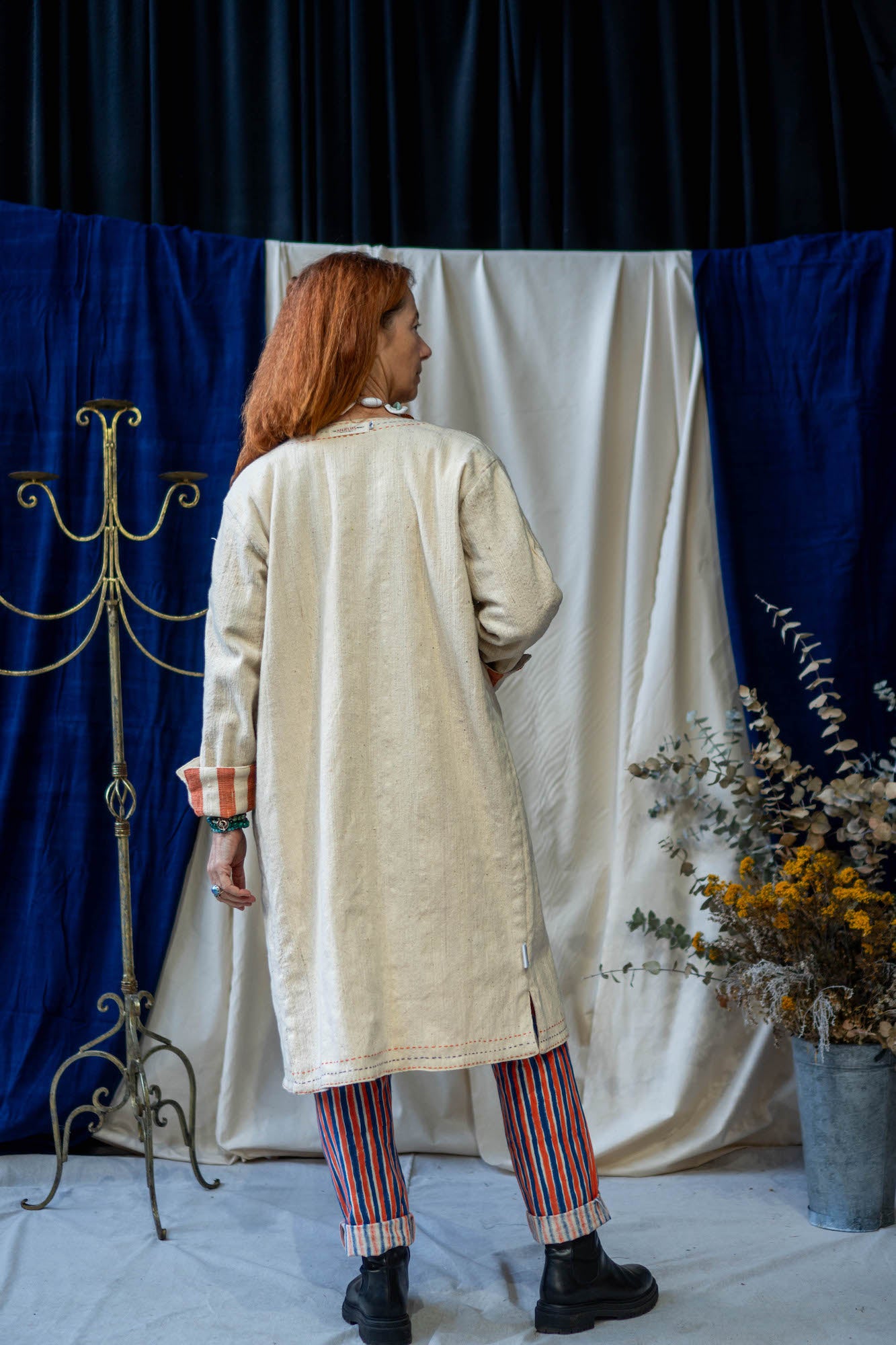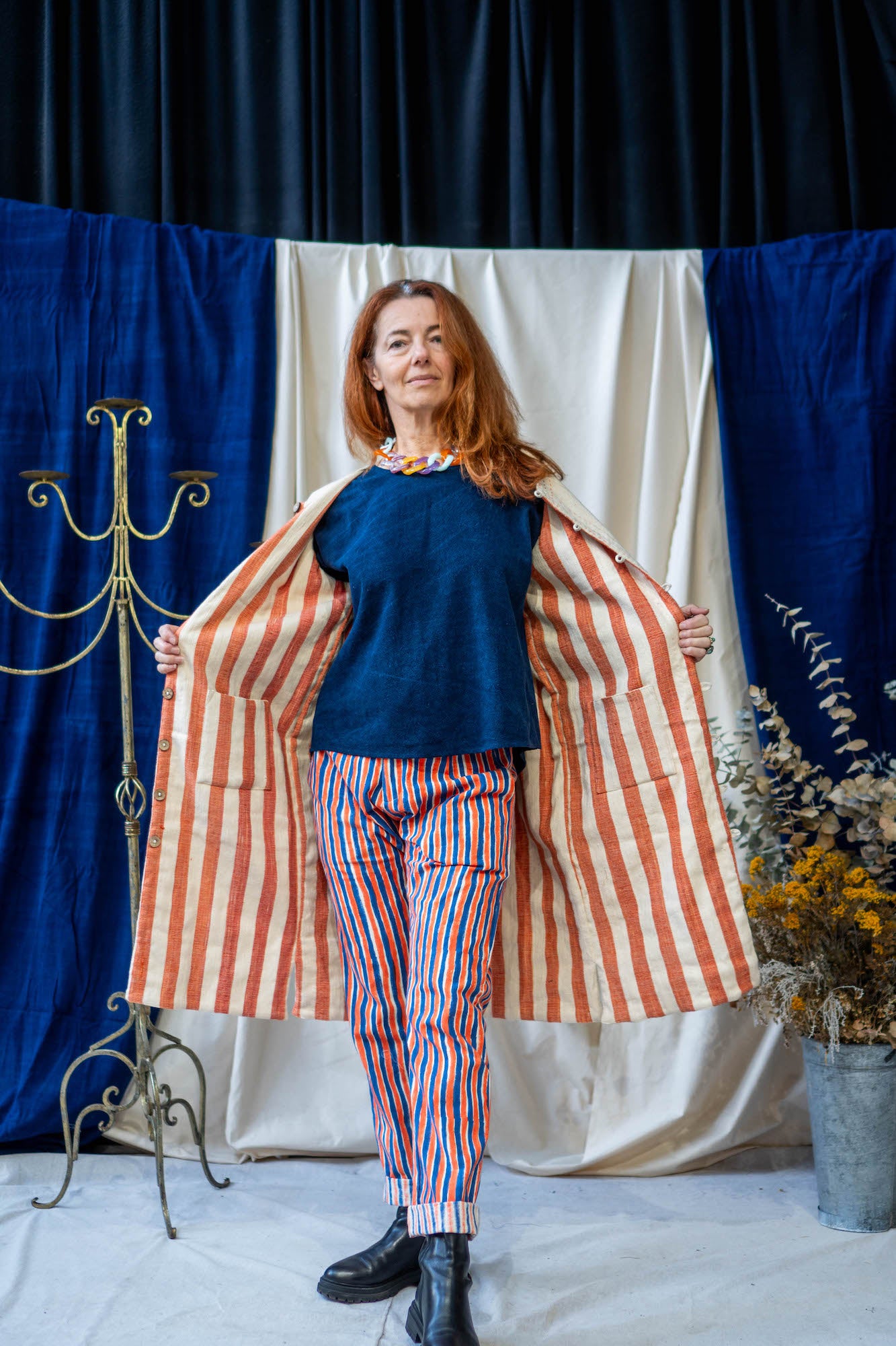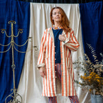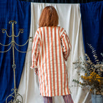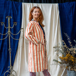 A brand new hero piece in our collection, The Reversible coat features a wide striped soft coral pink and natural coloured cotton and backed with a plain Khadi, both in heavier weight, textured weaves. Hand stitched around the collar and bottom hem on the plain Khadi side of the coat are three lines in orange and purple, for a beautiful, subtle detailing.