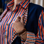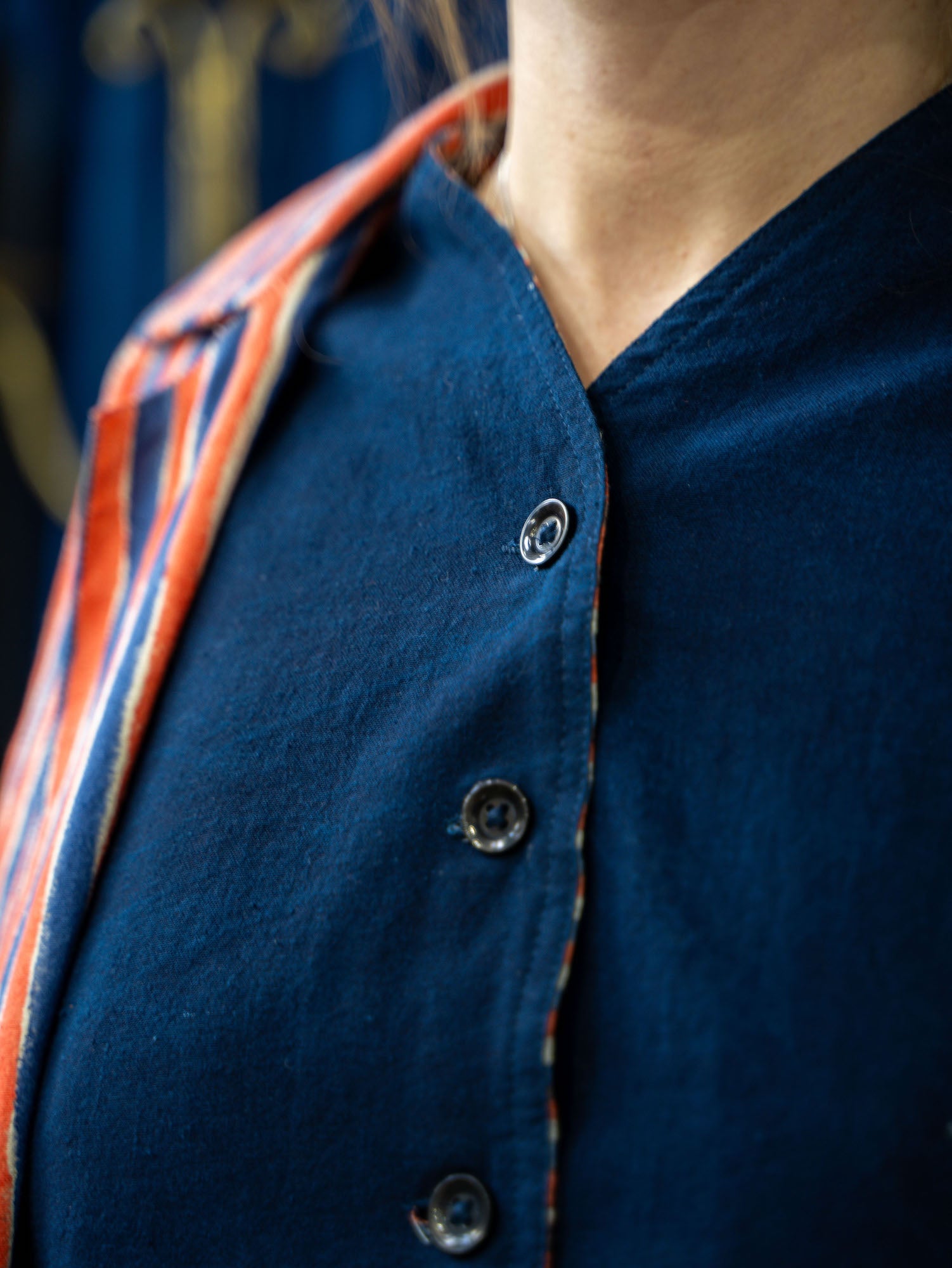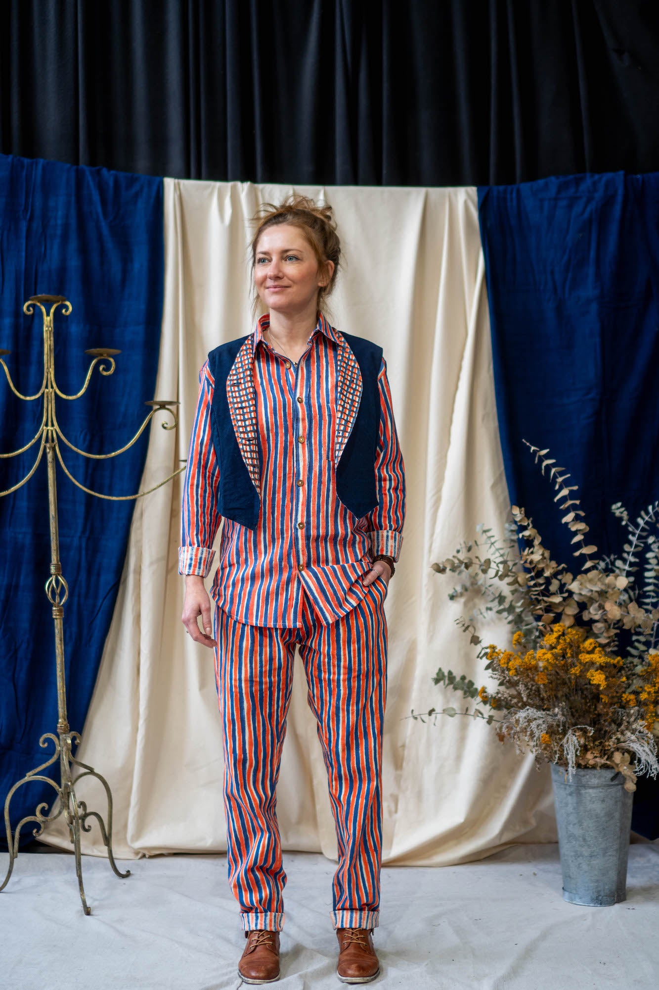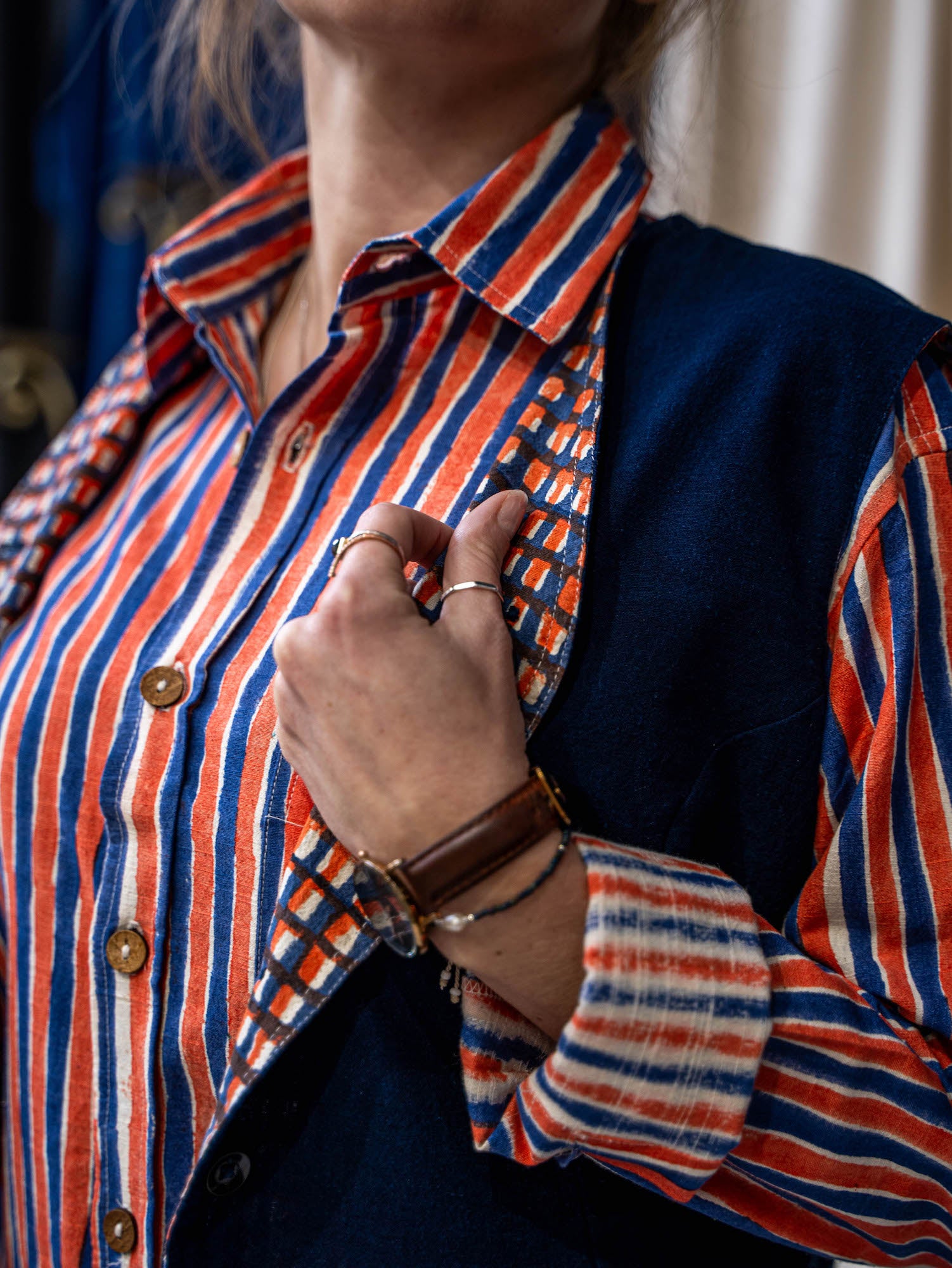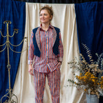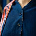 Designed with versatility in mind, this classic waistcoat is reversible with one side hand-dyed in our GOTS certified true Indigo plant dye, and on the other block printed in our fresh blue and orange Waffle print for the ultimate modular garment in your sustainable wardrobe. Cropped short to sit on the curve of the waist, our waistcoat it is great teamed up with our Tailored Pants.