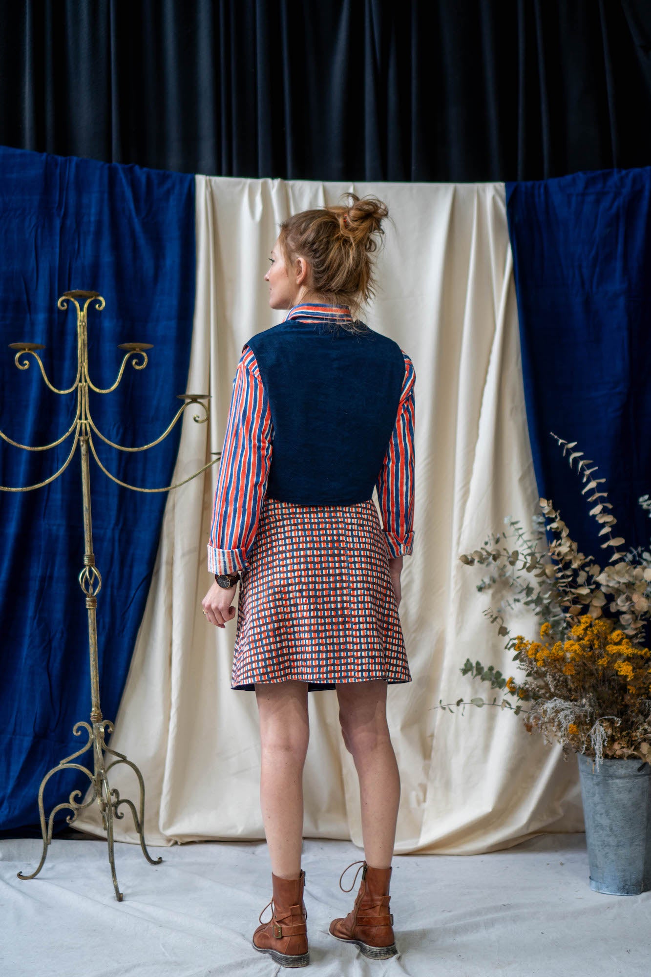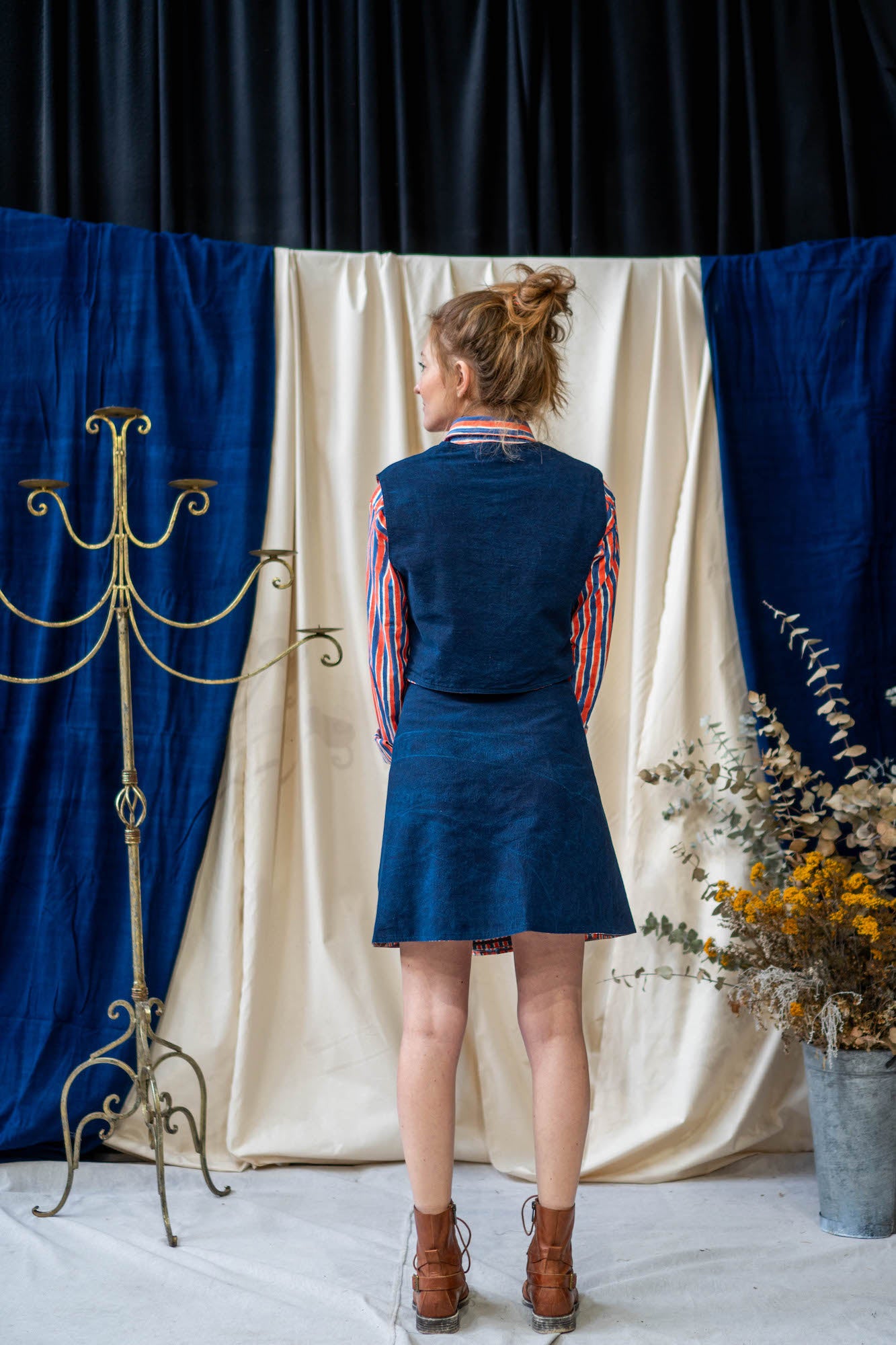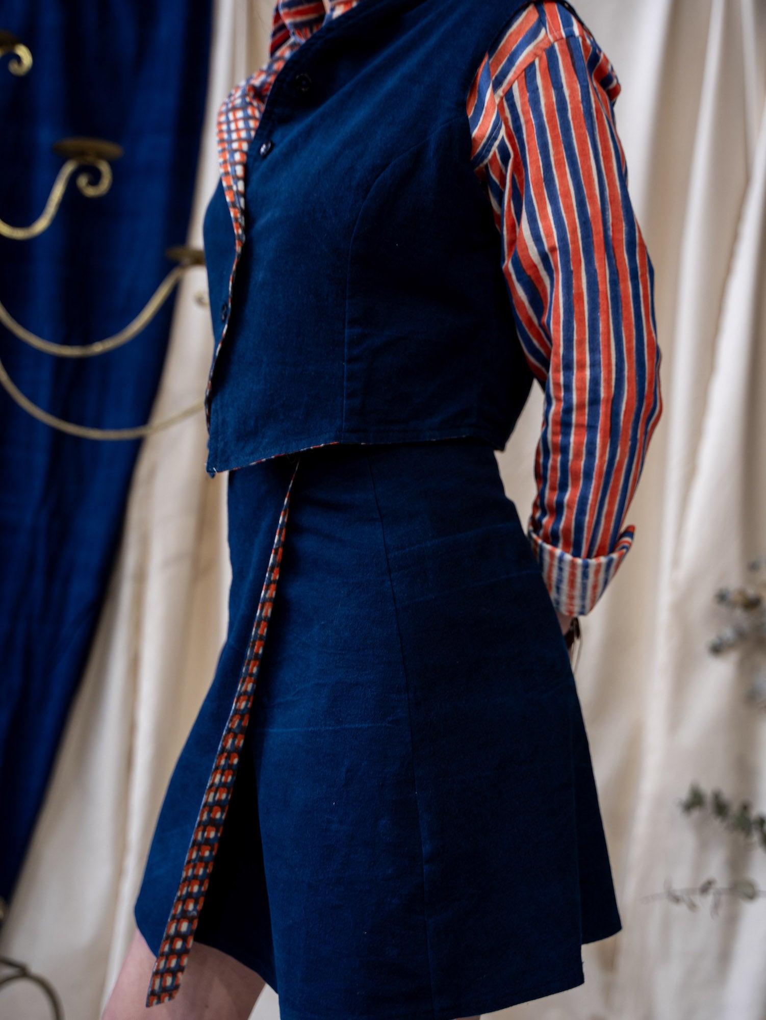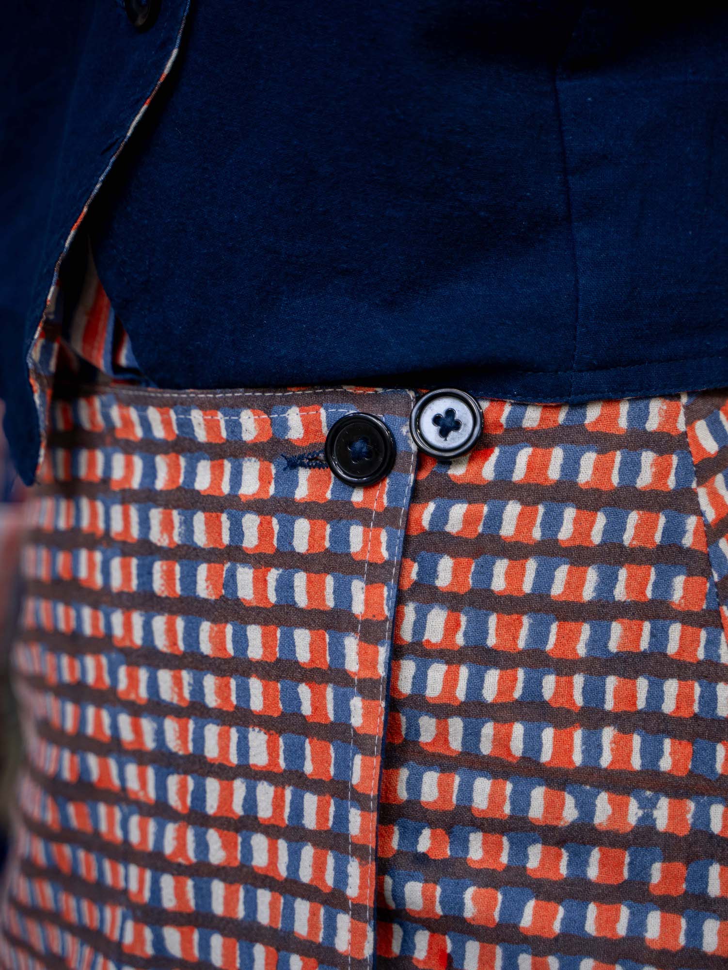 Our beloved reversible wrap skirt is back in our new bold seasonal print. It is all up to you whether you want to wear it on the naturally indigo dyed side or on the fun hand block printed side. Adjustable at the waist with buttons and has a soft A-line for a crisp look, the combo of hand block print and true indigo on the reverse side is a fun way of making a statement with your wardrobe while having a modular option to wear about town.