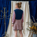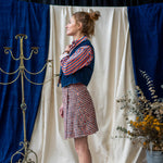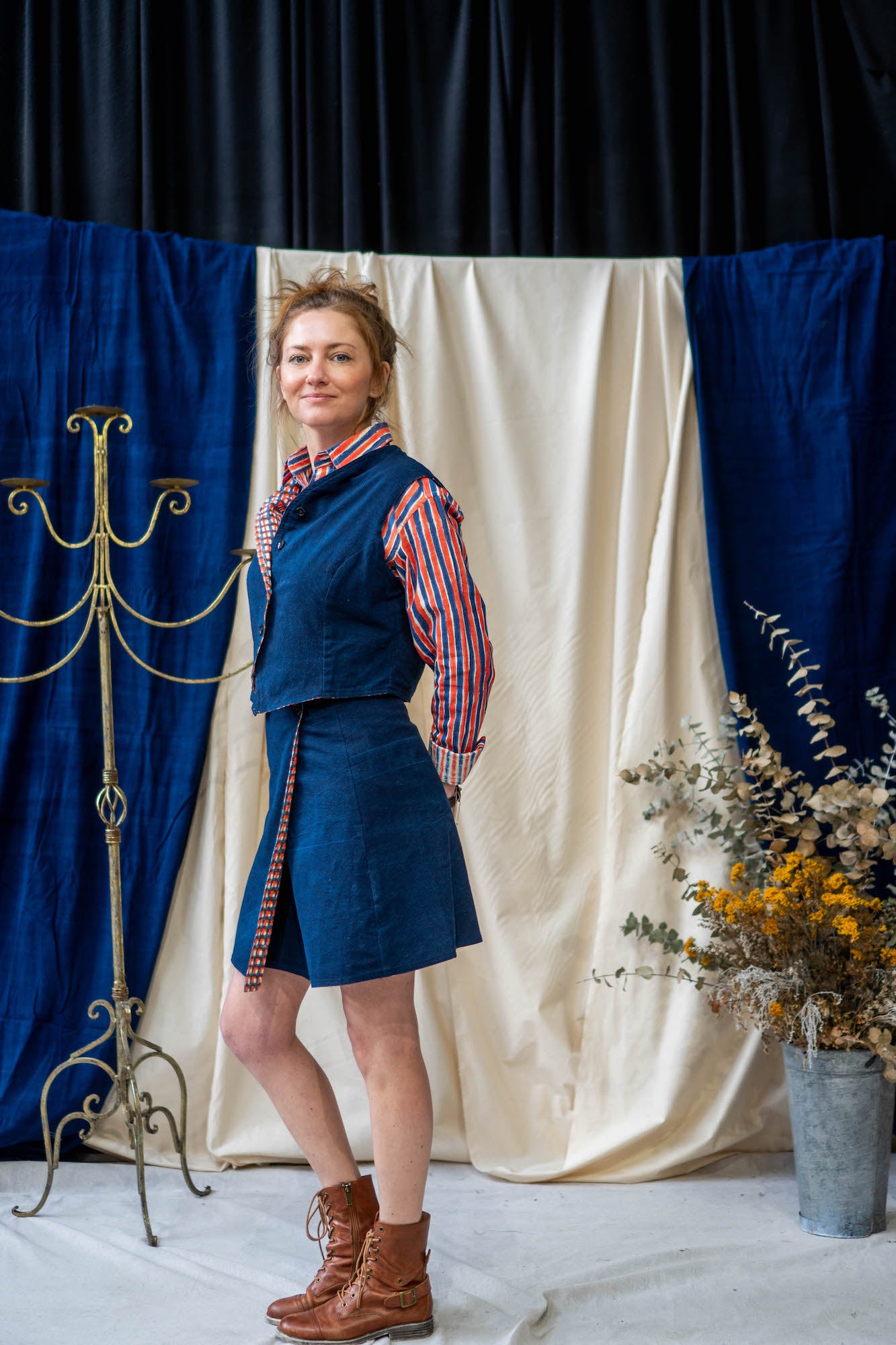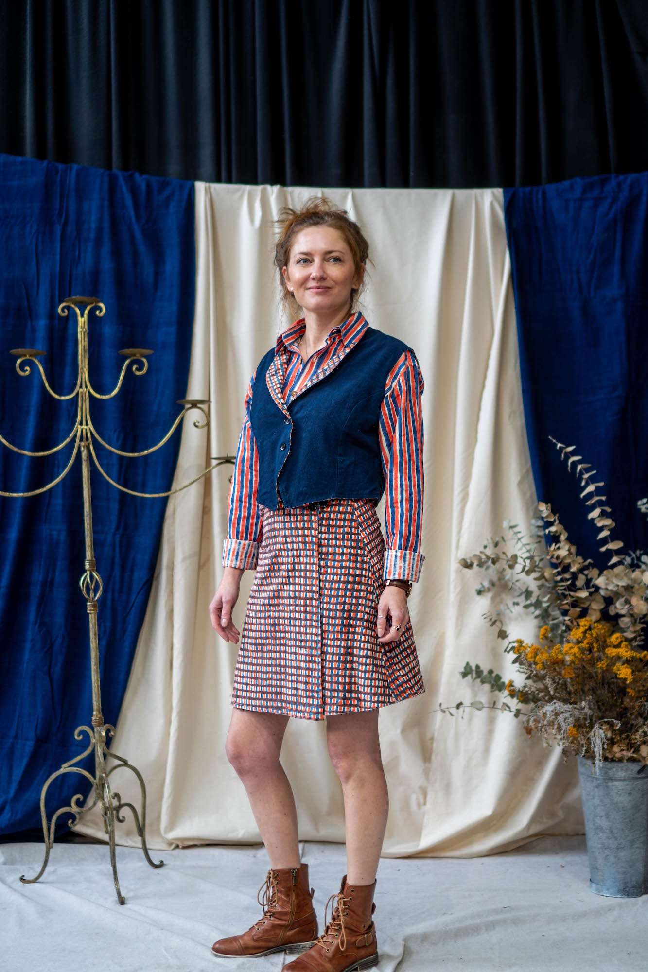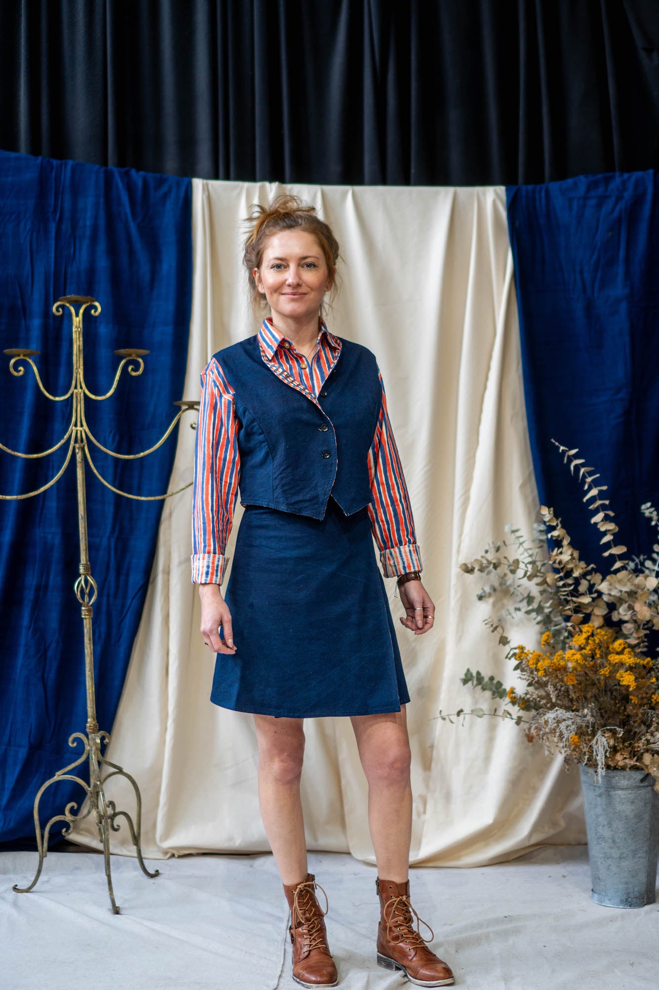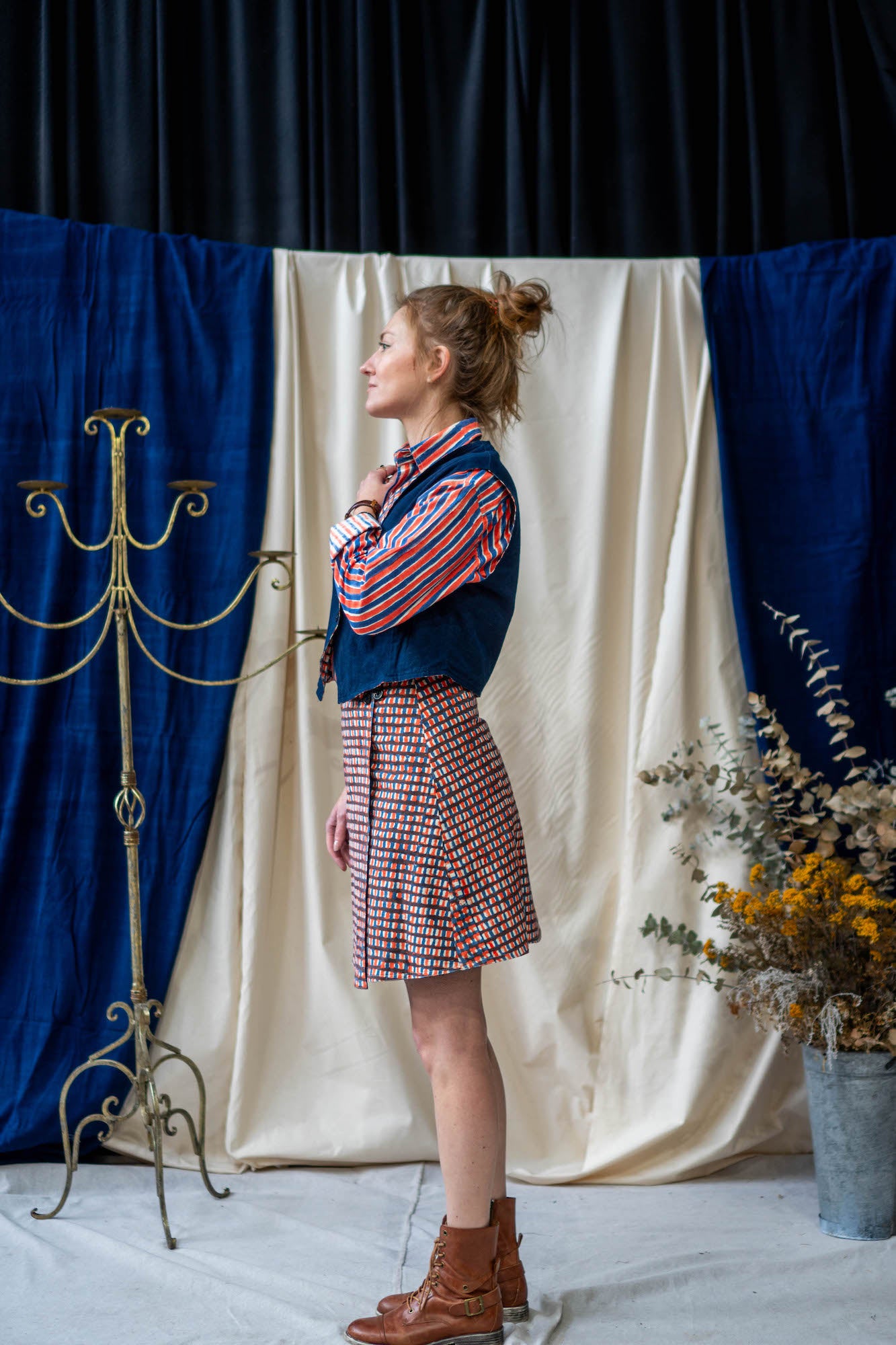 Our beloved reversible wrap skirt is back in our new bold seasonal print. It is all up to you whether you want to wear it on the naturally indigo dyed side or on the fun hand block printed side. Adjustable at the waist with buttons and has a soft A-line for a crisp look, the combo of hand block print and true indigo on the reverse side is a fun way of making a statement with your wardrobe while having a modular option to wear about town.