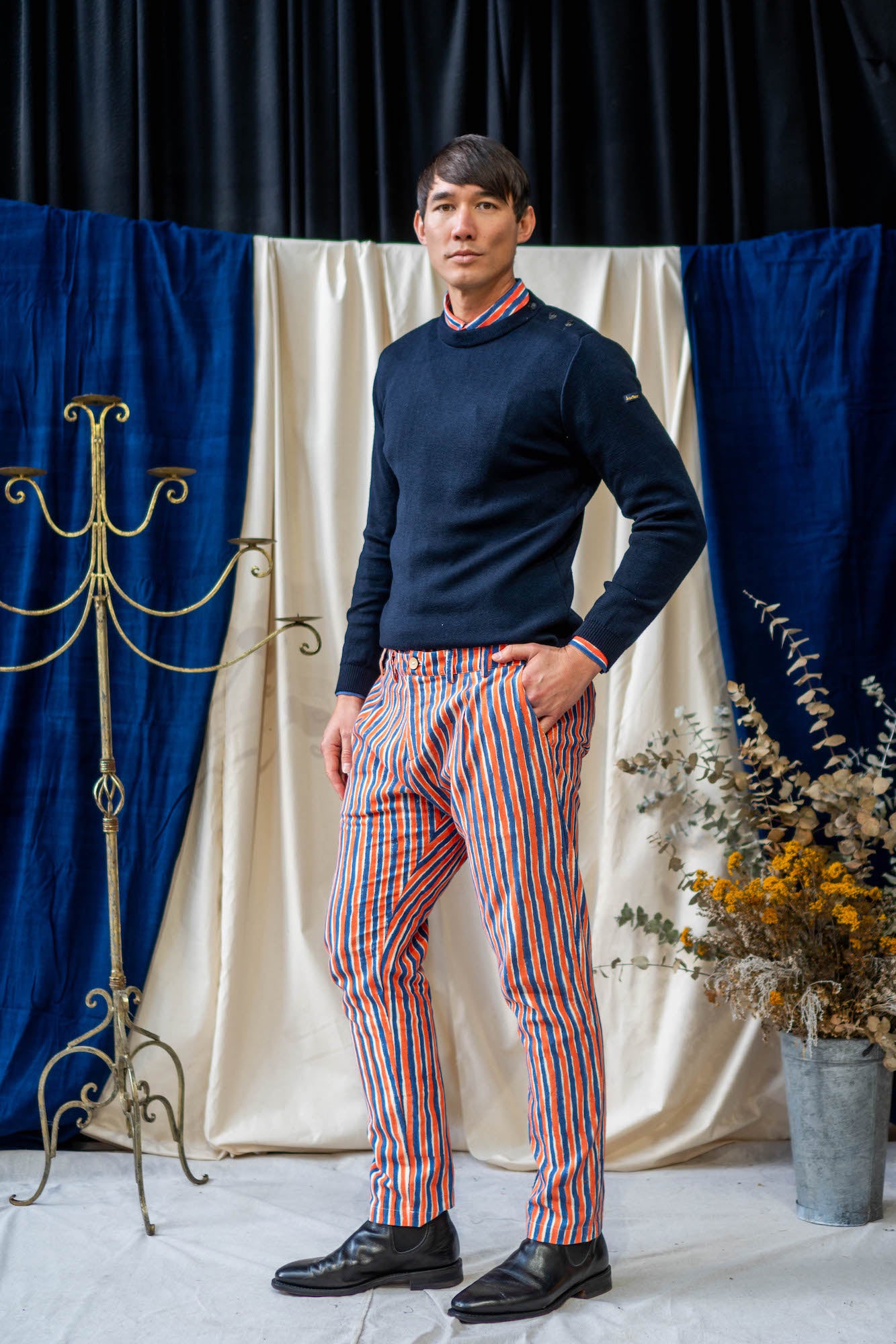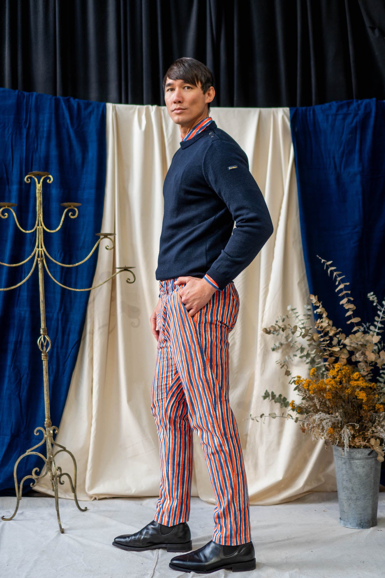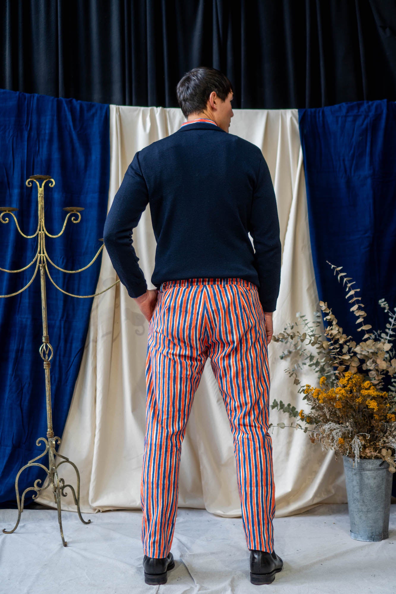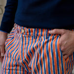 Our favourite classic pants are perfect with a white button up shirt or paired with our reversible waistcoat in Blue and orange Waffle print for the ultimate mid-century coordinate look!
