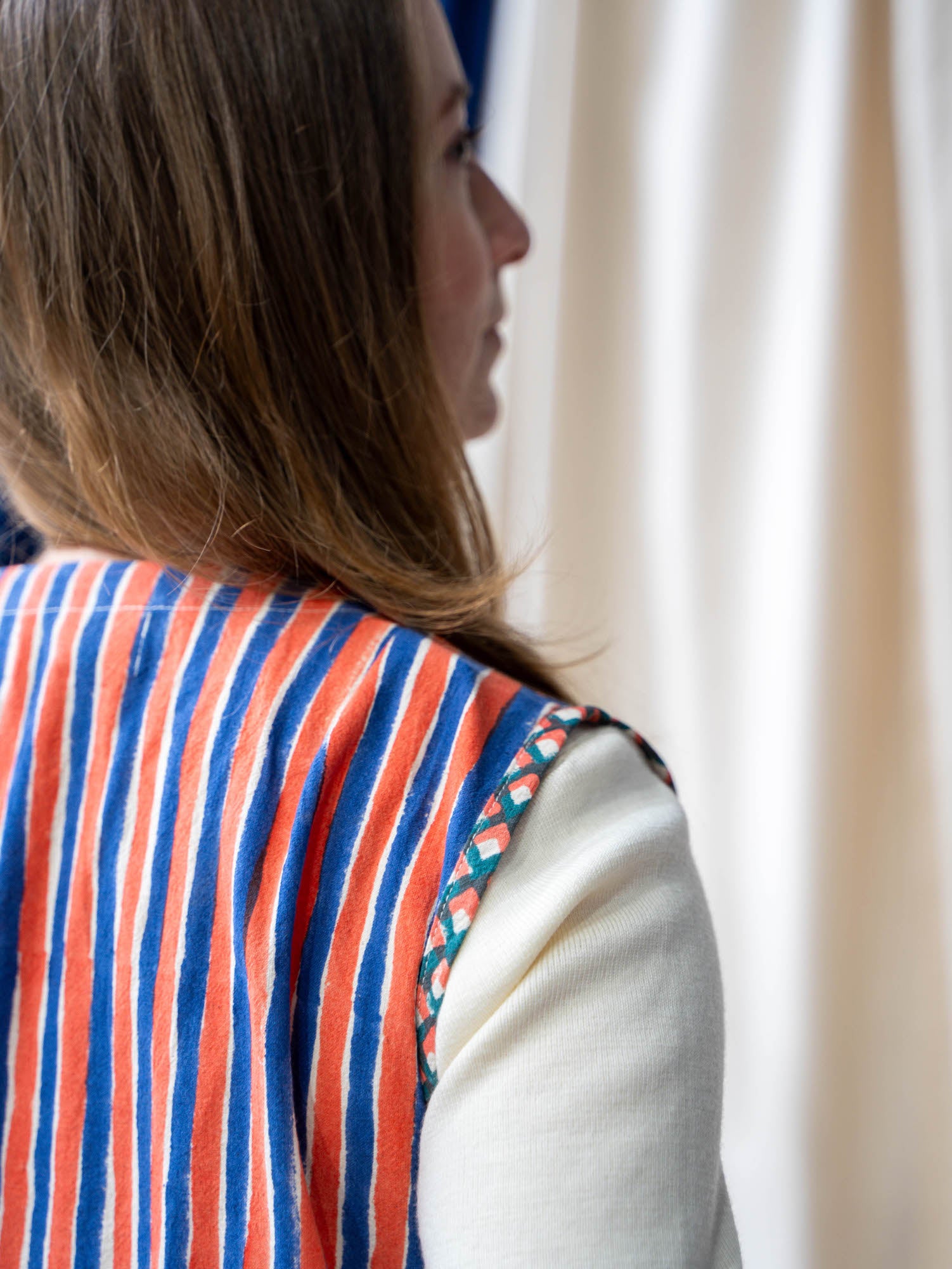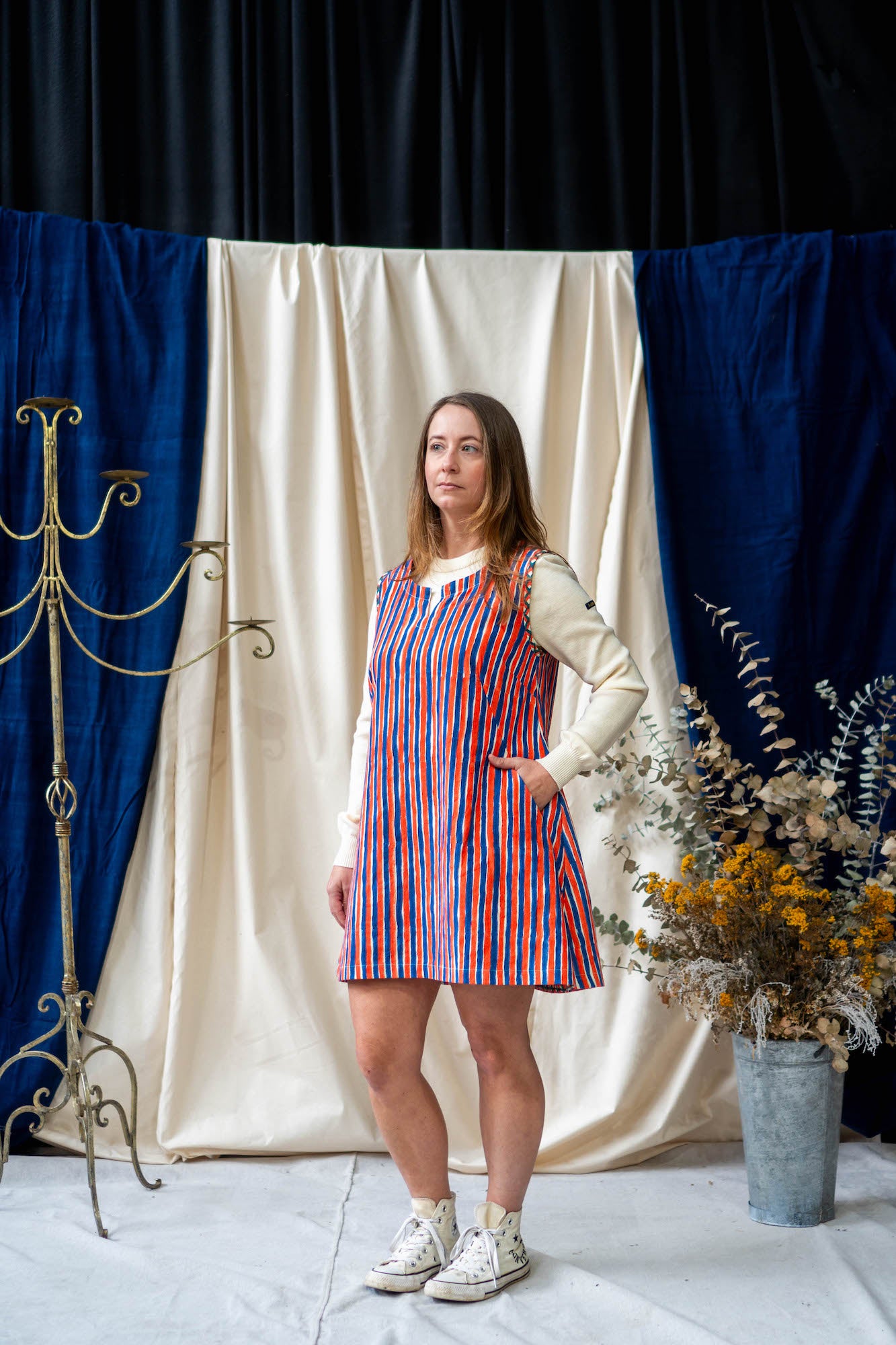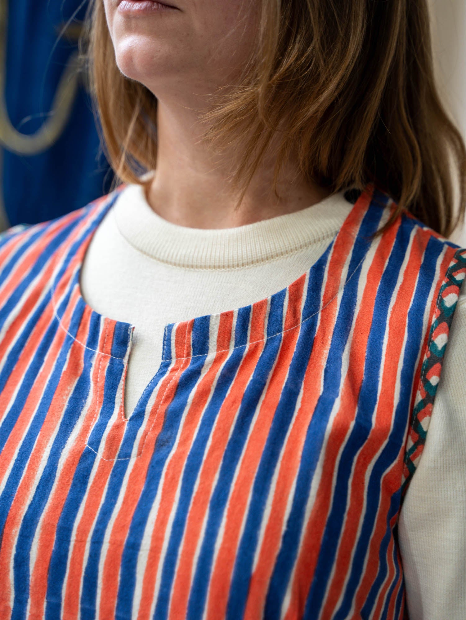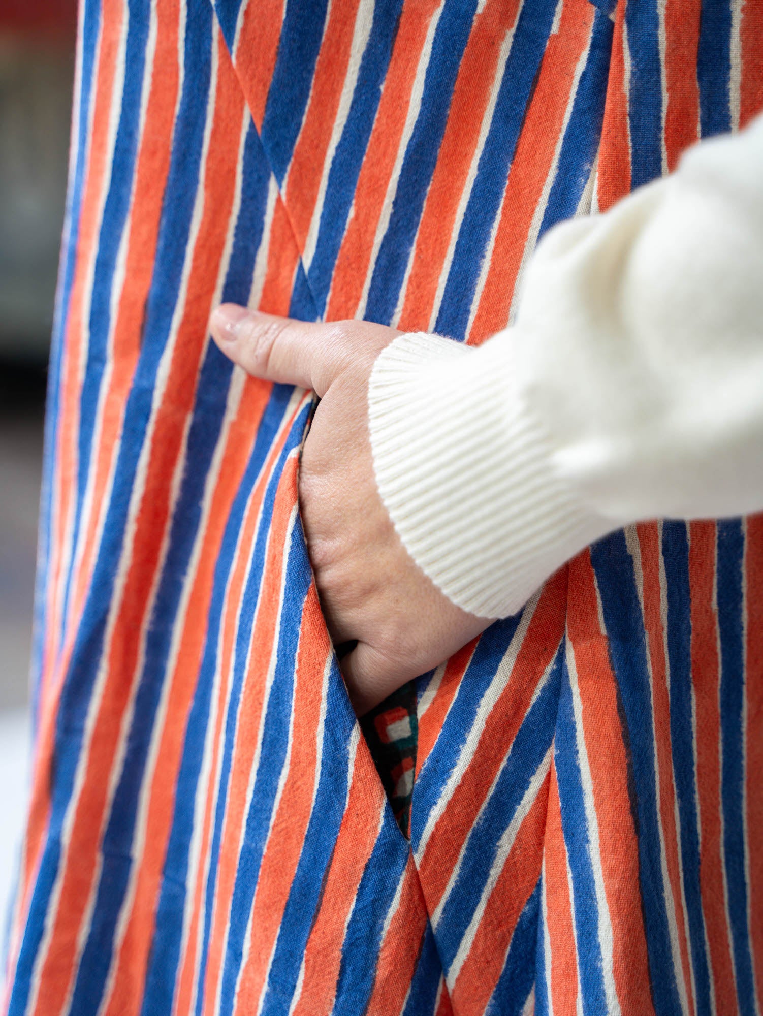 We have a new tunic block at last, after many requests for one! Much like our tunic vest from the Game Changer Collection, our Contrast Pocket Tunic is hand-block printed in our bold Orange and Blue Thick Stripe print. It has beautiful deep pockets with contrast fabric using our orange and teal waffle print. This must be the most versatile tunic of the season, with its rounded neckline and v-cut feature, the straps are thick and sleeveless, so works best to layer with a bold orange skivvy in the winter, or pair with a pair of cord flares and you’re ready to race out the door. Whether you choose to wear this hand-spun and hand-woven textured khadi piece as a dress on its own on a hot summer day or layered with a polo-neck and pants in the colder months.