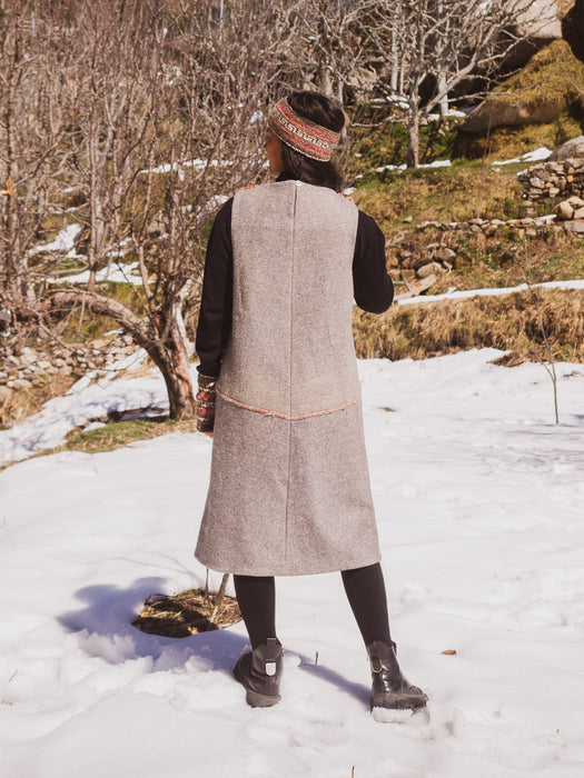 A modern take on a classic silhouette, The Twiggy Dress is inspired by traditional men’s patti jackets. Made from warm, fulled wool with hand-sewn details, while a hidden pocket adds a functional twist.