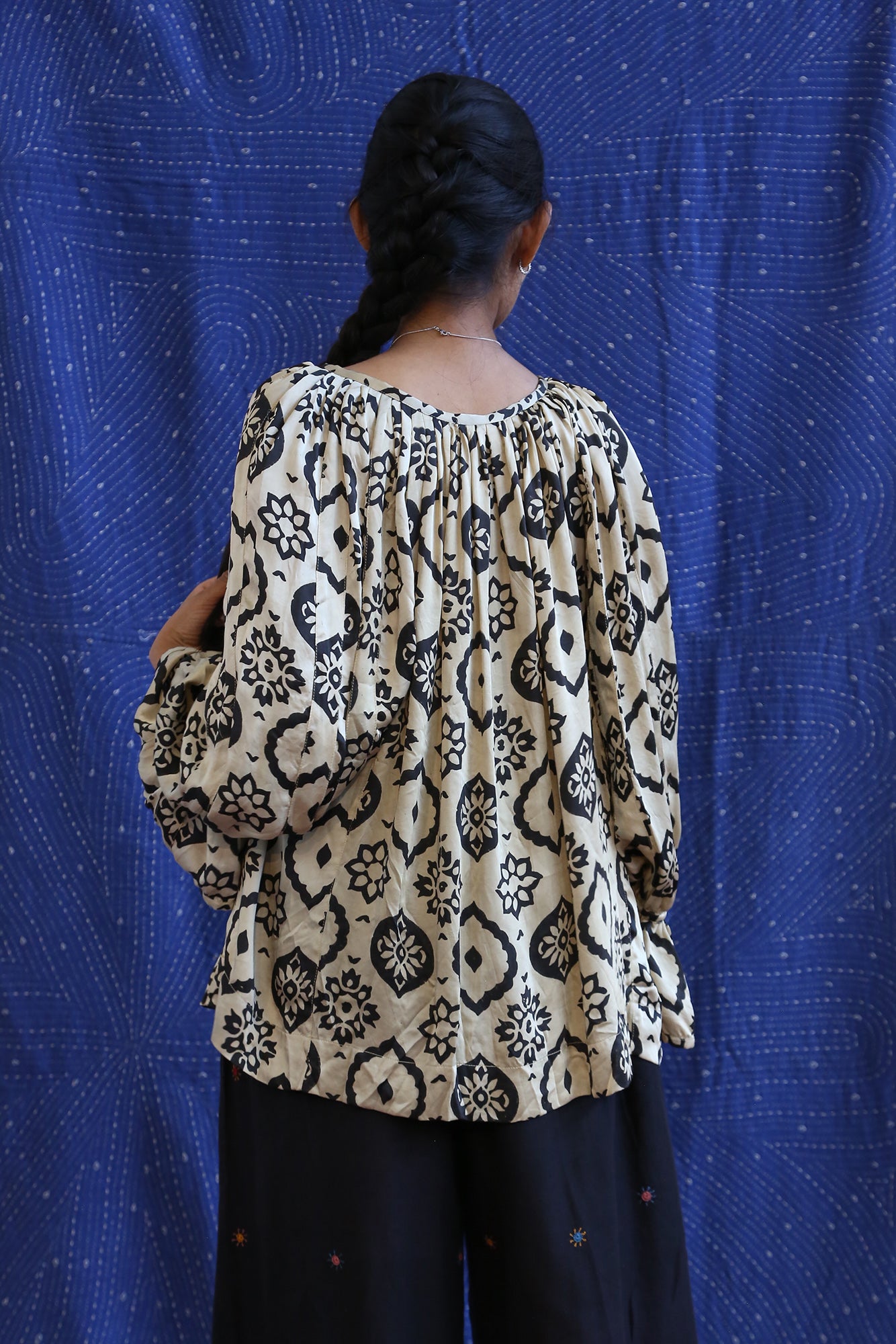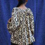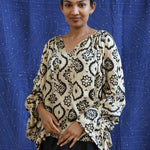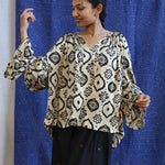 Introducing our Ajrakh Bell Top — a refined, versatile piece that brings together contemporary design and the enduring artistry of traditional Ajrakh printing. Featuring bell sleeves and a relaxed, flattering silhouette, this top offers ease and movement while showcasing the intricate hand block-printed patterns crafted by artisans in Kutch, India, under the guidance of Sufiyan Khatri.