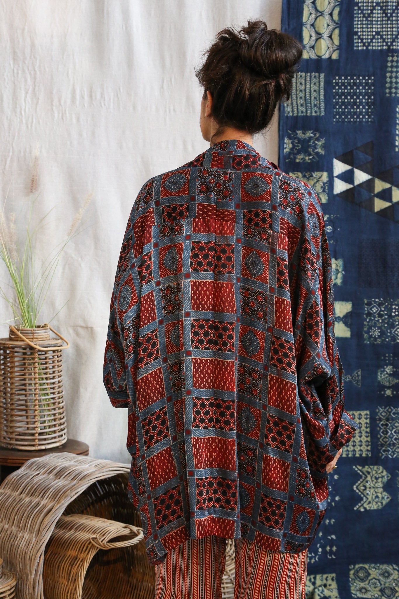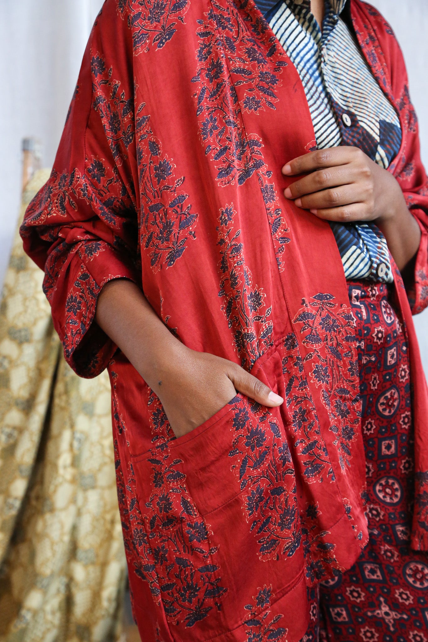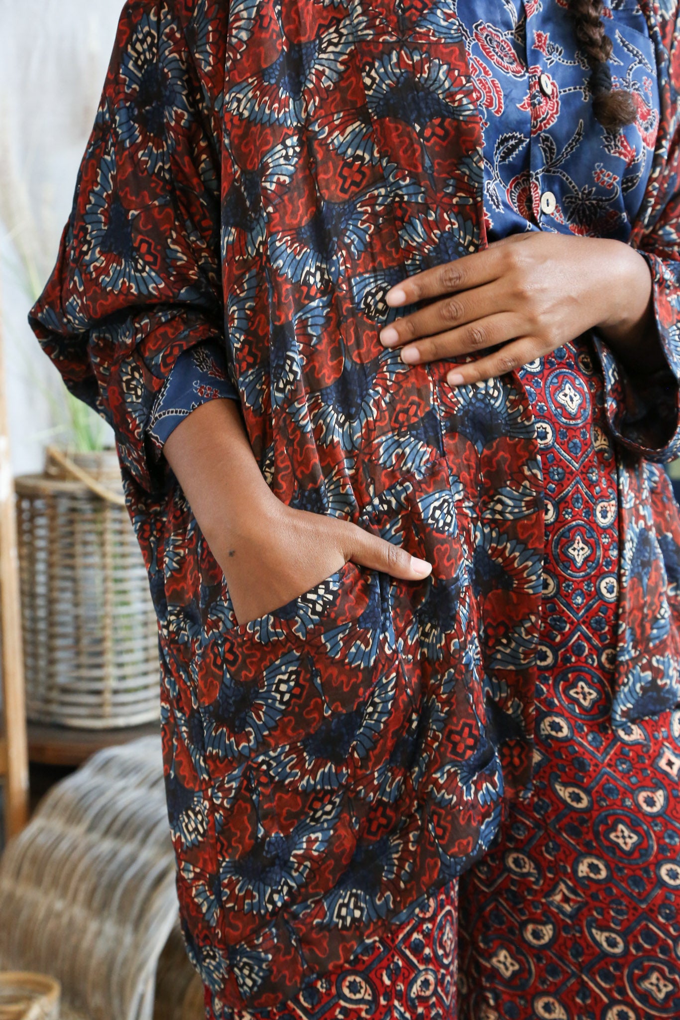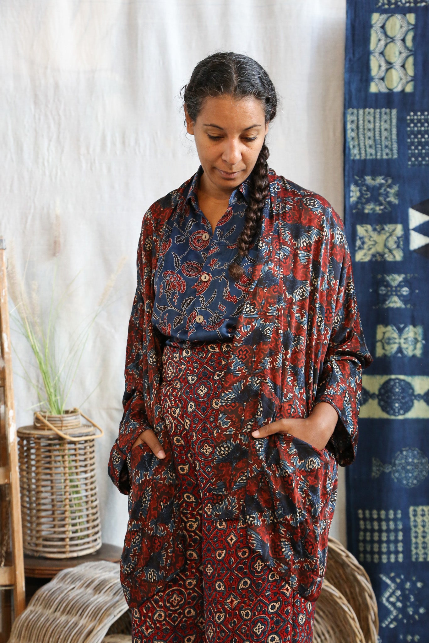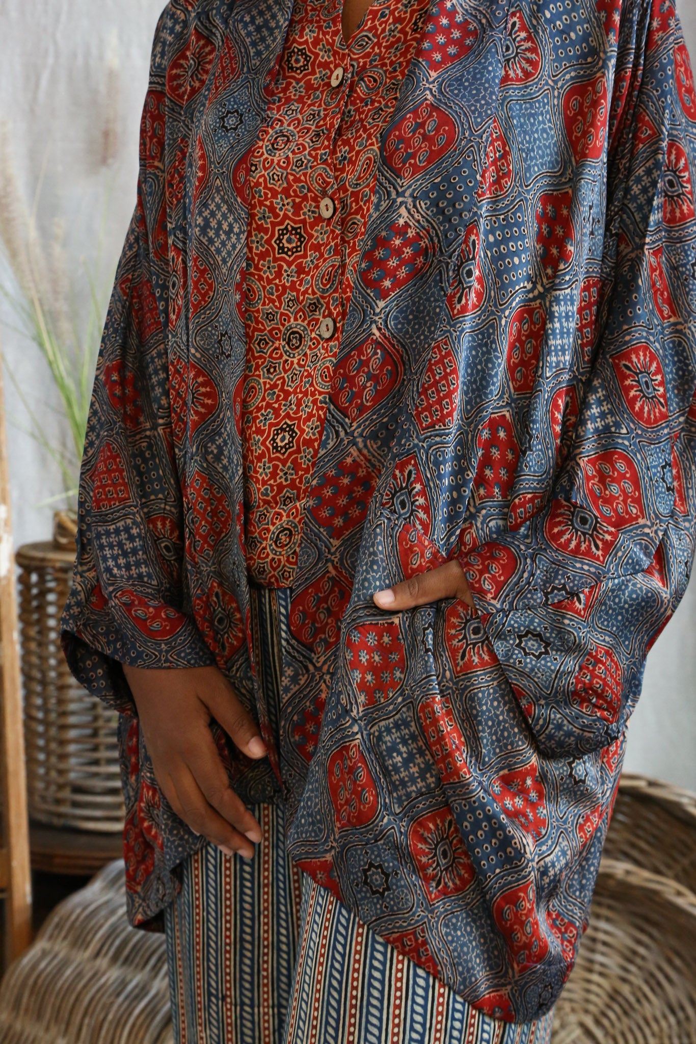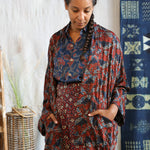Introducing our exquisite Modal Silk Kimono, expertly crafted in blockprinted Ajrakh silk modal at the renowned workshop of master printer Suffiyan Khatri. Featuring traditional geometric patterns and vibrant colors that are a testament to centuries-old craftsmanship, this kimono is designed with practicality in mind, boasting functional pockets for added convenience.
