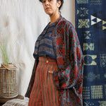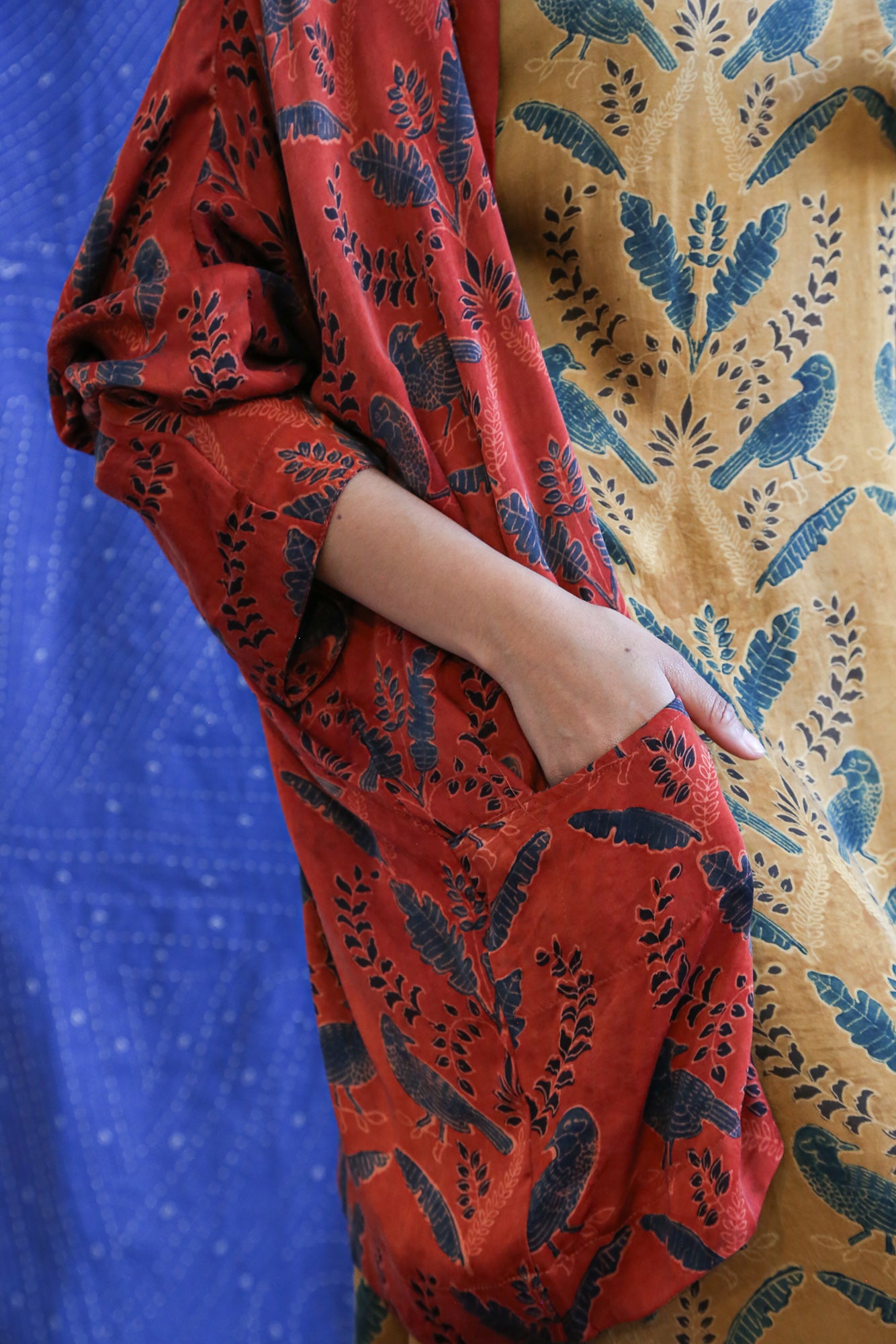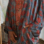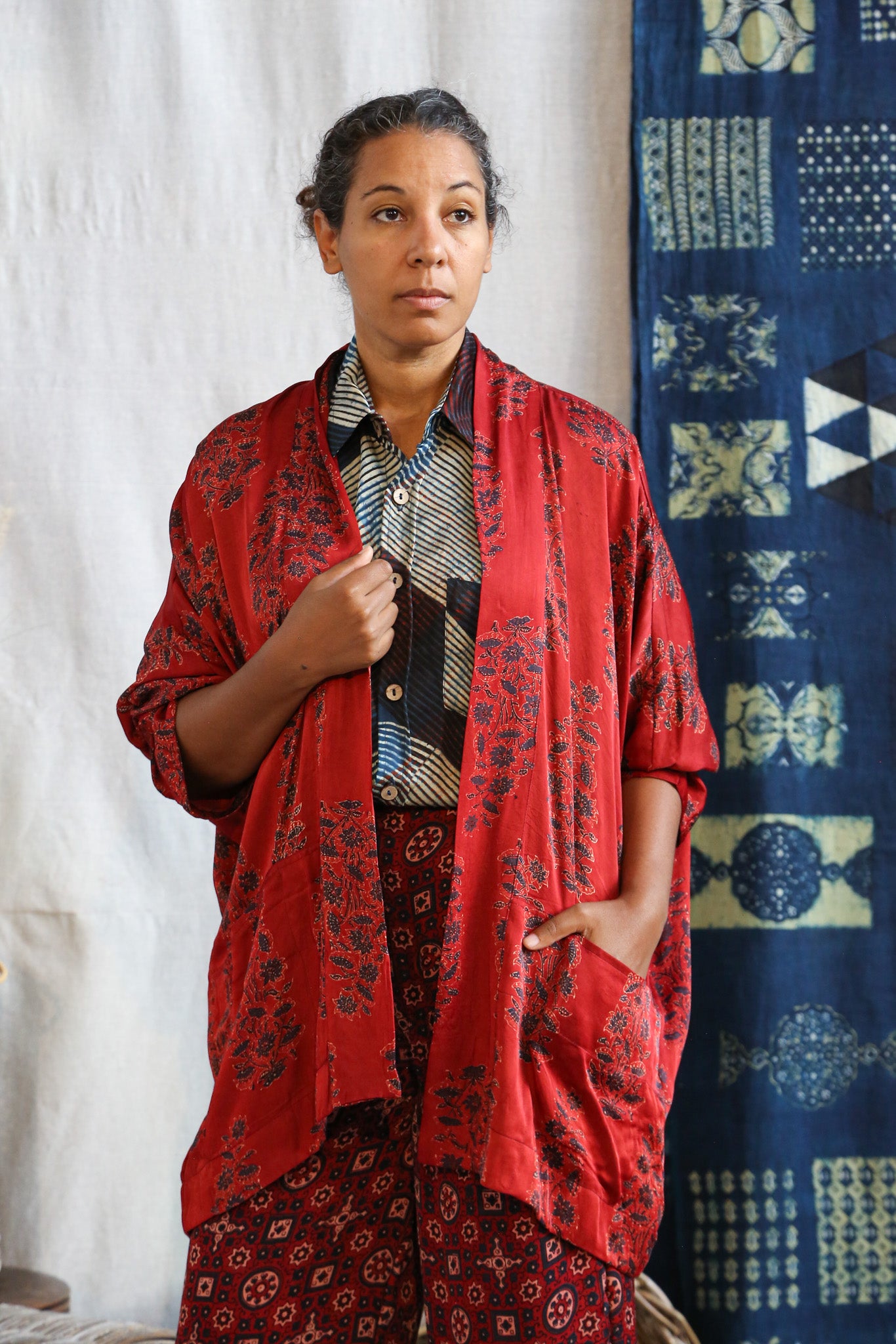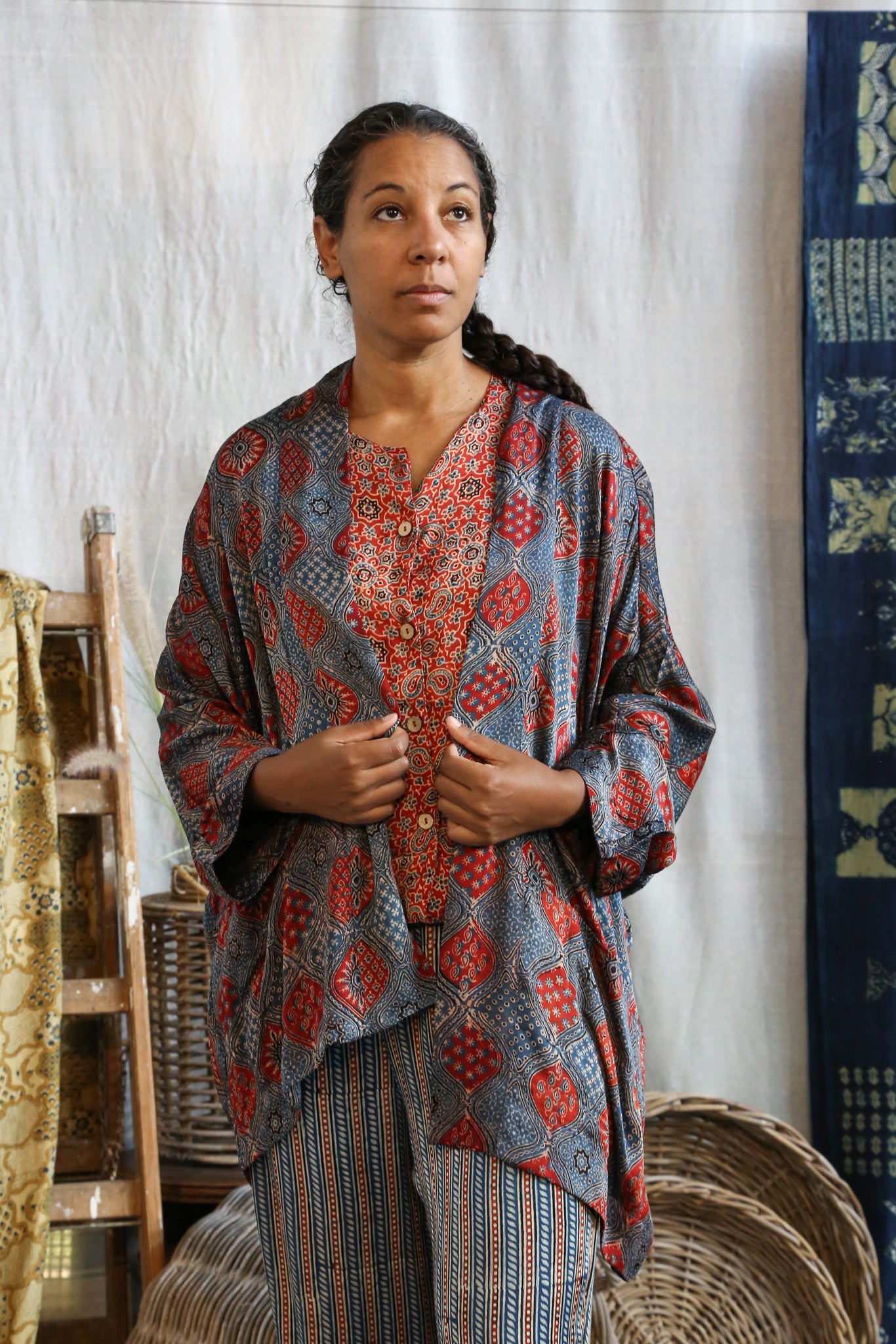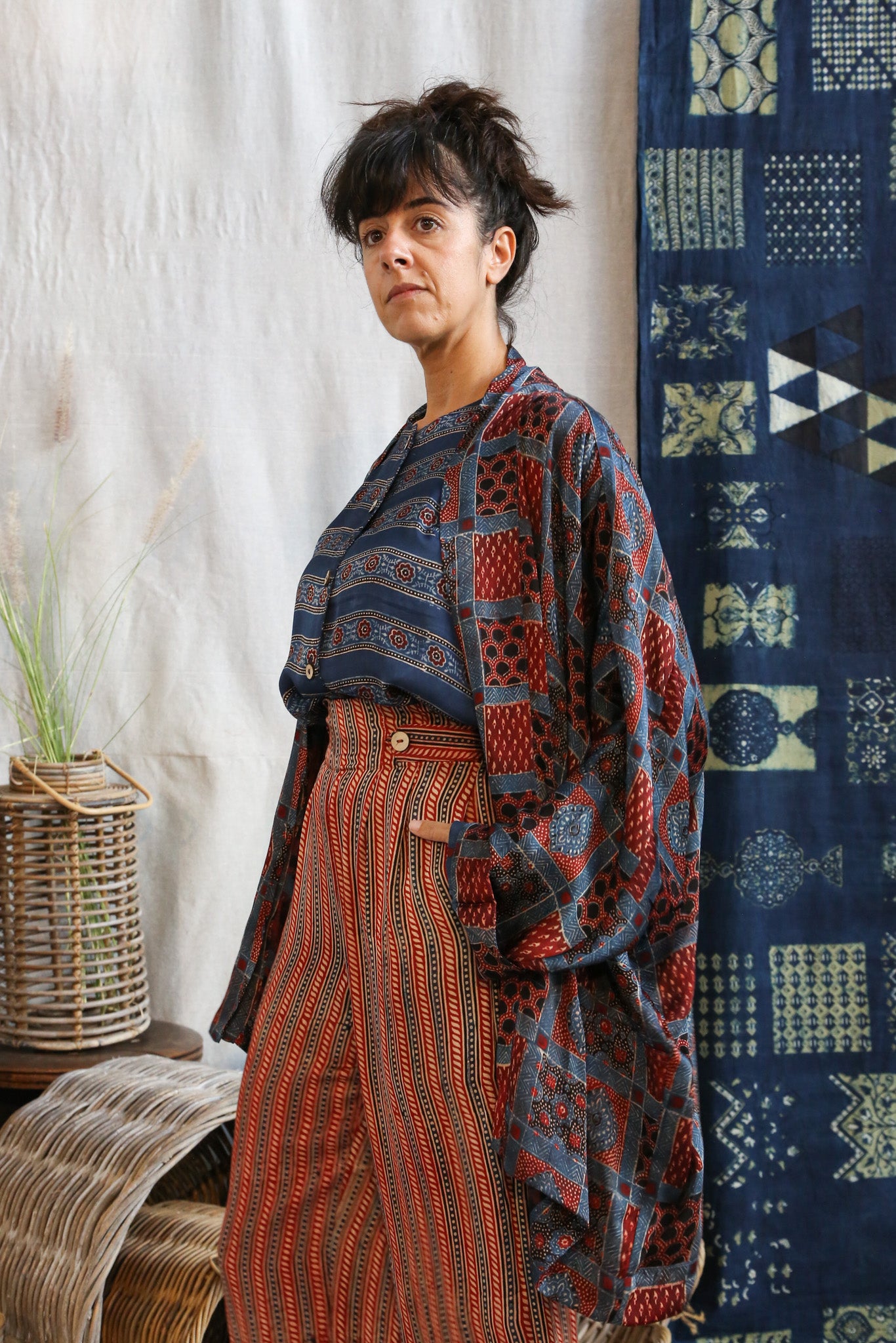 Introducing our exquisite Modal Silk Kimono, expertly crafted in blockprinted Ajrakh silk modal at the renowned workshop of master printer Suffiyan Khatri. Featuring traditional geometric patterns and vibrant colors that are a testament to centuries-old craftsmanship, this kimono is designed with practicality in mind, boasting functional pockets for added convenience.