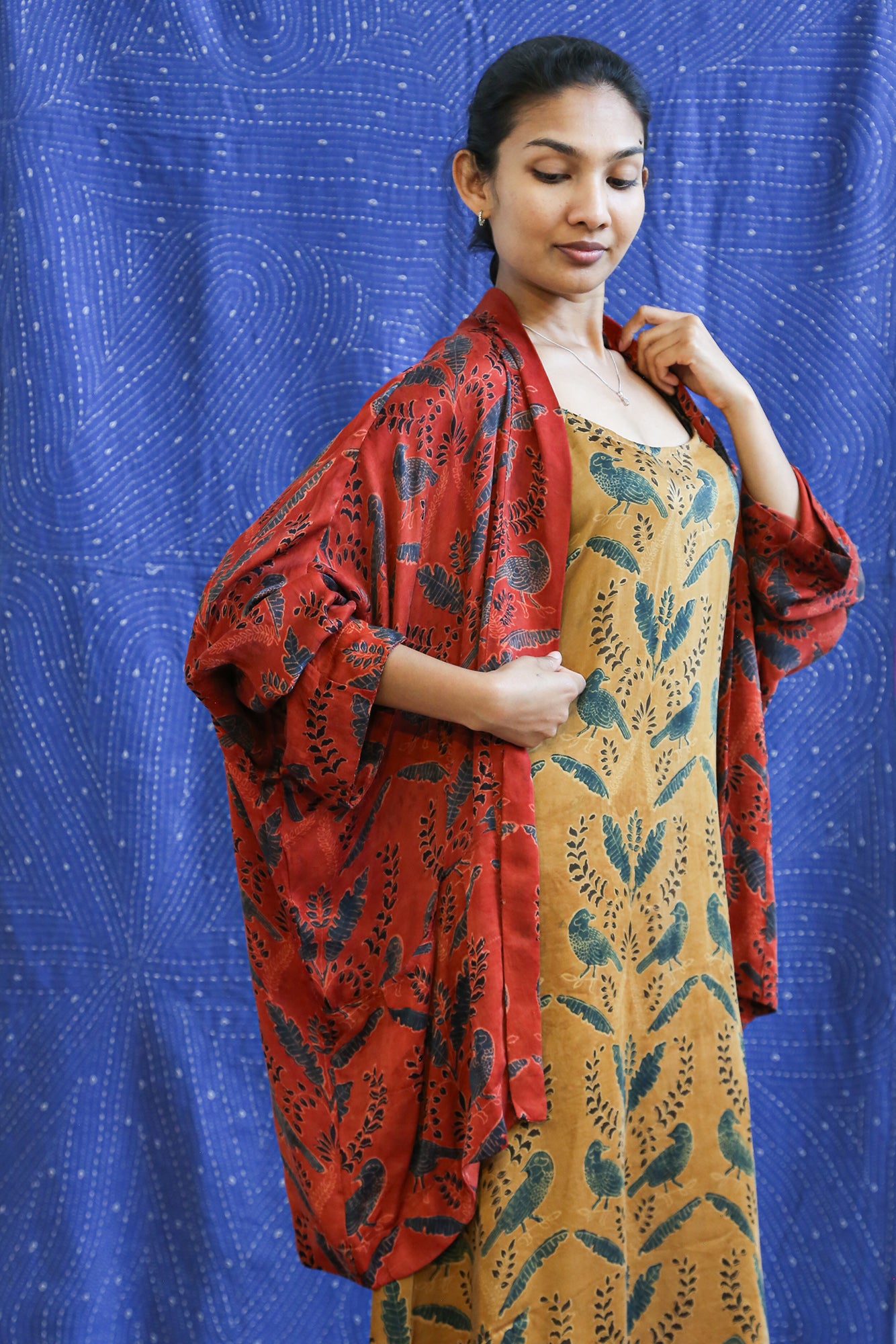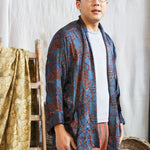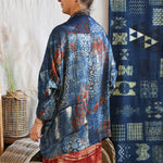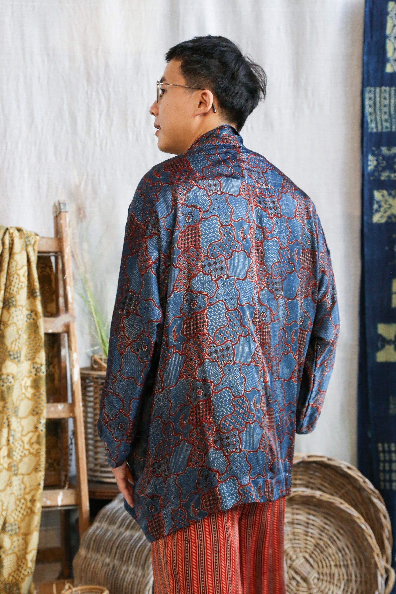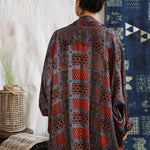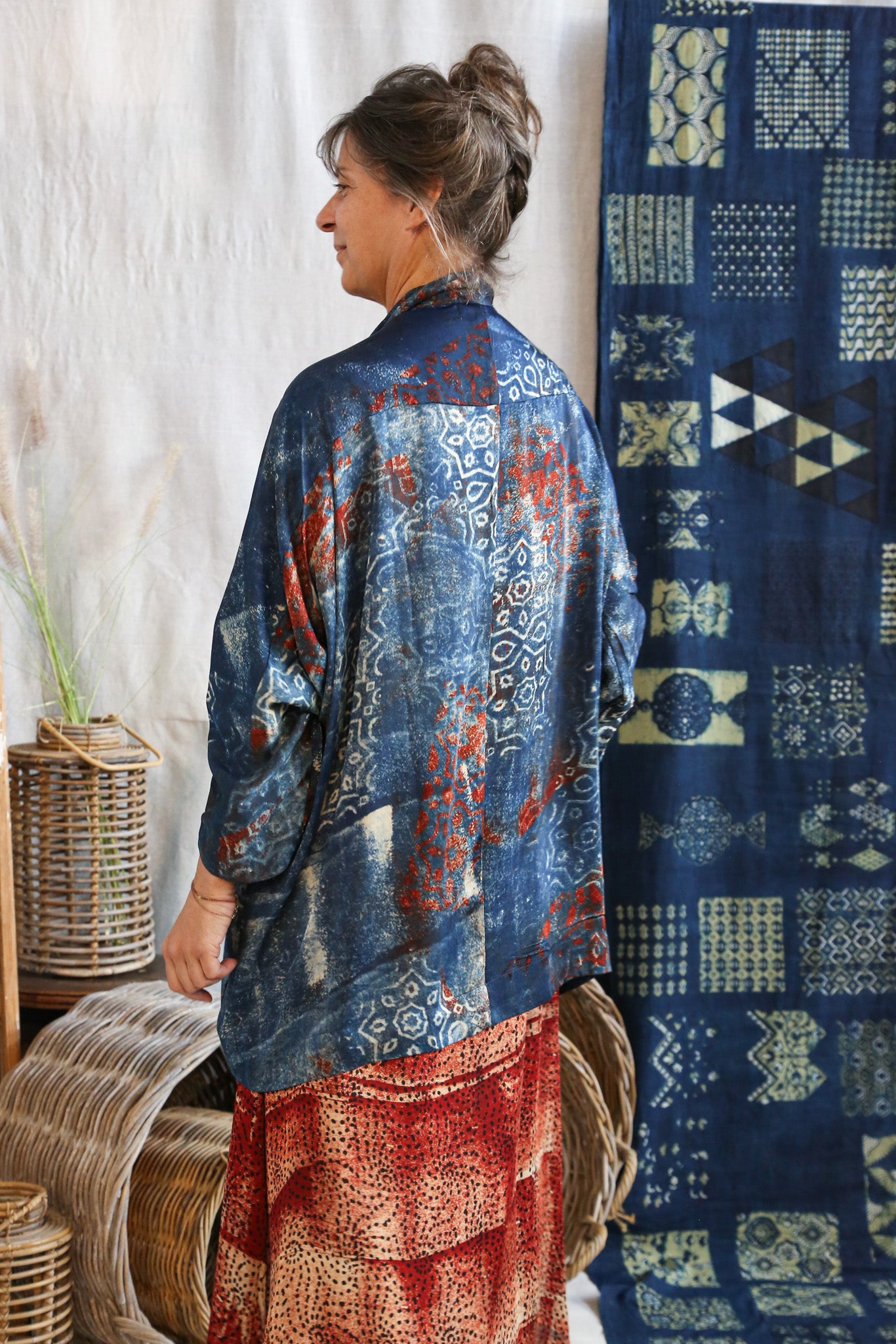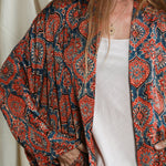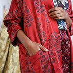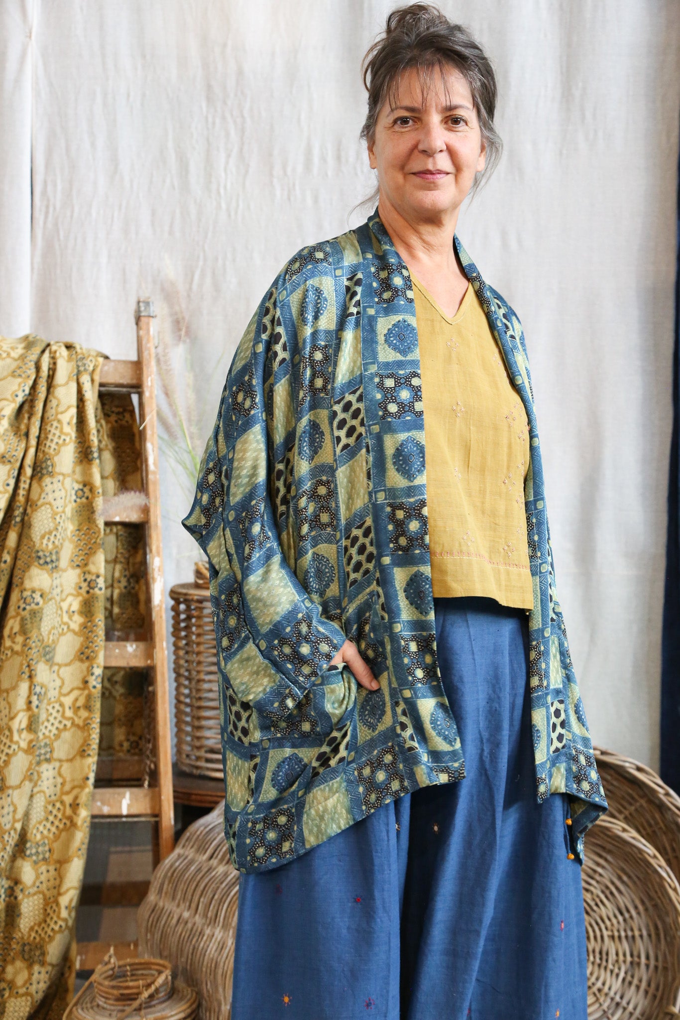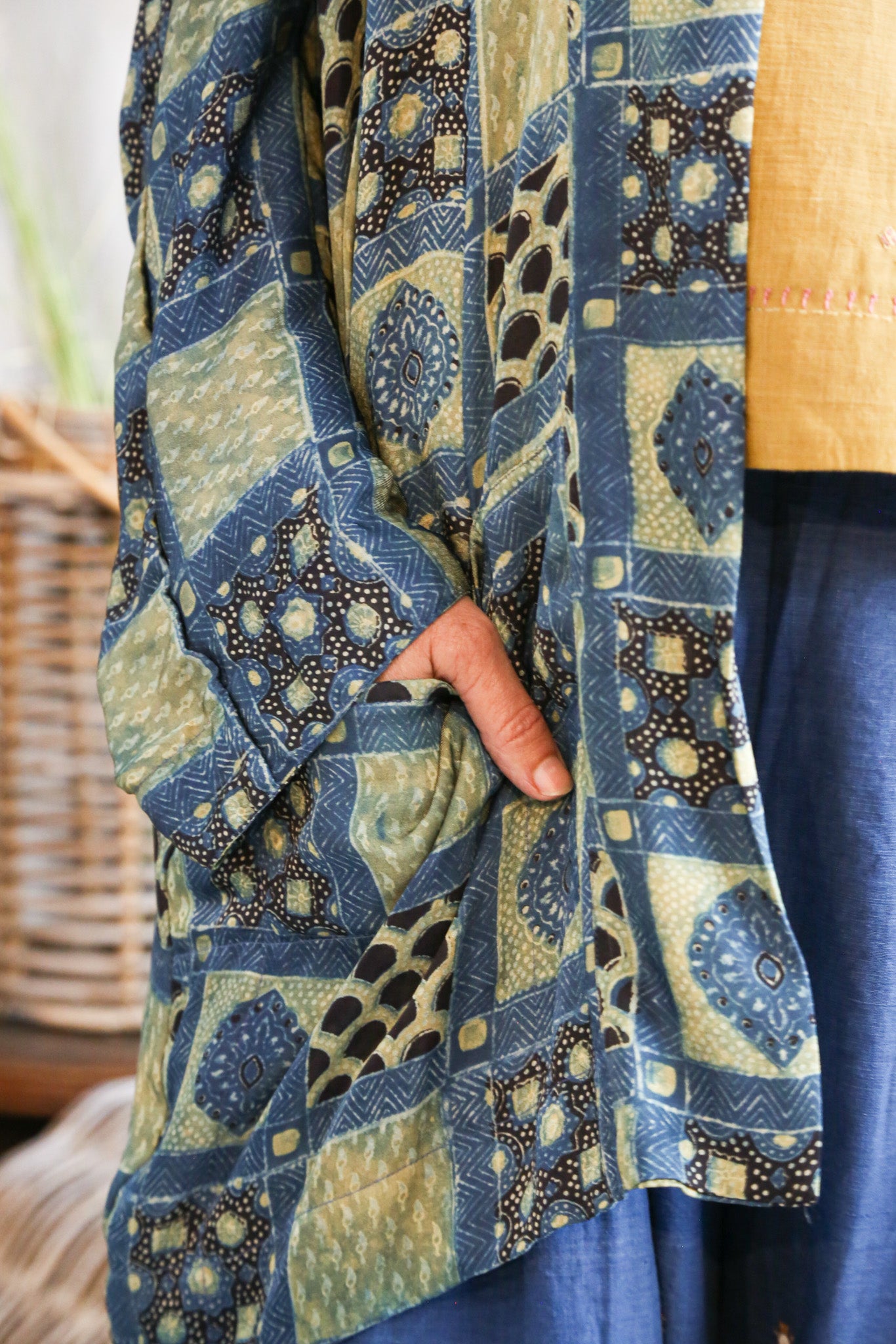Introducing our exquisite Modal Silk Kimono, expertly crafted in blockprinted Ajrakh silk modal at the renowned workshop of master printer Suffiyan Khatri. Featuring traditional geometric patterns and vibrant colors that are a testament to centuries-old craftsmanship, this kimono is designed with practicality in mind, boasting functional pockets for added convenience.