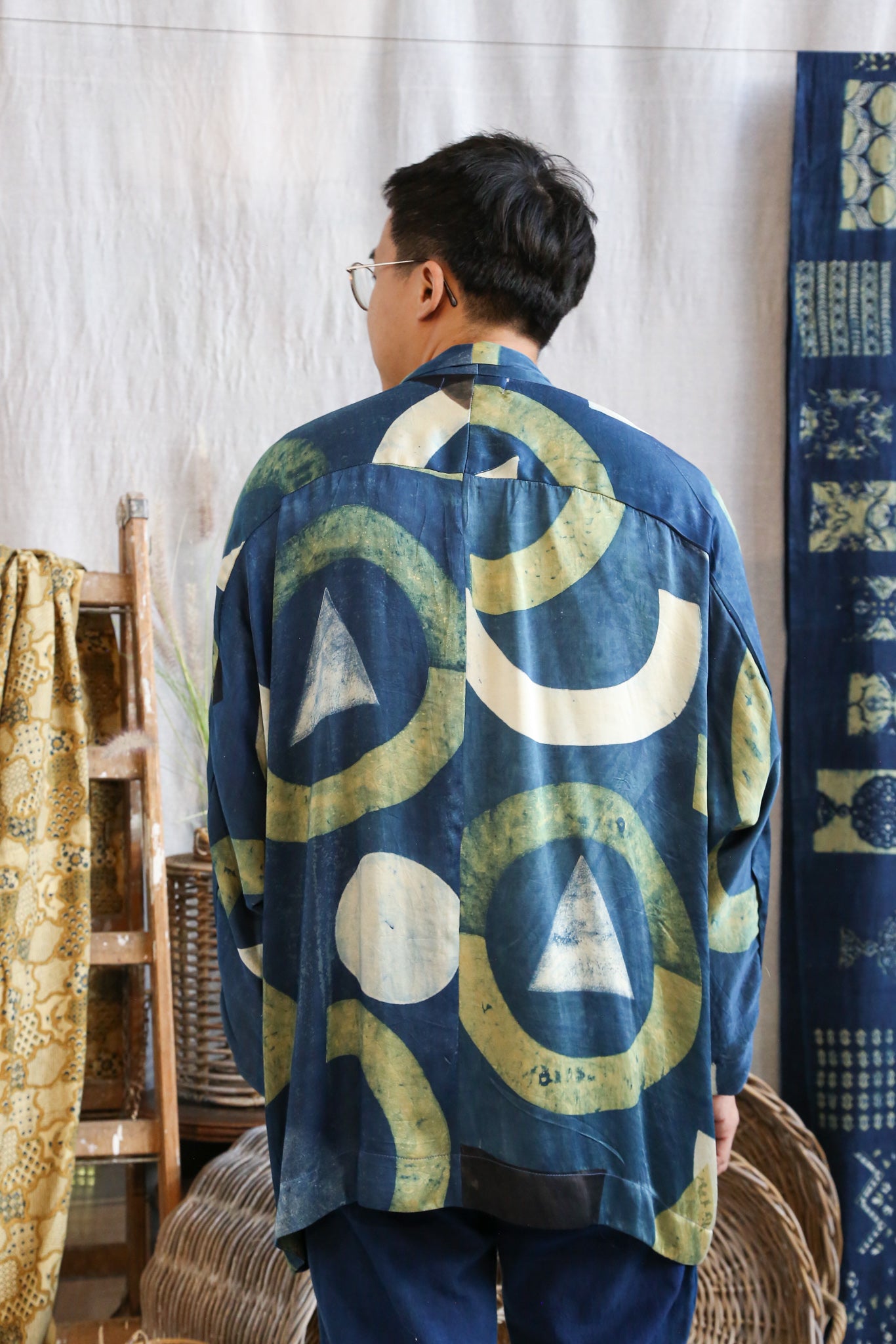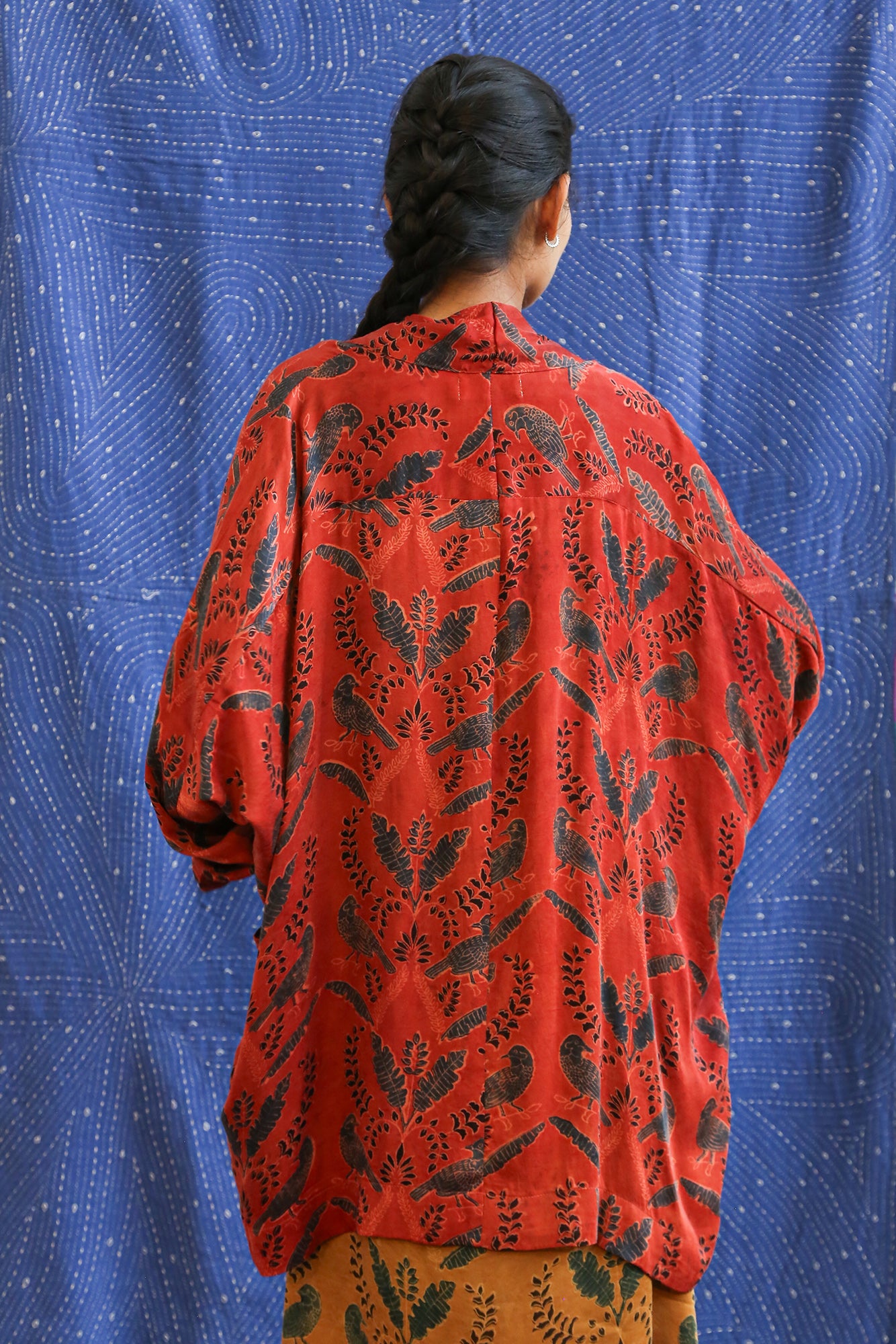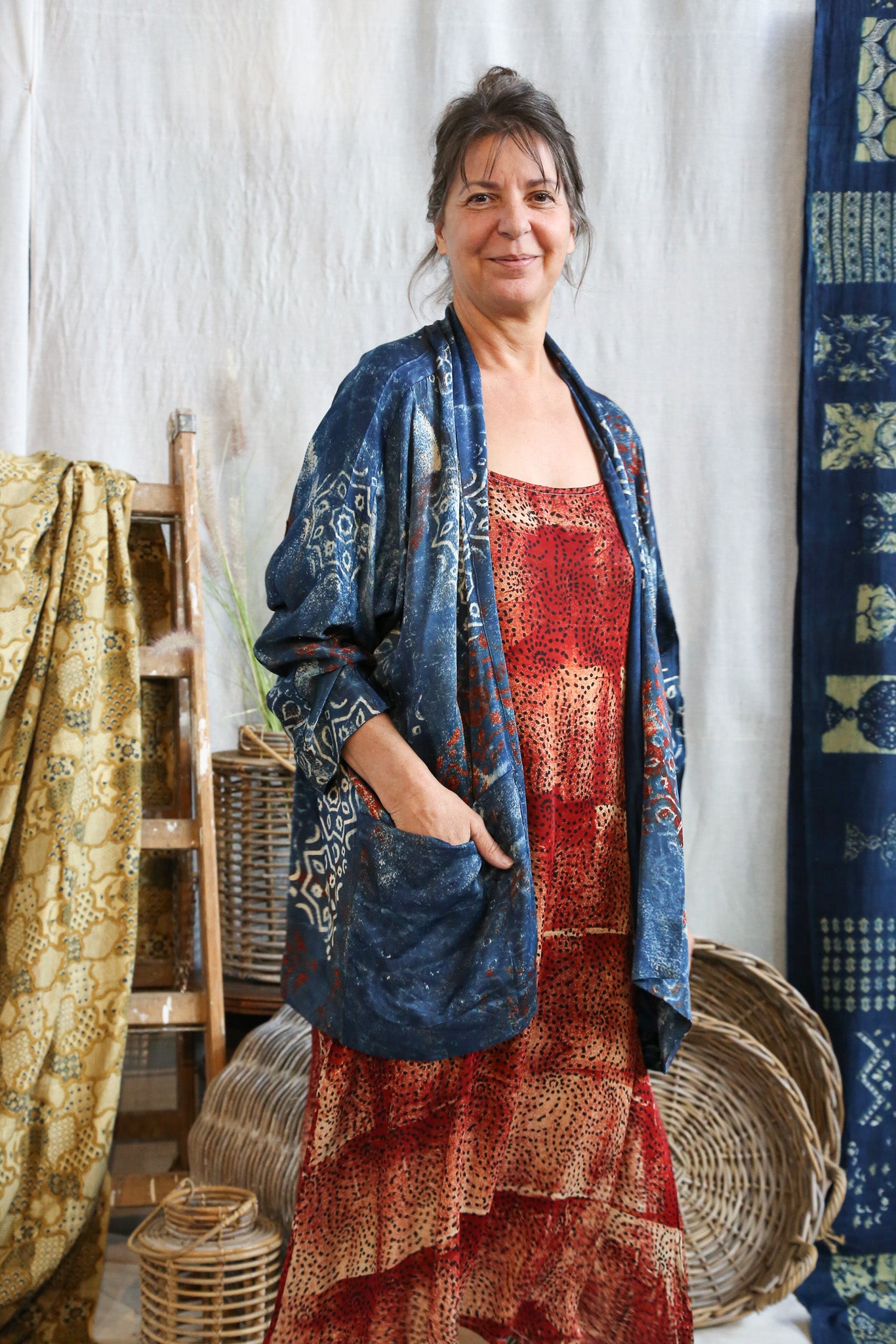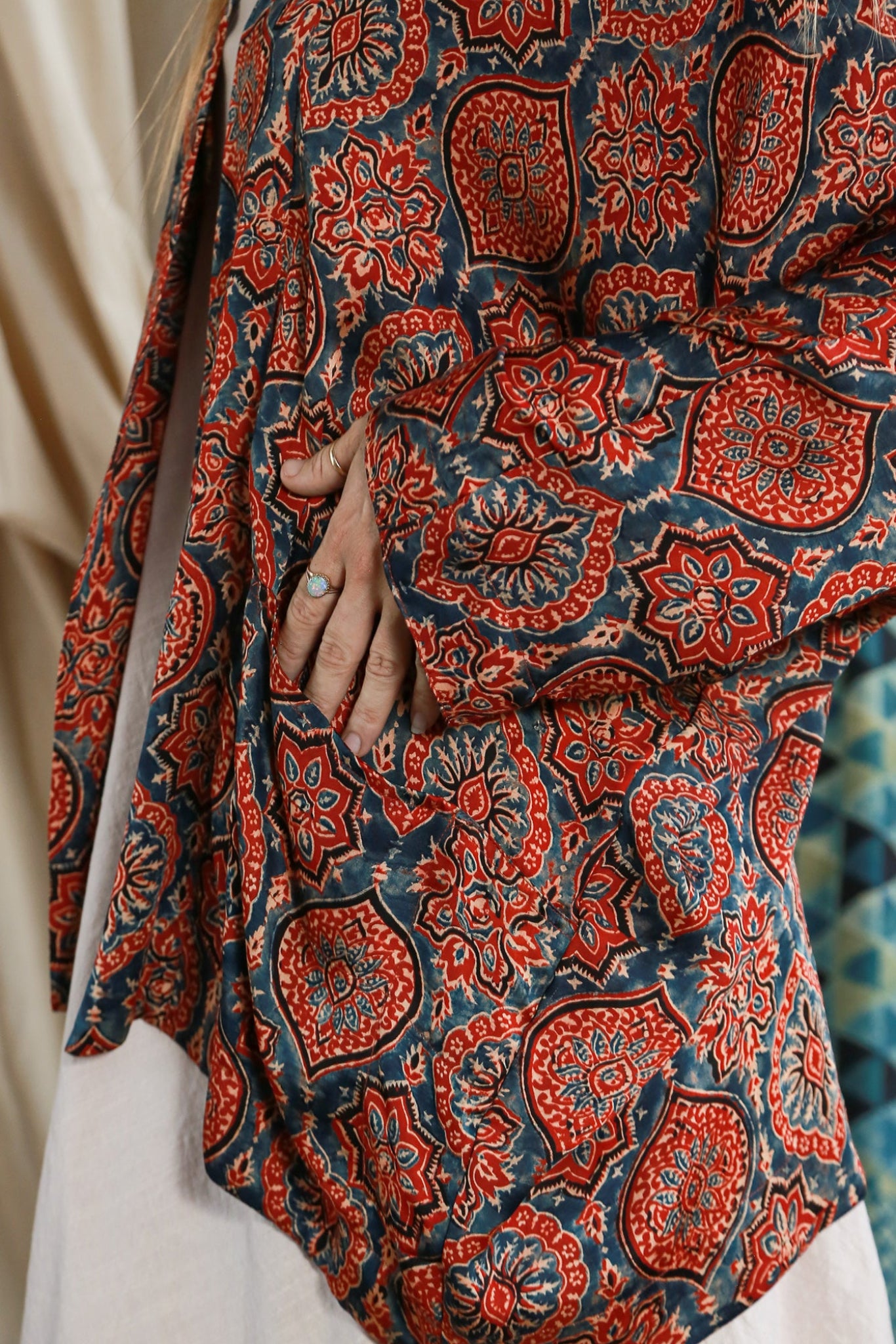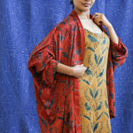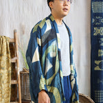 Introducing our exquisite Modal Silk Kimono, expertly crafted in blockprinted Ajrakh silk modal at the renowned workshop of master printer Suffiyan Khatri. Featuring traditional geometric patterns and vibrant colors that are a testament to centuries-old craftsmanship, this kimono is designed with practicality in mind, boasting functional pockets for added convenience.