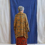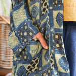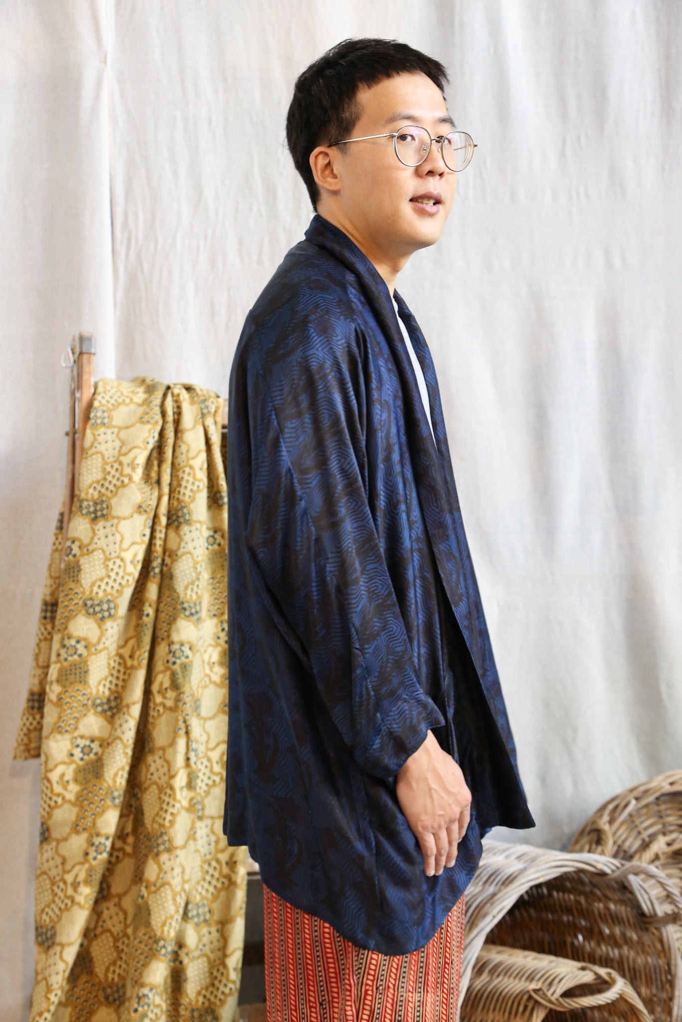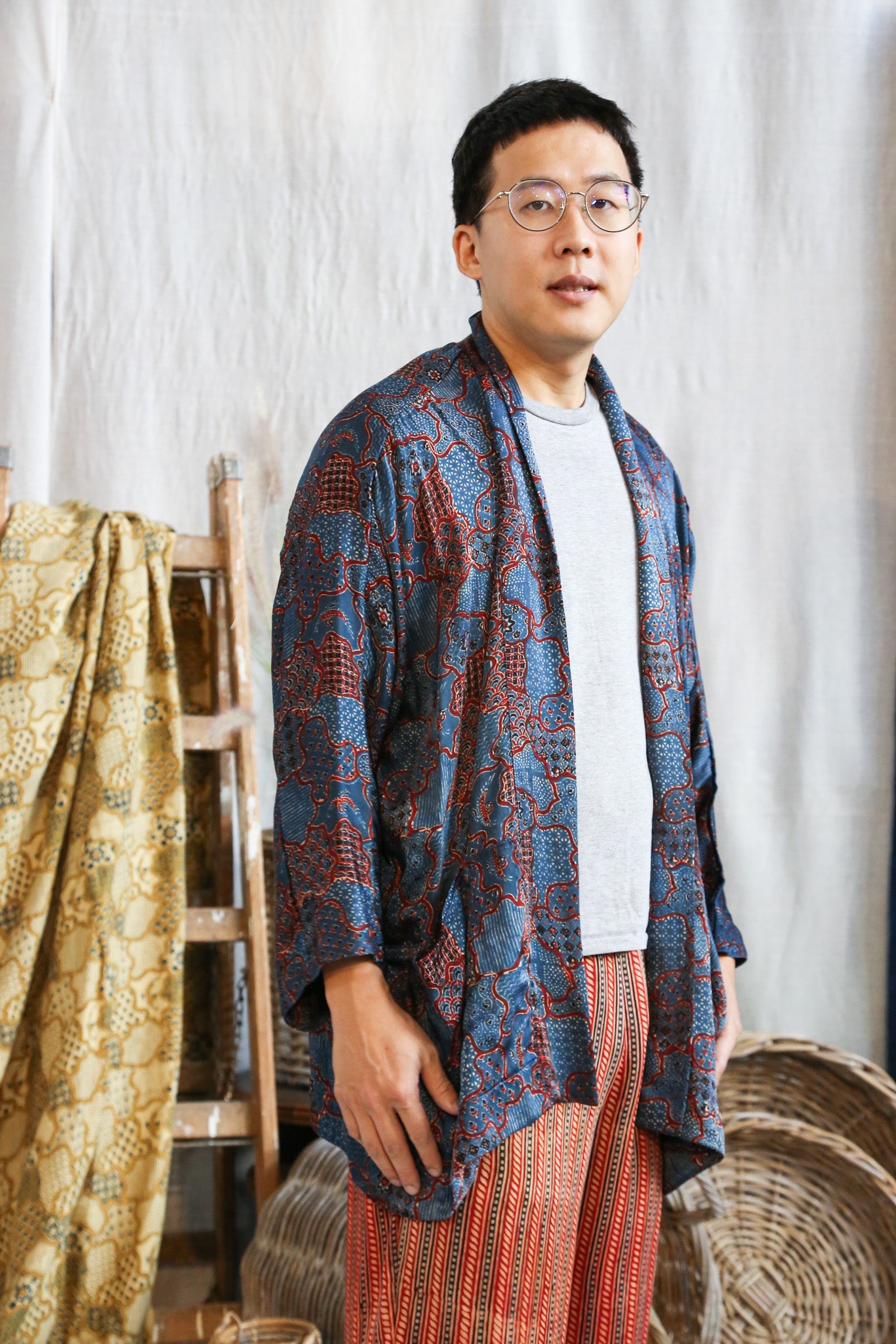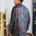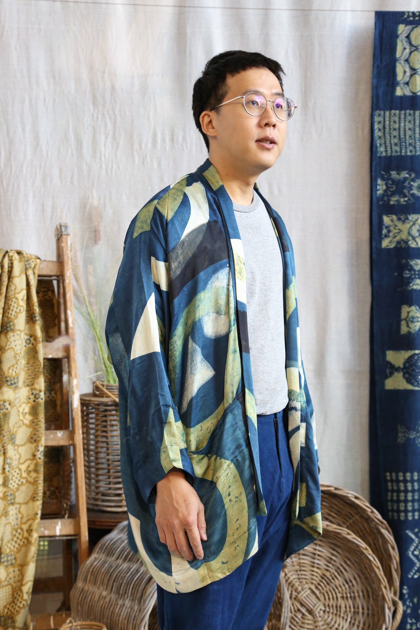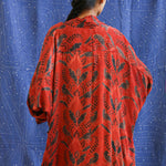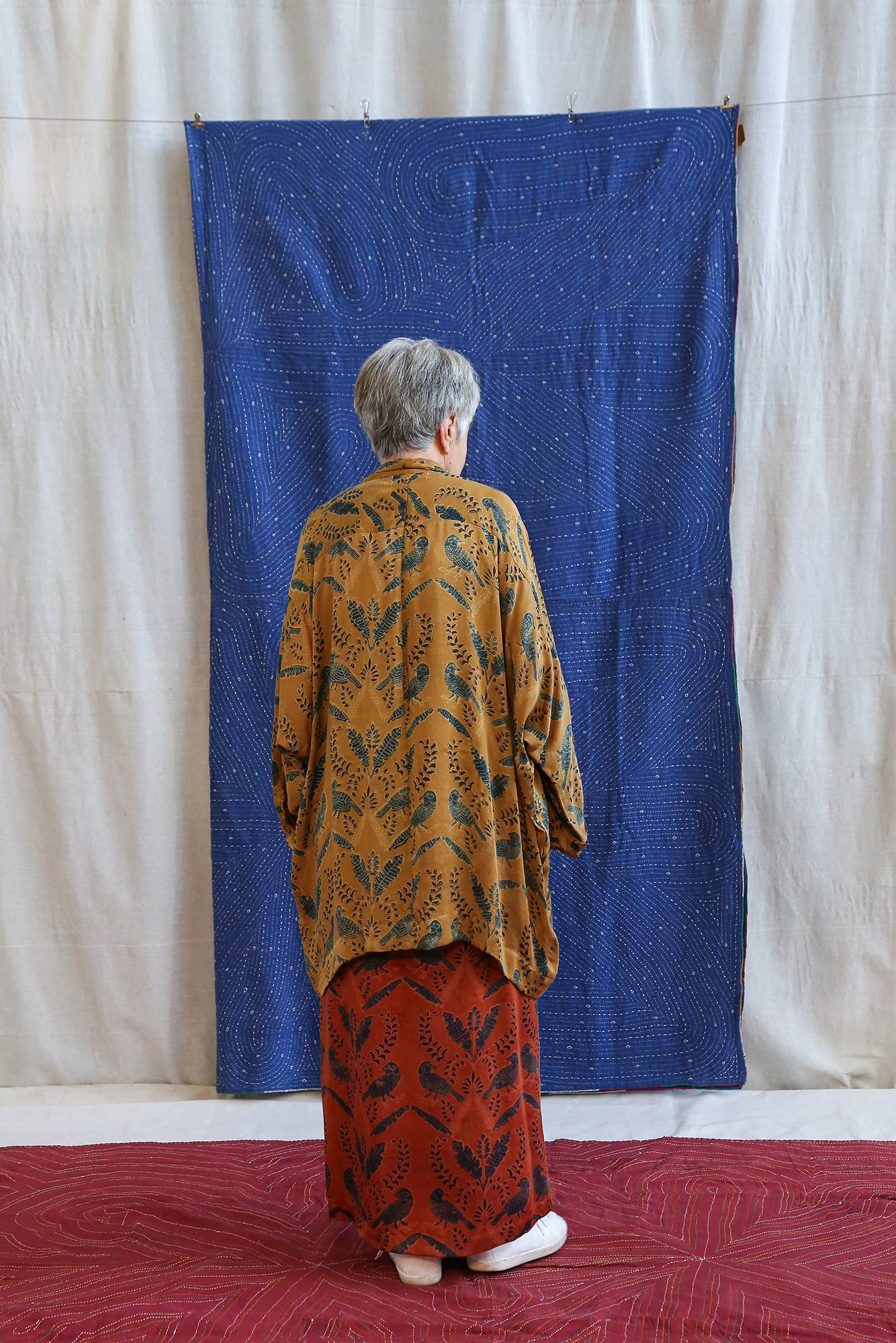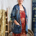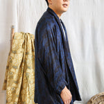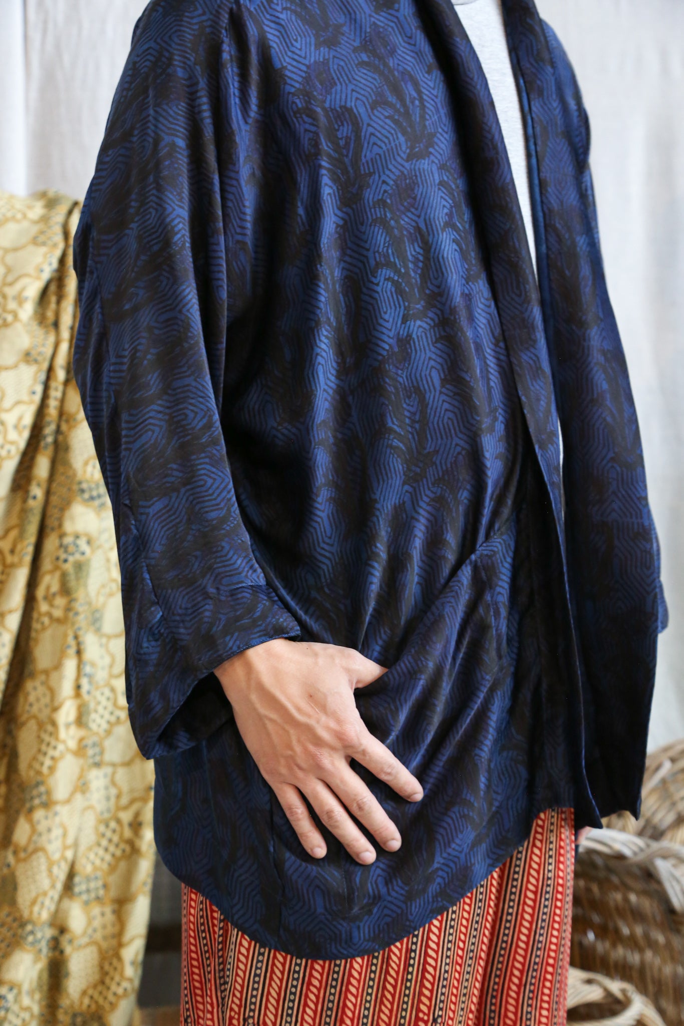 Introducing our exquisite Modal Silk Kimono, expertly crafted in blockprinted Ajrakh silk modal at the renowned workshop of master printer Suffiyan Khatri. Featuring traditional geometric patterns and vibrant colors that are a testament to centuries-old craftsmanship, this kimono is designed with practicality in mind, boasting functional pockets for added convenience.