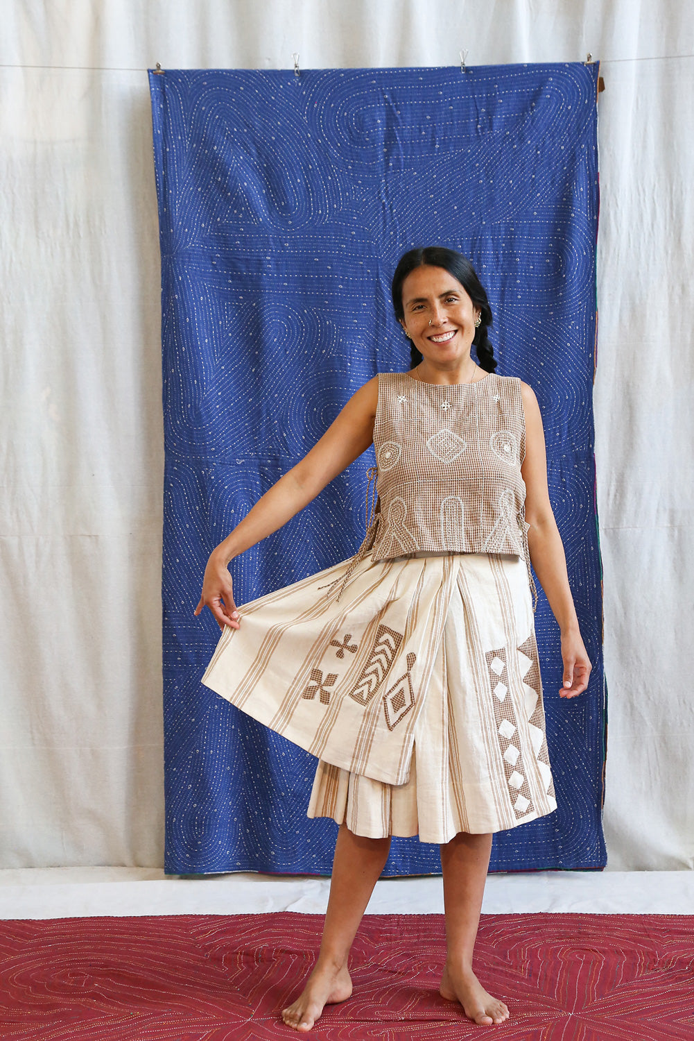 This collection is a collaboration between The ANJELMS Project, Kalyani Pasad, and Gitaben Bravesh Rabari, a talented artisan from the Rabari community.