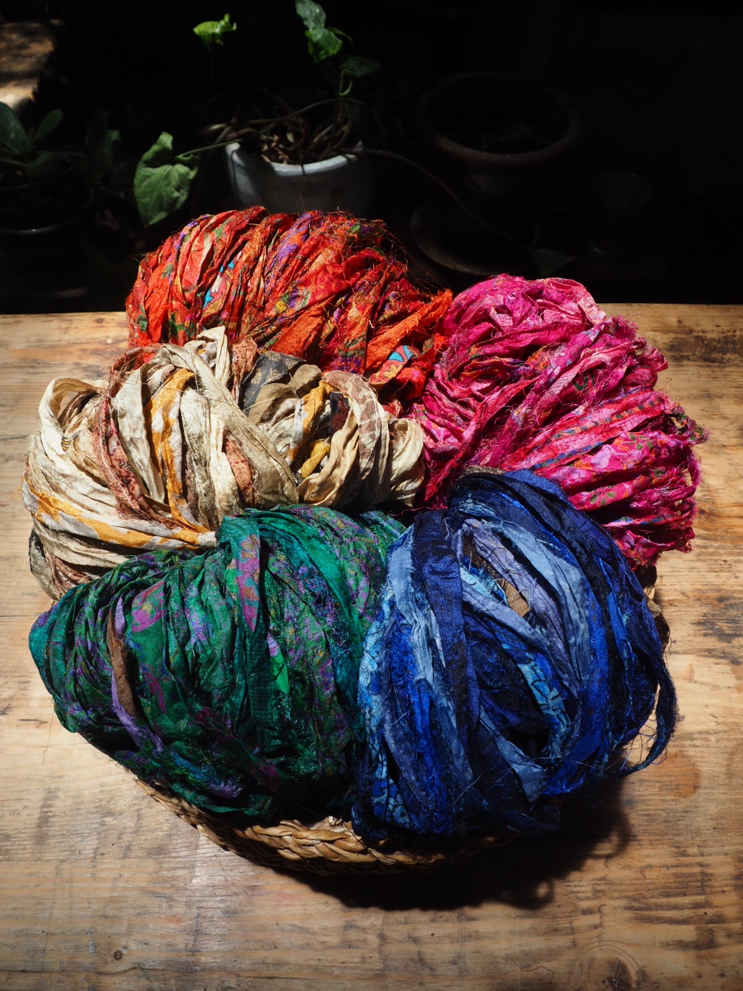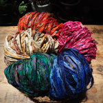 This pack contains 5 balls of Sari Yarns. Each yarn is 100% silk and rolled into 100gm balls consisting between 93 to 98m depending on the weight of Sarees used.