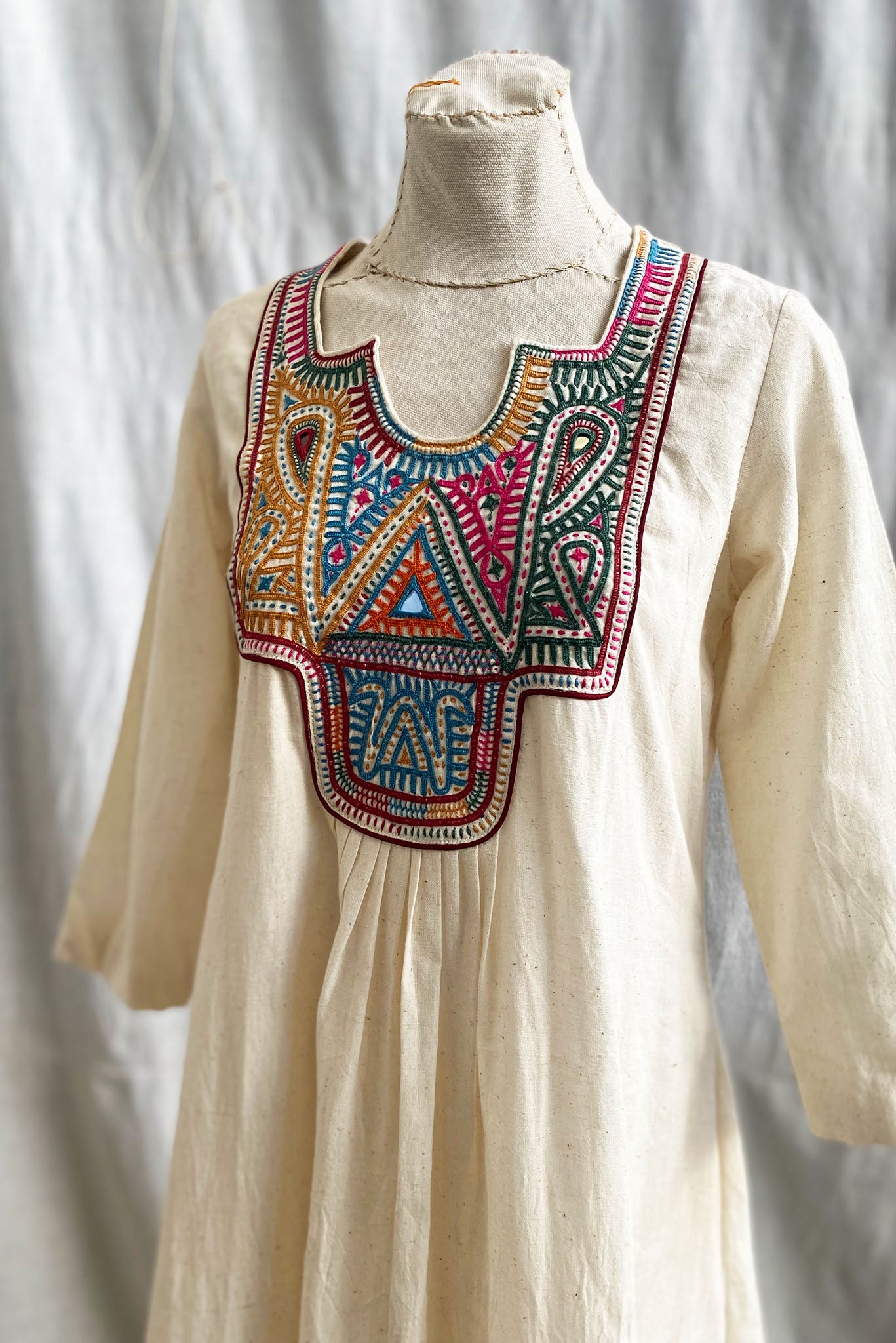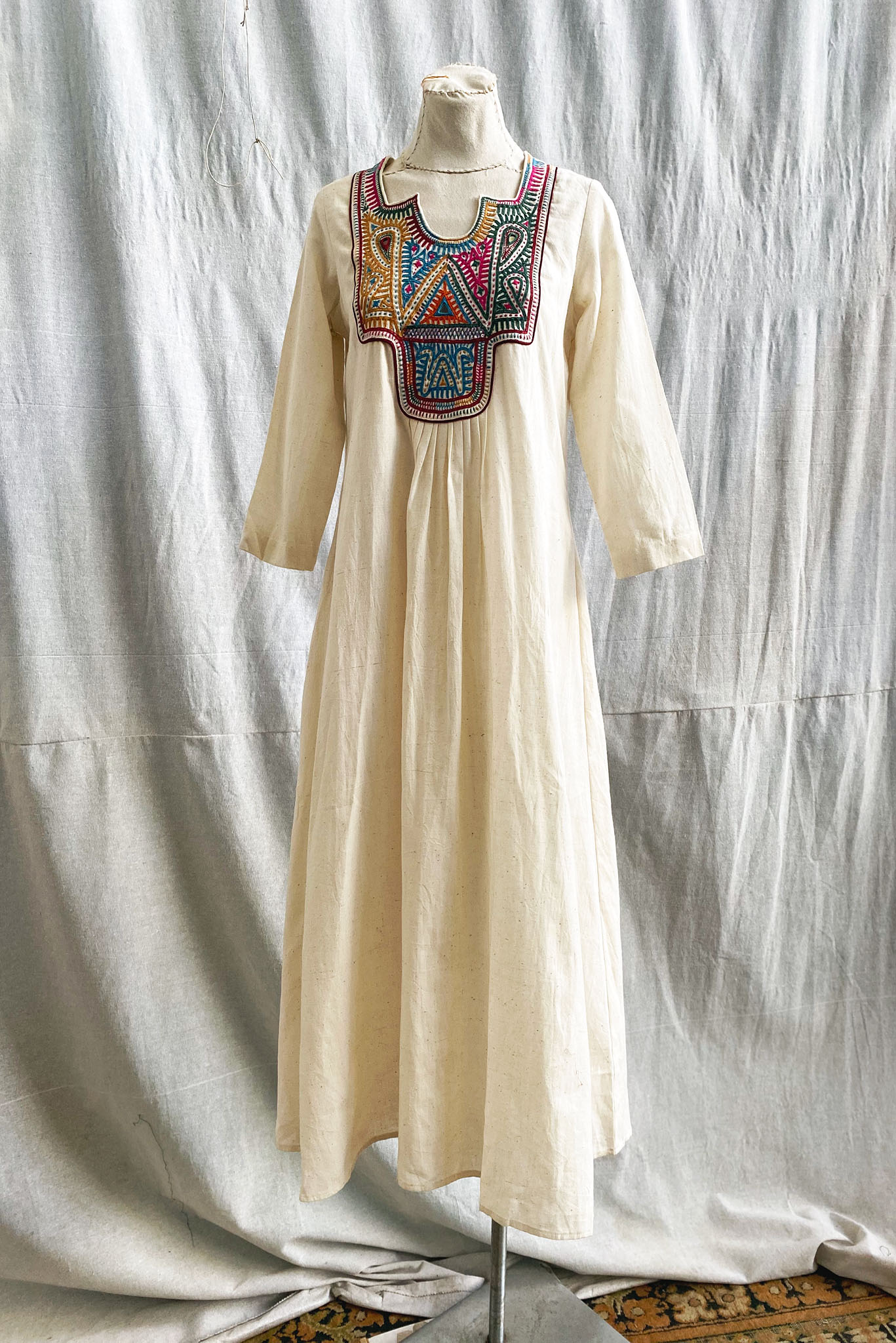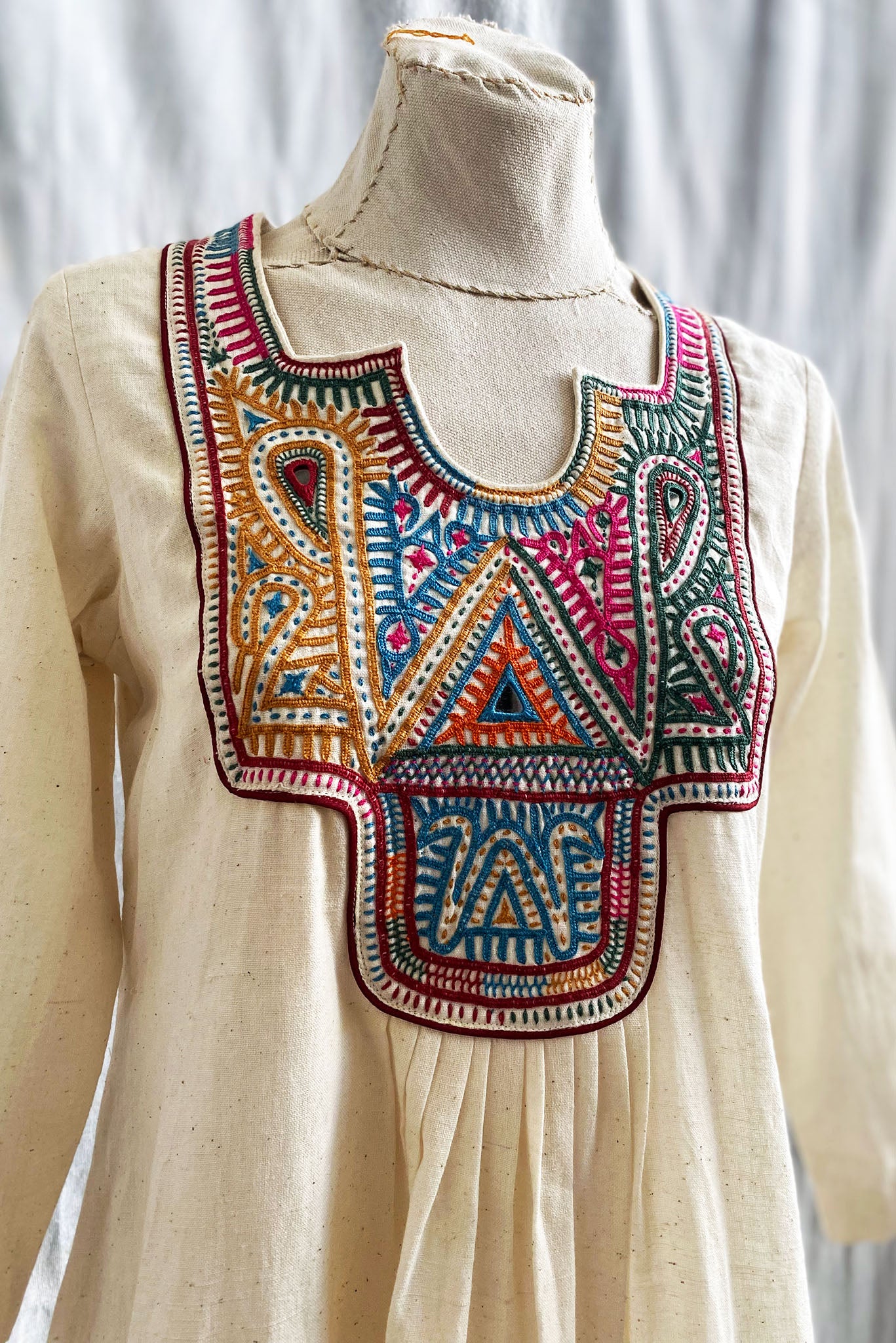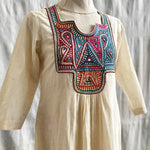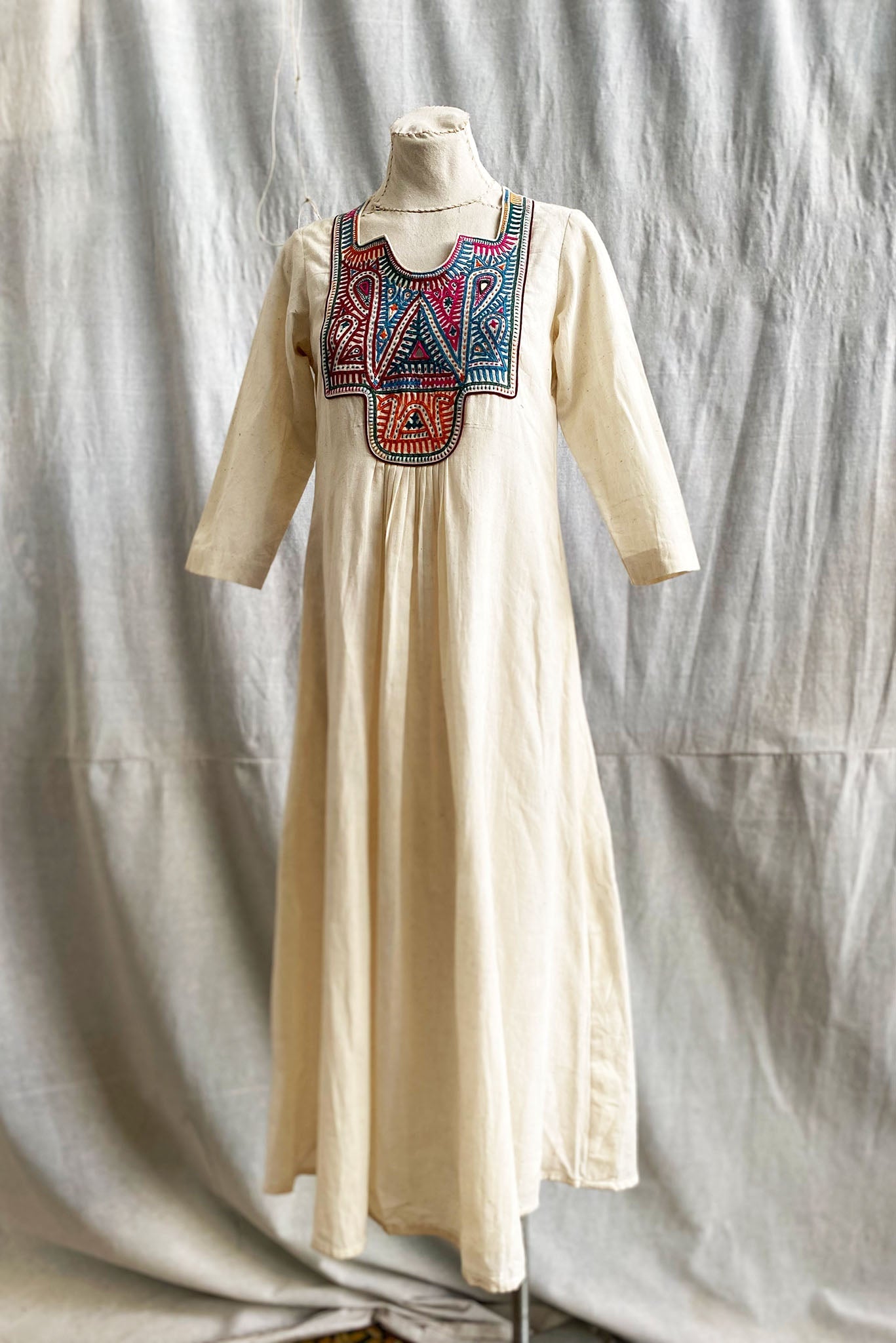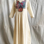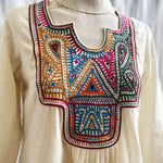 Introducing the Square Neck Yoke Embroidered Cotton Dress in Natural, a beautiful addition to our Rabari Collection that celebrates the exquisite artistry of the Rabari community in Kutch, Gujarat. Meticulously crafted by skilled Rabari artisans, this dress blends comfort with traditional craftsmanship, making it a versatile choice for any occasion.