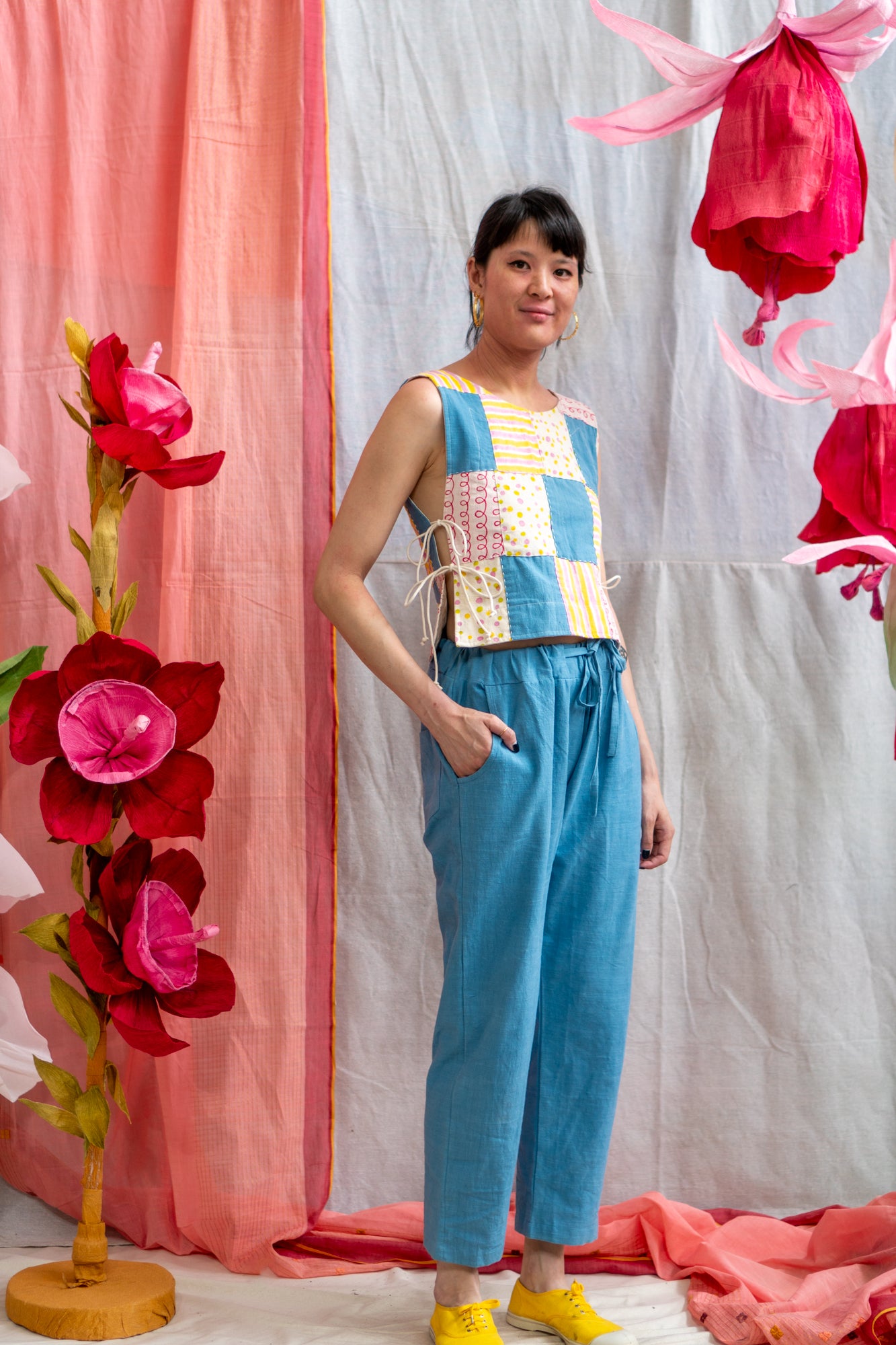 Indigo – achieved by naturally plant dyeing the fabric in Indigo vats.