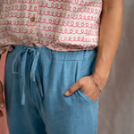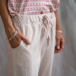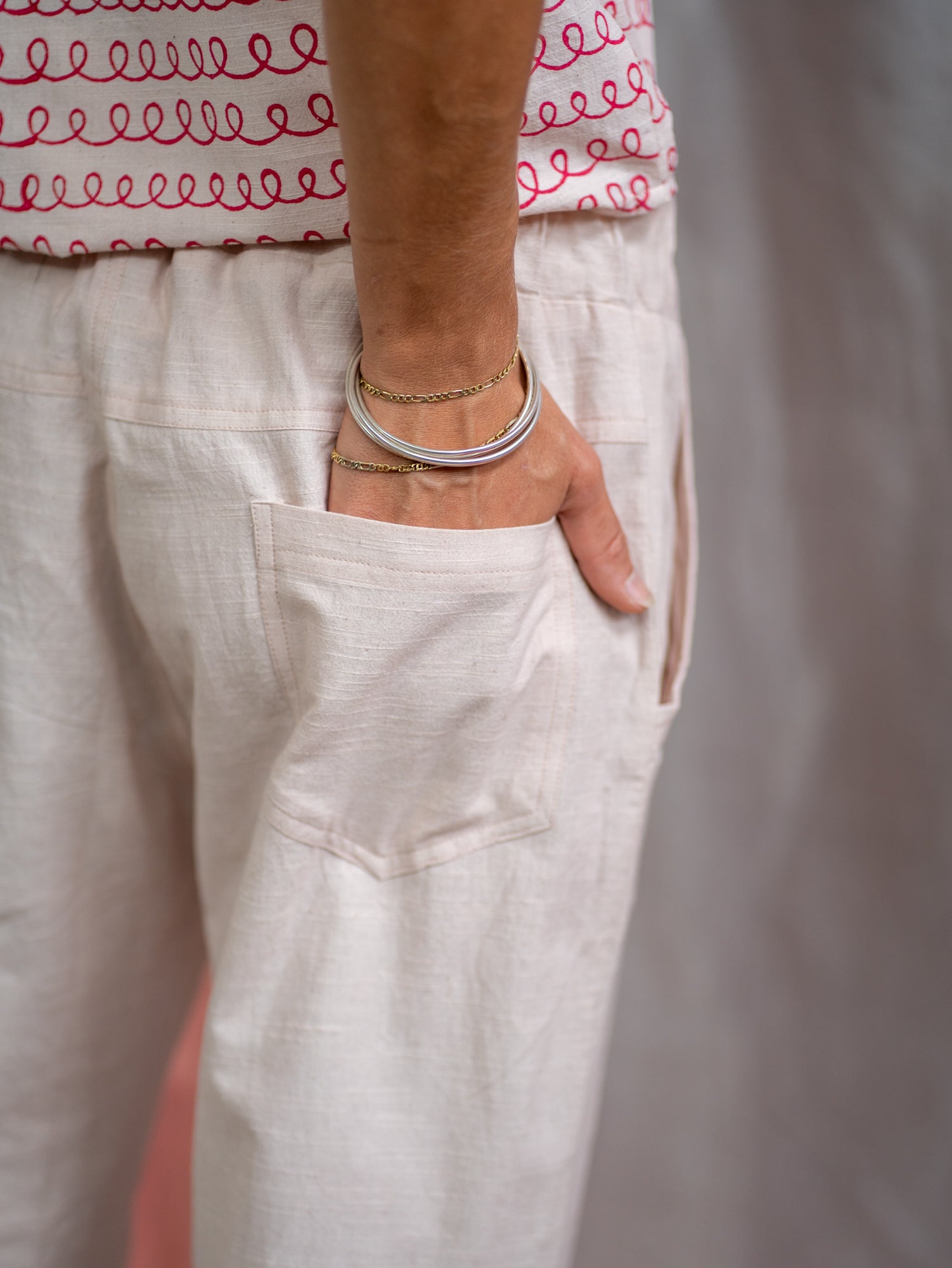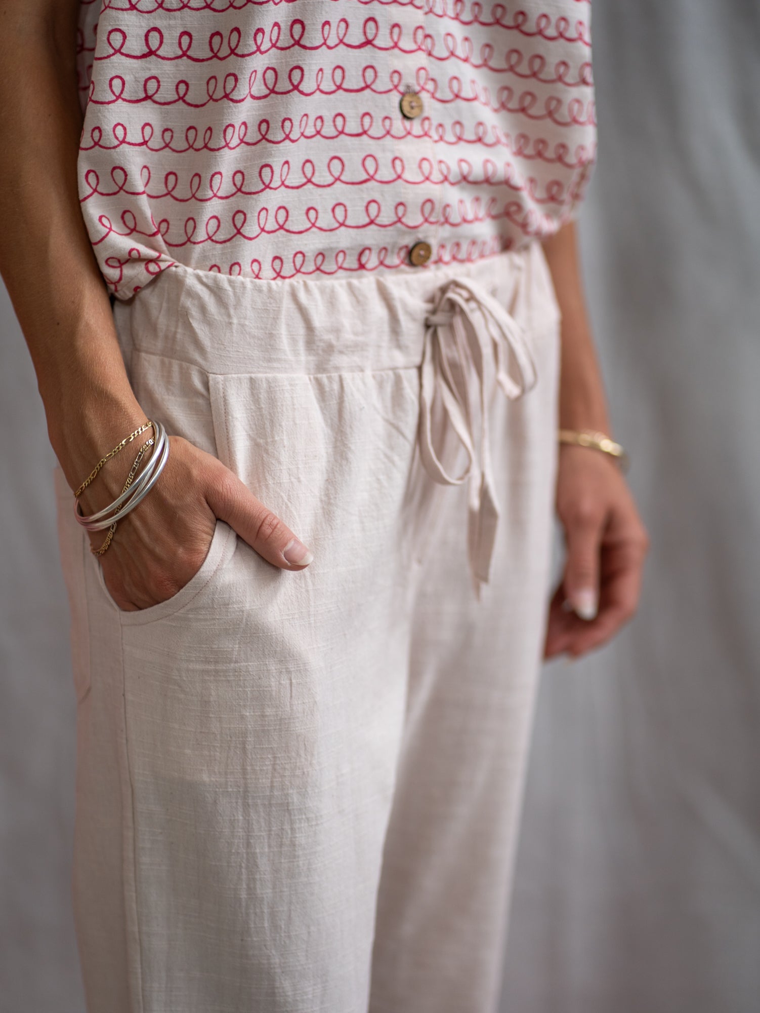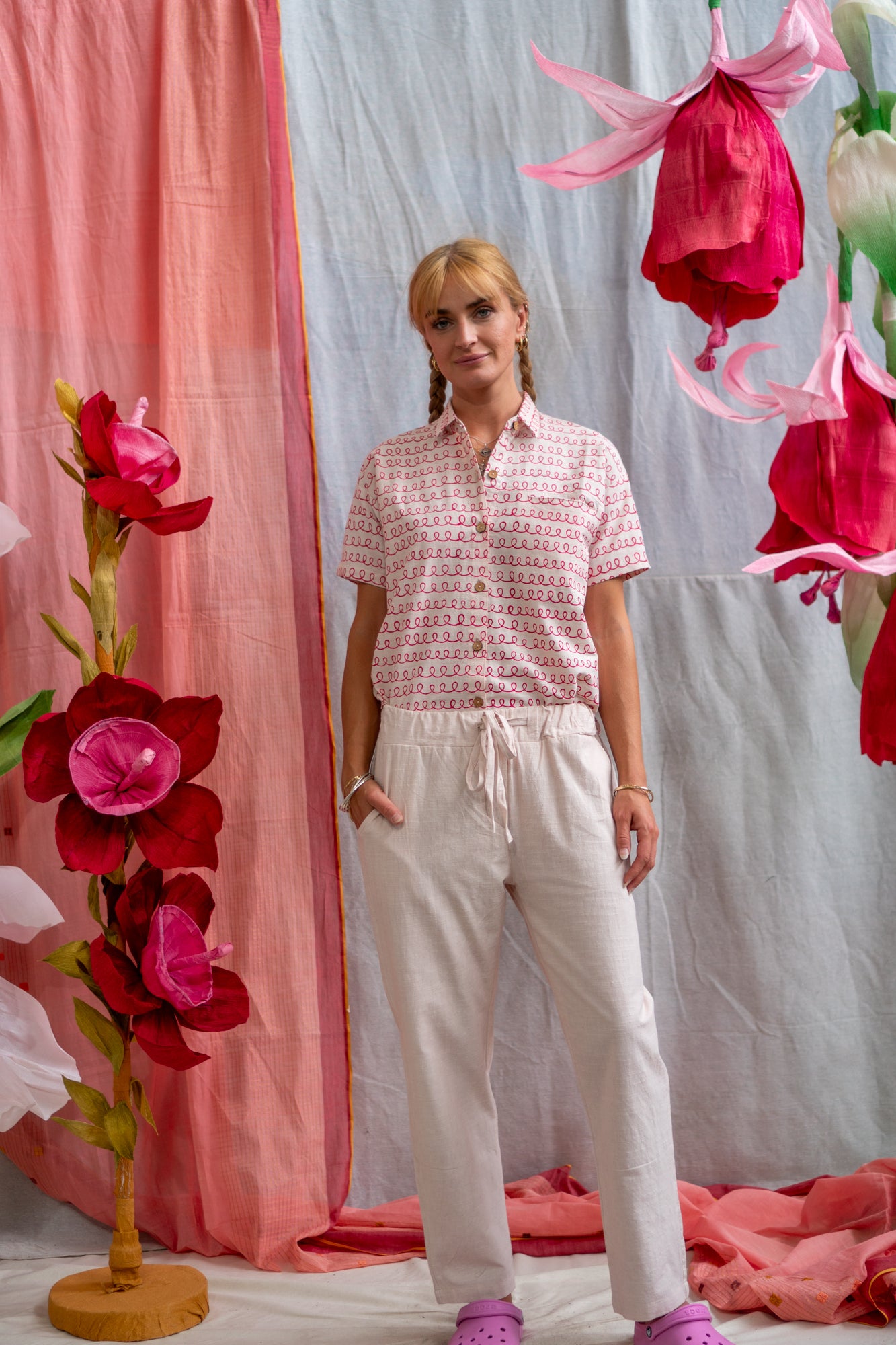 These pants are the perfect pair to throw over bathers in the summer, but opaque enough that there is no sheerness to them! Style with a peasant top for a relaxed 70’s beachside look, or style them up for an evening look with our shell top in the pink twirl print, for a bold and playful coordinated look.