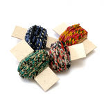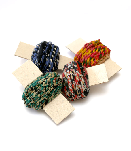 Handcrafted from recycled Sarees, these chunky twines are made by very tightly twisting each of two single 40mm wide strip of sari fabric to make a very strong and pliable length of twine, available in a gloriously random assortment of patterns and colours.