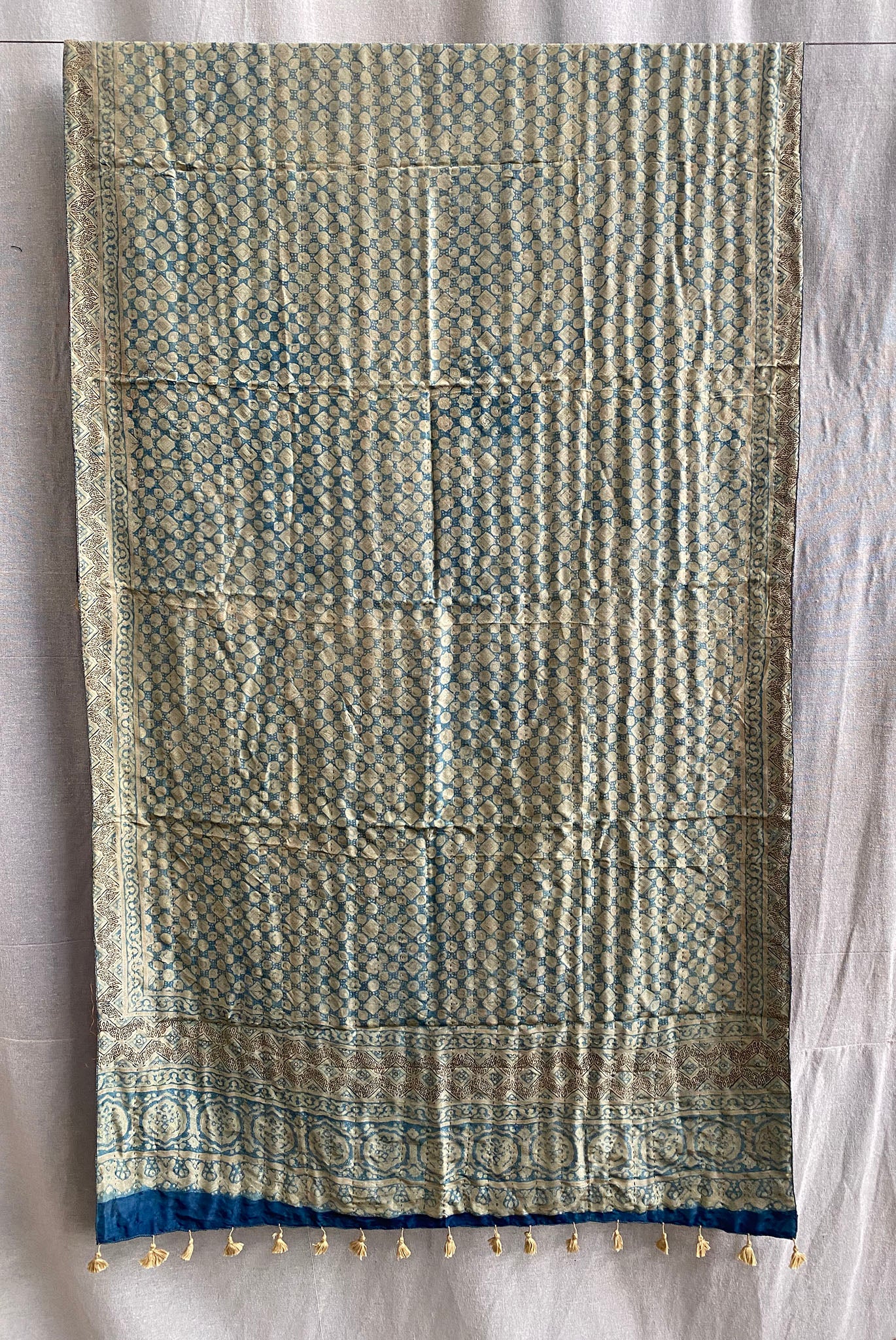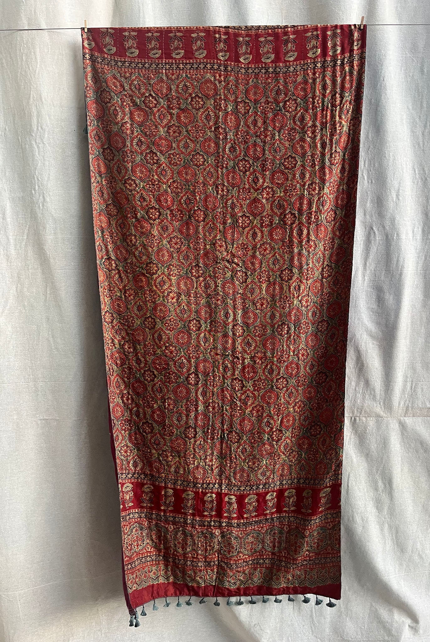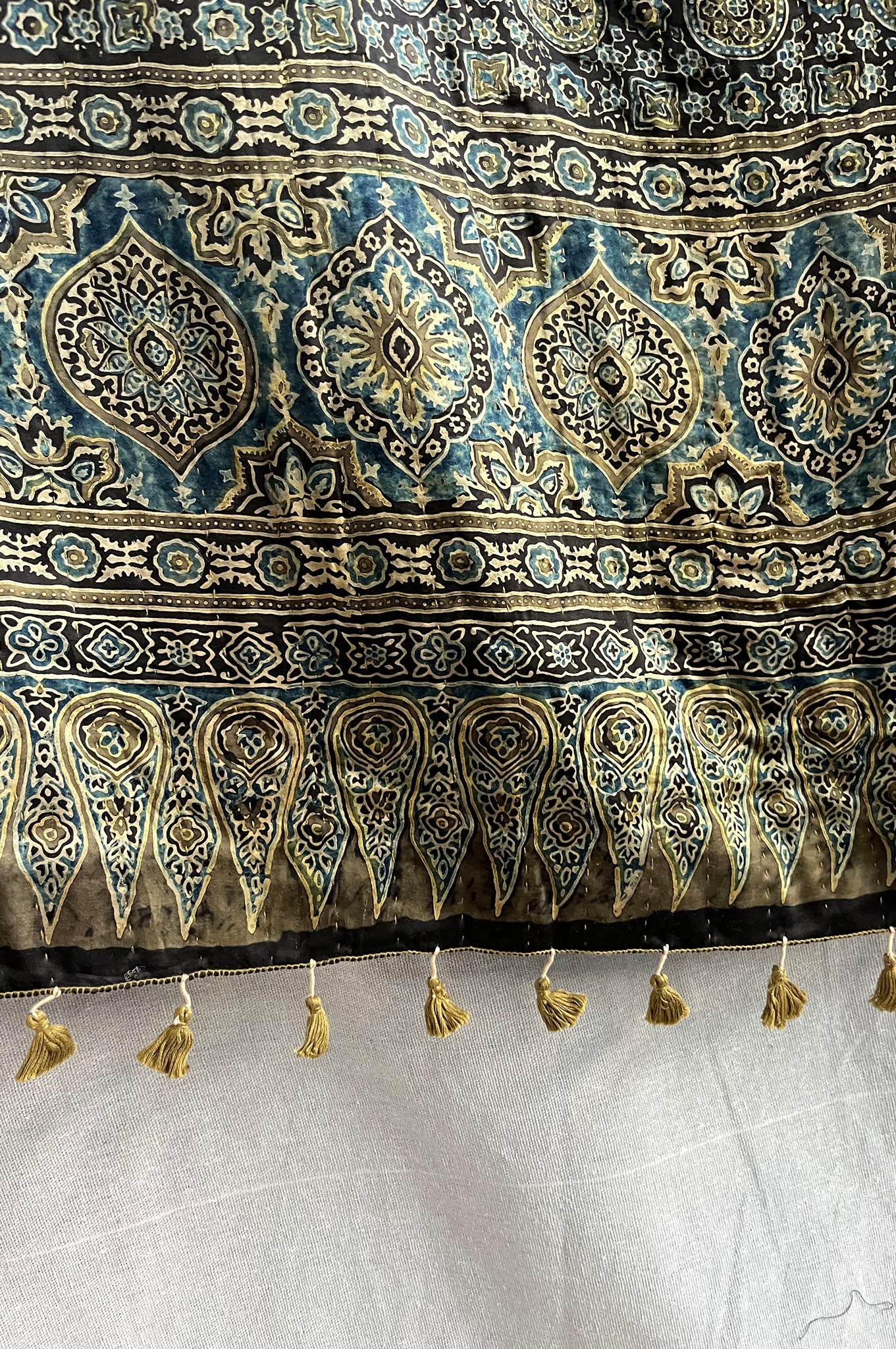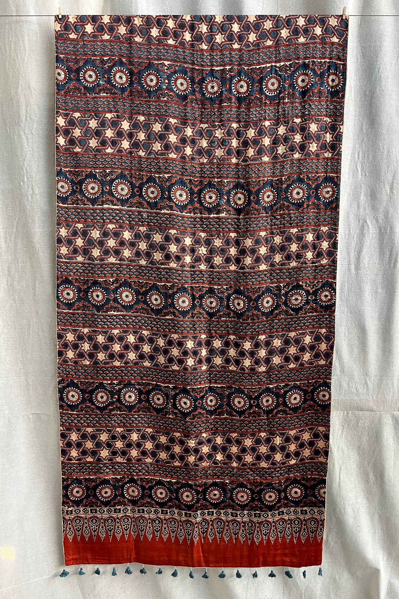 Ajrakh is a 4,500-year-old textile art, known for its intricate double-sided hand block printing and resist dyeing techniques. Using natural plant-based dyes like indigo and madder, each piece is created through a careful multi-step process, with layers of color added day by day using custom hand blocks to produce detailed, one-of-a-kind patterns.